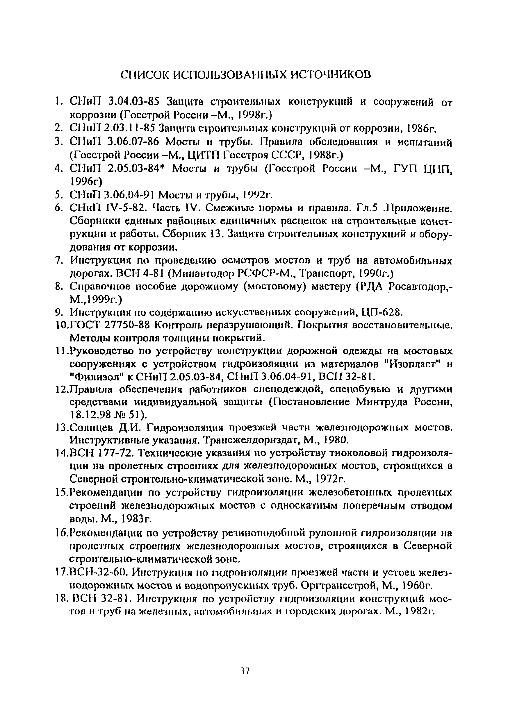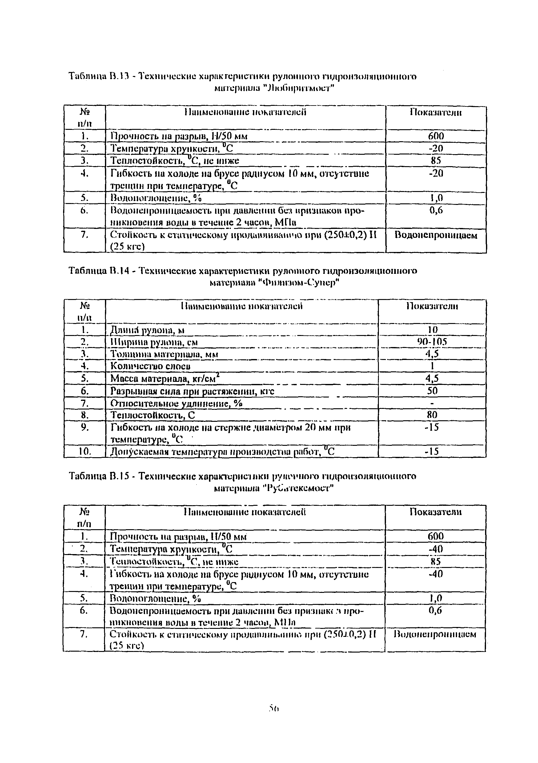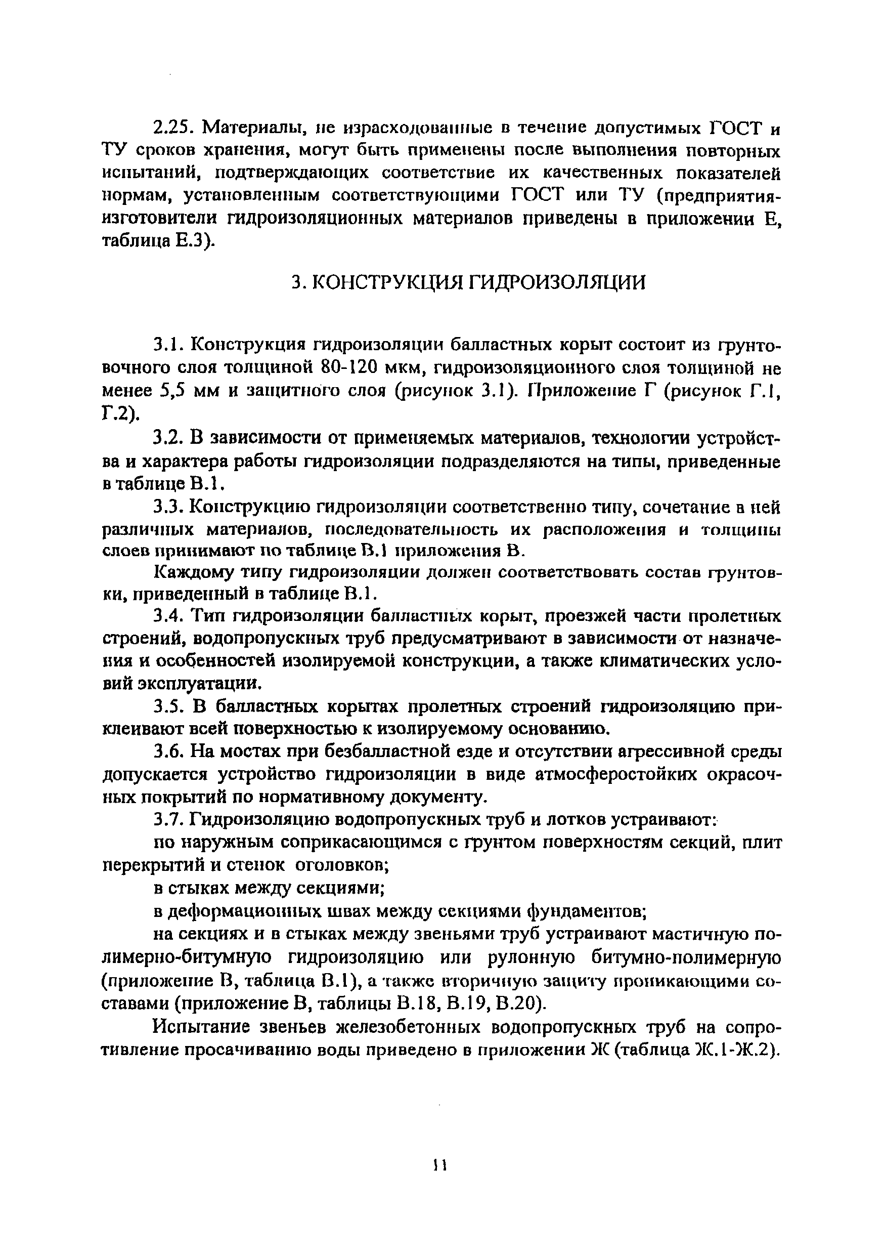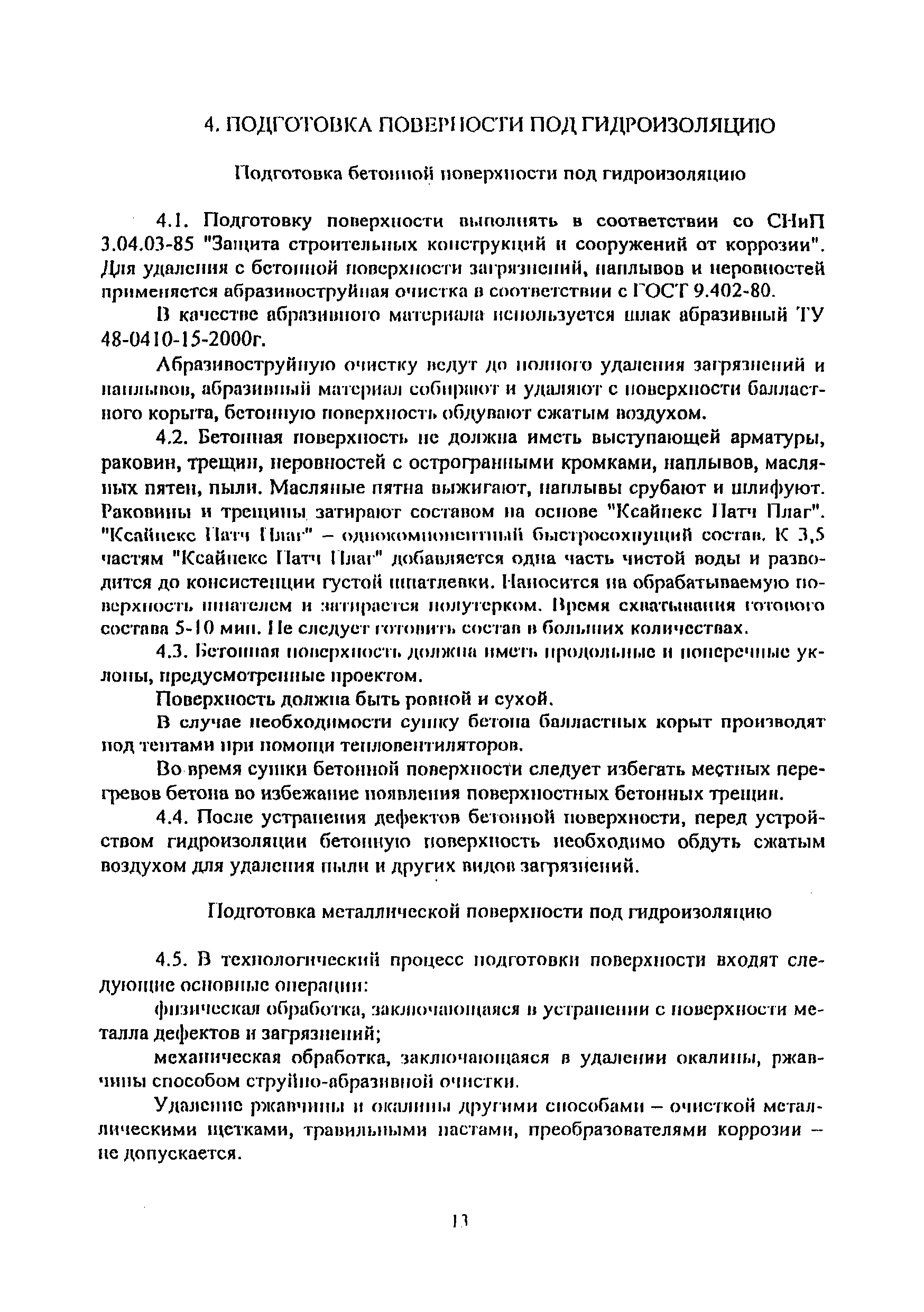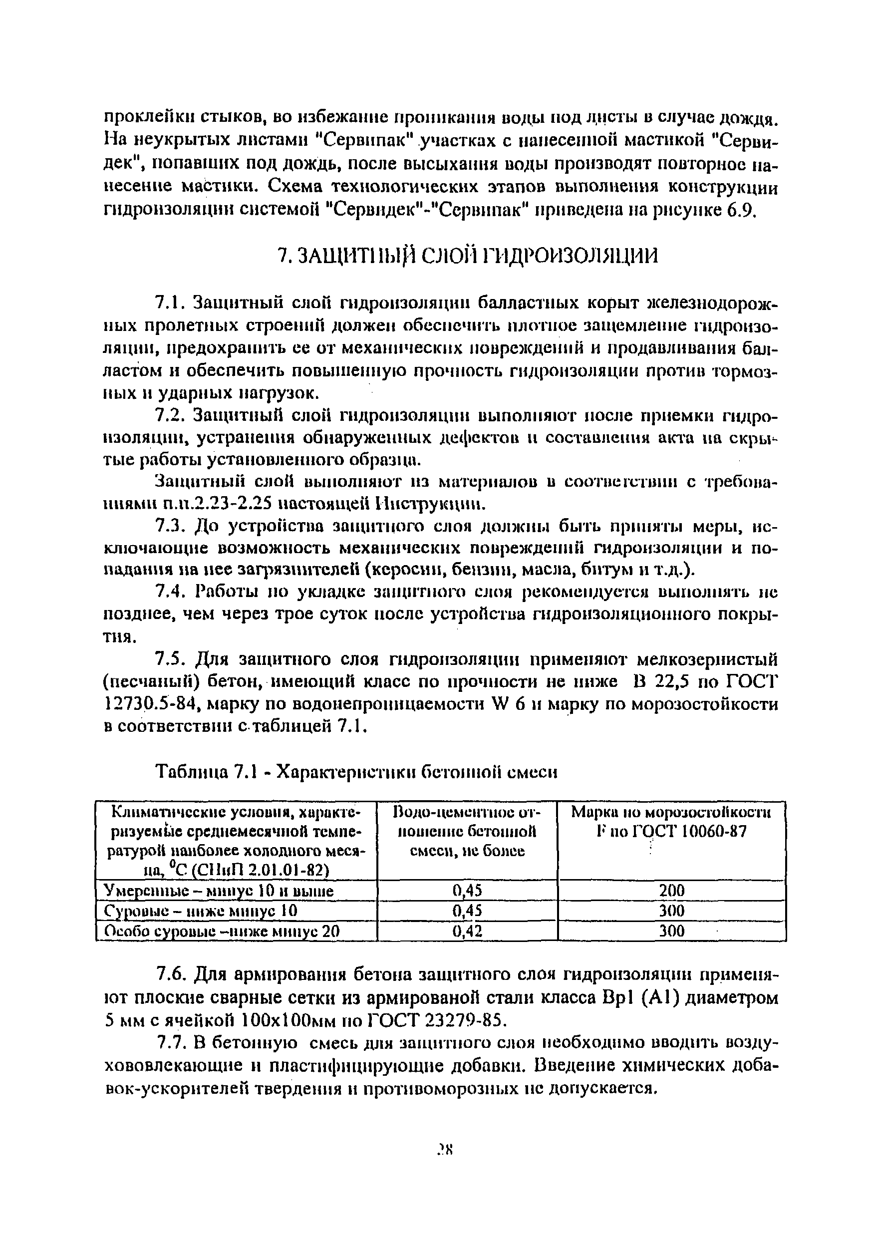 | Оглавление: | Введение 1. Общие положения 2. Выбор гидроизоляционных материалов, их характеристика 3. Конструкция гидроизоляции 4. Подготовка поверхности под гидроизоляцию 5. Устройство гидроизоляции в местах примыкания к водоотводным трубкам 6. Технология выполнения гидроизоляции 7. Защитный слой гидроизоляции 8. Контроль качества материала в правила приемки гидроизоляционного слоя 9. Оборудование для производства работ по устройству гидроизоляции 10. Хранение гидроизоляционных материалов 11. Охрана труда, окружающей среды и пожарная безопасность при устройстве гидроизоляции Список использованных источников Приложение А А. 1. Климатическое районирование А.2. Технические требования к качеству поверхности перед окрашиванием Приложение Б Б.1. График проведения работ в "окно" длительностью 7,5 часов (объем работ 25 пог.м (105 м2) Б.2. График проведения работ в "окно" длительностью 24 часа (объем работ 127 пог.м (534 м2) Приложение В В.1. Тип гидроизоляции балластных корыт конструкций мостов В.2. Характеристика рулонного гидроизоляционного материала "Техноэласт ЭМП-5,5/250" В.3. Технические характеристики рулонного гидроизоляционного материала "Техноэластмост" В.4. Технические характеристики материалов "Сервидек- Сервипак" В.5. Технические характеристики рулонного гидроизоляционного материала "Днепротекс" В.6. Технические характеристики рулонного гидроизоляционного материала "Мостопласт" В.7. Технические характеристики рулонного гидроизоляционного материала "Г-ПХБЭ-ПП" В.8. Технические характеристики рулонного гидроизоляционного материала "Кромэл" В.9. Технические характеристики рулонного гидроизоляционного материала "Поликор-12" В.10. Технические характеристики рулонного гидроизоляционного материала "Экофлекс" В.11. Технические характеристики рулонного гидроизоляционного материала "Унифлекс" В.12. Технические характеристики рулонного гидроизоляционного материала "Изопласт" В.13. Технические характеристики рулонного гидроизоляционного материала "Любиритмост" В.14. Технические характеристики рулонного гидроизоляционного материала "Филизол-Супер" В.15. Технические характеристика рулонного гидроизоляционного материала "Рубитексмост" В.16. Технические характеристики двухкомпонентного мастичного материала "Изокром-И" В.17. Технические характеристики двухкомпонентного мастичного материала "Изокром-К" В.18. Технические характеристики однокомпонентного мастичного материала "Изокром-И" В.19. Технические характеристики мастичных гидроизоляционных материалов "Мастмэл-1" и "Мастмэл-2" В.20. Технические характеристики смоляно-каучукового состава "Гермокрон" В.21. Технические характеристики мастичного материала "Биски" В.22. Технические характеристики пеностирольных экструзиционных плит "Пеноплекс", тип 45, толщиной 40 мм В.23. Технические характеристики защитного материала "Тайпар" В.24. Технические характеристики цементно-полимерного состава марки "Ксайпекс-Патч-Плаг" В.25. Технические характеристики защитного состава "Кальматрон" В.26. Технические характеристики цементно-полимерного состава марки "Ксайпекс-Концентрат" В.27. Технические характеристика цементно-полимерных составов марки "Ремстрим" В.28. Технические характеристики сухих смесей ТФ-2 В.29. Технические характеристики бетонных сухих ремонтных смесей марки "Эмако" В.30. Вспомогательные материалы 
