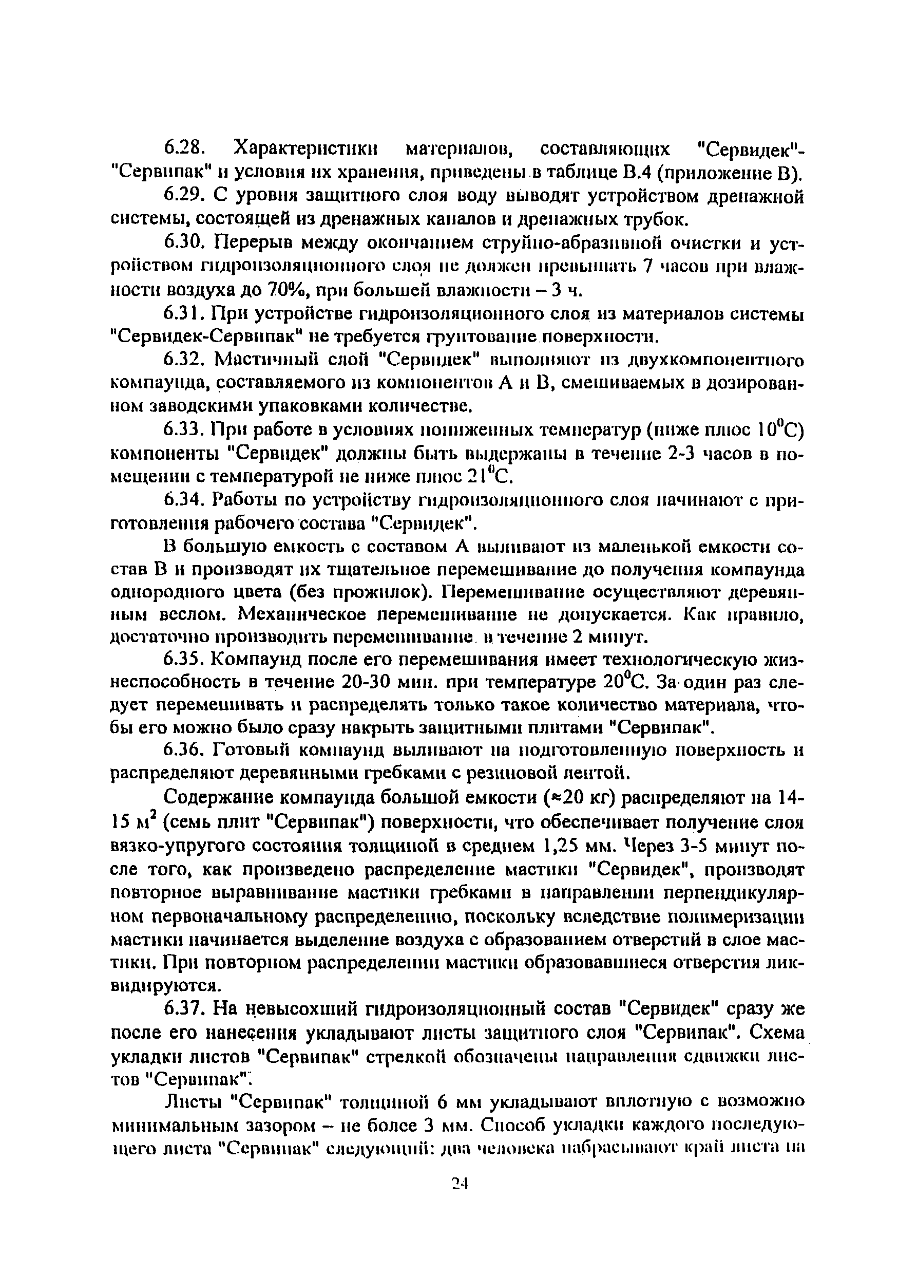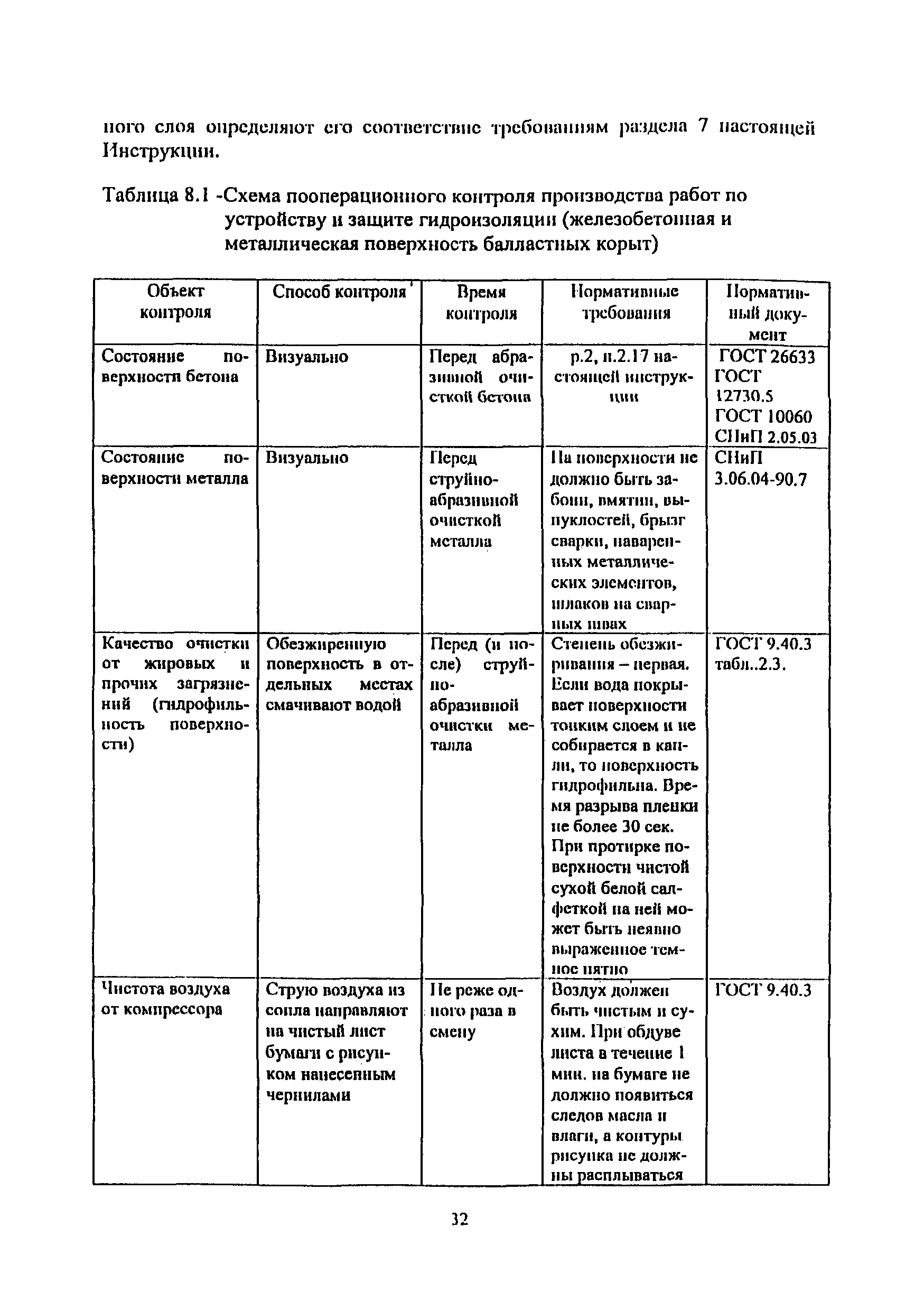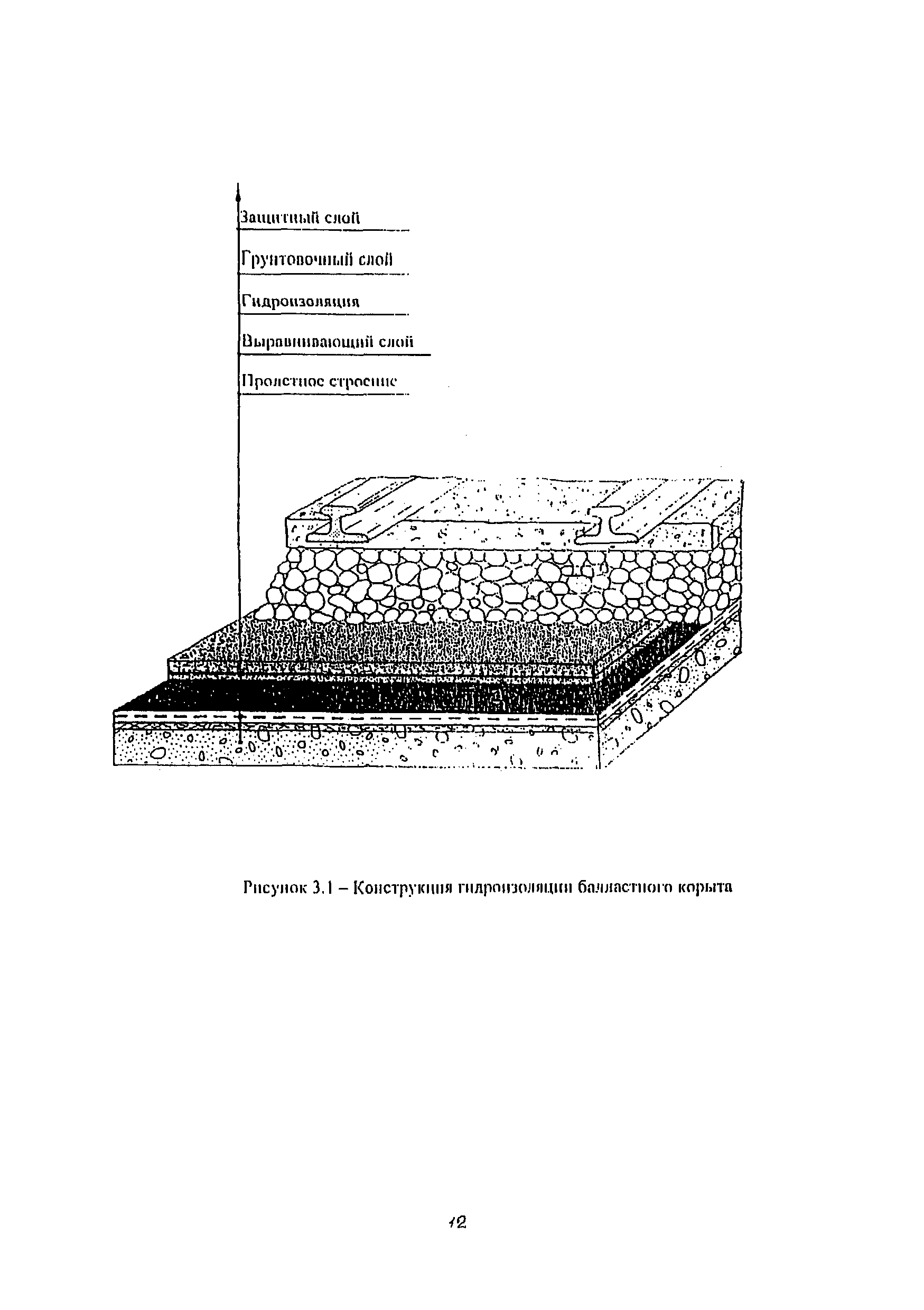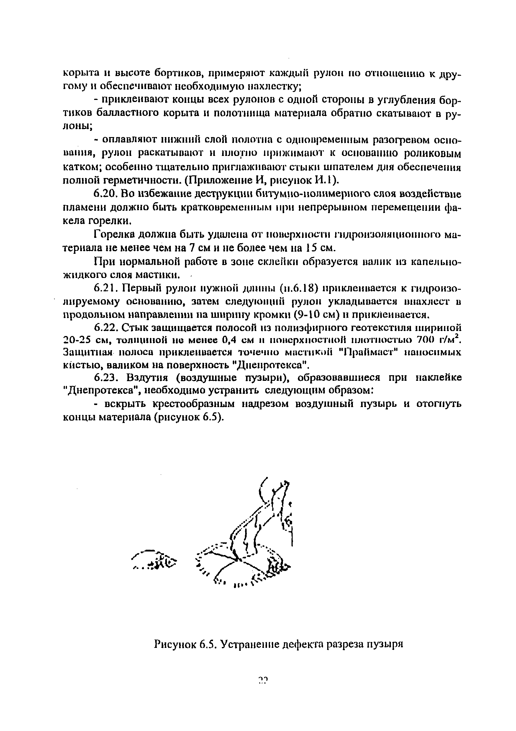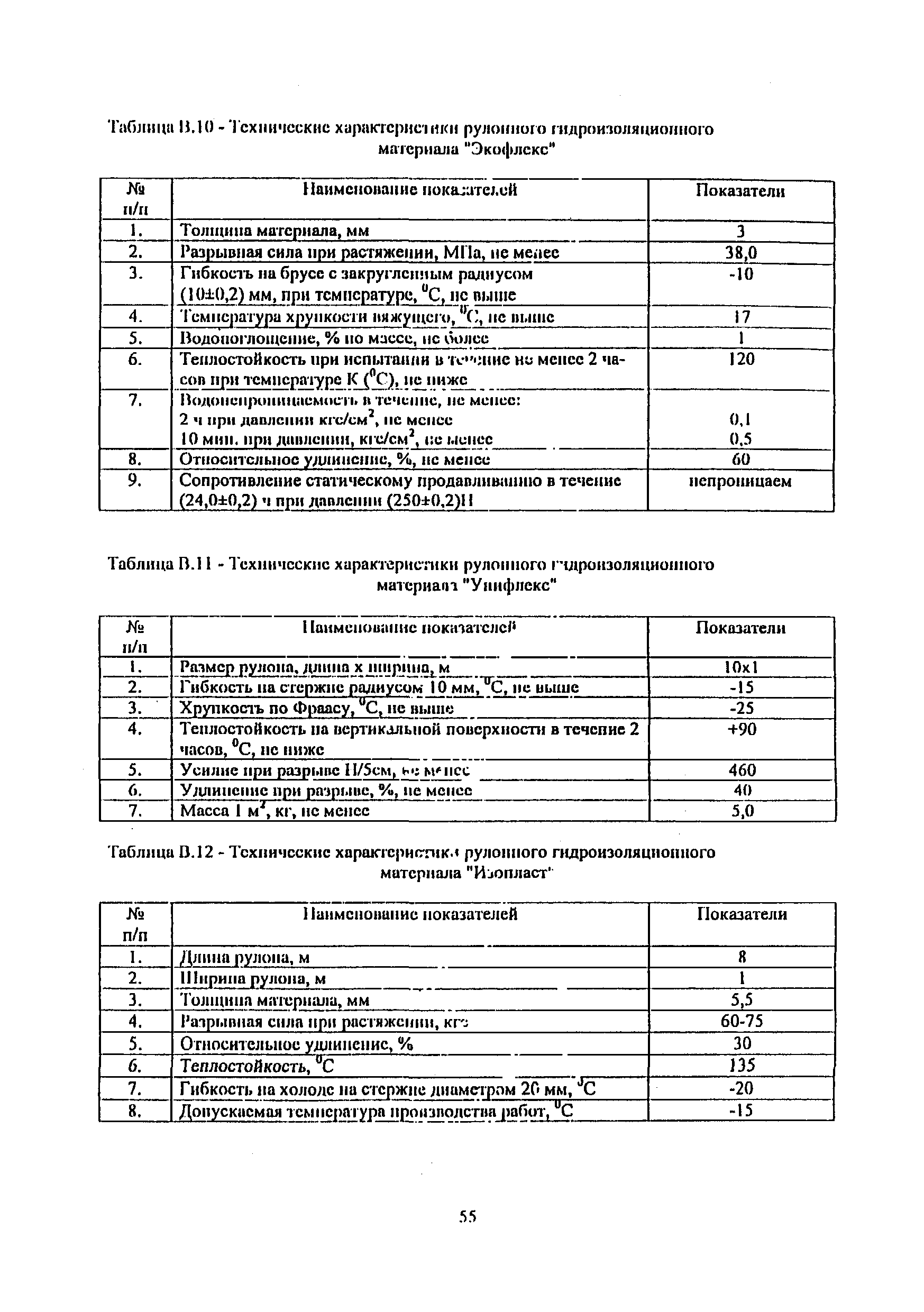 | Оглавление: | Введение 1. Общие положения 2. Выбор гидроизоляционных материалов, их характеристика 3. Конструкция гидроизоляции 4. Подготовка поверхности под гидроизоляцию 5. Устройство гидроизоляции в местах примыкания к водоотводным трубкам 6. Технология выполнения гидроизоляции 7. Защитный слой гидроизоляции 8. Контроль качества материала в правила приемки гидроизоляционного слоя 9. Оборудование для производства работ по устройству гидроизоляции 10. Хранение гидроизоляционных материалов 11. Охрана труда, окружающей среды и пожарная безопасность при устройстве гидроизоляции Список использованных источников Приложение А А. 1. Климатическое районирование А.2. Технические требования к качеству поверхности перед окрашиванием Приложение Б Б.1. График проведения работ в "окно" длительностью 7,5 часов (объем работ 25 пог.м (105 м2) Б.2. График проведения работ в "окно" длительностью 24 часа (объем работ 127 пог.м (534 м2) Приложение В В.1. Тип гидроизоляции балластных корыт конструкций мостов В.2. Характеристика рулонного гидроизоляционного материала "Техноэласт ЭМП-5,5/250" В.3. Технические характеристики рулонного гидроизоляционного материала "Техноэластмост" В.4. Технические характеристики материалов "Сервидек- Сервипак" В.5. Технические характеристики рулонного гидроизоляционного материала "Днепротекс" В.6. Технические характеристики рулонного гидроизоляционного материала "Мостопласт" В.7. Технические характеристики рулонного гидроизоляционного материала "Г-ПХБЭ-ПП" В.8. Технические характеристики рулонного гидроизоляционного материала "Кромэл" В.9. Технические характеристики рулонного гидроизоляционного материала "Поликор-12" В.10. Технические характеристики рулонного гидроизоляционного материала "Экофлекс" В.11. Технические характеристики рулонного гидроизоляционного материала "Унифлекс" В.12. Технические характеристики рулонного гидроизоляционного материала "Изопласт" В.13. Технические характеристики рулонного гидроизоляционного материала "Любиритмост" В.14. Технические характеристики рулонного гидроизоляционного материала "Филизол-Супер" В.15. Технические характеристика рулонного гидроизоляционного материала "Рубитексмост" В.16. Технические характеристики двухкомпонентного мастичного материала "Изокром-И" В.17. Технические характеристики двухкомпонентного мастичного материала "Изокром-К" В.18. Технические характеристики однокомпонентного мастичного материала "Изокром-И" В.19. Технические характеристики мастичных гидроизоляционных материалов "Мастмэл-1" и "Мастмэл-2" В.20. Технические характеристики смоляно-каучукового состава "Гермокрон" В.21. Технические характеристики мастичного материала "Биски" В.22. Технические характеристики пеностирольных экструзиционных плит "Пеноплекс", тип 45, толщиной 40 мм В.23. Технические характеристики защитного материала "Тайпар" В.24. Технические характеристики цементно-полимерного состава марки "Ксайпекс-Патч-Плаг" В.25. Технические характеристики защитного состава "Кальматрон" В.26. Технические характеристики цементно-полимерного состава марки "Ксайпекс-Концентрат" В.27. Технические характеристика цементно-полимерных составов марки "Ремстрим" В.28. Технические характеристики сухих смесей ТФ-2 В.29. Технические характеристики бетонных сухих ремонтных смесей марки "Эмако" В.30. Вспомогательные материалы 