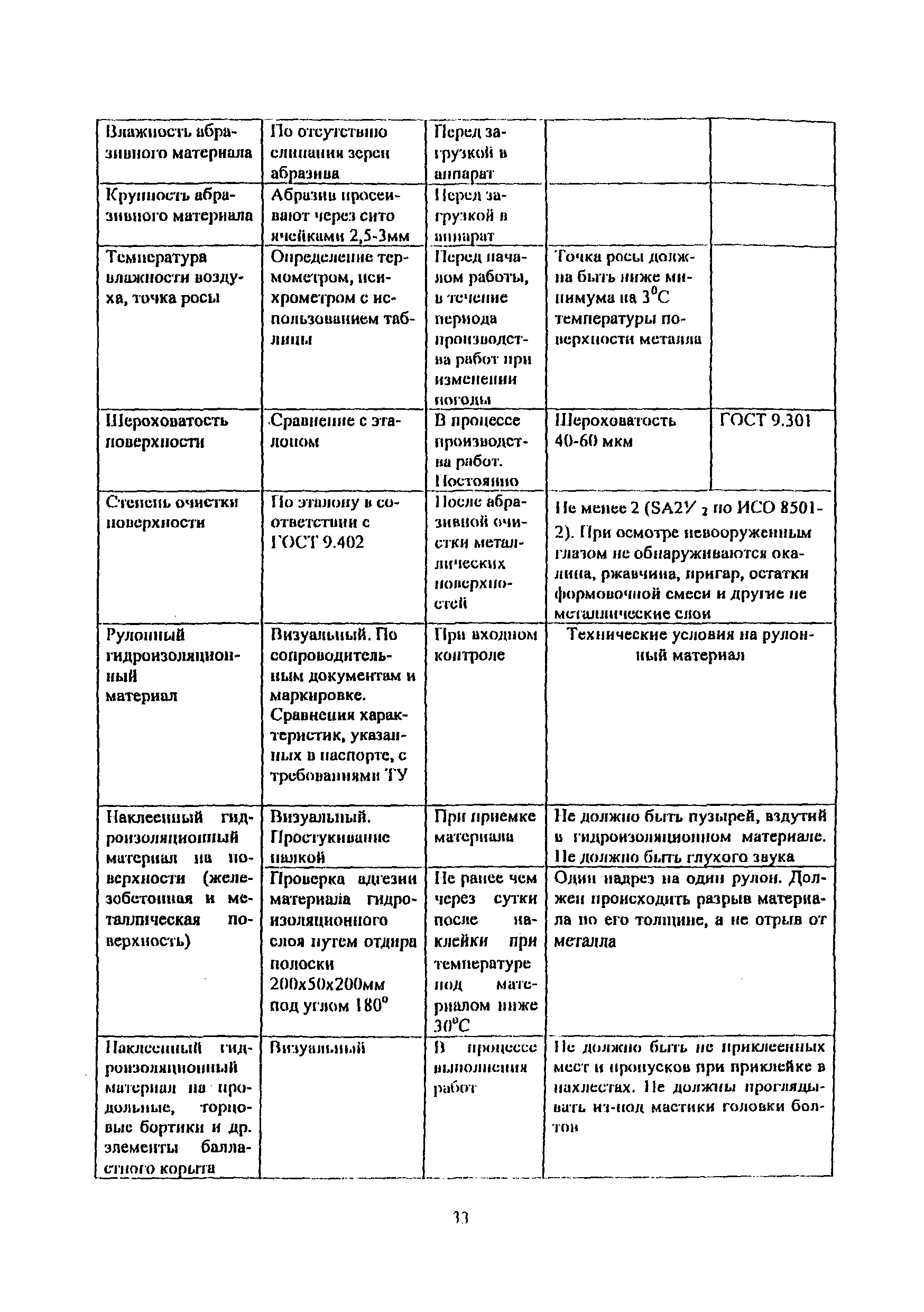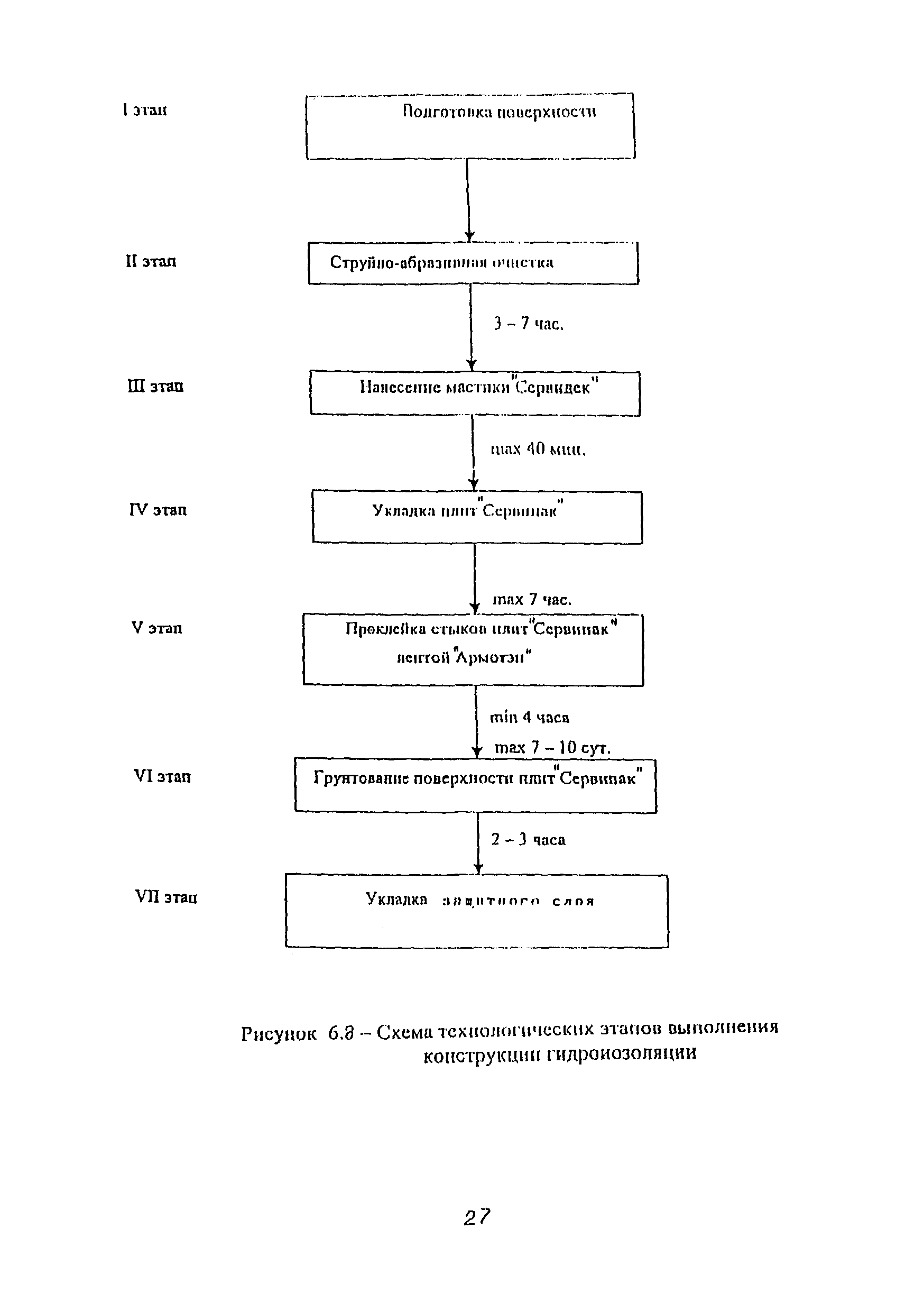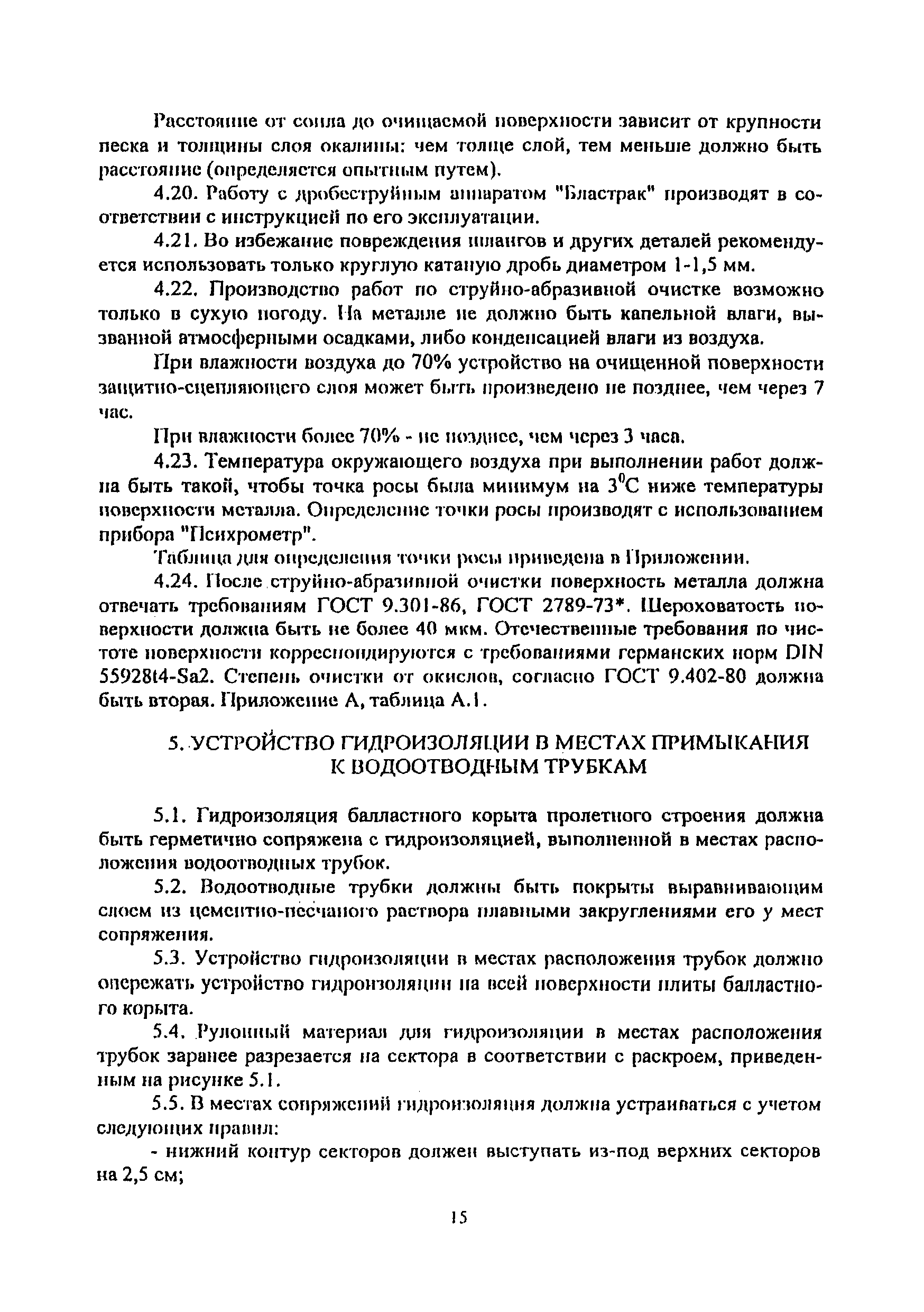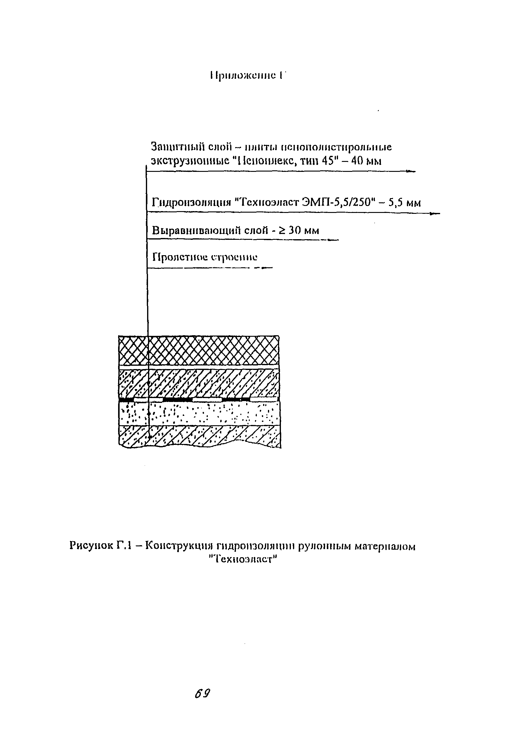 | Оглавление: | Введение 1. Общие положения 2. Выбор гидроизоляционных материалов, их характеристика 3. Конструкция гидроизоляции 4. Подготовка поверхности под гидроизоляцию 5. Устройство гидроизоляции в местах примыкания к водоотводным трубкам 6. Технология выполнения гидроизоляции 7. Защитный слой гидроизоляции 8. Контроль качества материала в правила приемки гидроизоляционного слоя 9. Оборудование для производства работ по устройству гидроизоляции 10. Хранение гидроизоляционных материалов 11. Охрана труда, окружающей среды и пожарная безопасность при устройстве гидроизоляции Список использованных источников Приложение А А. 1. Климатическое районирование А.2. Технические требования к качеству поверхности перед окрашиванием Приложение Б Б.1. График проведения работ в "окно" длительностью 7,5 часов (объем работ 25 пог.м (105 м2) Б.2. График проведения работ в "окно" длительностью 24 часа (объем работ 127 пог.м (534 м2) Приложение В В.1. Тип гидроизоляции балластных корыт конструкций мостов В.2. Характеристика рулонного гидроизоляционного материала "Техноэласт ЭМП-5,5/250" В.3. Технические характеристики рулонного гидроизоляционного материала "Техноэластмост" В.4. Технические характеристики материалов "Сервидек- Сервипак" В.5. Технические характеристики рулонного гидроизоляционного материала "Днепротекс" В.6. Технические характеристики рулонного гидроизоляционного материала "Мостопласт" В.7. Технические характеристики рулонного гидроизоляционного материала "Г-ПХБЭ-ПП" В.8. Технические характеристики рулонного гидроизоляционного материала "Кромэл" В.9. Технические характеристики рулонного гидроизоляционного материала "Поликор-12" В.10. Технические характеристики рулонного гидроизоляционного материала "Экофлекс" В.11. Технические характеристики рулонного гидроизоляционного материала "Унифлекс" В.12. Технические характеристики рулонного гидроизоляционного материала "Изопласт" В.13. Технические характеристики рулонного гидроизоляционного материала "Любиритмост" В.14. Технические характеристики рулонного гидроизоляционного материала "Филизол-Супер" В.15. Технические характеристика рулонного гидроизоляционного материала "Рубитексмост" В.16. Технические характеристики двухкомпонентного мастичного материала "Изокром-И" В.17. Технические характеристики двухкомпонентного мастичного материала "Изокром-К" В.18. Технические характеристики однокомпонентного мастичного материала "Изокром-И" В.19. Технические характеристики мастичных гидроизоляционных материалов "Мастмэл-1" и "Мастмэл-2" В.20. Технические характеристики смоляно-каучукового состава "Гермокрон" В.21. Технические характеристики мастичного материала "Биски" В.22. Технические характеристики пеностирольных экструзиционных плит "Пеноплекс", тип 45, толщиной 40 мм В.23. Технические характеристики защитного материала "Тайпар" В.24. Технические характеристики цементно-полимерного состава марки "Ксайпекс-Патч-Плаг" В.25. Технические характеристики защитного состава "Кальматрон" В.26. Технические характеристики цементно-полимерного состава марки "Ксайпекс-Концентрат" В.27. Технические характеристика цементно-полимерных составов марки "Ремстрим" В.28. Технические характеристики сухих смесей ТФ-2 В.29. Технические характеристики бетонных сухих ремонтных смесей марки "Эмако" В.30. Вспомогательные материалы 