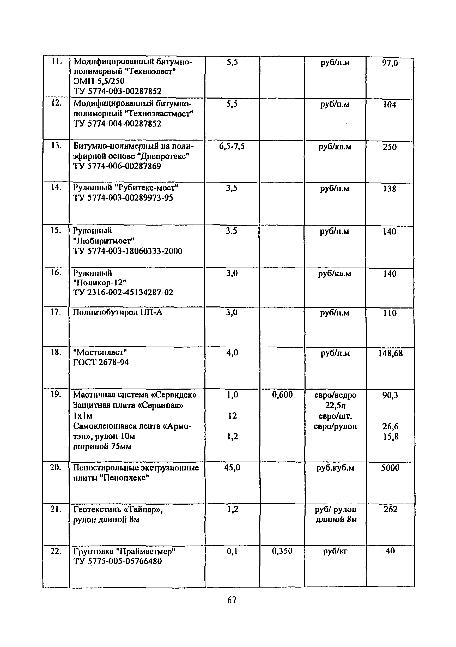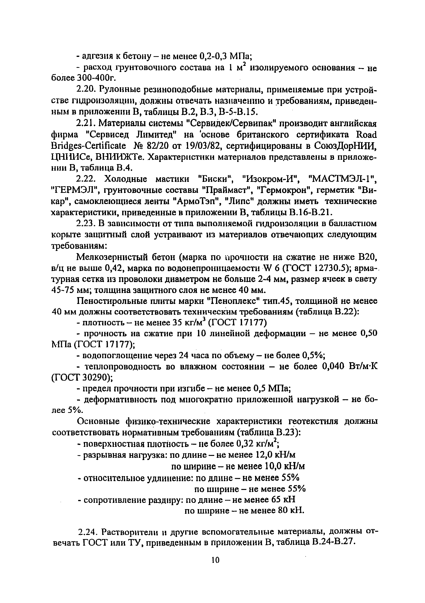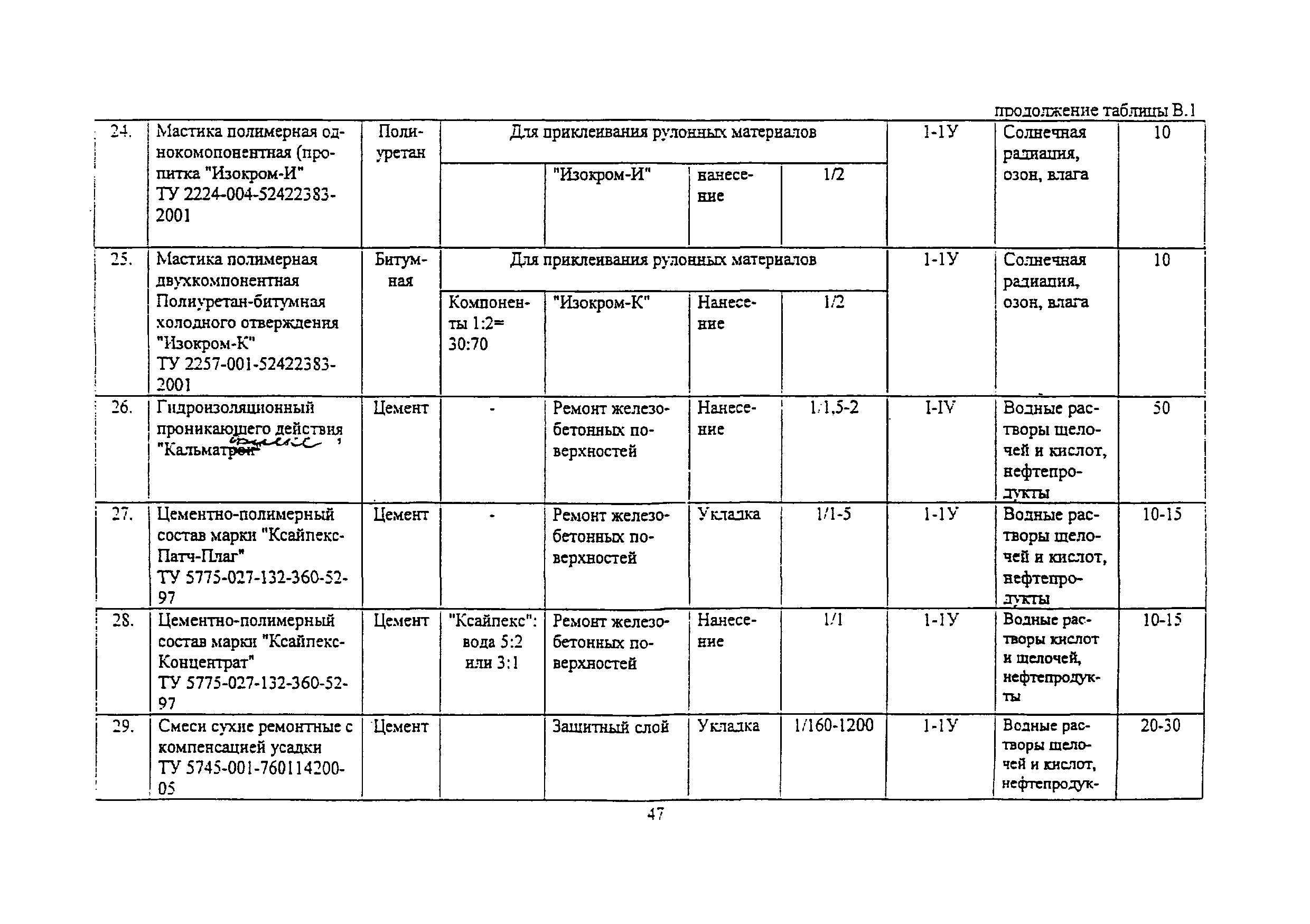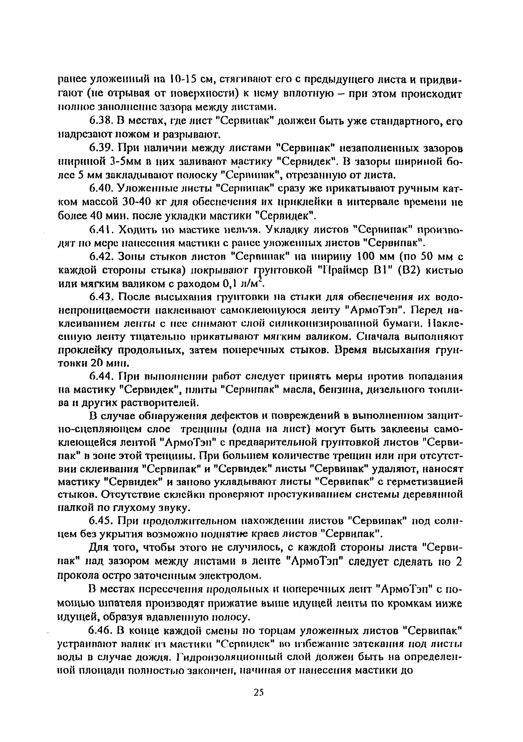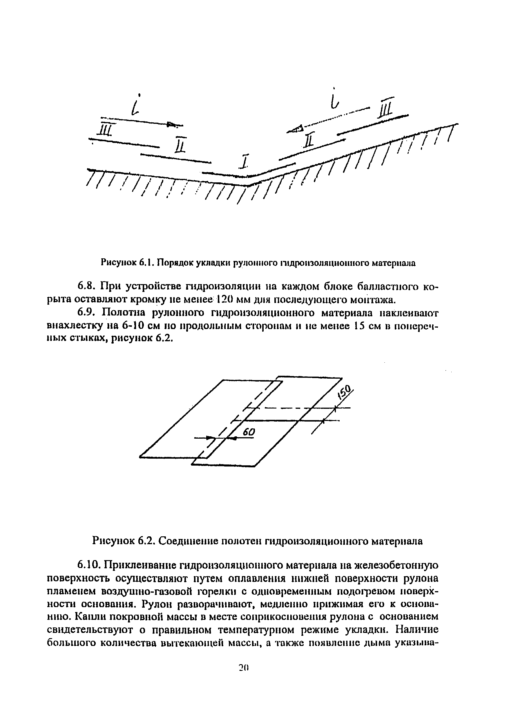 | Оглавление: | Введение 1. Общие положения 2. Выбор гидроизоляционных материалов, их характеристика 3. Конструкция гидроизоляции 4. Подготовка поверхности под гидроизоляцию 5. Устройство гидроизоляции в местах примыкания к водоотводным трубкам 6. Технология выполнения гидроизоляции 7. Защитный слой гидроизоляции 8. Контроль качества материала в правила приемки гидроизоляционного слоя 9. Оборудование для производства работ по устройству гидроизоляции 10. Хранение гидроизоляционных материалов 11. Охрана труда, окружающей среды и пожарная безопасность при устройстве гидроизоляции Список использованных источников Приложение А А. 1. Климатическое районирование А.2. Технические требования к качеству поверхности перед окрашиванием Приложение Б Б.1. График проведения работ в "окно" длительностью 7,5 часов (объем работ 25 пог.м (105 м2) Б.2. График проведения работ в "окно" длительностью 24 часа (объем работ 127 пог.м (534 м2) Приложение В В.1. Тип гидроизоляции балластных корыт конструкций мостов В.2. Характеристика рулонного гидроизоляционного материала "Техноэласт ЭМП-5,5/250" В.3. Технические характеристики рулонного гидроизоляционного материала "Техноэластмост" В.4. Технические характеристики материалов "Сервидек- Сервипак" В.5. Технические характеристики рулонного гидроизоляционного материала "Днепротекс" В.6. Технические характеристики рулонного гидроизоляционного материала "Мостопласт" В.7. Технические характеристики рулонного гидроизоляционного материала "Г-ПХБЭ-ПП" В.8. Технические характеристики рулонного гидроизоляционного материала "Кромэл" В.9. Технические характеристики рулонного гидроизоляционного материала "Поликор-12" В.10. Технические характеристики рулонного гидроизоляционного материала "Экофлекс" В.11. Технические характеристики рулонного гидроизоляционного материала "Унифлекс" В.12. Технические характеристики рулонного гидроизоляционного материала "Изопласт" В.13. Технические характеристики рулонного гидроизоляционного материала "Любиритмост" В.14. Технические характеристики рулонного гидроизоляционного материала "Филизол-Супер" В.15. Технические характеристика рулонного гидроизоляционного материала "Рубитексмост" В.16. Технические характеристики двухкомпонентного мастичного материала "Изокром-И" В.17. Технические характеристики двухкомпонентного мастичного материала "Изокром-К" В.18. Технические характеристики однокомпонентного мастичного материала "Изокром-И" В.19. Технические характеристики мастичных гидроизоляционных материалов "Мастмэл-1" и "Мастмэл-2" В.20. Технические характеристики смоляно-каучукового состава "Гермокрон" В.21. Технические характеристики мастичного материала "Биски" В.22. Технические характеристики пеностирольных экструзиционных плит "Пеноплекс", тип 45, толщиной 40 мм В.23. Технические характеристики защитного материала "Тайпар" В.24. Технические характеристики цементно-полимерного состава марки "Ксайпекс-Патч-Плаг" В.25. Технические характеристики защитного состава "Кальматрон" В.26. Технические характеристики цементно-полимерного состава марки "Ксайпекс-Концентрат" В.27. Технические характеристика цементно-полимерных составов марки "Ремстрим" В.28. Технические характеристики сухих смесей ТФ-2 В.29. Технические характеристики бетонных сухих ремонтных смесей марки "Эмако" В.30. Вспомогательные материалы 