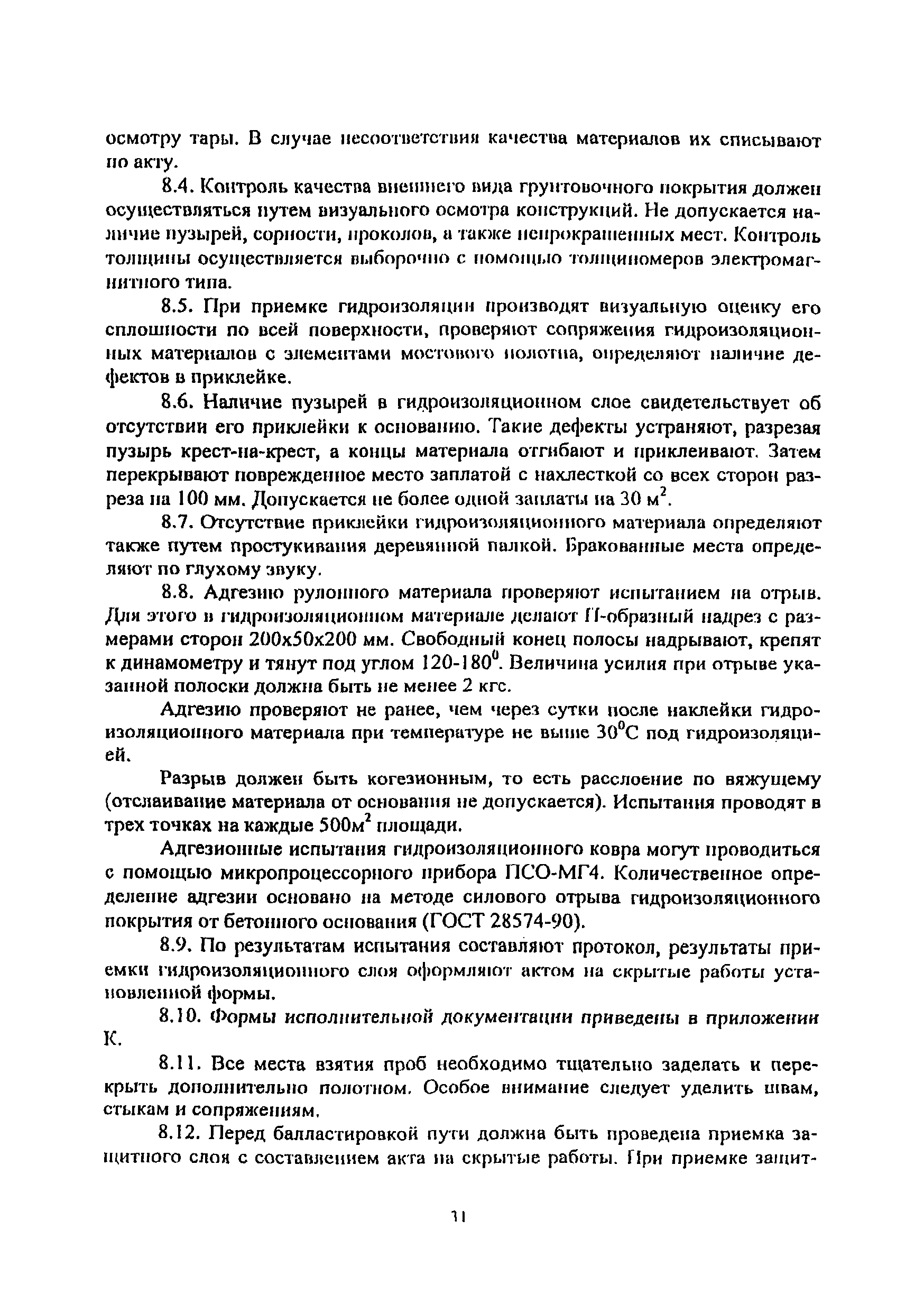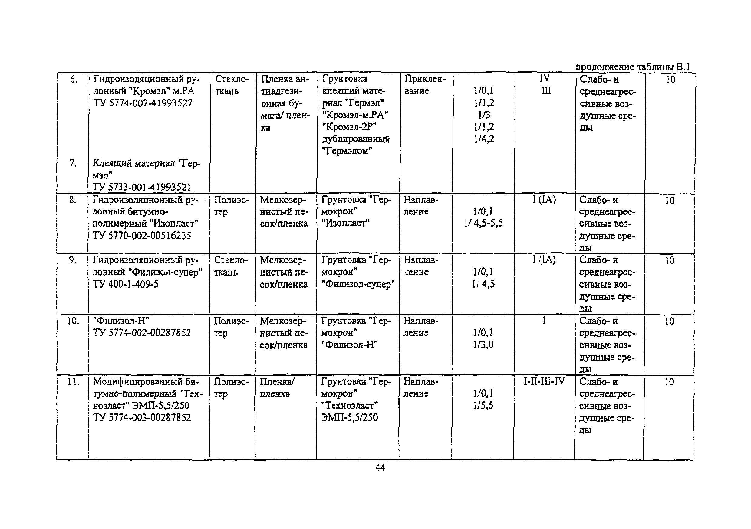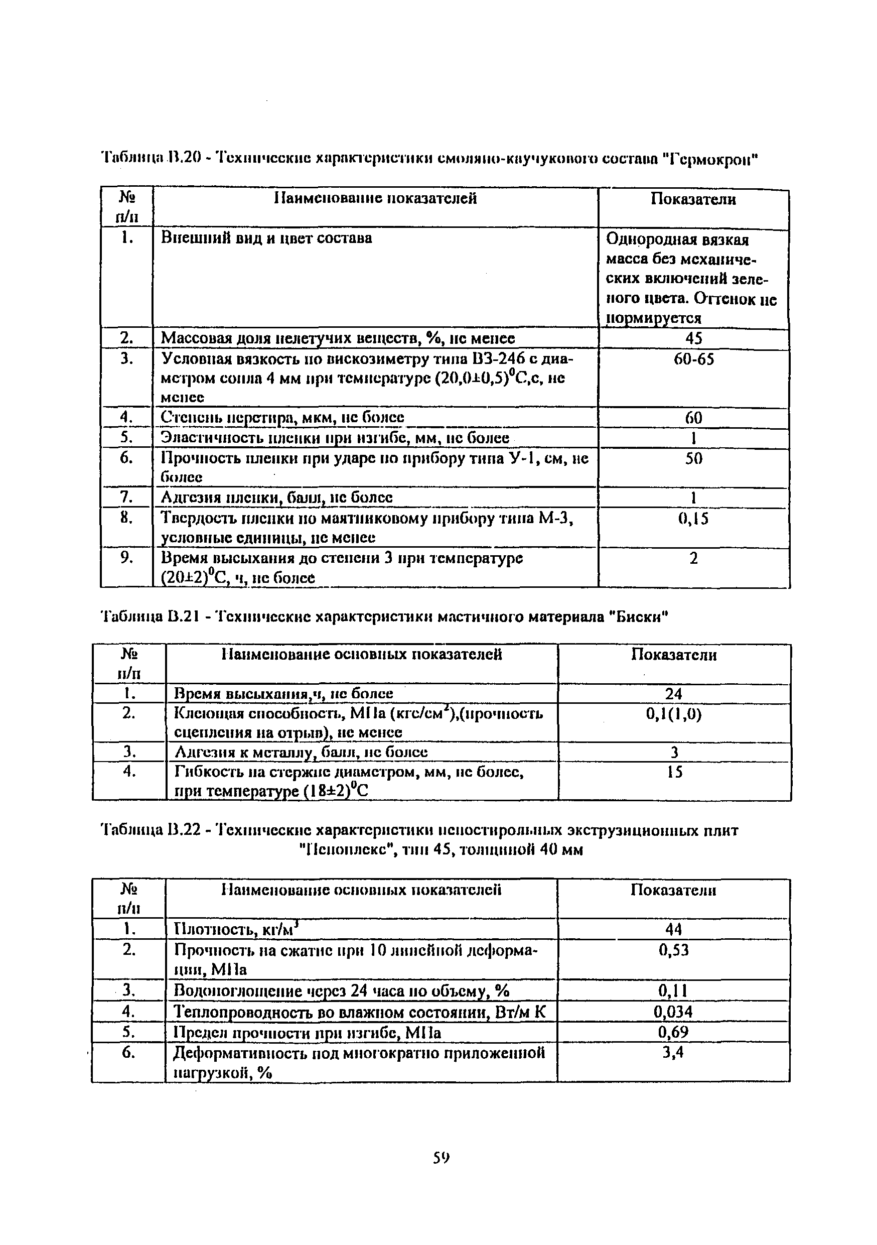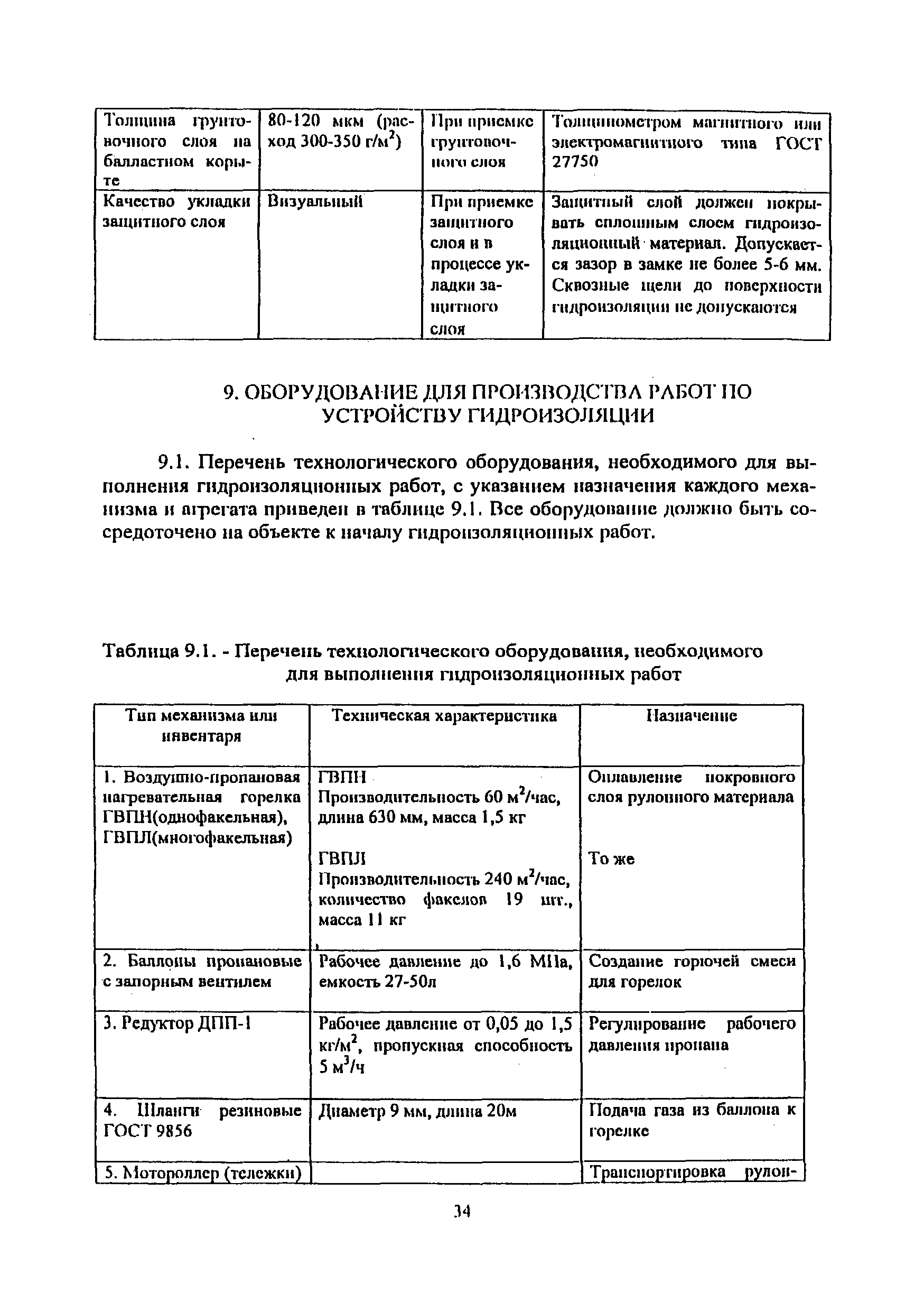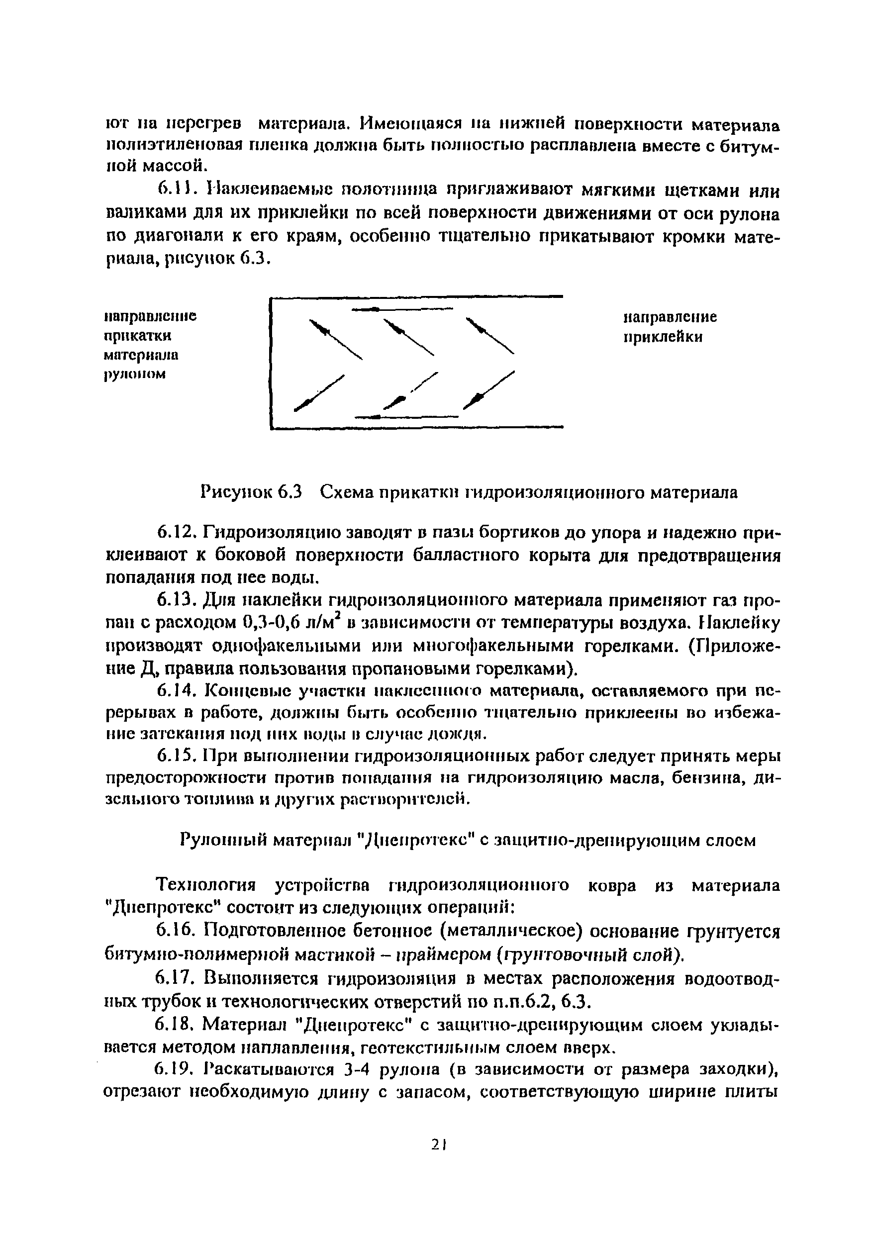 | Оглавление: | Введение 1. Общие положения 2. Выбор гидроизоляционных материалов, их характеристика 3. Конструкция гидроизоляции 4. Подготовка поверхности под гидроизоляцию 5. Устройство гидроизоляции в местах примыкания к водоотводным трубкам 6. Технология выполнения гидроизоляции 7. Защитный слой гидроизоляции 8. Контроль качества материала в правила приемки гидроизоляционного слоя 9. Оборудование для производства работ по устройству гидроизоляции 10. Хранение гидроизоляционных материалов 11. Охрана труда, окружающей среды и пожарная безопасность при устройстве гидроизоляции Список использованных источников Приложение А А. 1. Климатическое районирование А.2. Технические требования к качеству поверхности перед окрашиванием Приложение Б Б.1. График проведения работ в "окно" длительностью 7,5 часов (объем работ 25 пог.м (105 м2) Б.2. График проведения работ в "окно" длительностью 24 часа (объем работ 127 пог.м (534 м2) Приложение В В.1. Тип гидроизоляции балластных корыт конструкций мостов В.2. Характеристика рулонного гидроизоляционного материала "Техноэласт ЭМП-5,5/250" В.3. Технические характеристики рулонного гидроизоляционного материала "Техноэластмост" В.4. Технические характеристики материалов "Сервидек- Сервипак" В.5. Технические характеристики рулонного гидроизоляционного материала "Днепротекс" В.6. Технические характеристики рулонного гидроизоляционного материала "Мостопласт" В.7. Технические характеристики рулонного гидроизоляционного материала "Г-ПХБЭ-ПП" В.8. Технические характеристики рулонного гидроизоляционного материала "Кромэл" В.9. Технические характеристики рулонного гидроизоляционного материала "Поликор-12" В.10. Технические характеристики рулонного гидроизоляционного материала "Экофлекс" В.11. Технические характеристики рулонного гидроизоляционного материала "Унифлекс" В.12. Технические характеристики рулонного гидроизоляционного материала "Изопласт" В.13. Технические характеристики рулонного гидроизоляционного материала "Любиритмост" В.14. Технические характеристики рулонного гидроизоляционного материала "Филизол-Супер" В.15. Технические характеристика рулонного гидроизоляционного материала "Рубитексмост" В.16. Технические характеристики двухкомпонентного мастичного материала "Изокром-И" В.17. Технические характеристики двухкомпонентного мастичного материала "Изокром-К" В.18. Технические характеристики однокомпонентного мастичного материала "Изокром-И" В.19. Технические характеристики мастичных гидроизоляционных материалов "Мастмэл-1" и "Мастмэл-2" В.20. Технические характеристики смоляно-каучукового состава "Гермокрон" В.21. Технические характеристики мастичного материала "Биски" В.22. Технические характеристики пеностирольных экструзиционных плит "Пеноплекс", тип 45, толщиной 40 мм В.23. Технические характеристики защитного материала "Тайпар" В.24. Технические характеристики цементно-полимерного состава марки "Ксайпекс-Патч-Плаг" В.25. Технические характеристики защитного состава "Кальматрон" В.26. Технические характеристики цементно-полимерного состава марки "Ксайпекс-Концентрат" В.27. Технические характеристика цементно-полимерных составов марки "Ремстрим" В.28. Технические характеристики сухих смесей ТФ-2 В.29. Технические характеристики бетонных сухих ремонтных смесей марки "Эмако" В.30. Вспомогательные материалы 