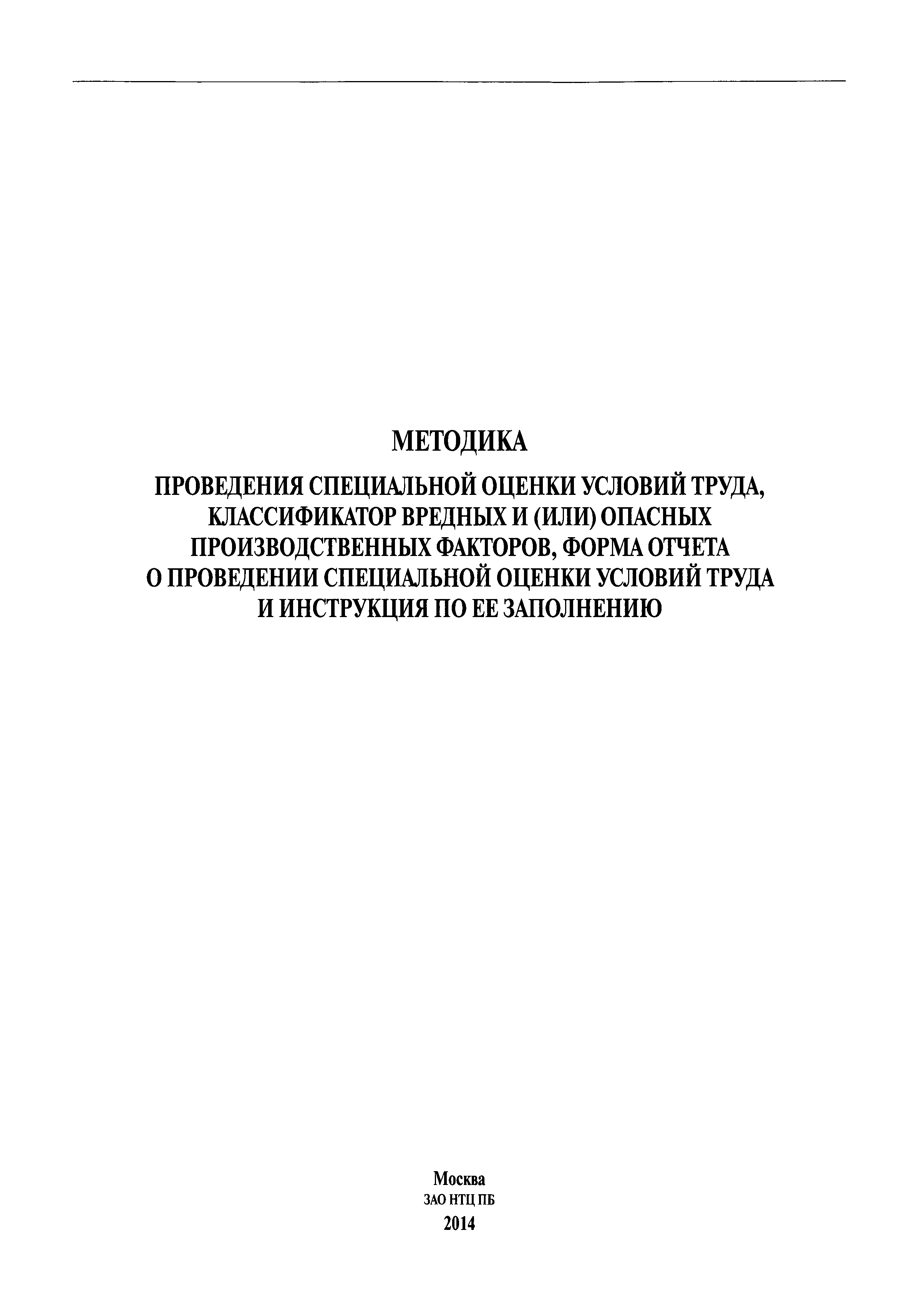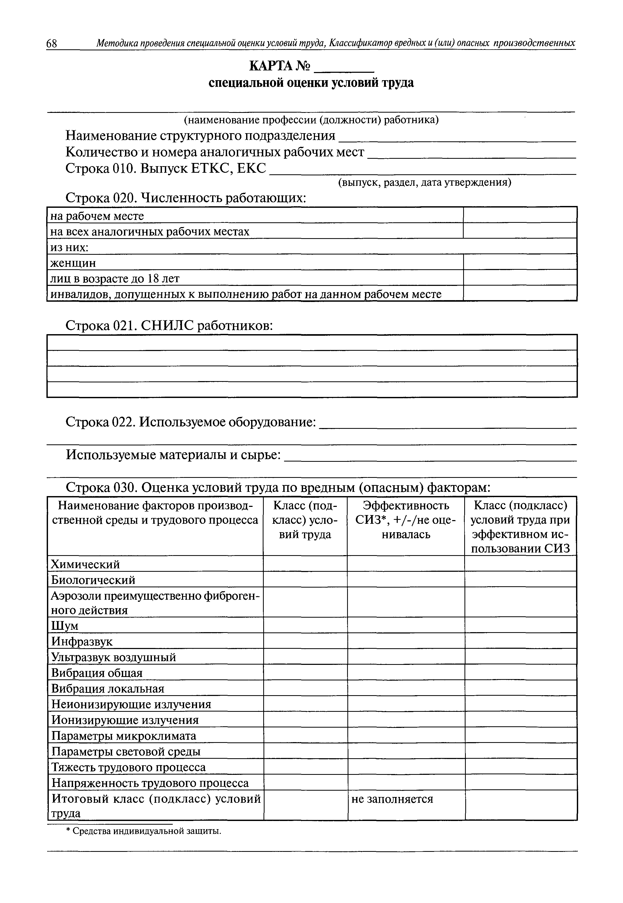 | Оглавление: | Раздел I. Сведения об организации, проводящей специальную оценку условий труда Раздел II. Перечень рабочих мест, на которых проводилась специальная оценка условий труда Раздел III. Форма карты специальной оценки условий труда работников Раздел IV. Форма протокола оценки эффективности средств индивидуальной защиты на рабочем месте Раздел V. Форма сводной ведомости результатов проведения специальной оценки условий труда Раздел VI. Форма перечня рекомендуемых мероприятий по улучшению условий труда |