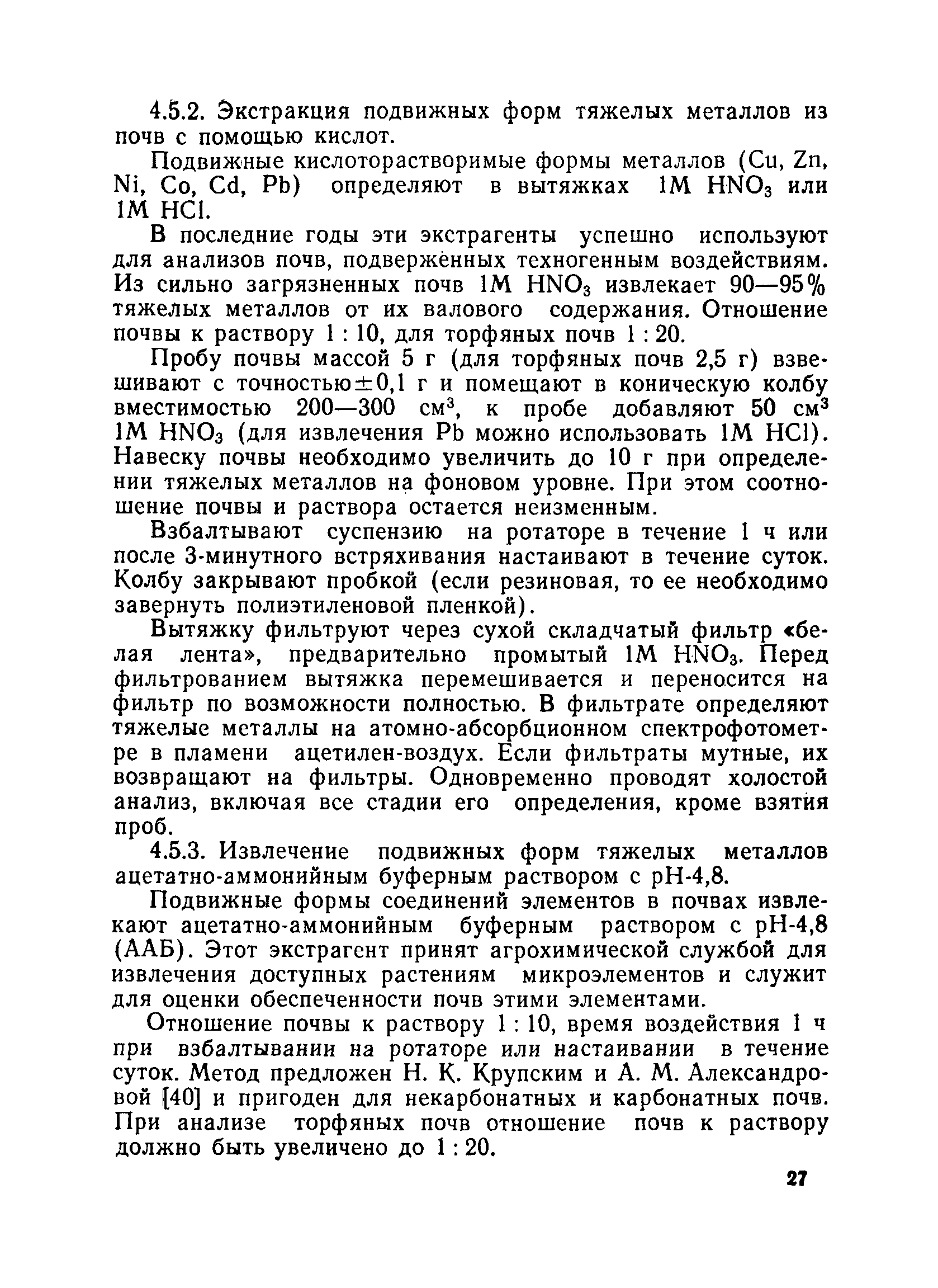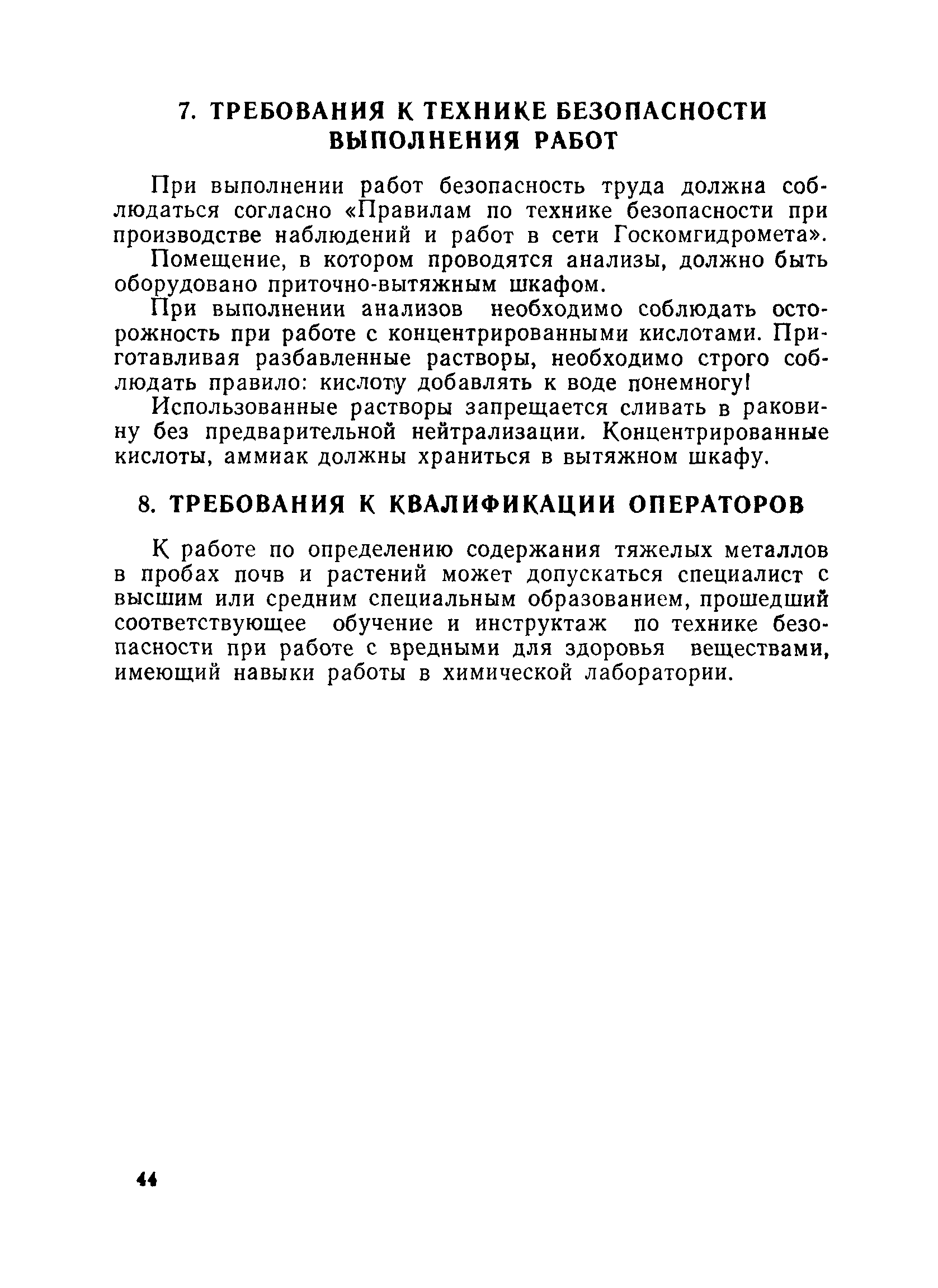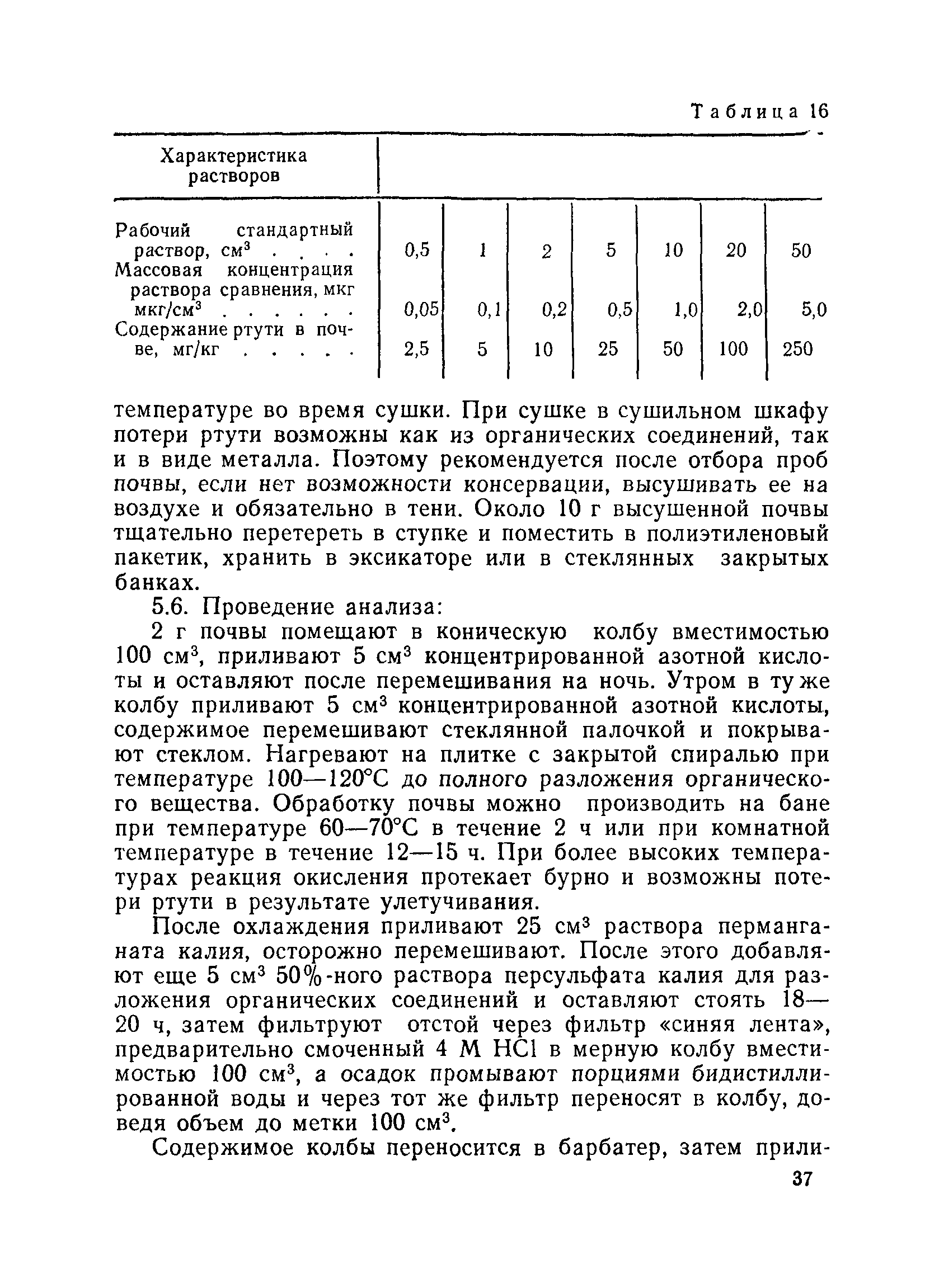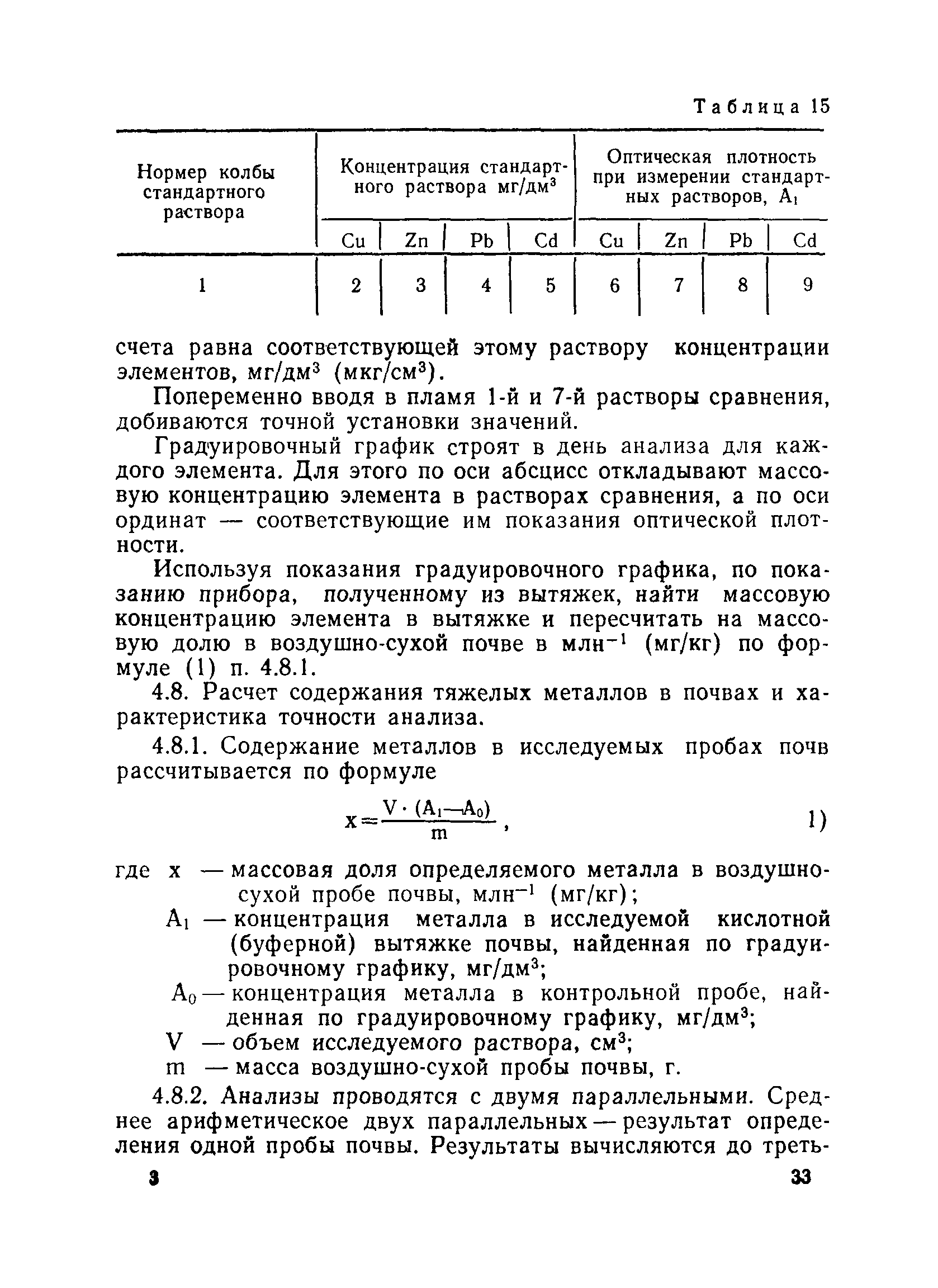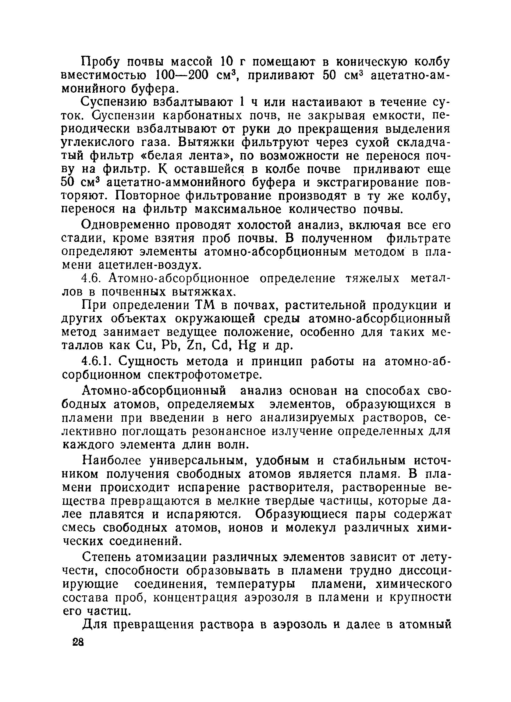 | Оглавление: | 1. Основные положения 2. Планирование работ по определению тяжелых металлов в почвах сельскохозяйственных угодий, продукции растениеводства и кормах 3. Отбор проб почвы и растений при общих и локальных загрязнениях 3.3. Отбор проб почвы 3.4. Отбор проб продукции растениеводства и кормов 4. Определение содержания тяжелых металлов в пробах почвы 4.3. Подготовка к выполнению анализа 4.3.1. Приготовление растворов 4.3.2. Приготовление растворов сравнения для проведения на стройки прибора и построения градуировочного графика при экстракции тяжелых металлов растворами кислот 4.4. Подготовка проб почвы к анализу 4.5. Проведение анализа 4.5.1. Химическое разложение проб почвы при валовом определении тяжелых металлов 4.5.2. Экстракция подвижных форм тяжелых металлов из почв с помощью кислот 4.5.3. Извлечение подвижных форм тяжелых металлов ацетатно-аммонийным буферным раствором с рН-4,8 4.6. Атомно-абсорбционное определение тяжелых металлов в почвенных вытяжках 4.6.1. Сущность метода и принцип работы на атомно-абсорбционном спектрофотометре 4.6.2. Подготовка прибора к работе 4.6.3. Порядок выполнения измерений содержания тяжелых металлов в почвенных вытяжках на атомно-абсорбционном спектрофотометре 4.7. Градуировка прибора и построение градуировочного графика 4.8. Расчет содержания тяжелых металлов в почвах и характеристика точности анализов 5. Атомно-абсорбционный метод определения ртути в почве 5.4. Подготовка к выполнению измерений 5.5. Подготовка проб к анализу 5.6. Проведение анализа 5.7. Построение градуировочного графика 5.8. Расчет содержания ртути в исследуемых пробах почв, характеристики точности анализа 6. Атомно-абсорбционное определение тяжелых металлов в растительных пробах 6.4. Подготовка к анализу 6.4.3. Подготовка растительного материала 6.5. Проведение анализа 6.5.1. Минерализация растительных проб 6.5.2. Кислотная экстракция тяжелых металлов из золы 6.6. Определение тяжелых металлов в растворах золы на атомно-абсорбционном спектрофотометре 6.7. Расчет содержания тяжелых металлов в растительных пробах 7. Требования к технике безопасности выполнения работ 8. Требования к квалификации операторов Приложения Литература |