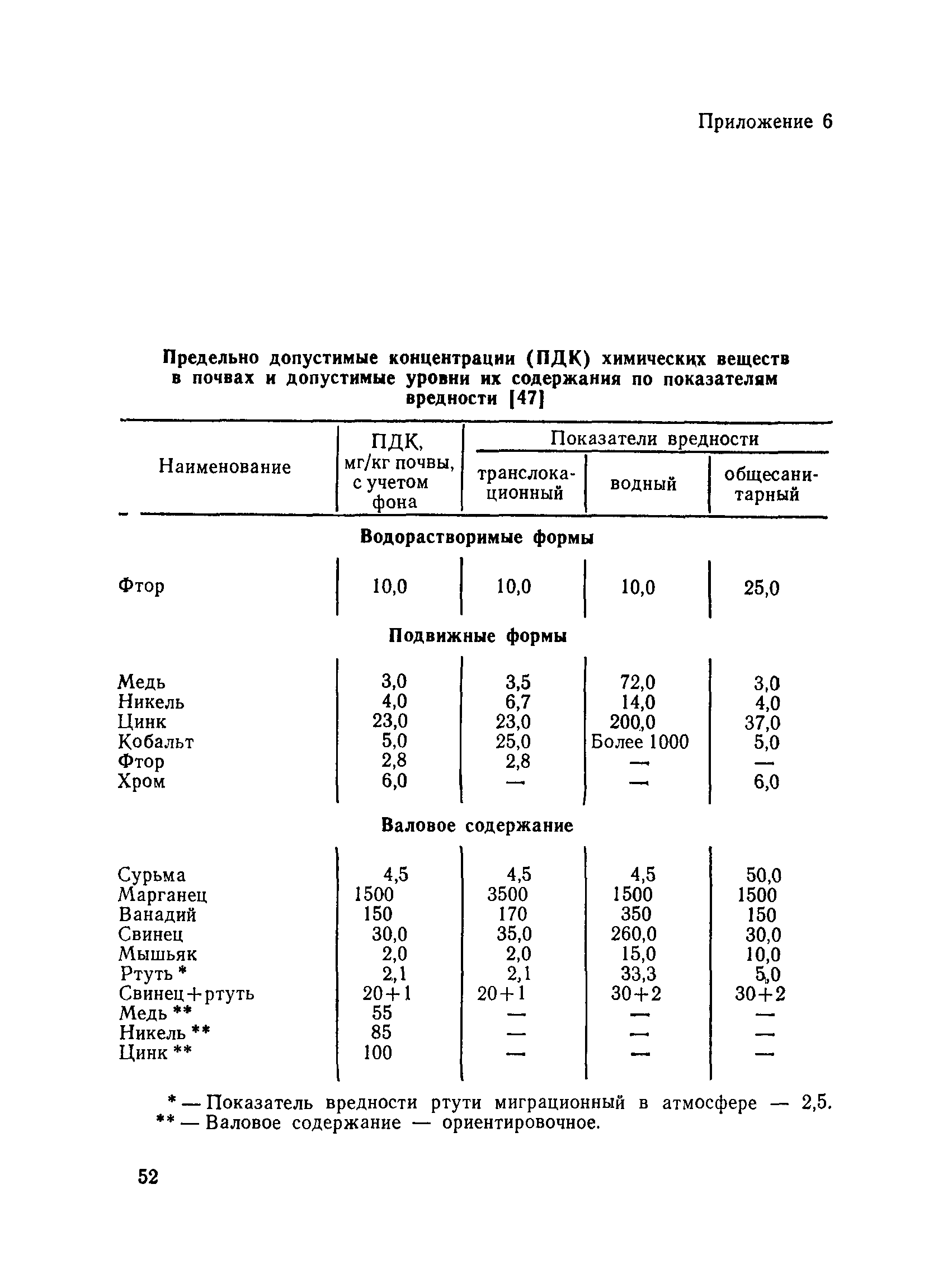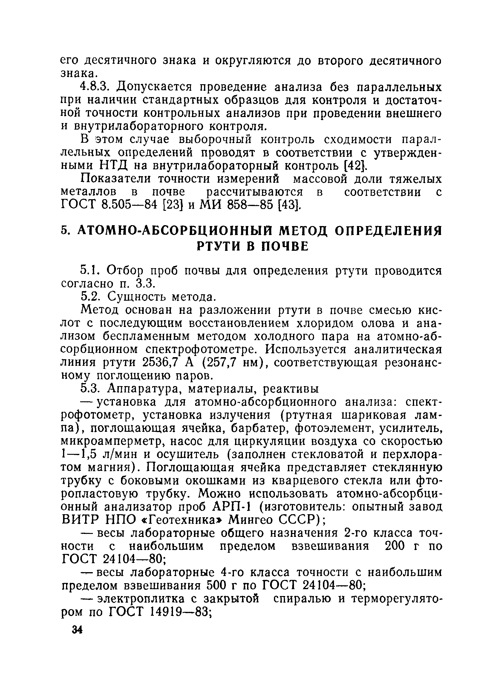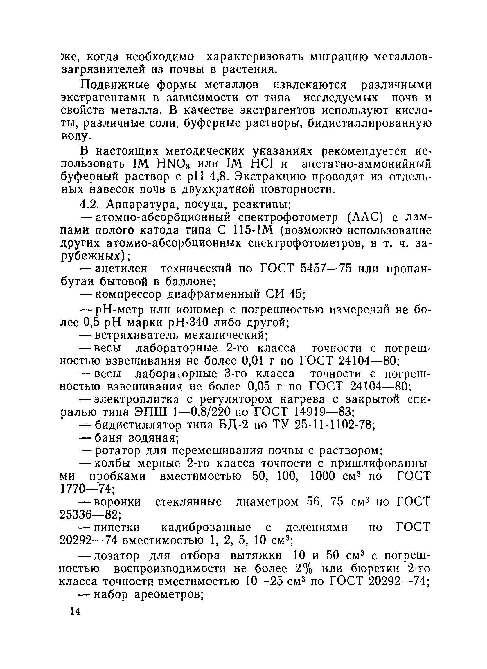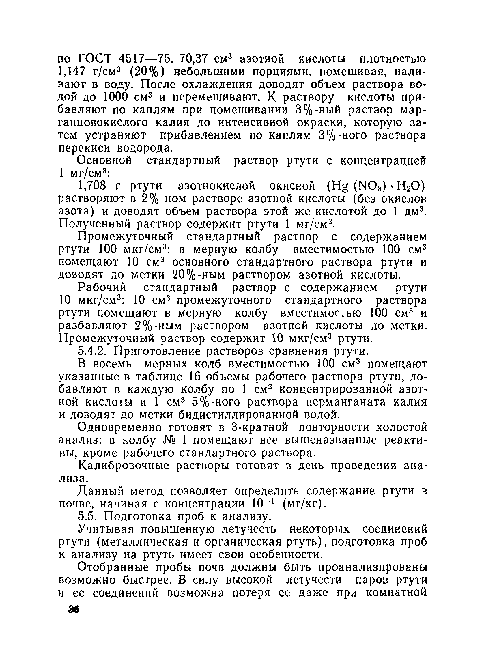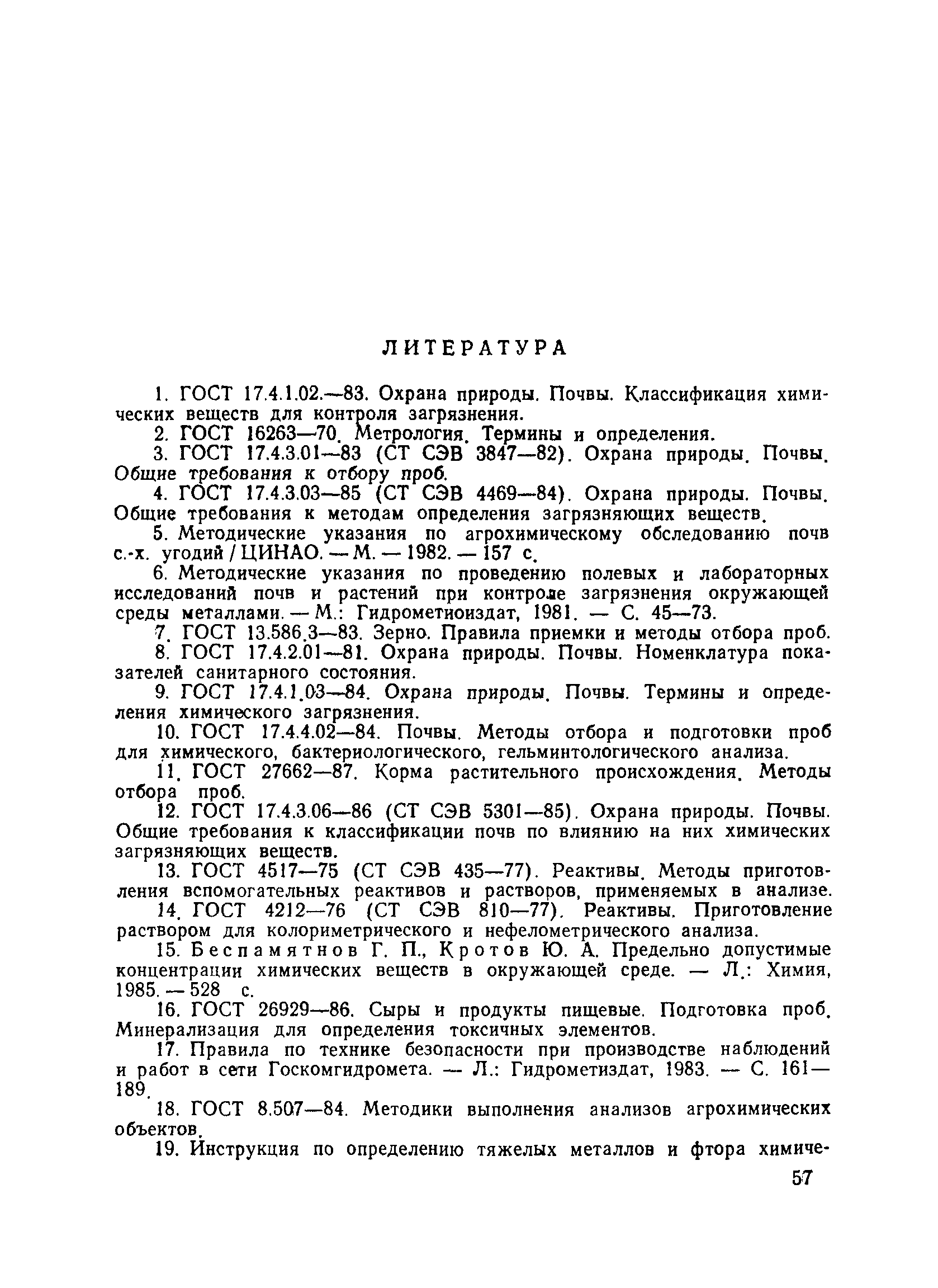 | Оглавление: | 1. Основные положения 2. Планирование работ по определению тяжелых металлов в почвах сельскохозяйственных угодий, продукции растениеводства и кормах 3. Отбор проб почвы и растений при общих и локальных загрязнениях 3.3. Отбор проб почвы 3.4. Отбор проб продукции растениеводства и кормов 4. Определение содержания тяжелых металлов в пробах почвы 4.3. Подготовка к выполнению анализа 4.3.1. Приготовление растворов 4.3.2. Приготовление растворов сравнения для проведения на стройки прибора и построения градуировочного графика при экстракции тяжелых металлов растворами кислот 4.4. Подготовка проб почвы к анализу 4.5. Проведение анализа 4.5.1. Химическое разложение проб почвы при валовом определении тяжелых металлов 4.5.2. Экстракция подвижных форм тяжелых металлов из почв с помощью кислот 4.5.3. Извлечение подвижных форм тяжелых металлов ацетатно-аммонийным буферным раствором с рН-4,8 4.6. Атомно-абсорбционное определение тяжелых металлов в почвенных вытяжках 4.6.1. Сущность метода и принцип работы на атомно-абсорбционном спектрофотометре 4.6.2. Подготовка прибора к работе 4.6.3. Порядок выполнения измерений содержания тяжелых металлов в почвенных вытяжках на атомно-абсорбционном спектрофотометре 4.7. Градуировка прибора и построение градуировочного графика 4.8. Расчет содержания тяжелых металлов в почвах и характеристика точности анализов 5. Атомно-абсорбционный метод определения ртути в почве 5.4. Подготовка к выполнению измерений 5.5. Подготовка проб к анализу 5.6. Проведение анализа 5.7. Построение градуировочного графика 5.8. Расчет содержания ртути в исследуемых пробах почв, характеристики точности анализа 6. Атомно-абсорбционное определение тяжелых металлов в растительных пробах 6.4. Подготовка к анализу 6.4.3. Подготовка растительного материала 6.5. Проведение анализа 6.5.1. Минерализация растительных проб 6.5.2. Кислотная экстракция тяжелых металлов из золы 6.6. Определение тяжелых металлов в растворах золы на атомно-абсорбционном спектрофотометре 6.7. Расчет содержания тяжелых металлов в растительных пробах 7. Требования к технике безопасности выполнения работ 8. Требования к квалификации операторов Приложения Литература |