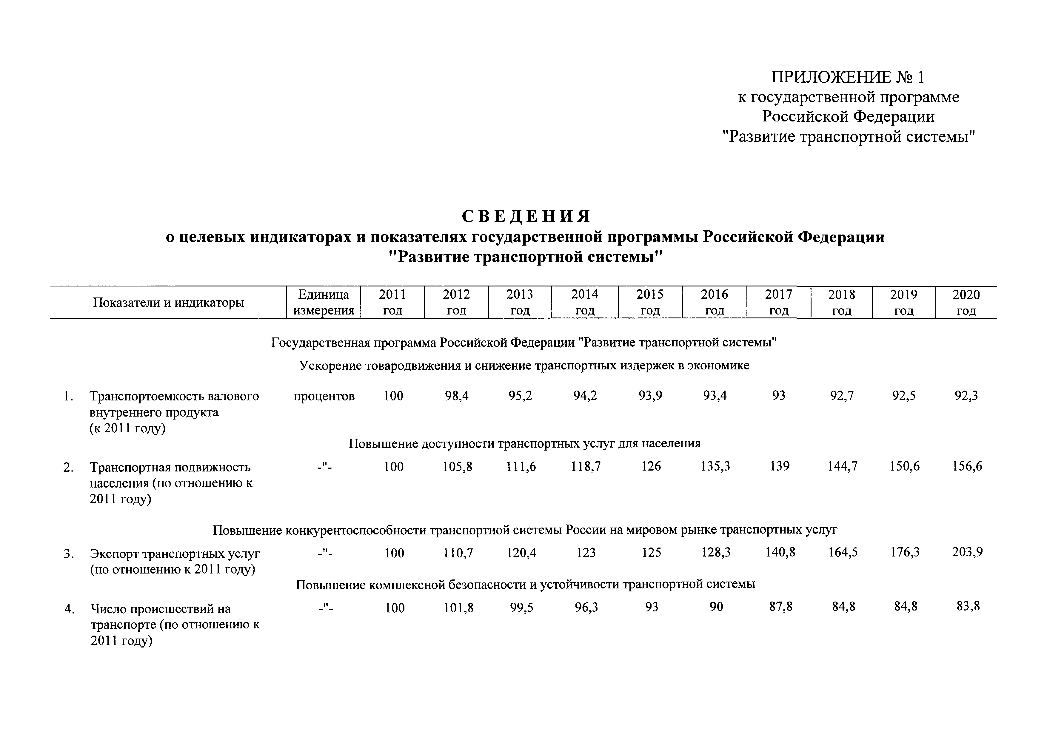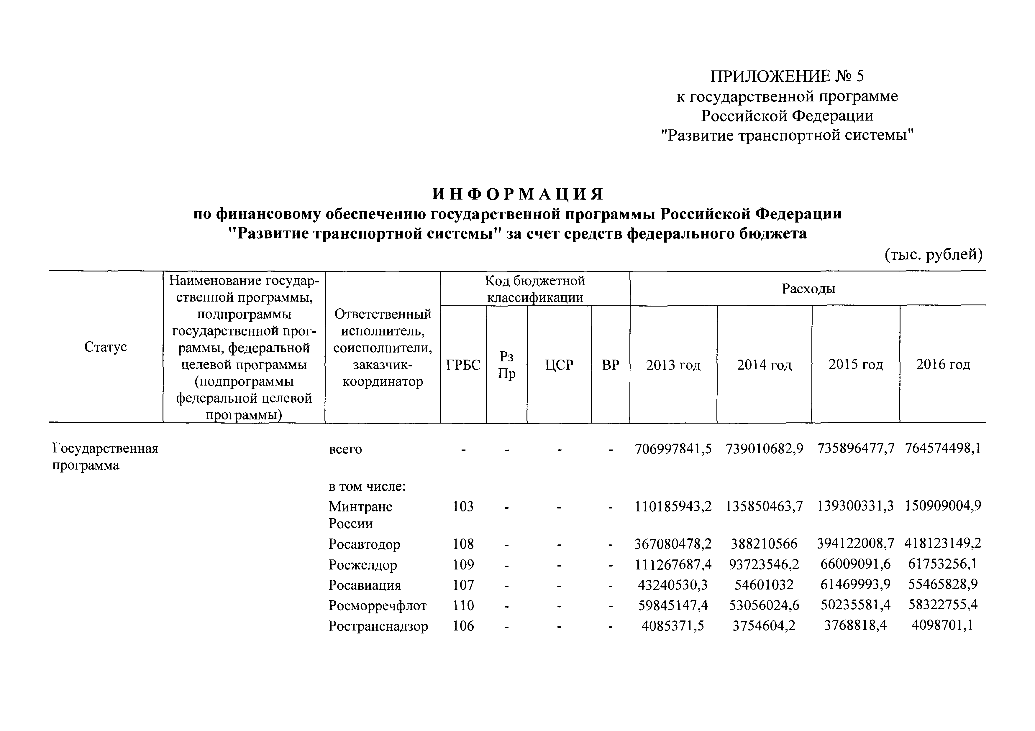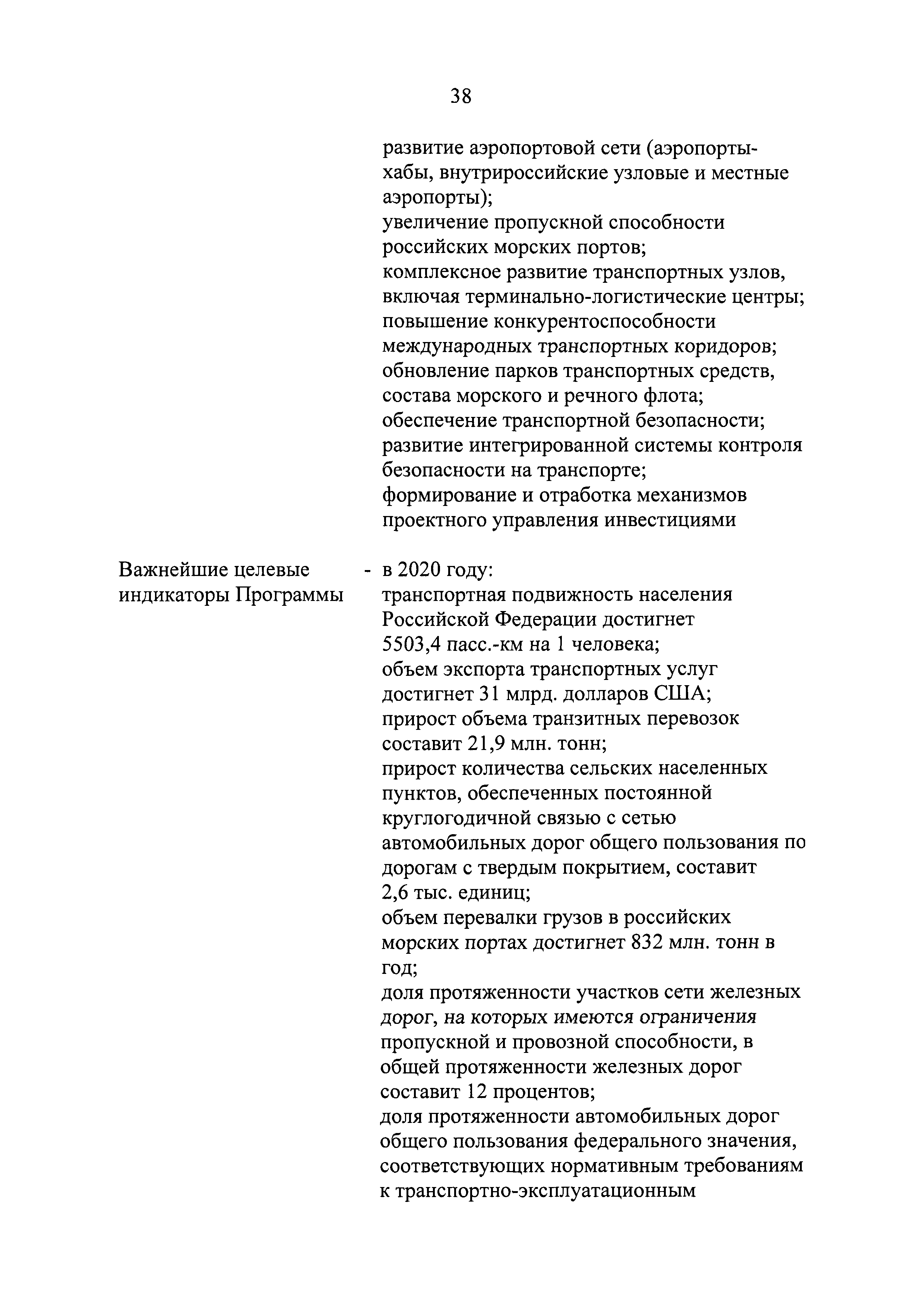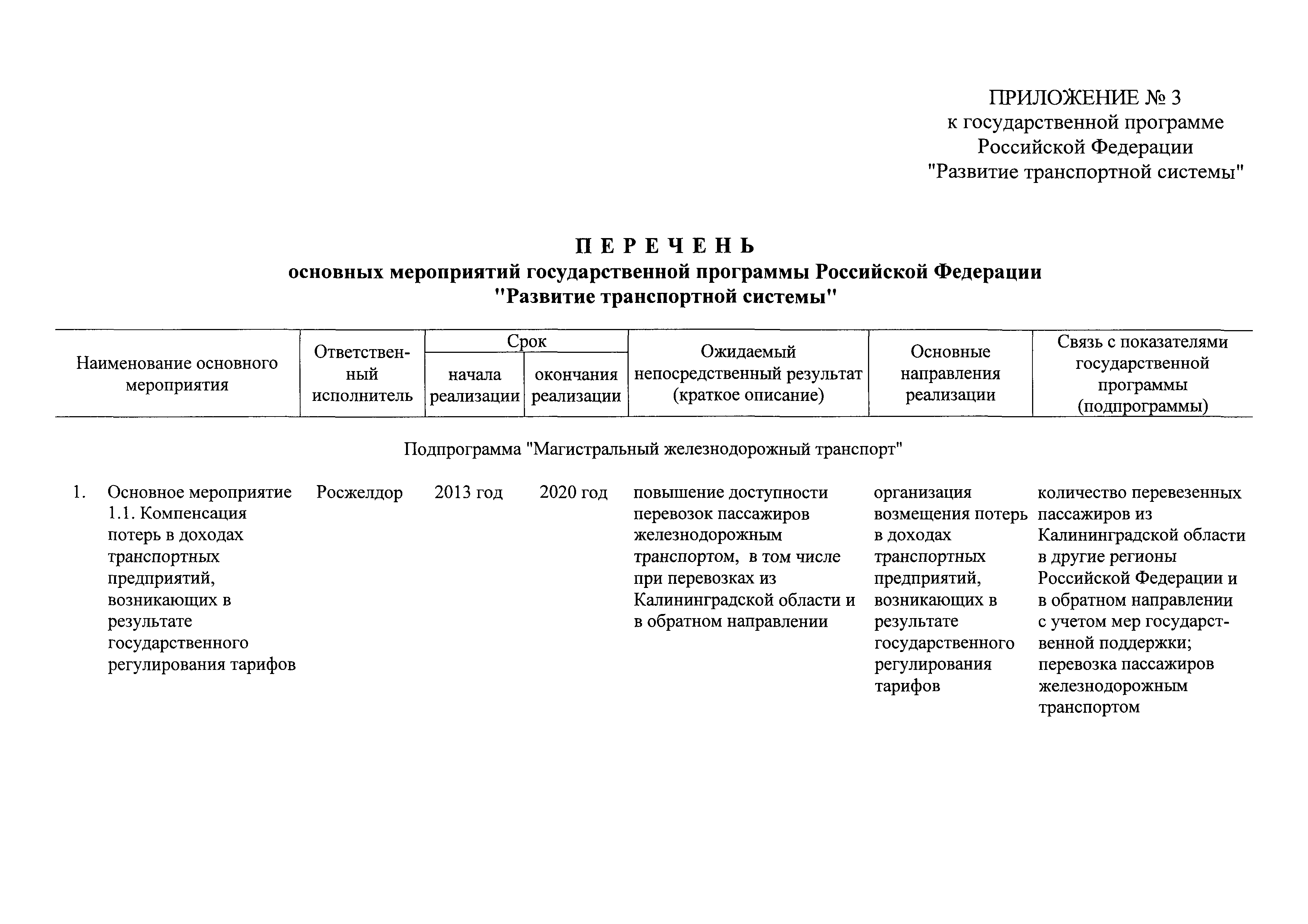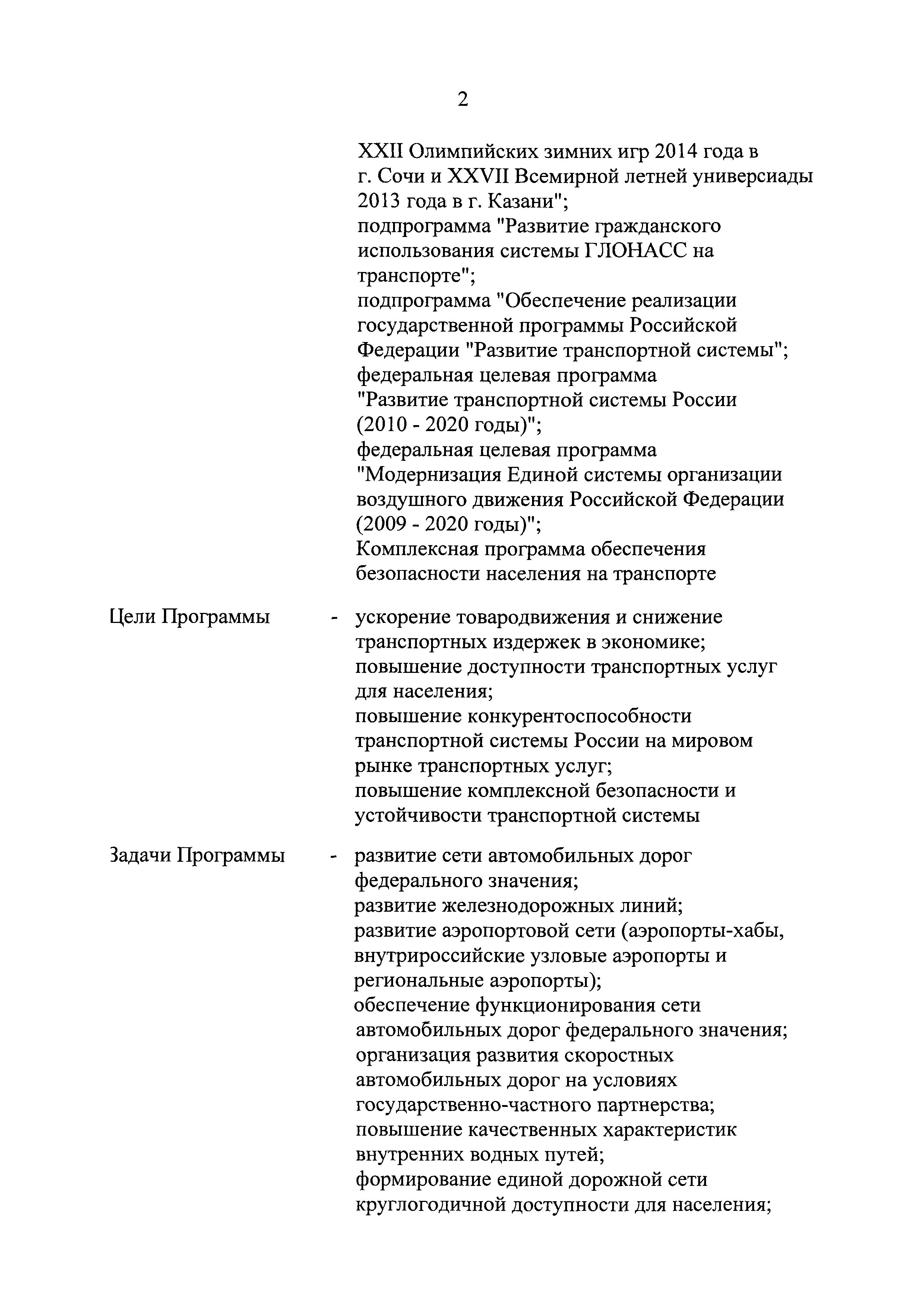 | Оглавление: | Паспорт государственной программы Российской Федерации "Развитие транспортной системы" Паспорт подпрограммы "Магистральный железнодорожный транспорт" государственной программы Российской Федерации "Развитие транспортной системы" Паспорт подпрограммы "Дорожное хозяйство" государственной программы Российской Федерации "Развитие транспортной системы" Паспорт подпрограммы "Гражданская авиация и аэронавигационное обслуживание" государственной программы Российской Федерации "Развитие транспортной системы" Паспорт подпрограммы "Морской и речной транспорт" государственной программы Российской Федерации "Развитие транспортной системы" Паспорт подпрограммы "Надзор в сфере транспорта" государственной программы Российской Федерации "Развитие транспортной системы" Паспорт подпрограммы "Развитие скоростных автомобильных дорог на условиях государственно-частного партнерства" государственной программы Российской Федерации "Развитие транспортной системы" Паспорт подпрограммы "Транспортное обеспечение XXII Олимпийских зимних игр 2014 года в г. Сочи и XXVII Всемирной летней универсиады 2013 года в г. Казани" государственной программы Российской Федерации "Развитие транспортной системы" Паспорт подпрограммы "Обеспечение реализации государственной программы Российской Федерации "Развитие транспортной системы" государственной программы Российской Федерации "Развитие транспортной системы" Паспорт подпрограммы "Развитие гражданского использования системы ГЛОНАСС на транспорте" государственной программы Российской Федерации "Развитие транспортной системы" Паспорт федеральной целевой программы "Развитие транспортной системы России (2010 - 2020 годы)" Паспорт федеральной целевой программы "Модернизация Единой системы организации воздушного движения Российской Федерации (2009 - 2020 годы)" Паспорт комплексной программы обеспечения безопасности населения на транспорте Приоритеты и цели государственной политики, а также общие требования к государственной политике субъектов Российской Федерации в сфере транспортного комплекса Приложение № 1. Сведения о целевых индикаторах и показателях государственной программы Российской Федерации "Развитие транспортной системы" Приложение № 2. Сведения о целевых индикаторах и показателях государственной программы Российской Федерации "Развитие транспортной системы" по субъектам Российской Федерации Приложение № 3. Перечень основных мероприятий государственной программы Российской Федерации "Развитие транспортной системы" Приложение № 4. Основные меры правового регулирования в сфере реализации государственной программы Российской Федерации "Развитие транспортной системы" Приложение № 5. Информация по финансовому обеспечению государственной программы Российской Федерации "Развитие транспортной системы" за счет средств федерального бюджета |