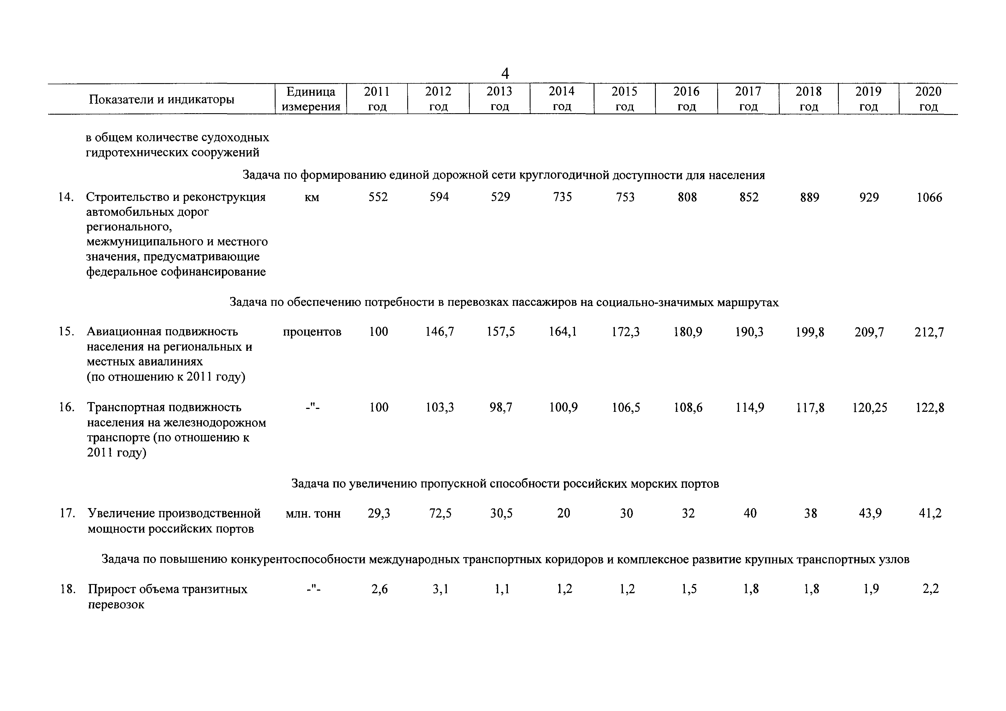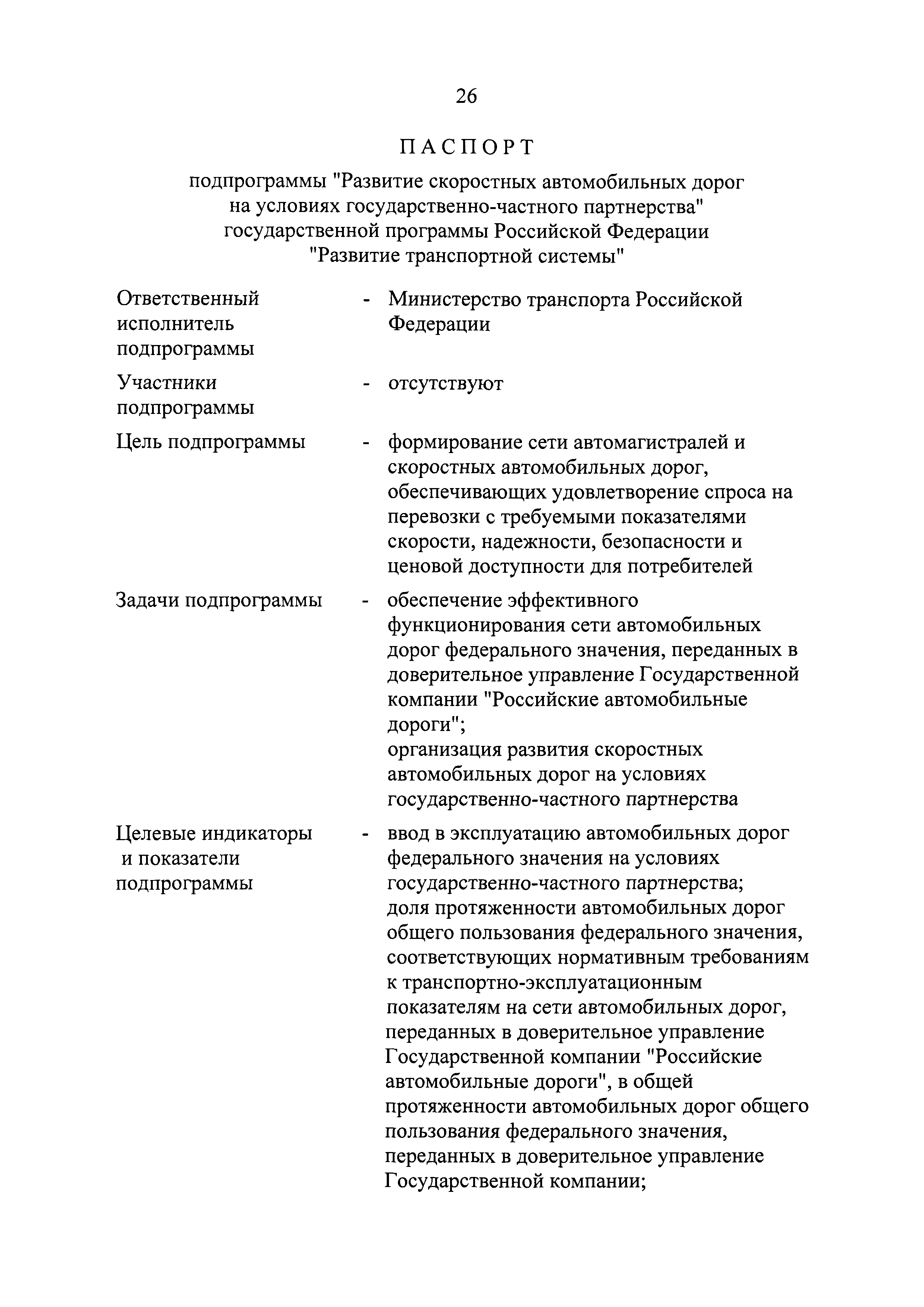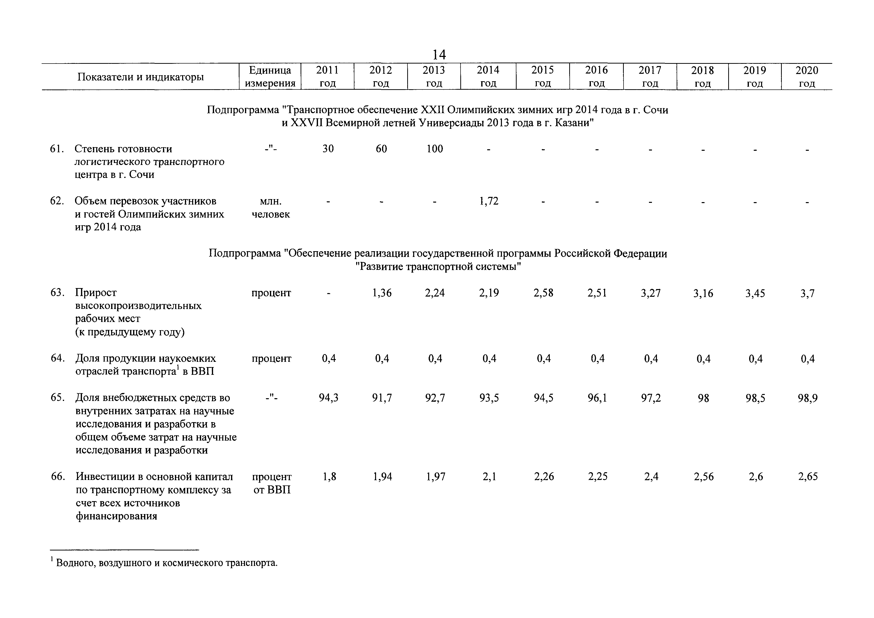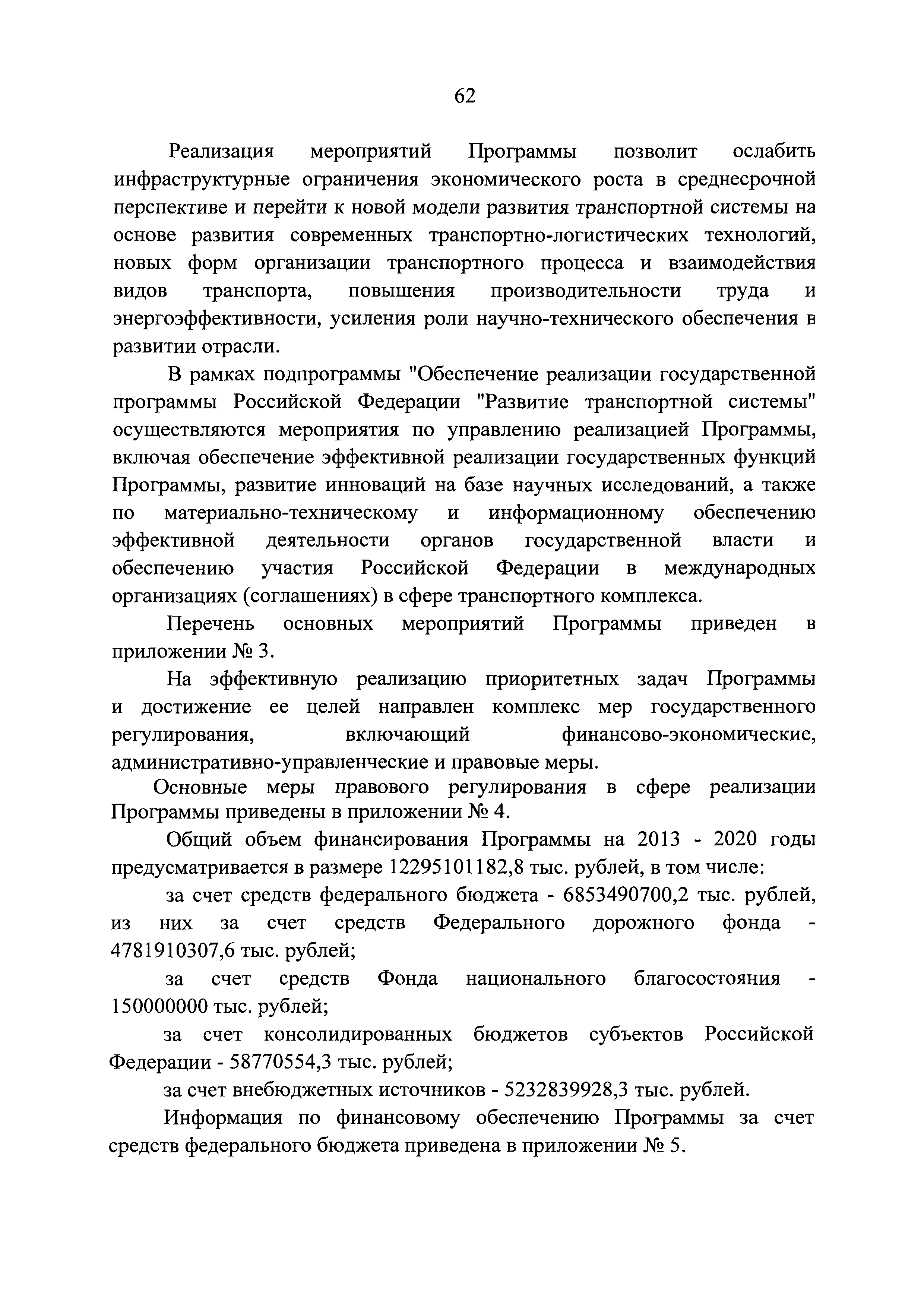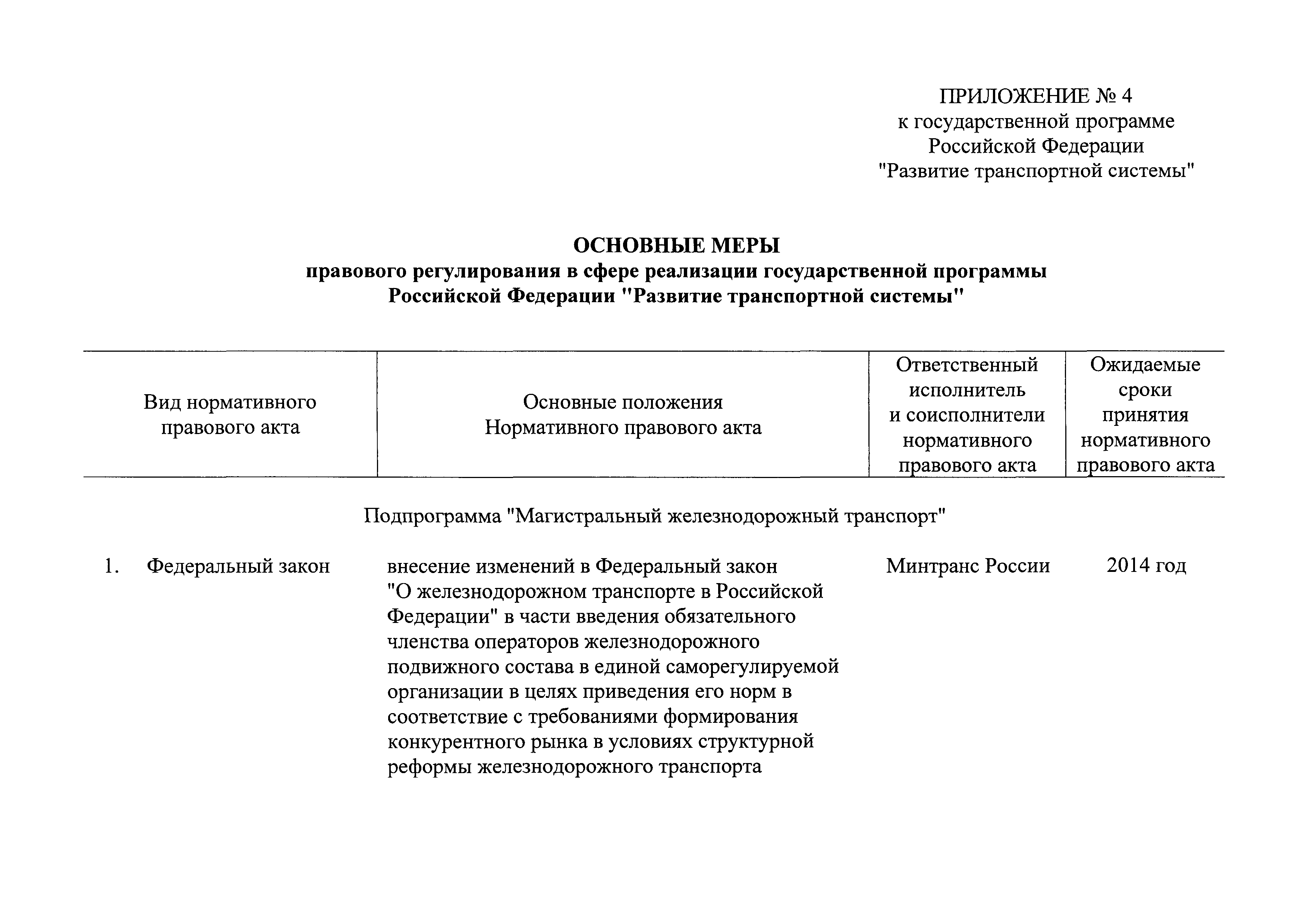 | Оглавление: | Паспорт государственной программы Российской Федерации "Развитие транспортной системы" Паспорт подпрограммы "Магистральный железнодорожный транспорт" государственной программы Российской Федерации "Развитие транспортной системы" Паспорт подпрограммы "Дорожное хозяйство" государственной программы Российской Федерации "Развитие транспортной системы" Паспорт подпрограммы "Гражданская авиация и аэронавигационное обслуживание" государственной программы Российской Федерации "Развитие транспортной системы" Паспорт подпрограммы "Морской и речной транспорт" государственной программы Российской Федерации "Развитие транспортной системы" Паспорт подпрограммы "Надзор в сфере транспорта" государственной программы Российской Федерации "Развитие транспортной системы" Паспорт подпрограммы "Развитие скоростных автомобильных дорог на условиях государственно-частного партнерства" государственной программы Российской Федерации "Развитие транспортной системы" Паспорт подпрограммы "Транспортное обеспечение XXII Олимпийских зимних игр 2014 года в г. Сочи и XXVII Всемирной летней универсиады 2013 года в г. Казани" государственной программы Российской Федерации "Развитие транспортной системы" Паспорт подпрограммы "Обеспечение реализации государственной программы Российской Федерации "Развитие транспортной системы" государственной программы Российской Федерации "Развитие транспортной системы" Паспорт подпрограммы "Развитие гражданского использования системы ГЛОНАСС на транспорте" государственной программы Российской Федерации "Развитие транспортной системы" Паспорт федеральной целевой программы "Развитие транспортной системы России (2010 - 2020 годы)" Паспорт федеральной целевой программы "Модернизация Единой системы организации воздушного движения Российской Федерации (2009 - 2020 годы)" Паспорт комплексной программы обеспечения безопасности населения на транспорте Приоритеты и цели государственной политики, а также общие требования к государственной политике субъектов Российской Федерации в сфере транспортного комплекса Приложение № 1. Сведения о целевых индикаторах и показателях государственной программы Российской Федерации "Развитие транспортной системы" Приложение № 2. Сведения о целевых индикаторах и показателях государственной программы Российской Федерации "Развитие транспортной системы" по субъектам Российской Федерации Приложение № 3. Перечень основных мероприятий государственной программы Российской Федерации "Развитие транспортной системы" Приложение № 4. Основные меры правового регулирования в сфере реализации государственной программы Российской Федерации "Развитие транспортной системы" Приложение № 5. Информация по финансовому обеспечению государственной программы Российской Федерации "Развитие транспортной системы" за счет средств федерального бюджета |