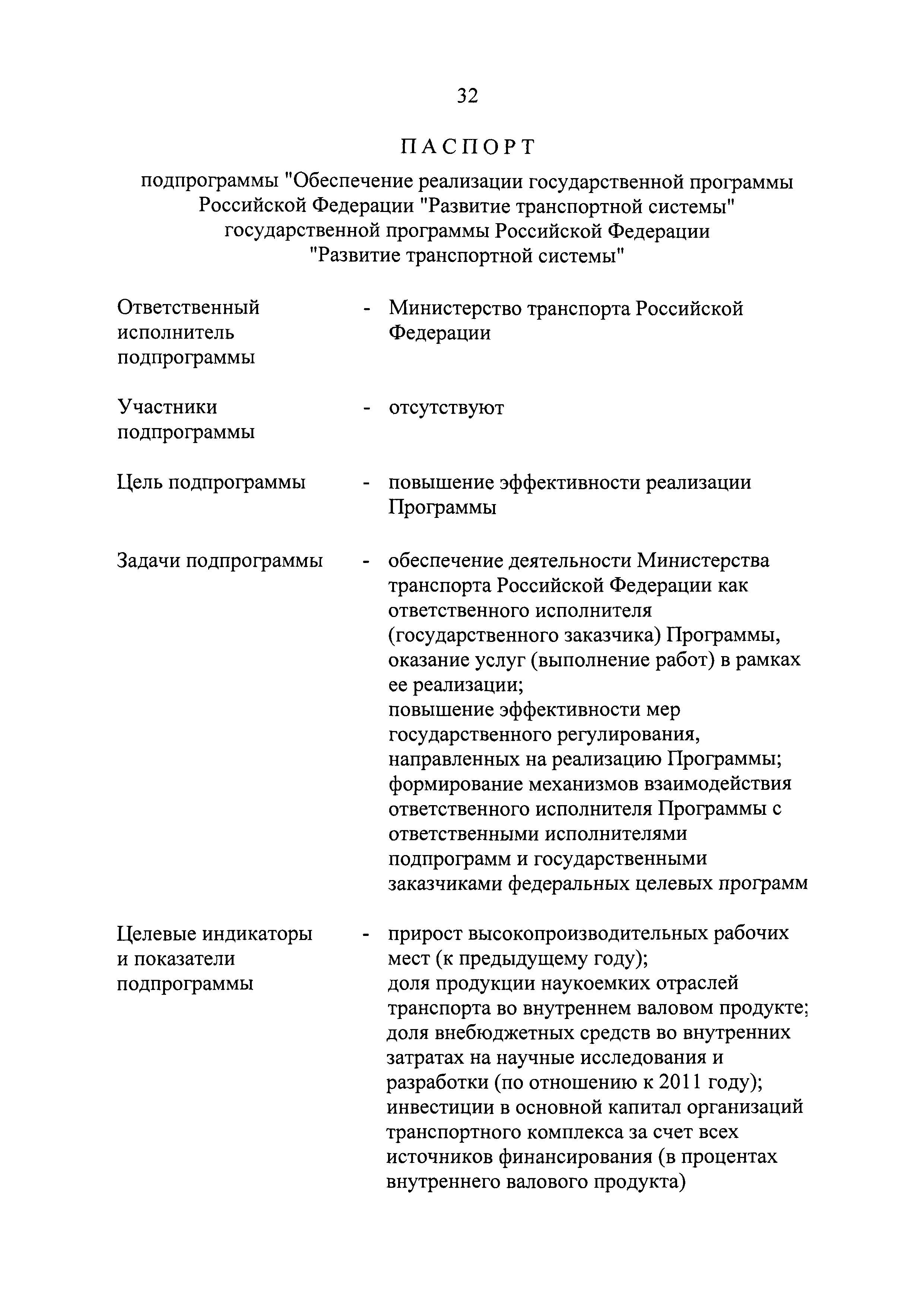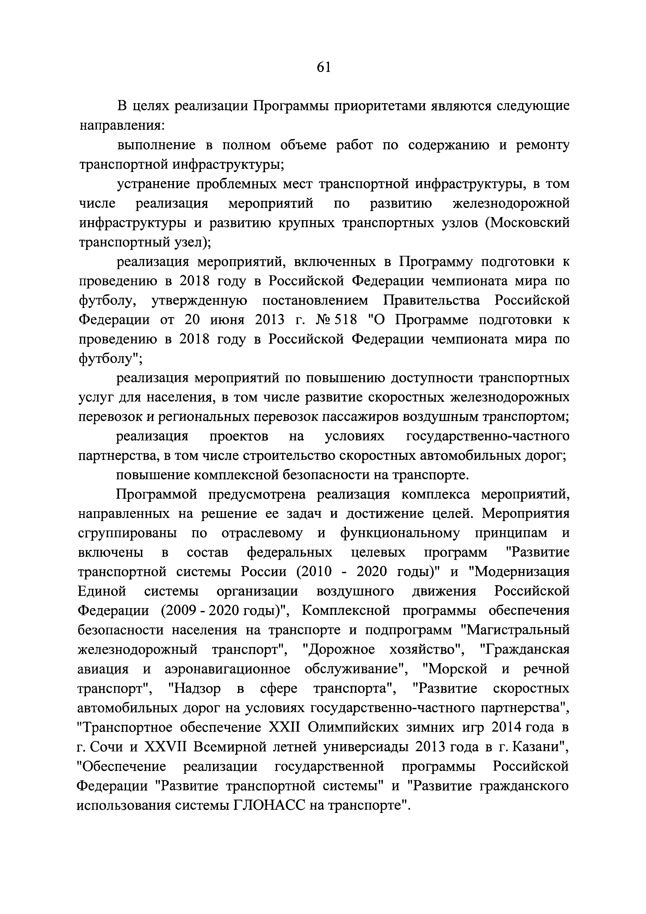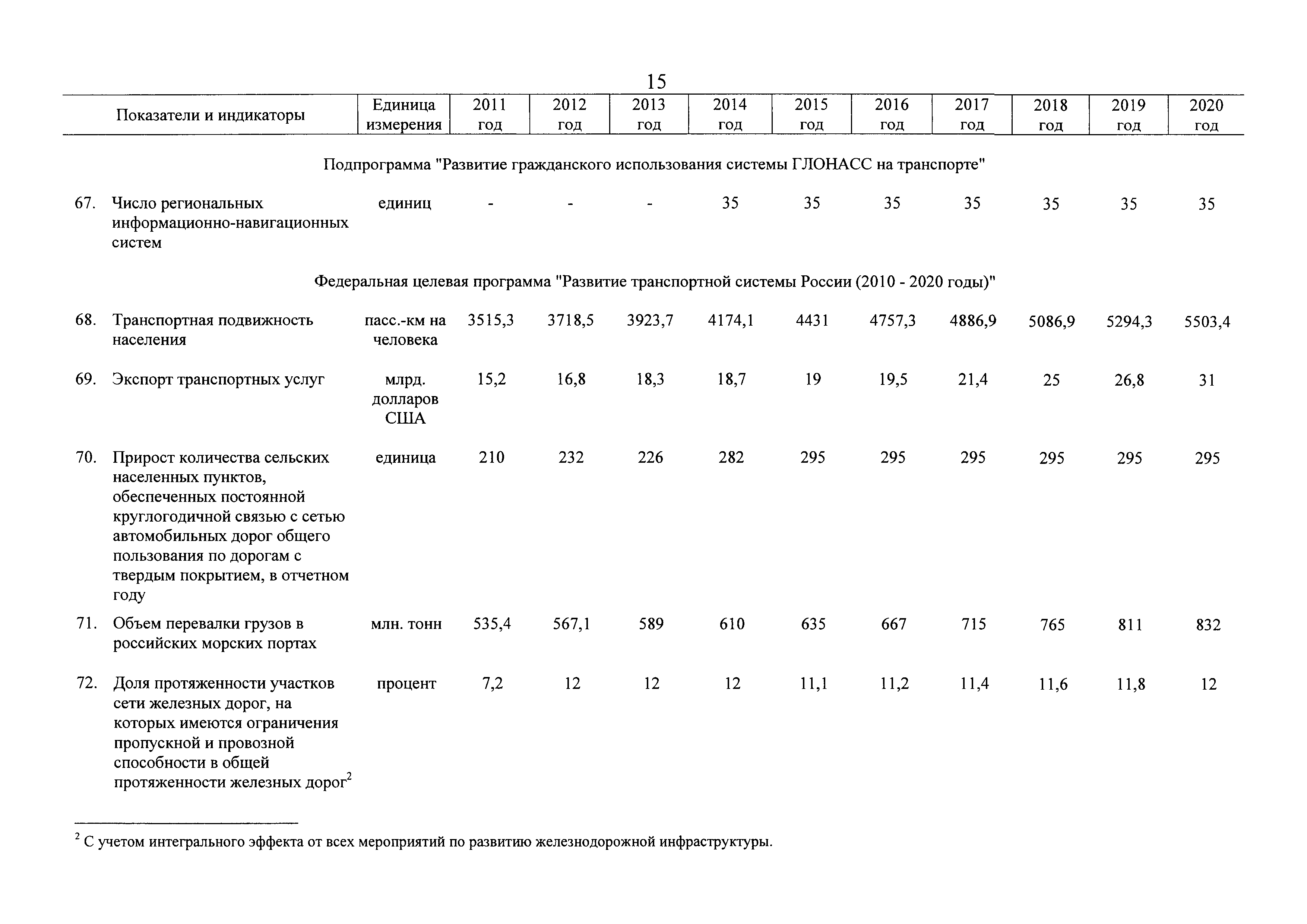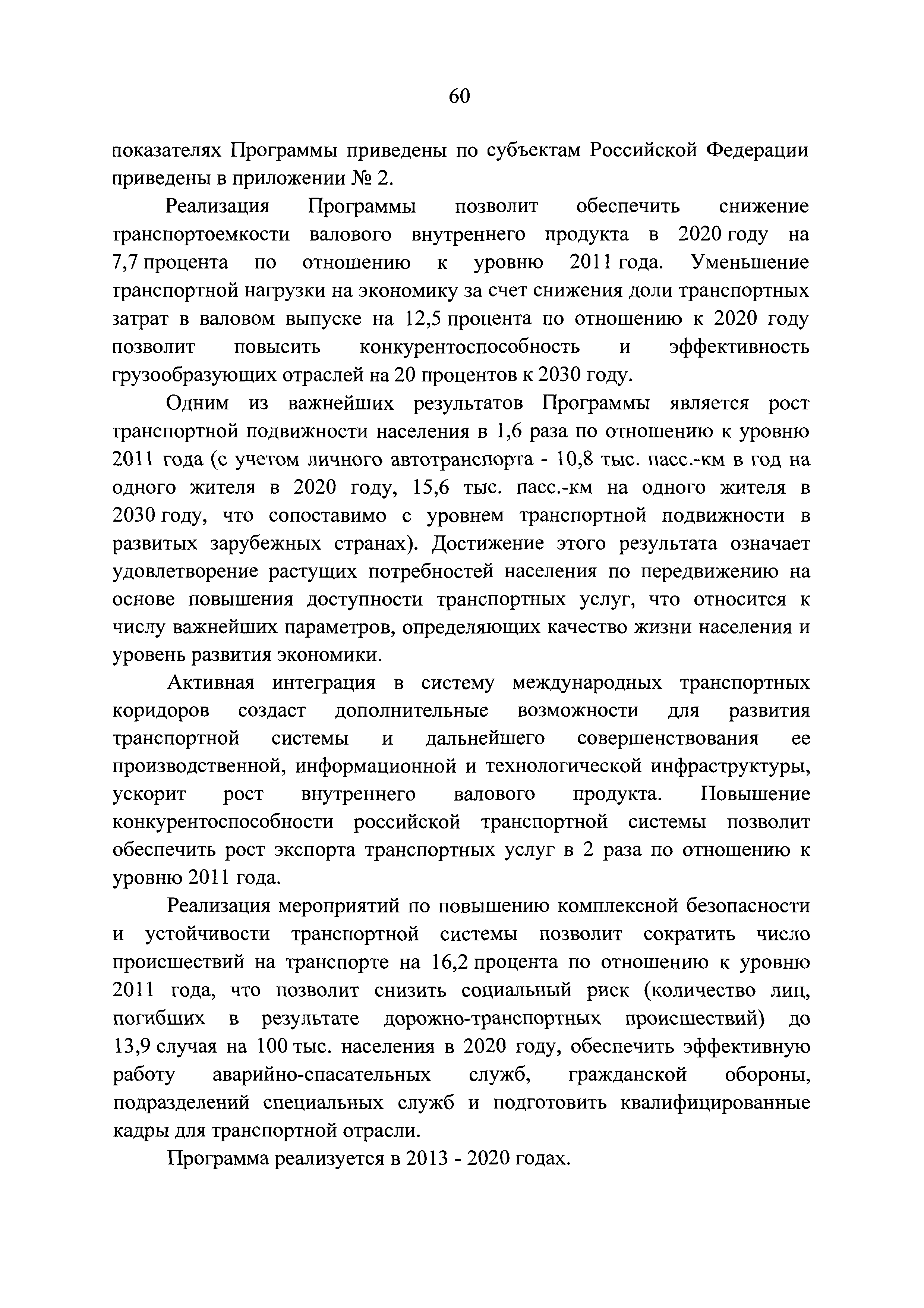 | Оглавление: | Паспорт государственной программы Российской Федерации "Развитие транспортной системы" Паспорт подпрограммы "Магистральный железнодорожный транспорт" государственной программы Российской Федерации "Развитие транспортной системы" Паспорт подпрограммы "Дорожное хозяйство" государственной программы Российской Федерации "Развитие транспортной системы" Паспорт подпрограммы "Гражданская авиация и аэронавигационное обслуживание" государственной программы Российской Федерации "Развитие транспортной системы" Паспорт подпрограммы "Морской и речной транспорт" государственной программы Российской Федерации "Развитие транспортной системы" Паспорт подпрограммы "Надзор в сфере транспорта" государственной программы Российской Федерации "Развитие транспортной системы" Паспорт подпрограммы "Развитие скоростных автомобильных дорог на условиях государственно-частного партнерства" государственной программы Российской Федерации "Развитие транспортной системы" Паспорт подпрограммы "Транспортное обеспечение XXII Олимпийских зимних игр 2014 года в г. Сочи и XXVII Всемирной летней универсиады 2013 года в г. Казани" государственной программы Российской Федерации "Развитие транспортной системы" Паспорт подпрограммы "Обеспечение реализации государственной программы Российской Федерации "Развитие транспортной системы" государственной программы Российской Федерации "Развитие транспортной системы" Паспорт подпрограммы "Развитие гражданского использования системы ГЛОНАСС на транспорте" государственной программы Российской Федерации "Развитие транспортной системы" Паспорт федеральной целевой программы "Развитие транспортной системы России (2010 - 2020 годы)" Паспорт федеральной целевой программы "Модернизация Единой системы организации воздушного движения Российской Федерации (2009 - 2020 годы)" Паспорт комплексной программы обеспечения безопасности населения на транспорте Приоритеты и цели государственной политики, а также общие требования к государственной политике субъектов Российской Федерации в сфере транспортного комплекса Приложение № 1. Сведения о целевых индикаторах и показателях государственной программы Российской Федерации "Развитие транспортной системы" Приложение № 2. Сведения о целевых индикаторах и показателях государственной программы Российской Федерации "Развитие транспортной системы" по субъектам Российской Федерации Приложение № 3. Перечень основных мероприятий государственной программы Российской Федерации "Развитие транспортной системы" Приложение № 4. Основные меры правового регулирования в сфере реализации государственной программы Российской Федерации "Развитие транспортной системы" Приложение № 5. Информация по финансовому обеспечению государственной программы Российской Федерации "Развитие транспортной системы" за счет средств федерального бюджета |