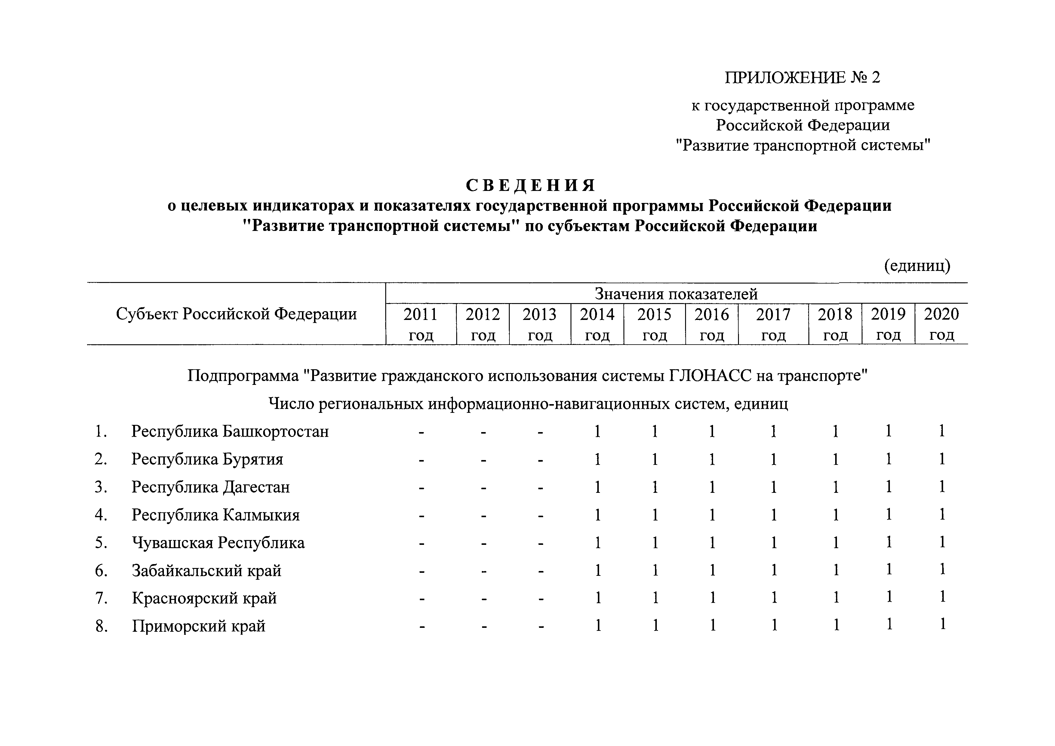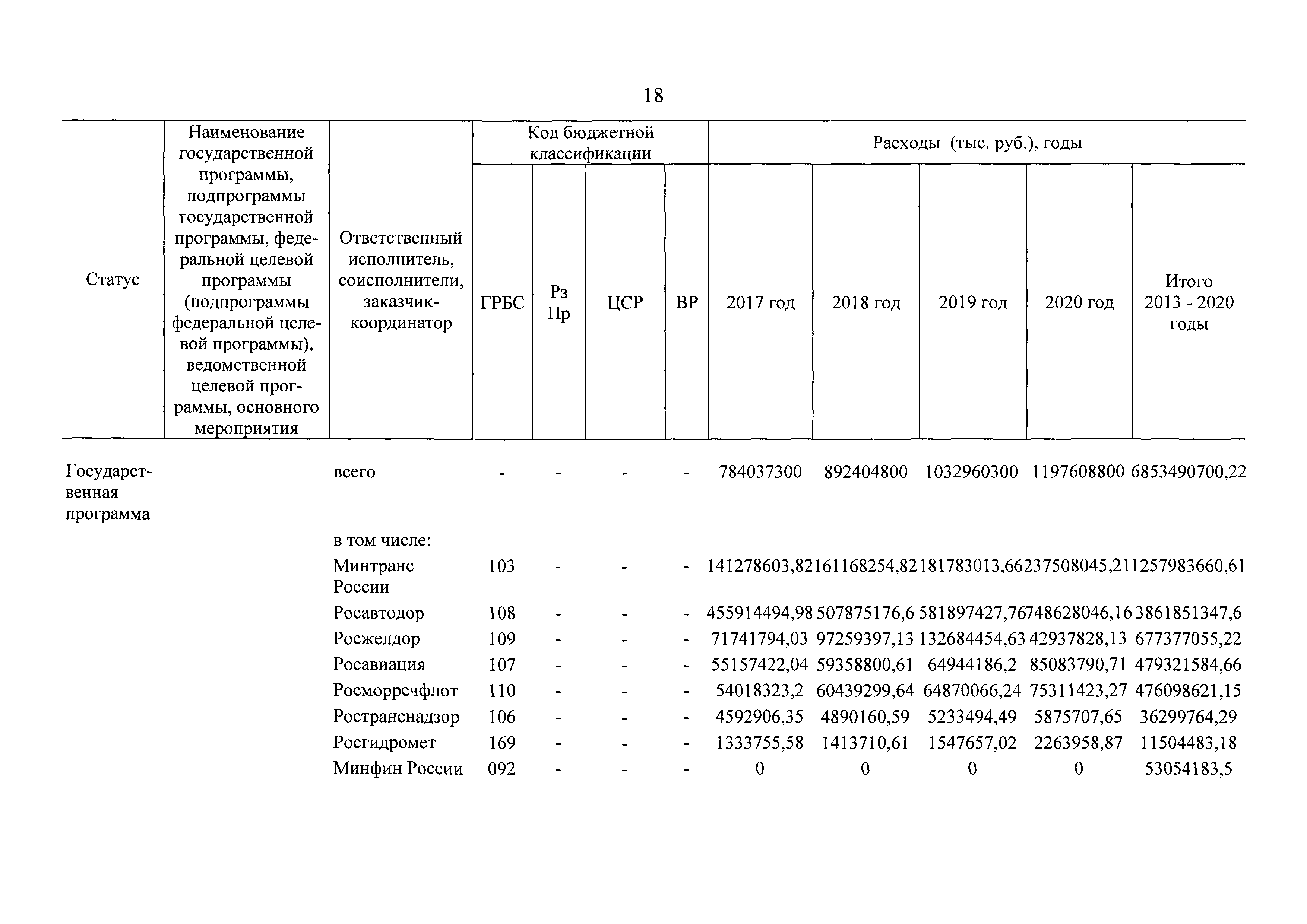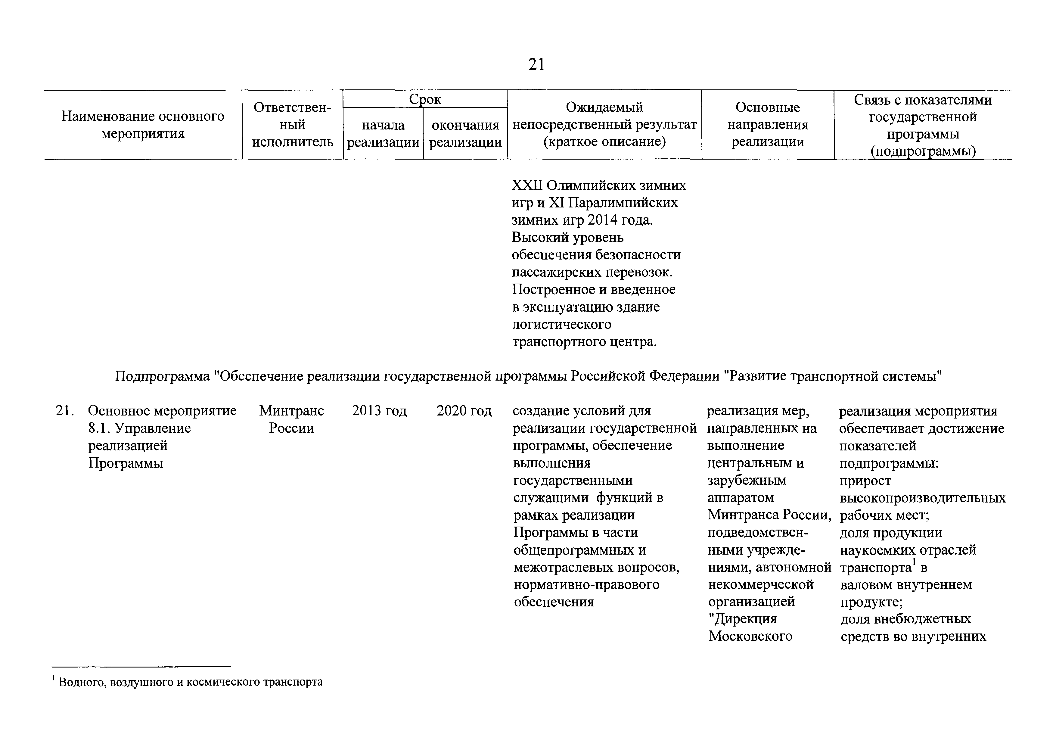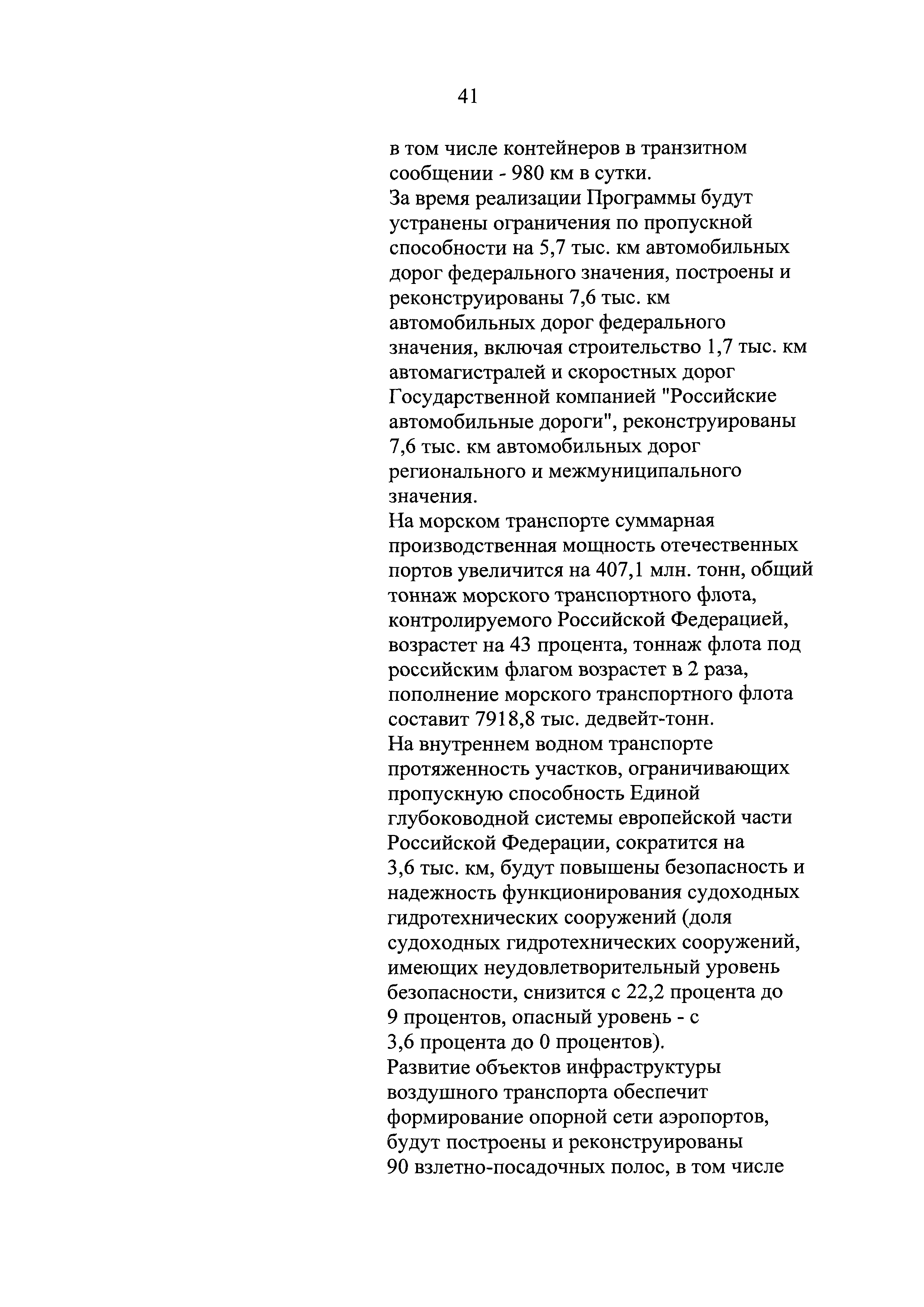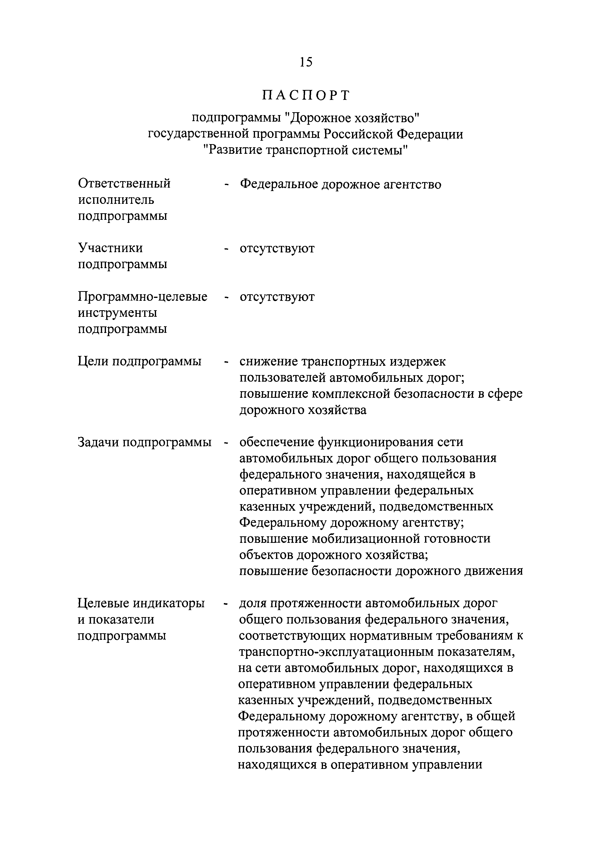 | Оглавление: | Паспорт государственной программы Российской Федерации "Развитие транспортной системы" Паспорт подпрограммы "Магистральный железнодорожный транспорт" государственной программы Российской Федерации "Развитие транспортной системы" Паспорт подпрограммы "Дорожное хозяйство" государственной программы Российской Федерации "Развитие транспортной системы" Паспорт подпрограммы "Гражданская авиация и аэронавигационное обслуживание" государственной программы Российской Федерации "Развитие транспортной системы" Паспорт подпрограммы "Морской и речной транспорт" государственной программы Российской Федерации "Развитие транспортной системы" Паспорт подпрограммы "Надзор в сфере транспорта" государственной программы Российской Федерации "Развитие транспортной системы" Паспорт подпрограммы "Развитие скоростных автомобильных дорог на условиях государственно-частного партнерства" государственной программы Российской Федерации "Развитие транспортной системы" Паспорт подпрограммы "Транспортное обеспечение XXII Олимпийских зимних игр 2014 года в г. Сочи и XXVII Всемирной летней универсиады 2013 года в г. Казани" государственной программы Российской Федерации "Развитие транспортной системы" Паспорт подпрограммы "Обеспечение реализации государственной программы Российской Федерации "Развитие транспортной системы" государственной программы Российской Федерации "Развитие транспортной системы" Паспорт подпрограммы "Развитие гражданского использования системы ГЛОНАСС на транспорте" государственной программы Российской Федерации "Развитие транспортной системы" Паспорт федеральной целевой программы "Развитие транспортной системы России (2010 - 2020 годы)" Паспорт федеральной целевой программы "Модернизация Единой системы организации воздушного движения Российской Федерации (2009 - 2020 годы)" Паспорт комплексной программы обеспечения безопасности населения на транспорте Приоритеты и цели государственной политики, а также общие требования к государственной политике субъектов Российской Федерации в сфере транспортного комплекса Приложение № 1. Сведения о целевых индикаторах и показателях государственной программы Российской Федерации "Развитие транспортной системы" Приложение № 2. Сведения о целевых индикаторах и показателях государственной программы Российской Федерации "Развитие транспортной системы" по субъектам Российской Федерации Приложение № 3. Перечень основных мероприятий государственной программы Российской Федерации "Развитие транспортной системы" Приложение № 4. Основные меры правового регулирования в сфере реализации государственной программы Российской Федерации "Развитие транспортной системы" Приложение № 5. Информация по финансовому обеспечению государственной программы Российской Федерации "Развитие транспортной системы" за счет средств федерального бюджета |
