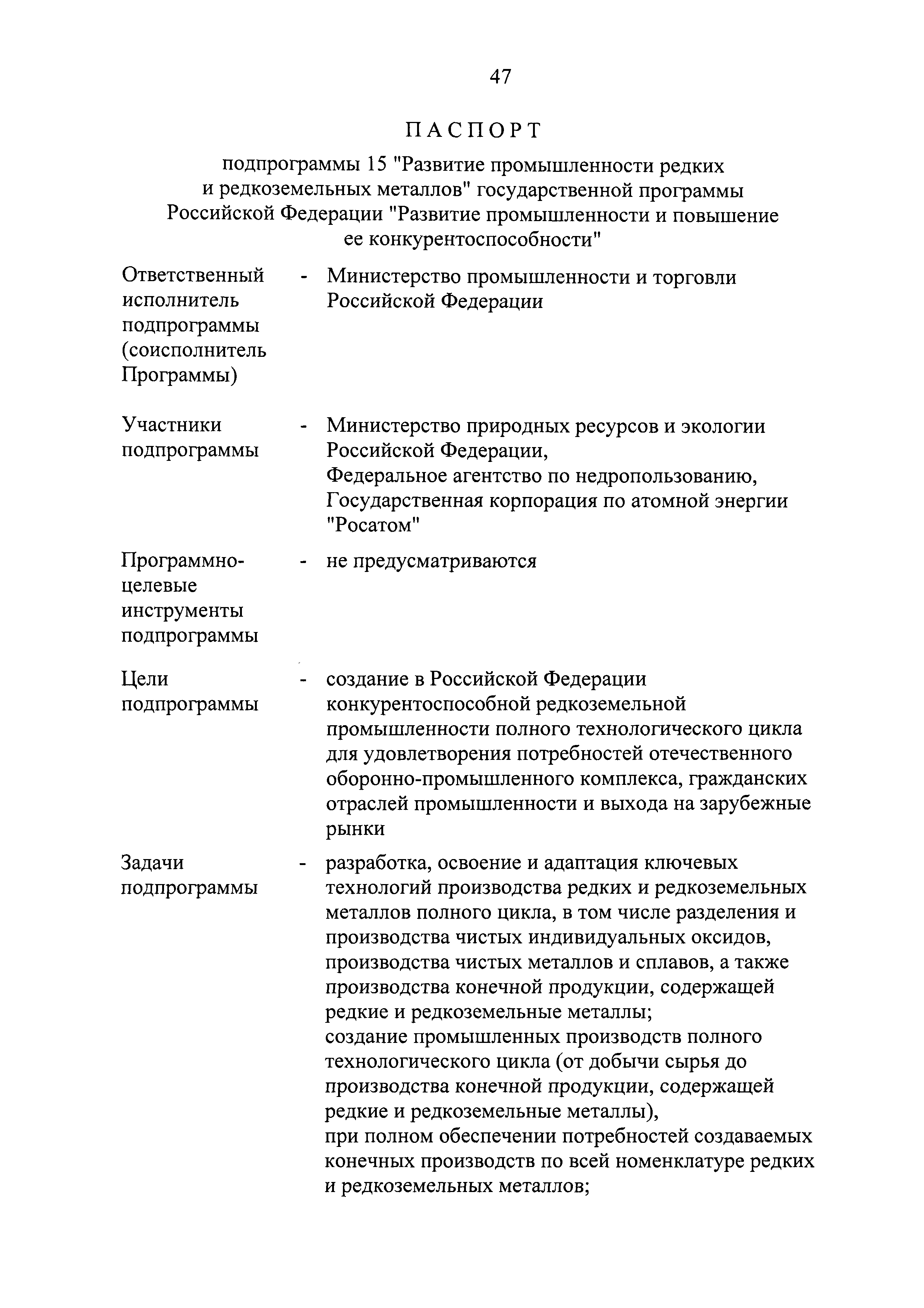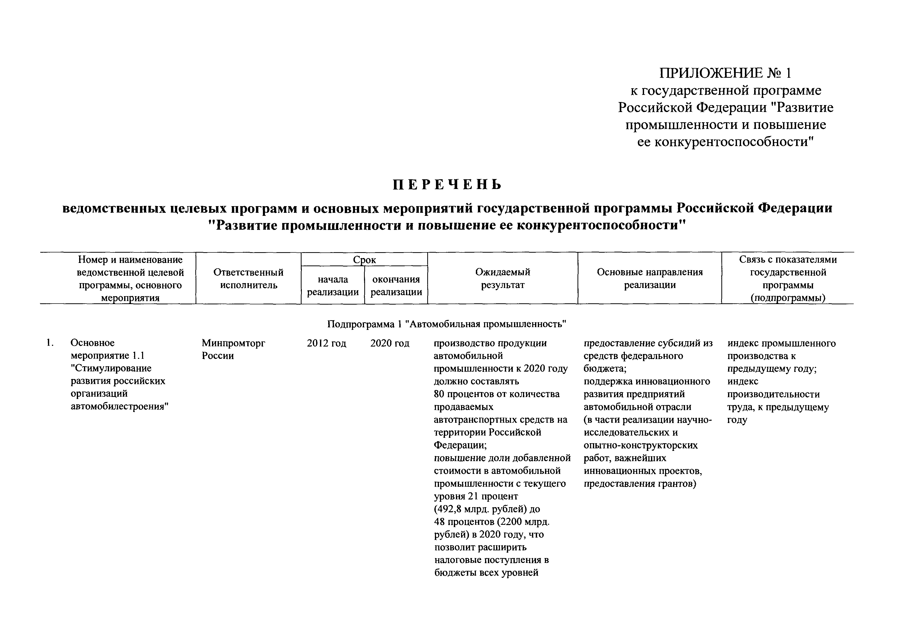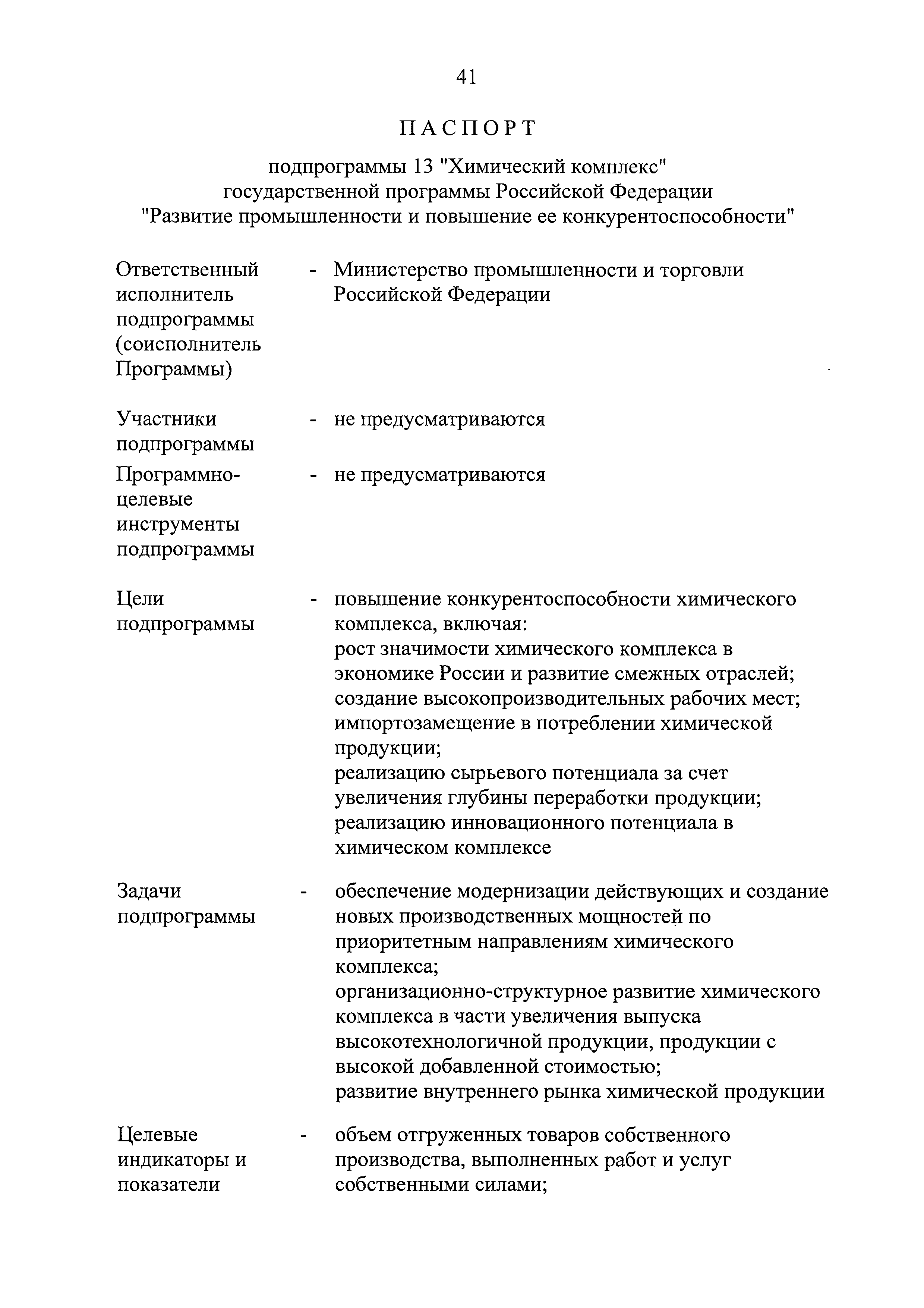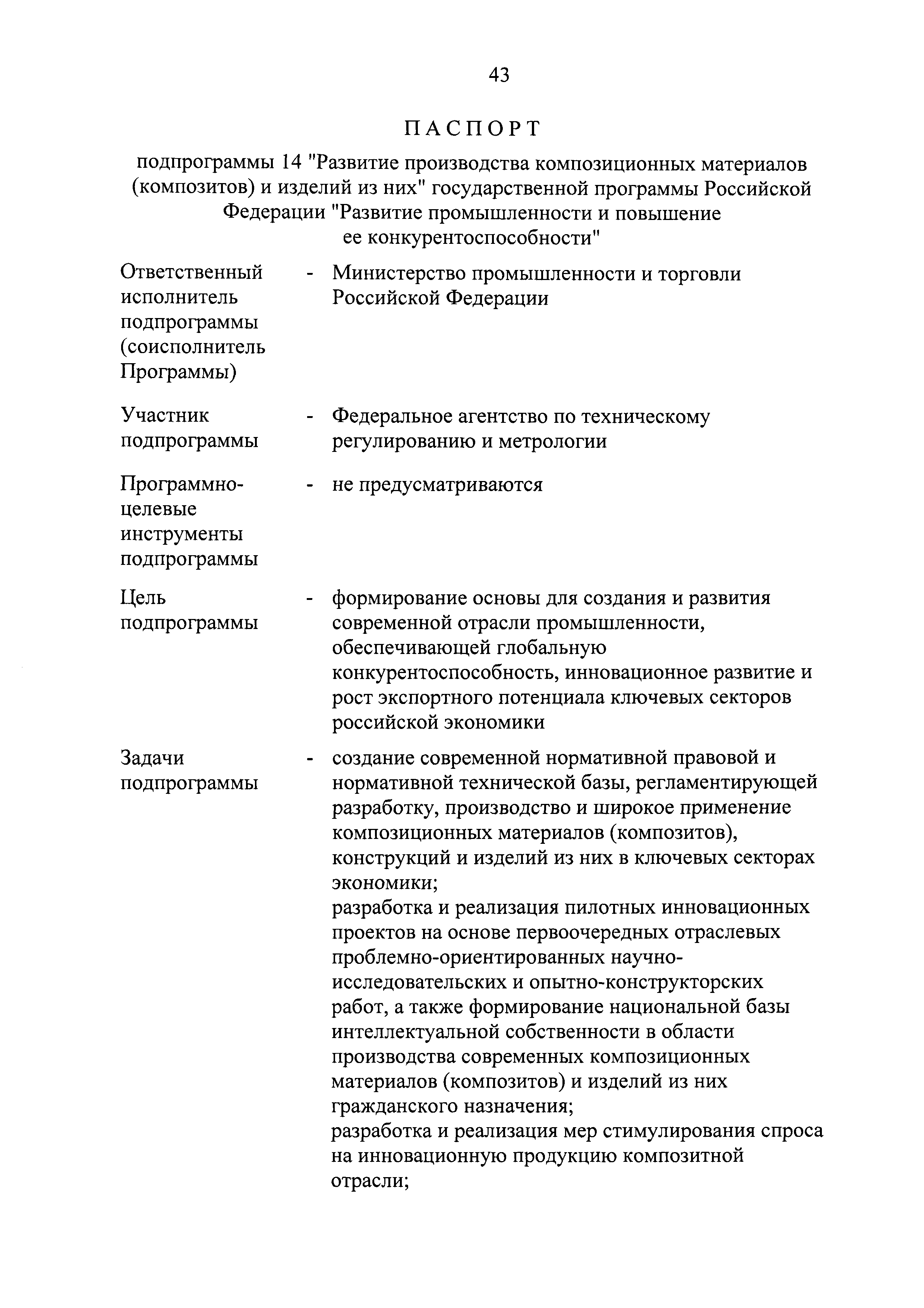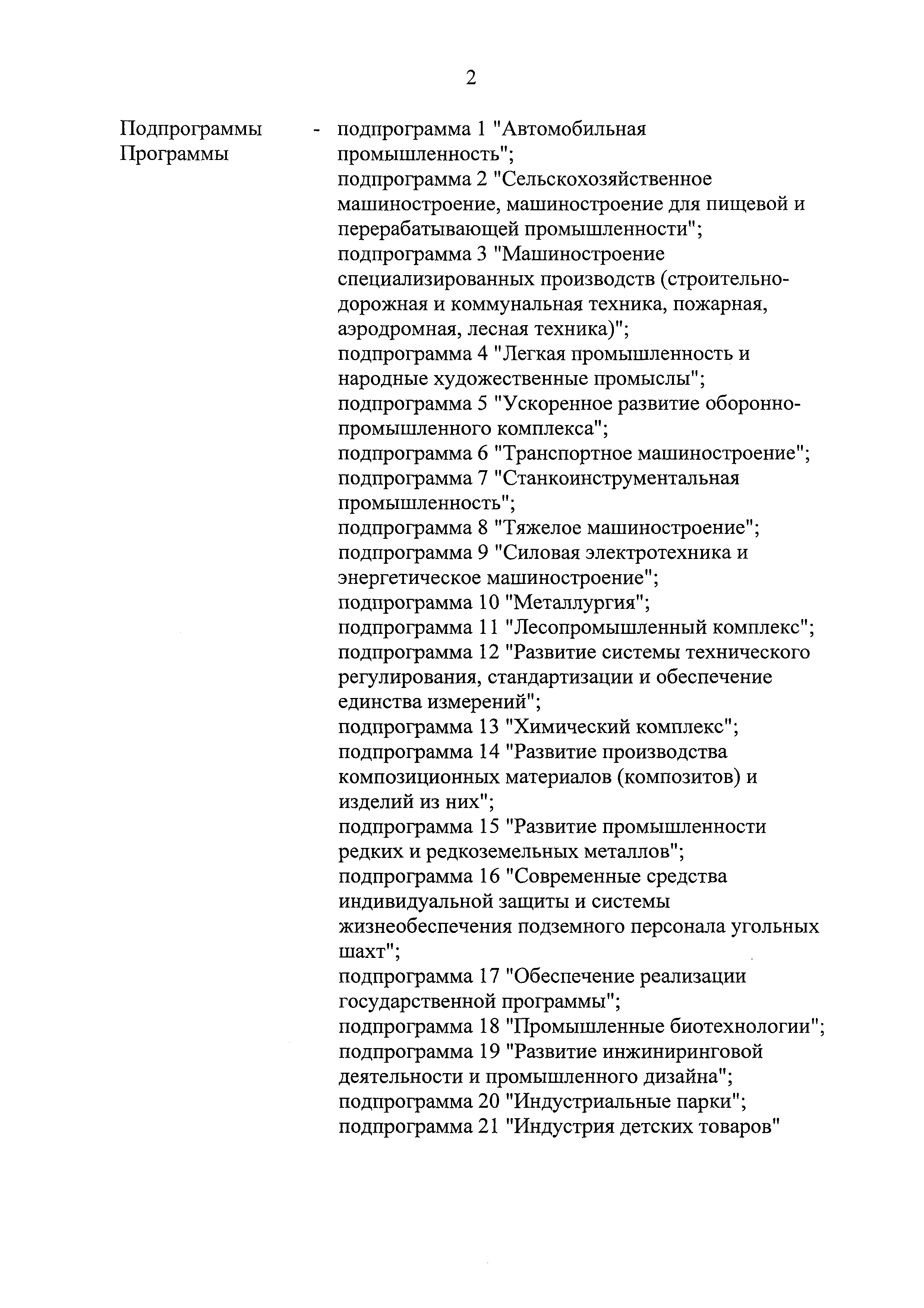 | Оглавление: | Паспорт государственной программы Российской Федерации "Развитие промышленности и повышение ее конкурентоспособности" Паспорт подпрограммы 1 "Автомобильная промышленность" государственной программы Российской Федерации "Развитие промышленности и повышение ее конкурентоспособности" Паспорт подпрограммы 2 "Сельскохозяйственное машиностроение" государственной программы Российской Федерации "Развитие промышленности и повышение ее конкурентоспособности" Паспорт подпрограммы 3 "Машиностроение специализированных производств (строительно-дорожная и коммунальная техника, пожарная, аэродромная, лесная техника)" государственной программы Российской Федерации "Развитие промышленности и повышение ее конкурентоспособности" Паспорт подпрограммы 4 "Легкая промышленность и народные художественные промыслы" государственной программы Российской Федерации "Развитие промышленности и повышение ее конкурентоспособности" Паспорт подпрограммы 5 "Ускоренное развитие оборонно-промышленного комплекса" государственной программы Российской Федерации "Развитие промышленности и повышение ее конкурентоспособности" Паспорт подпрограммы 6 "Транспортное машиностроение" государственной программы Российской Федерации "Развитие промышленности и повышение ее конкурентоспособности" Паспорт подпрограммы 7 "Станкоинструментальная промышленность" государственной программы Российской Федерации "Развитие промышленности и повышение ее конкурентоспособности" Паспорт подпрограммы 8 "Тяжелое машиностроение" государственной программы Российской Федерации "Развитие промышленности и повышение ее конкурентоспособности" Паспорт подпрограммы 9 "Силовая электротехника и энергетическое машиностроение" государственной программы Российской Федерации "Развитие промышленности и повышение ее конкурентоспособности" Паспорт подпрограммы 10 "Металлургия" государственной программы Российской Федерации "Развитие промышленности и повышение ее конкурентоспособности" Паспорт подпрограммы 11 "Лесопромышленный комплекс" государственной программы Российской Федерации "Развитие промышленности и повышение ее конкурентоспособности" Паспорт подпрограммы 12 "Развитие системы технического регулирования, стандартизации и обеспечение единства измерений" государственной программы Российской Федерации "Развитие промышленности и повышение ее конкурентоспособности" Паспорт подпрограммы 13 "Химический комплекс" государственной программы Российской Федерации "Развитие промышленности и повышение ее конкурентоспособности" Паспорт подпрограммы 14 "Развитие производства композиционных материалов (композитов) и изделий из них" государственной программы Российской Федерации "Развитие промышленности и повышение ее конкурентоспособности" Паспорт подпрограммы 15 "Развитие промышленности редких и редкоземельных металлов" государственной программы Российской Федерации "Развитие промышленности и повышение ее конкурентоспособности" Паспорт подпрограммы 16 "Современные средства индивидуальной защиты и системы жизнеобеспечения подземного персонала угольных шахт" государственной программы Российской Федерации "Развитие промышленности и повышение ее конкурентоспособности" Паспорт подпрограммы 17 "Обеспечение реализации государственно