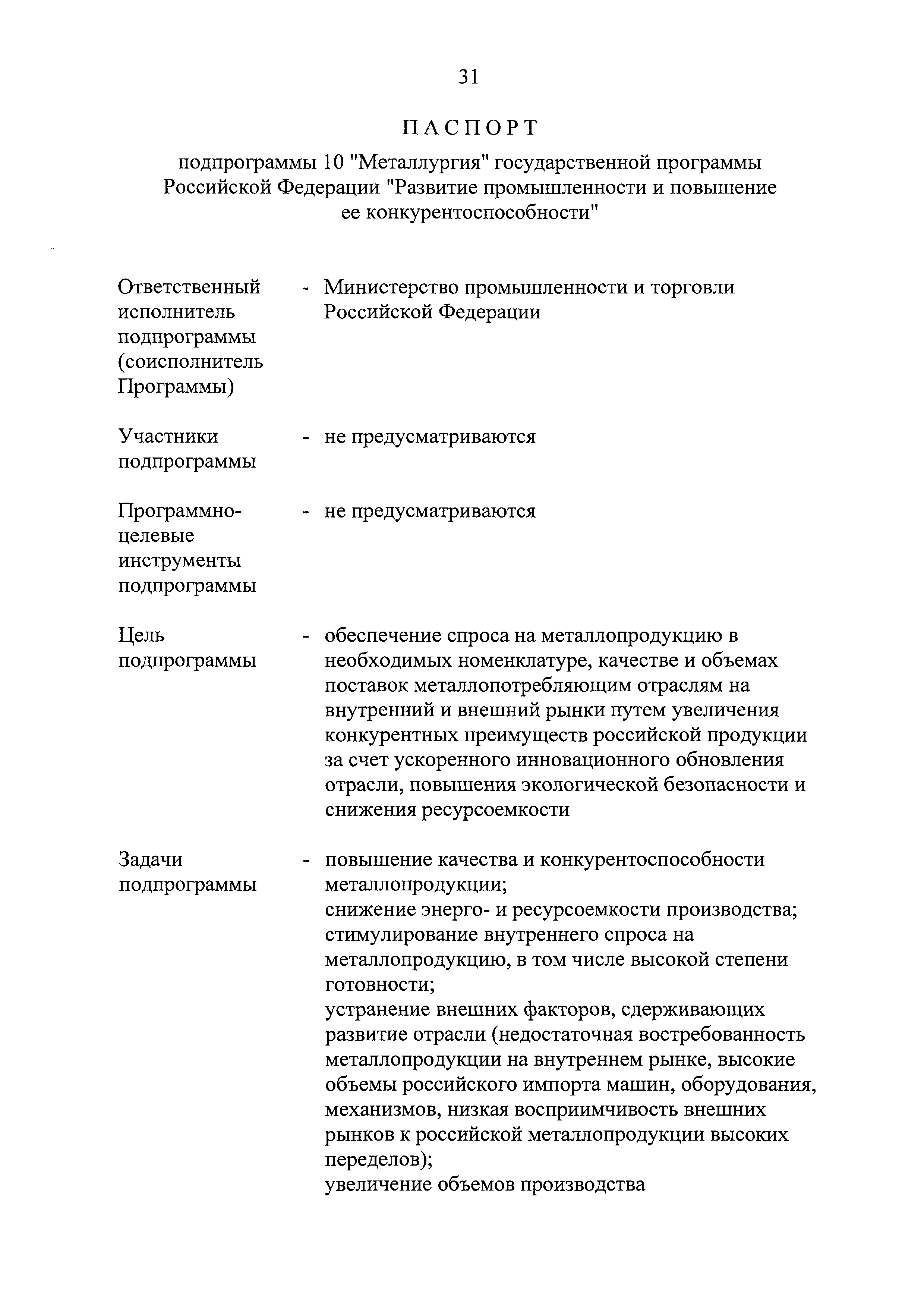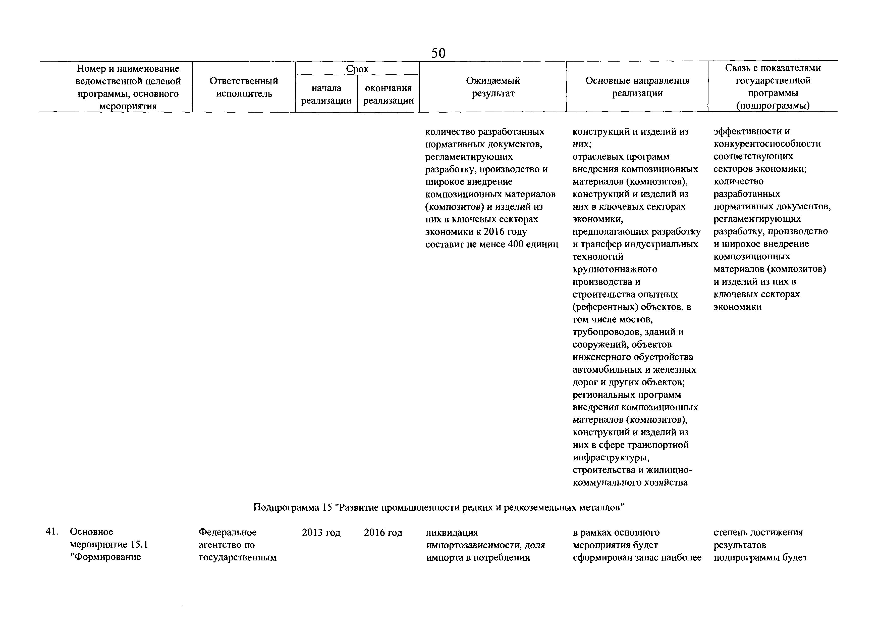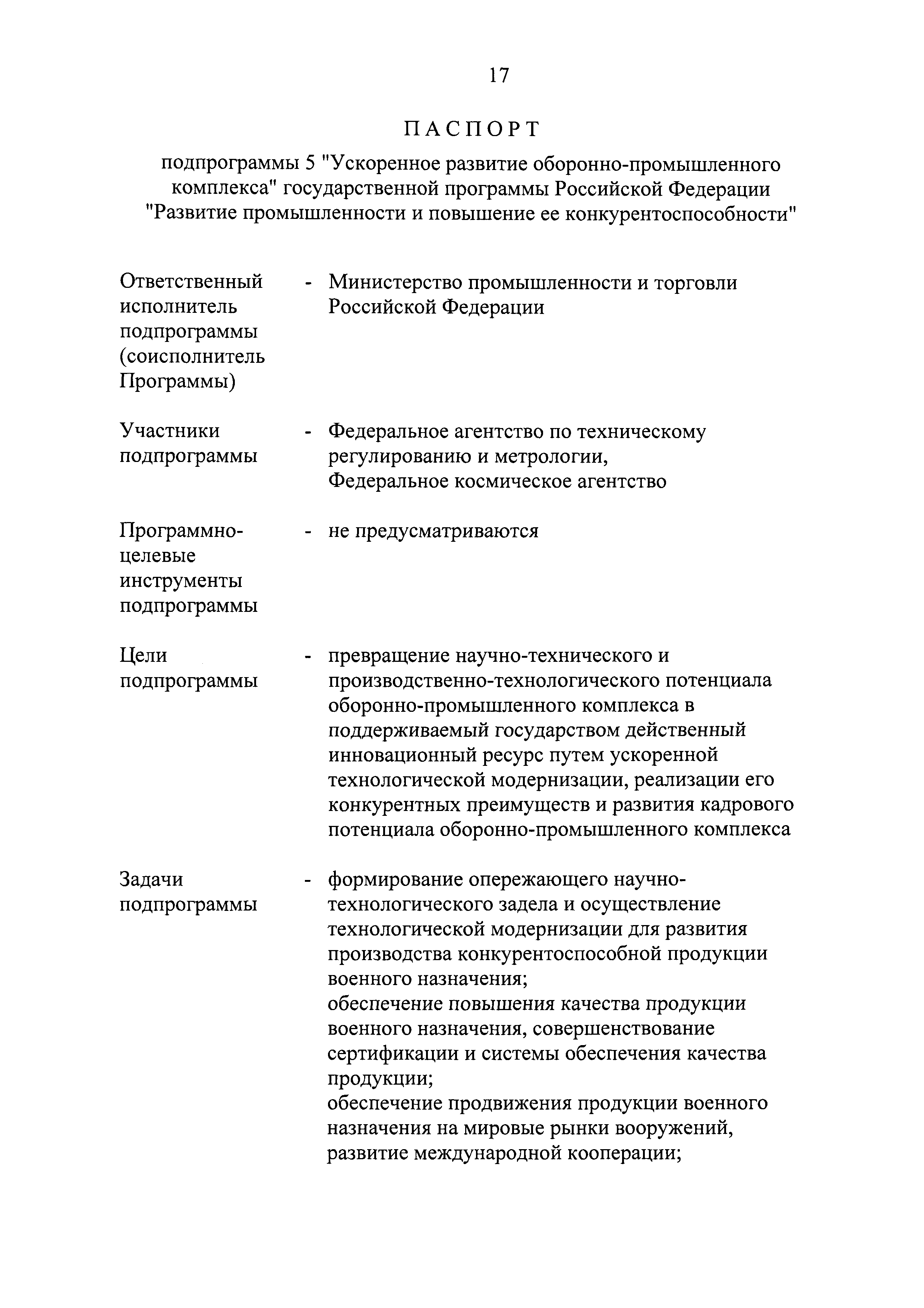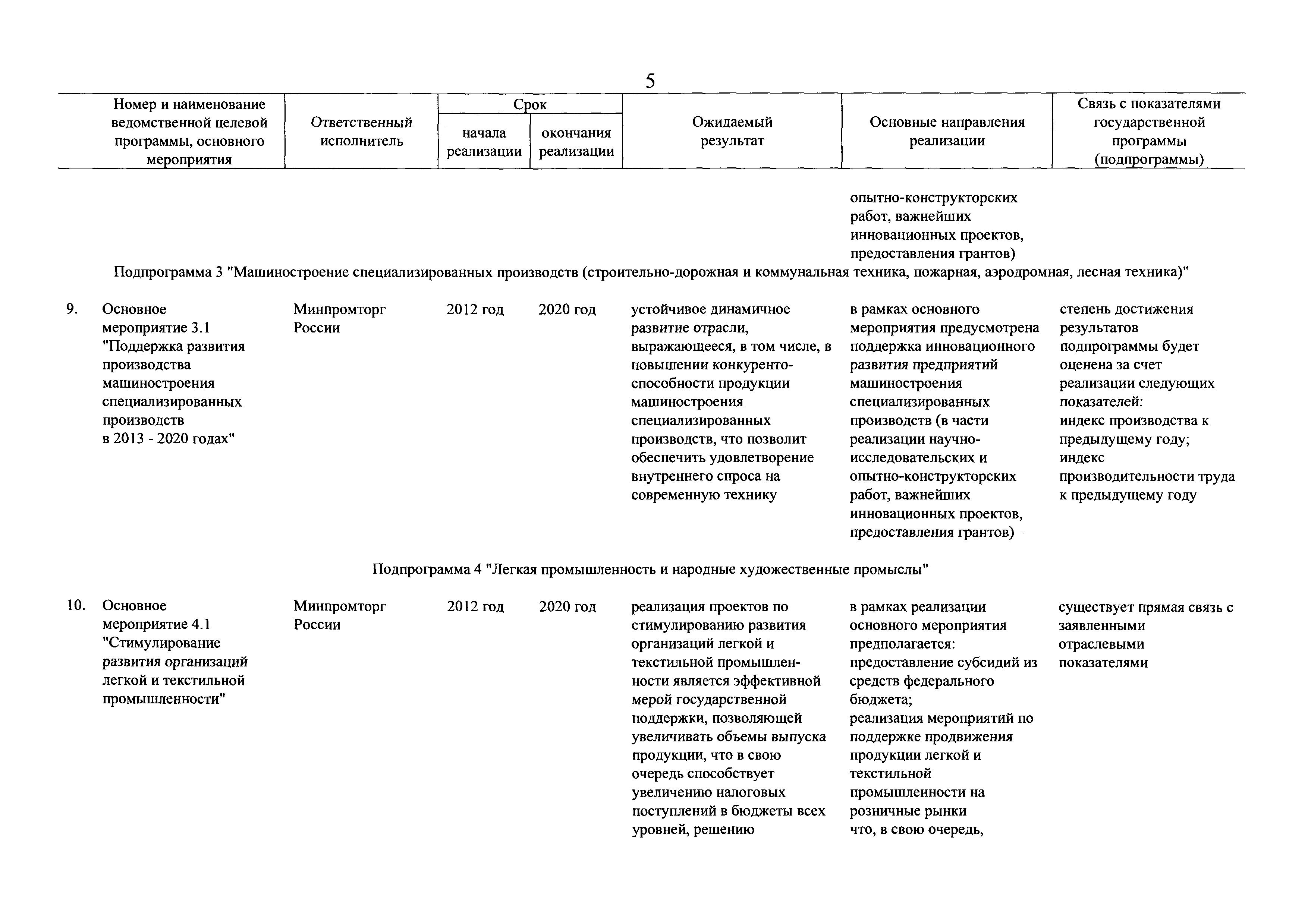 | Оглавление: | Паспорт государственной программы Российской Федерации "Развитие промышленности и повышение ее конкурентоспособности" Паспорт подпрограммы 1 "Автомобильная промышленность" государственной программы Российской Федерации "Развитие промышленности и повышение ее конкурентоспособности" Паспорт подпрограммы 2 "Сельскохозяйственное машиностроение" государственной программы Российской Федерации "Развитие промышленности и повышение ее конкурентоспособности" Паспорт подпрограммы 3 "Машиностроение специализированных производств (строительно-дорожная и коммунальная техника, пожарная, аэродромная, лесная техника)" государственной программы Российской Федерации "Развитие промышленности и повышение ее конкурентоспособности" Паспорт подпрограммы 4 "Легкая промышленность и народные художественные промыслы" государственной программы Российской Федерации "Развитие промышленности и повышение ее конкурентоспособности" Паспорт подпрограммы 5 "Ускоренное развитие оборонно-промышленного комплекса" государственной программы Российской Федерации "Развитие промышленности и повышение ее конкурентоспособности" Паспорт подпрограммы 6 "Транспортное машиностроение" государственной программы Российской Федерации "Развитие промышленности и повышение ее конкурентоспособности" Паспорт подпрограммы 7 "Станкоинструментальная промышленность" государственной программы Российской Федерации "Развитие промышленности и повышение ее конкурентоспособности" Паспорт подпрограммы 8 "Тяжелое машиностроение" государственной программы Российской Федерации "Развитие промышленности и повышение ее конкурентоспособности" Паспорт подпрограммы 9 "Силовая электротехника и энергетическое машиностроение" государственной программы Российской Федерации "Развитие промышленности и повышение ее конкурентоспособности" Паспорт подпрограммы 10 "Металлургия" государственной программы Российской Федерации "Развитие промышленности и повышение ее конкурентоспособности" Паспорт подпрограммы 11 "Лесопромышленный комплекс" государственной программы Российской Федерации "Развитие промышленности и повышение ее конкурентоспособности" Паспорт подпрограммы 12 "Развитие системы технического регулирования, стандартизации и обеспечение единства измерений" государственной программы Российской Федерации "Развитие промышленности и повышение ее конкурентоспособности" Паспорт подпрограммы 13 "Химический комплекс" государственной программы Российской Федерации "Развитие промышленности и повышение ее конкурентоспособности" Паспорт подпрограммы 14 "Развитие производства композиционных материалов (композитов) и изделий из них" государственной программы Российской Федерации "Развитие промышленности и повышение ее конкурентоспособности" Паспорт подпрограммы 15 "Развитие промышленности редких и редкоземельных металлов" государственной программы Российской Федерации "Развитие промышленности и повышение ее конкурентоспособности" Паспорт подпрограммы 16 "Современные средства индивидуальной защиты и системы жизнеобеспечения подземного персонала угольных шахт" государственной программы Российской Федерации "Развитие промышленности и повышение ее конкурентоспособности" Паспорт подпрограммы 17 "Обеспечение реализации государственно