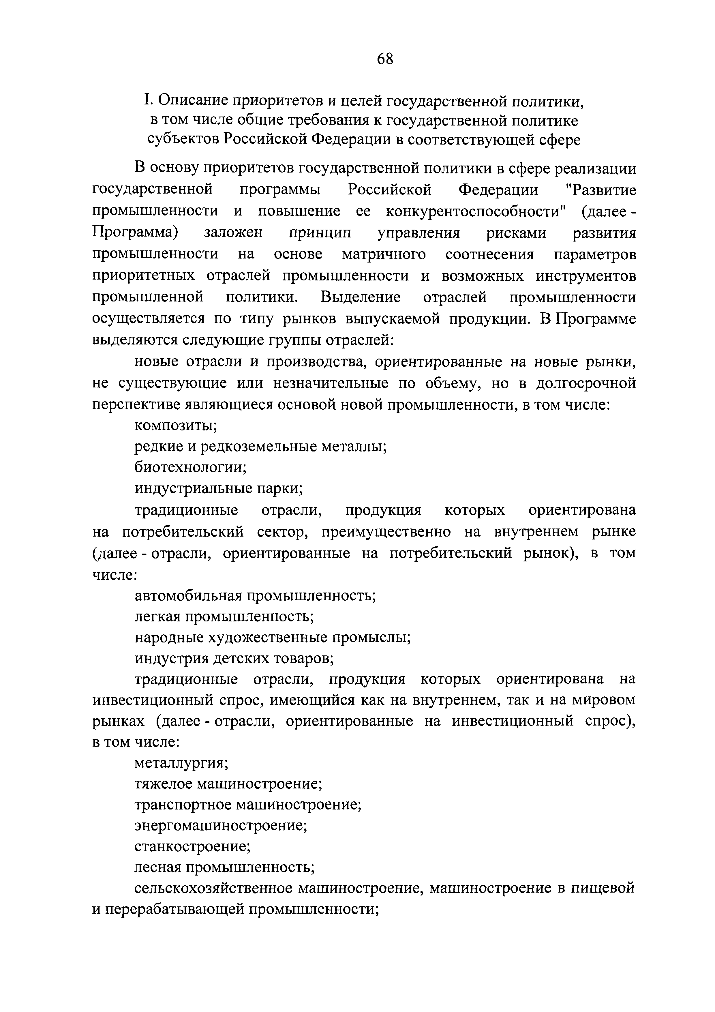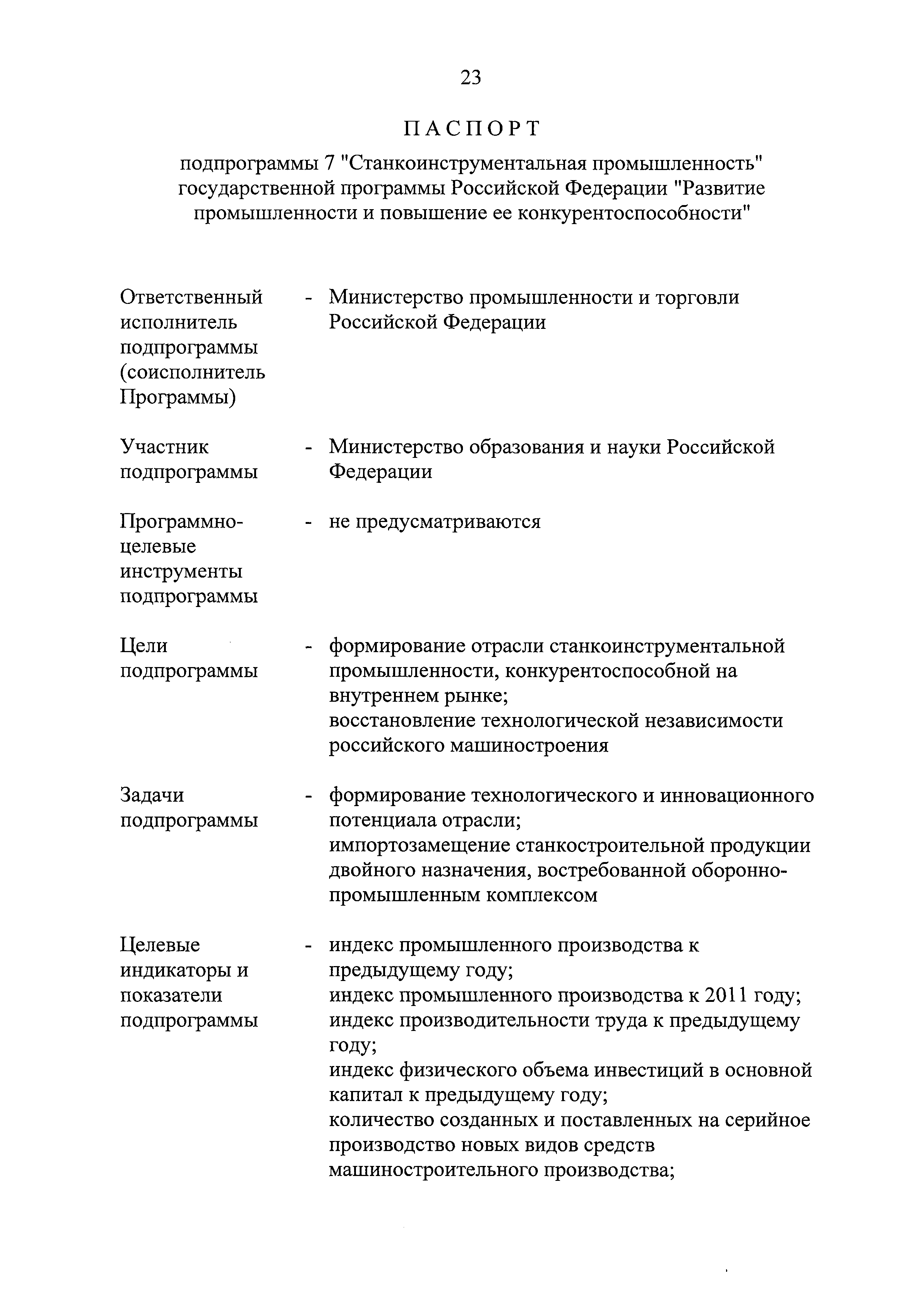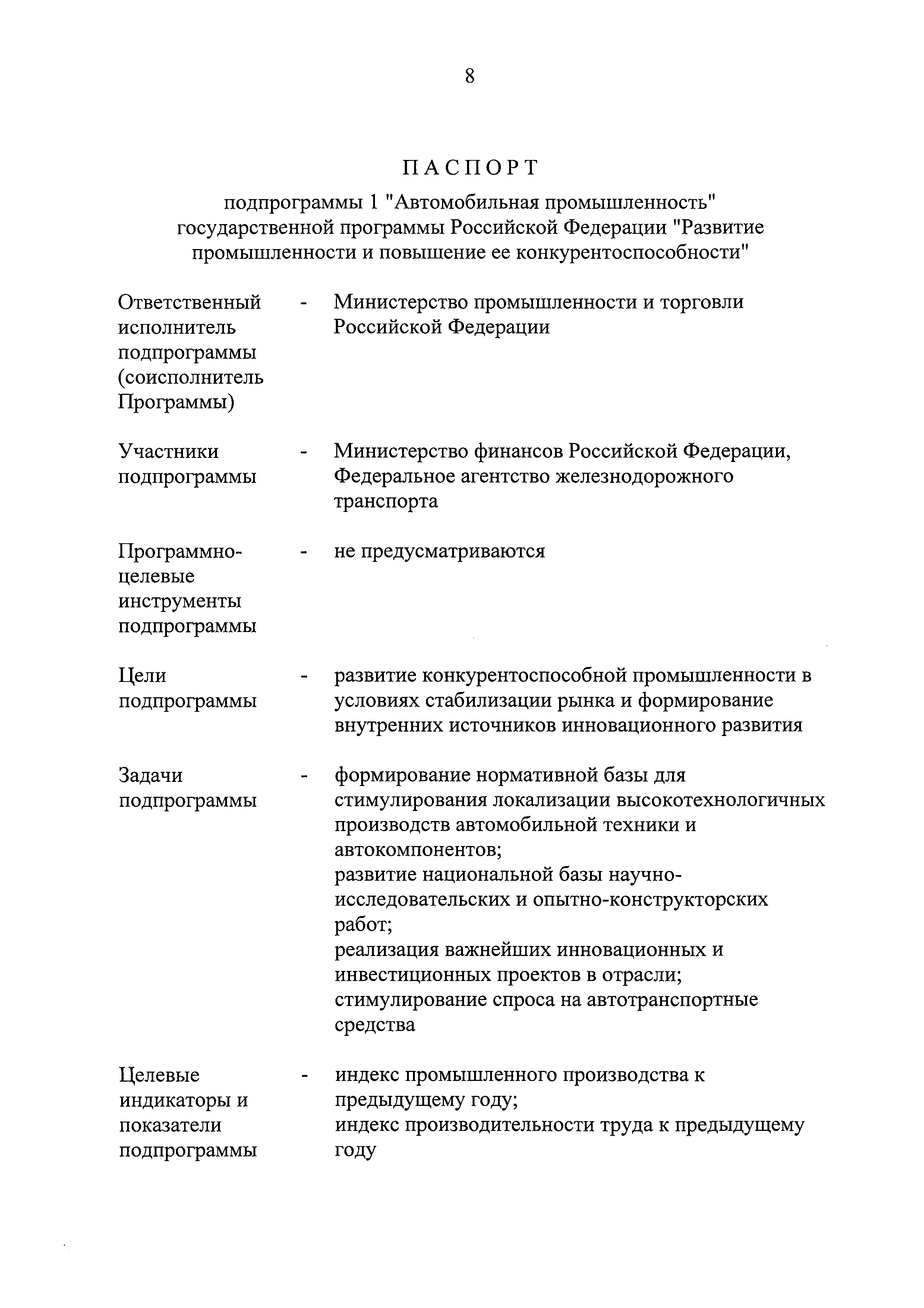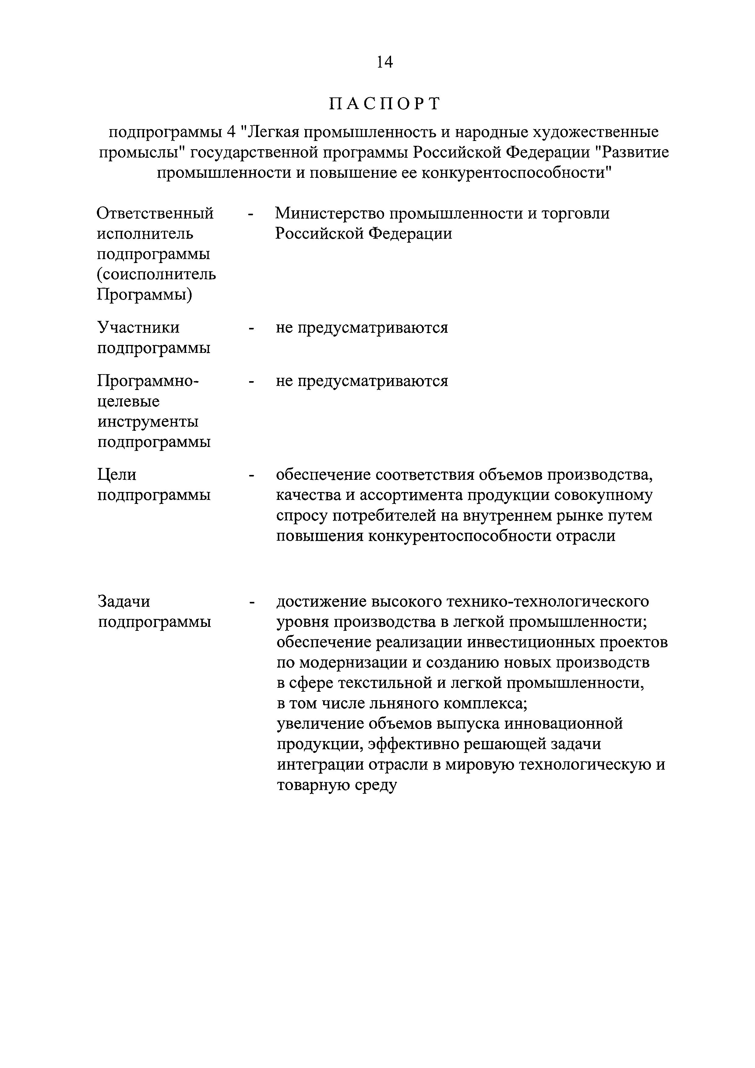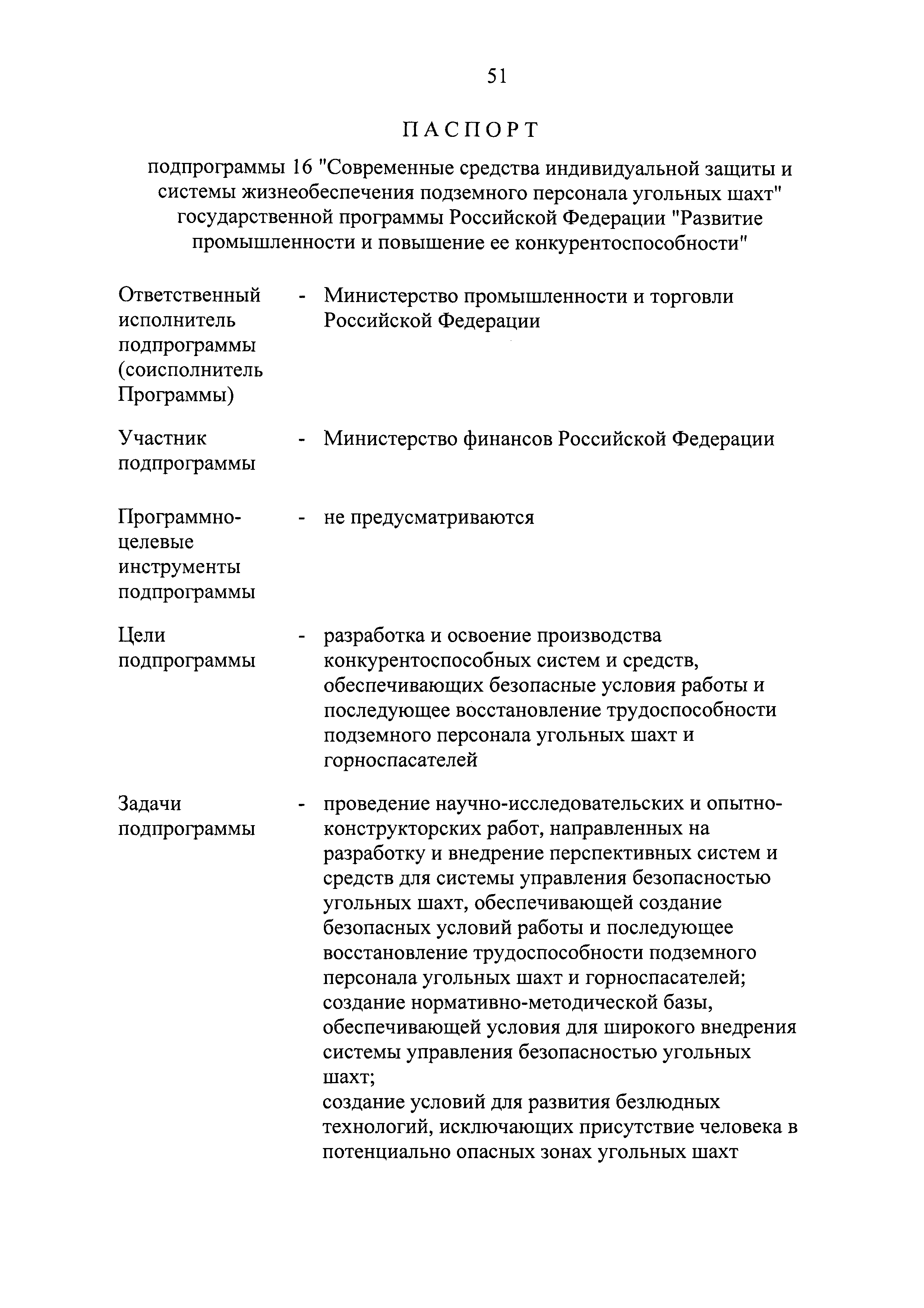 | Оглавление: | Паспорт государственной программы Российской Федерации "Развитие промышленности и повышение ее конкурентоспособности" Паспорт подпрограммы 1 "Автомобильная промышленность" государственной программы Российской Федерации "Развитие промышленности и повышение ее конкурентоспособности" Паспорт подпрограммы 2 "Сельскохозяйственное машиностроение" государственной программы Российской Федерации "Развитие промышленности и повышение ее конкурентоспособности" Паспорт подпрограммы 3 "Машиностроение специализированных производств (строительно-дорожная и коммунальная техника, пожарная, аэродромная, лесная техника)" государственной программы Российской Федерации "Развитие промышленности и повышение ее конкурентоспособности" Паспорт подпрограммы 4 "Легкая промышленность и народные художественные промыслы" государственной программы Российской Федерации "Развитие промышленности и повышение ее конкурентоспособности" Паспорт подпрограммы 5 "Ускоренное развитие оборонно-промышленного комплекса" государственной программы Российской Федерации "Развитие промышленности и повышение ее конкурентоспособности" Паспорт подпрограммы 6 "Транспортное машиностроение" государственной программы Российской Федерации "Развитие промышленности и повышение ее конкурентоспособности" Паспорт подпрограммы 7 "Станкоинструментальная промышленность" государственной программы Российской Федерации "Развитие промышленности и повышение ее конкурентоспособности" Паспорт подпрограммы 8 "Тяжелое машиностроение" государственной программы Российской Федерации "Развитие промышленности и повышение ее конкурентоспособности" Паспорт подпрограммы 9 "Силовая электротехника и энергетическое машиностроение" государственной программы Российской Федерации "Развитие промышленности и повышение ее конкурентоспособности" Паспорт подпрограммы 10 "Металлургия" государственной программы Российской Федерации "Развитие промышленности и повышение ее конкурентоспособности" Паспорт подпрограммы 11 "Лесопромышленный комплекс" государственной программы Российской Федерации "Развитие промышленности и повышение ее конкурентоспособности" Паспорт подпрограммы 12 "Развитие системы технического регулирования, стандартизации и обеспечение единства измерений" государственной программы Российской Федерации "Развитие промышленности и повышение ее конкурентоспособности" Паспорт подпрограммы 13 "Химический комплекс" государственной программы Российской Федерации "Развитие промышленности и повышение ее конкурентоспособности" Паспорт подпрограммы 14 "Развитие производства композиционных материалов (композитов) и изделий из них" государственной программы Российской Федерации "Развитие промышленности и повышение ее конкурентоспособности" Паспорт подпрограммы 15 "Развитие промышленности редких и редкоземельных металлов" государственной программы Российской Федерации "Развитие промышленности и повышение ее конкурентоспособности" Паспорт подпрограммы 16 "Современные средства индивидуальной защиты и системы жизнеобеспечения подземного персонала угольных шахт" государственной программы Российской Федерации "Развитие промышленности и повышение ее конкурентоспособности" Паспорт подпрограммы 17 "Обеспечение реализации государственно