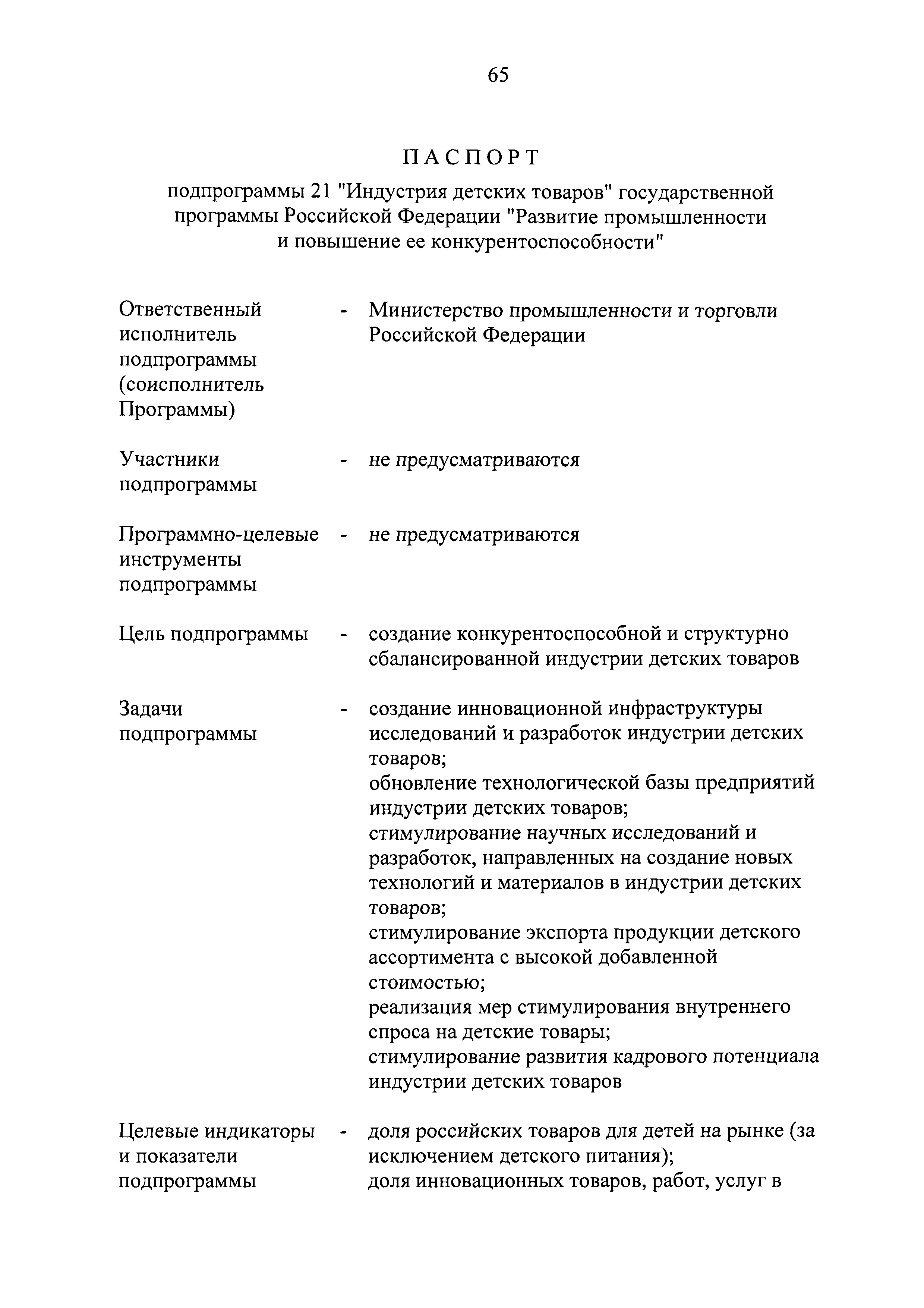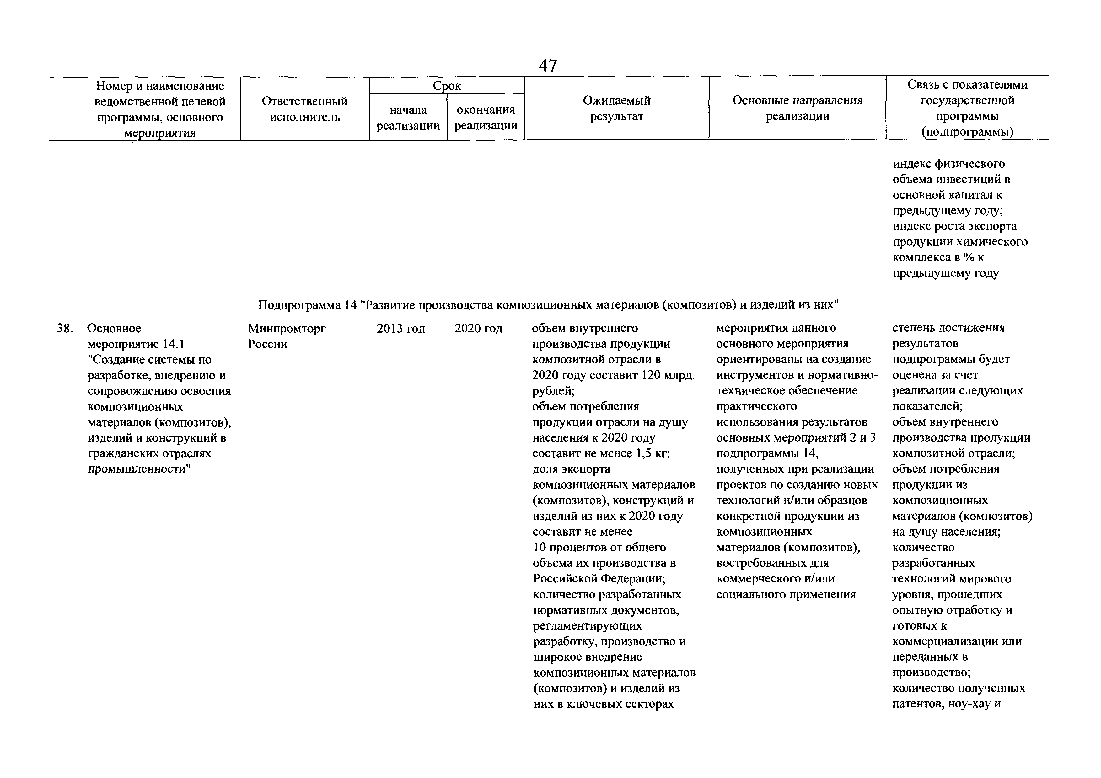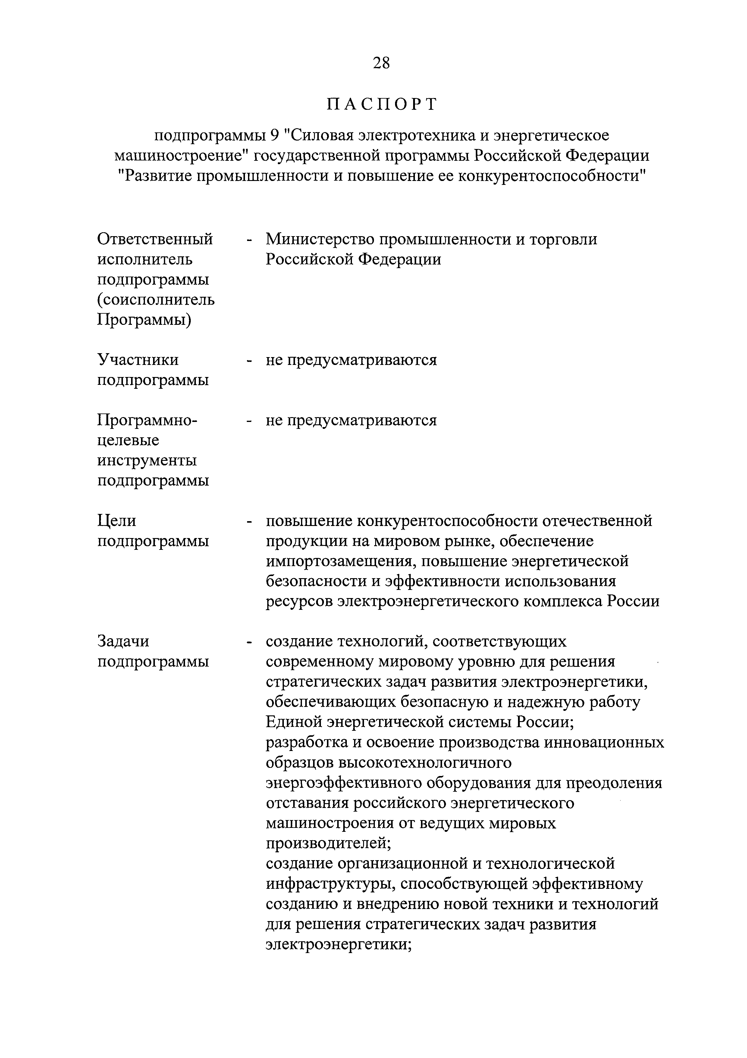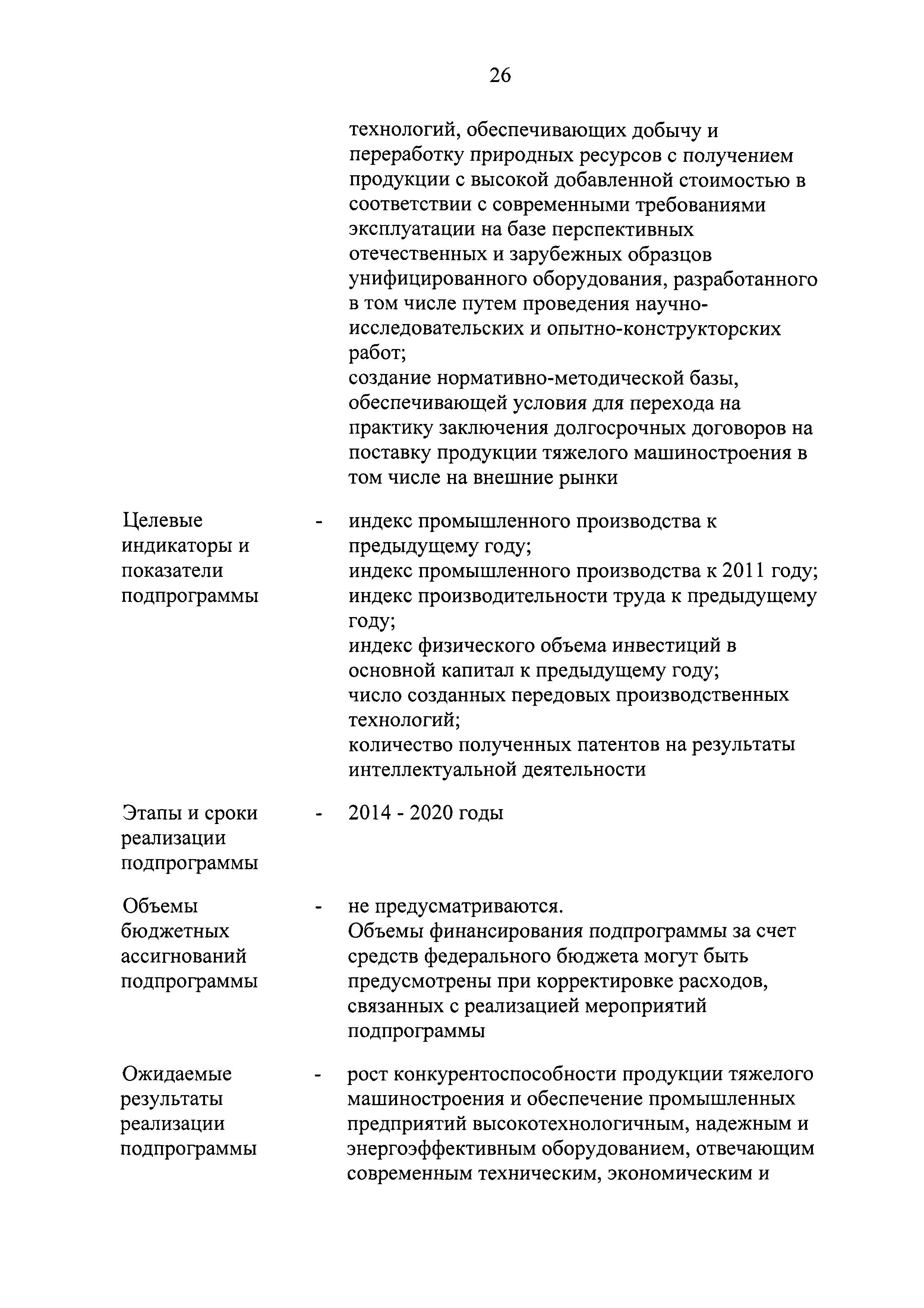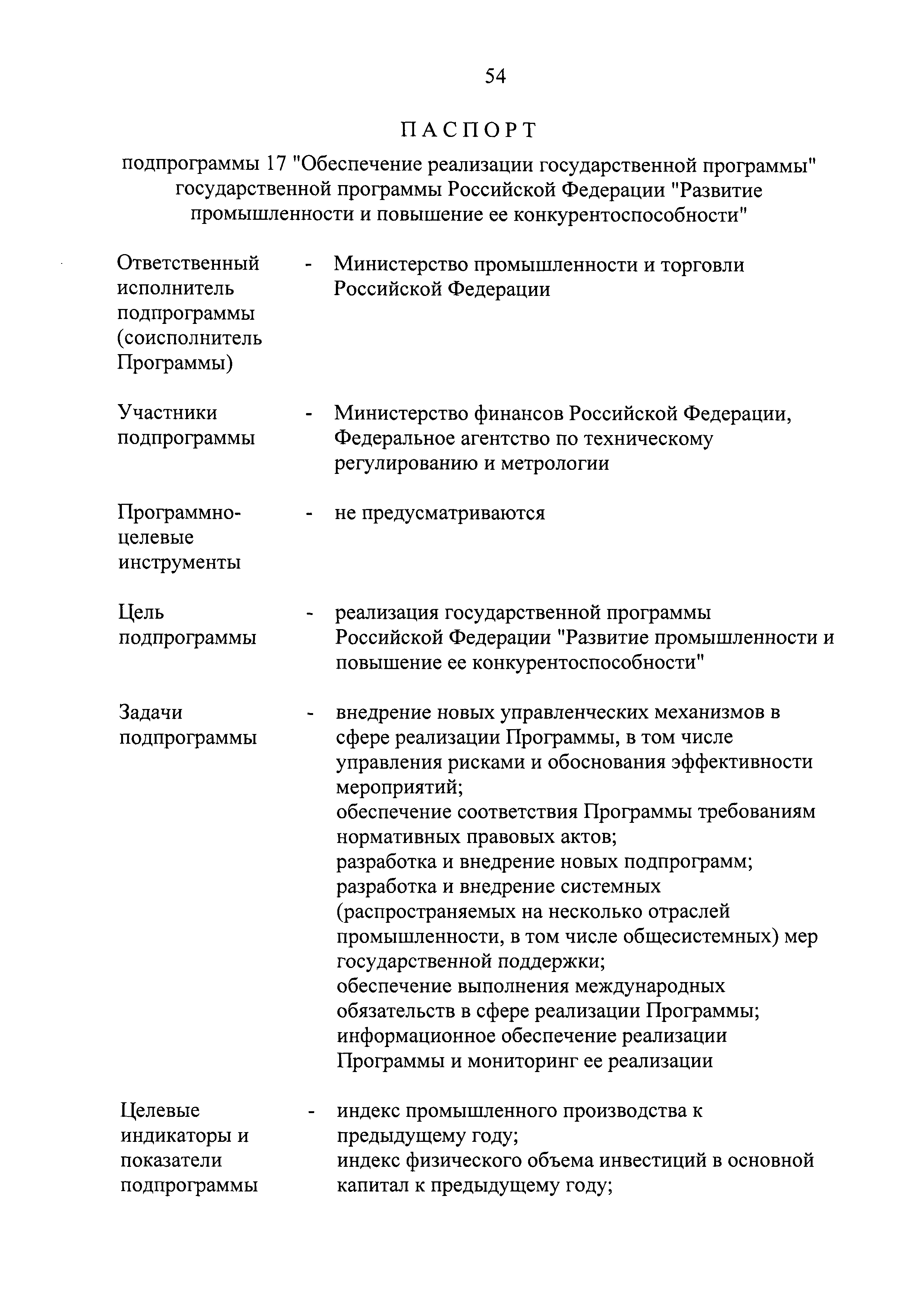 | Оглавление: | Паспорт государственной программы Российской Федерации "Развитие промышленности и повышение ее конкурентоспособности" Паспорт подпрограммы 1 "Автомобильная промышленность" государственной программы Российской Федерации "Развитие промышленности и повышение ее конкурентоспособности" Паспорт подпрограммы 2 "Сельскохозяйственное машиностроение" государственной программы Российской Федерации "Развитие промышленности и повышение ее конкурентоспособности" Паспорт подпрограммы 3 "Машиностроение специализированных производств (строительно-дорожная и коммунальная техника, пожарная, аэродромная, лесная техника)" государственной программы Российской Федерации "Развитие промышленности и повышение ее конкурентоспособности" Паспорт подпрограммы 4 "Легкая промышленность и народные художественные промыслы" государственной программы Российской Федерации "Развитие промышленности и повышение ее конкурентоспособности" Паспорт подпрограммы 5 "Ускоренное развитие оборонно-промышленного комплекса" государственной программы Российской Федерации "Развитие промышленности и повышение ее конкурентоспособности" Паспорт подпрограммы 6 "Транспортное машиностроение" государственной программы Российской Федерации "Развитие промышленности и повышение ее конкурентоспособности" Паспорт подпрограммы 7 "Станкоинструментальная промышленность" государственной программы Российской Федерации "Развитие промышленности и повышение ее конкурентоспособности" Паспорт подпрограммы 8 "Тяжелое машиностроение" государственной программы Российской Федерации "Развитие промышленности и повышение ее конкурентоспособности" Паспорт подпрограммы 9 "Силовая электротехника и энергетическое машиностроение" государственной программы Российской Федерации "Развитие промышленности и повышение ее конкурентоспособности" Паспорт подпрограммы 10 "Металлургия" государственной программы Российской Федерации "Развитие промышленности и повышение ее конкурентоспособности" Паспорт подпрограммы 11 "Лесопромышленный комплекс" государственной программы Российской Федерации "Развитие промышленности и повышение ее конкурентоспособности" Паспорт подпрограммы 12 "Развитие системы технического регулирования, стандартизации и обеспечение единства измерений" государственной программы Российской Федерации "Развитие промышленности и повышение ее конкурентоспособности" Паспорт подпрограммы 13 "Химический комплекс" государственной программы Российской Федерации "Развитие промышленности и повышение ее конкурентоспособности" Паспорт подпрограммы 14 "Развитие производства композиционных материалов (композитов) и изделий из них" государственной программы Российской Федерации "Развитие промышленности и повышение ее конкурентоспособности" Паспорт подпрограммы 15 "Развитие промышленности редких и редкоземельных металлов" государственной программы Российской Федерации "Развитие промышленности и повышение ее конкурентоспособности" Паспорт подпрограммы 16 "Современные средства индивидуальной защиты и системы жизнеобеспечения подземного персонала угольных шахт" государственной программы Российской Федерации "Развитие промышленности и повышение ее конкурентоспособности" Паспорт подпрограммы 17 "Обеспечение реализации государственно