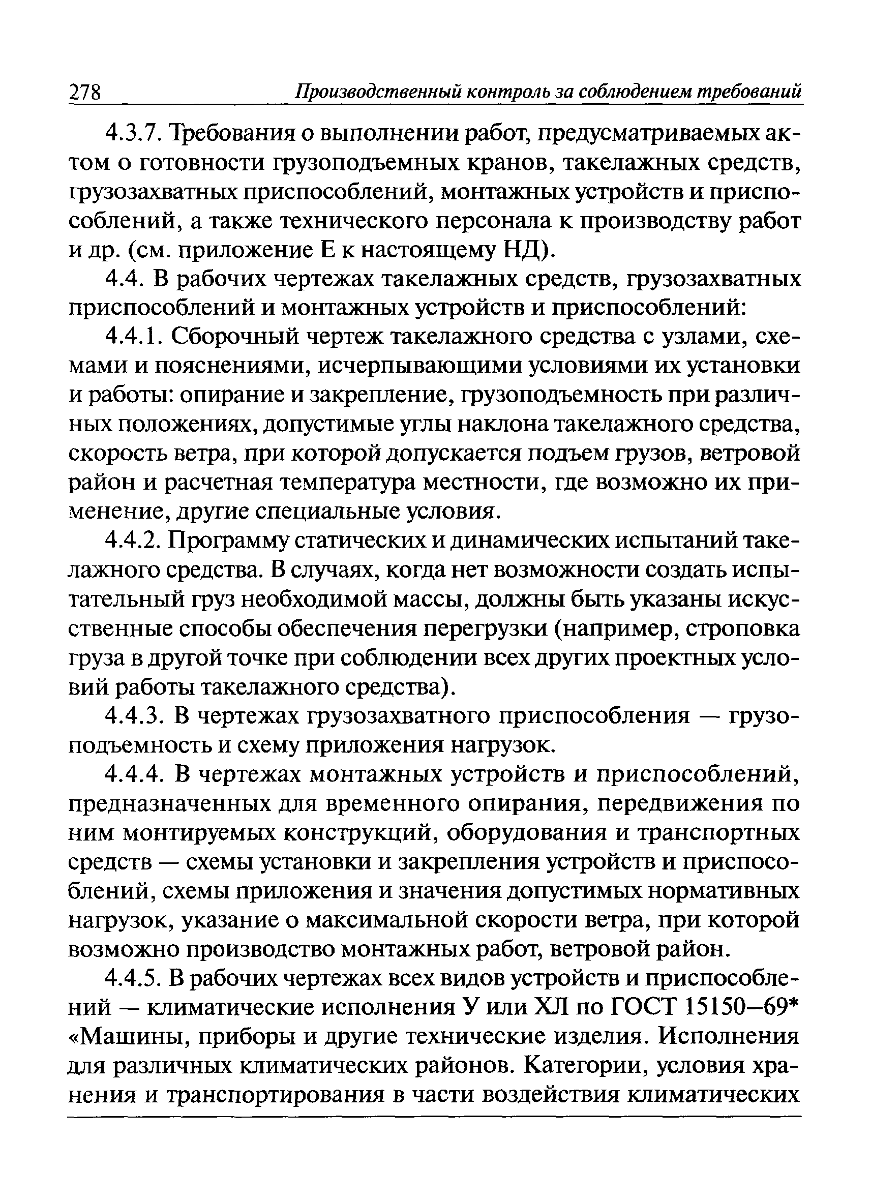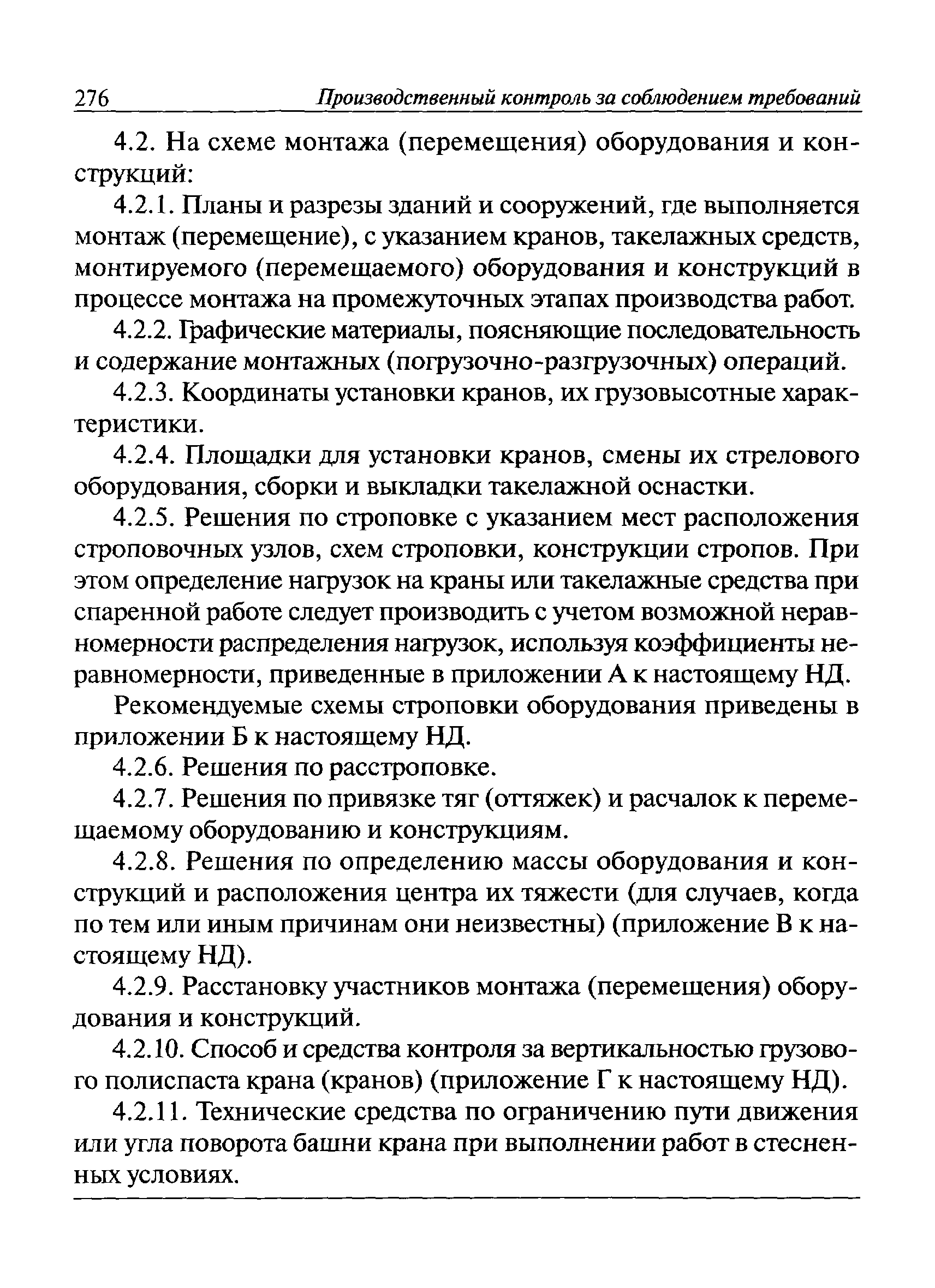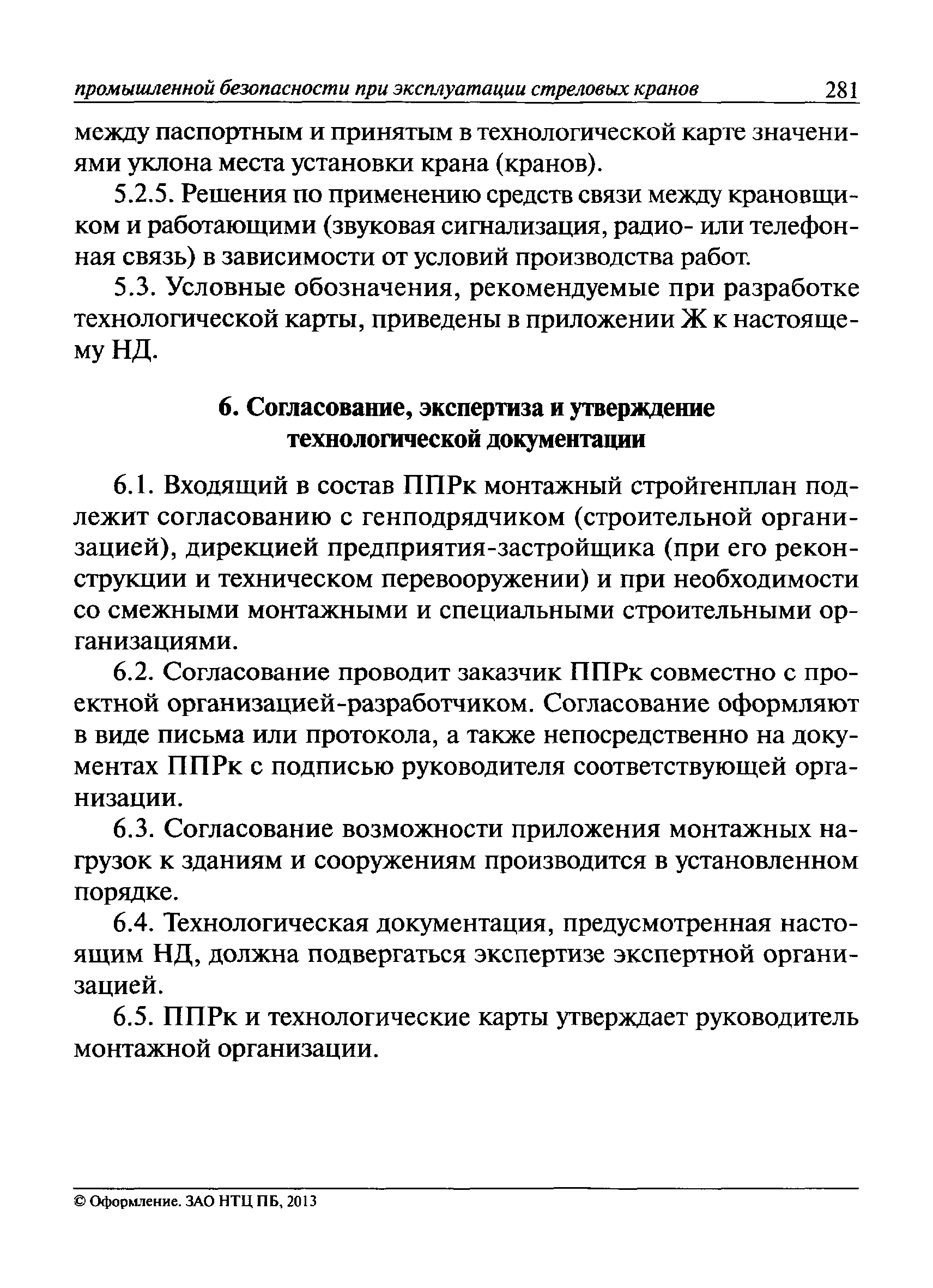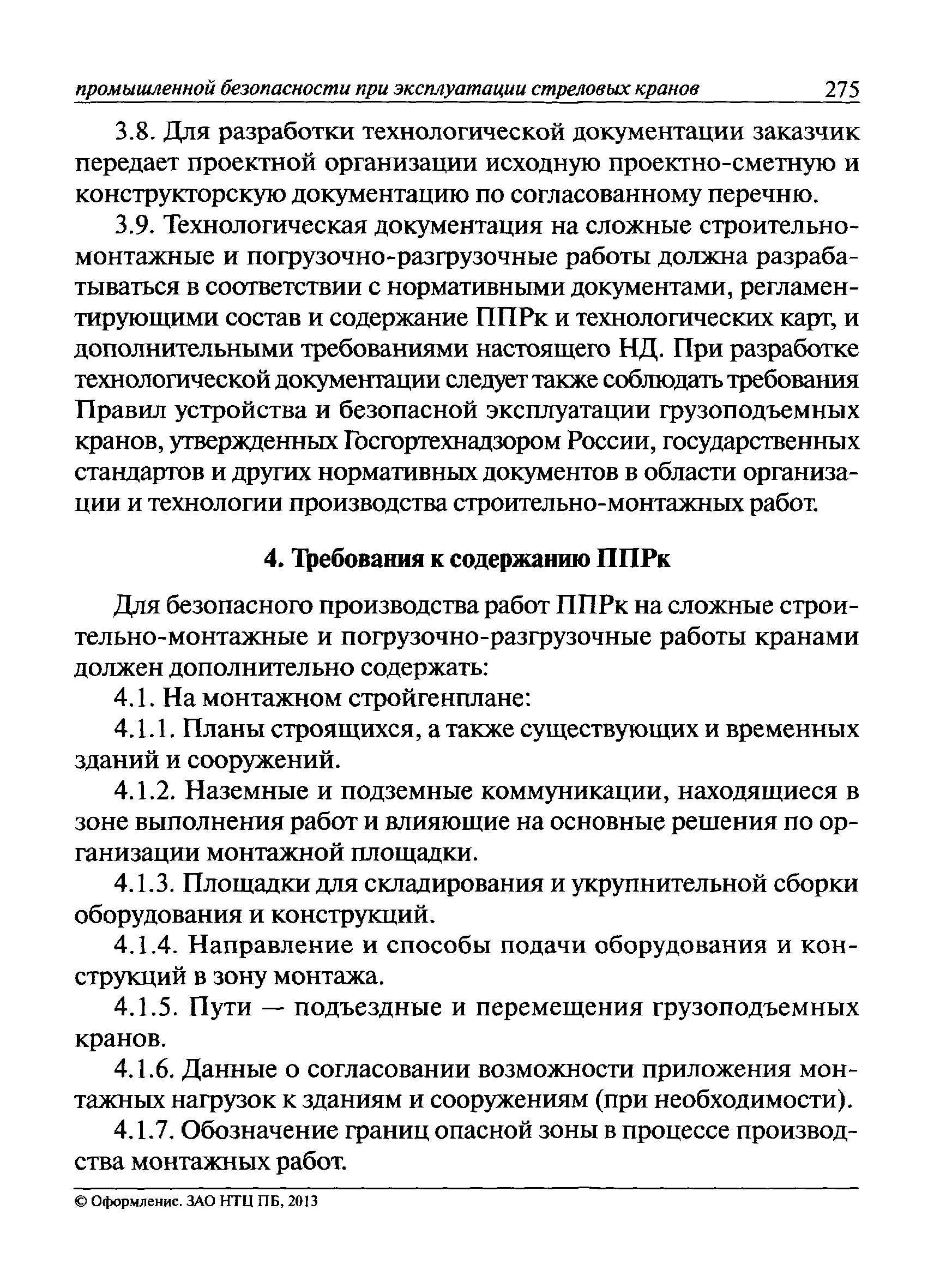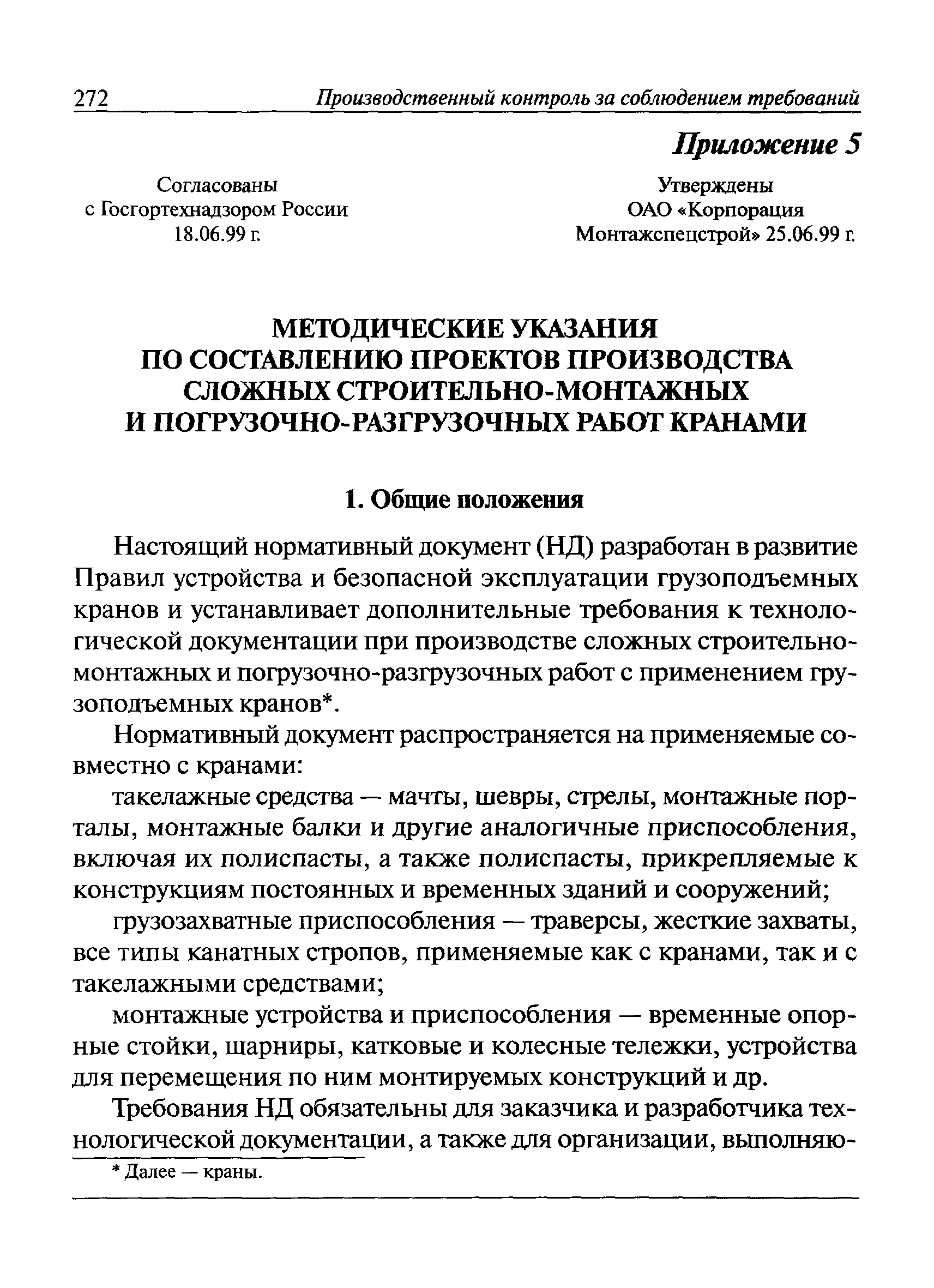 | Оглавление: | 1 Общие положения 2 Категории сложности работ по подъему и перемещению грузов кранами при производстве строительно-монтажных и погрузочно-разгрузочных работ 3 Виды технологической документации и порядок ее разработки 4 Требования к содержанию ППРк 5 Требования к содержанию технологической карты 6 Согласование, экспертиза и утверждение технологической документации Приложение А. Неравномерность распределения нагрузок на краны или такелажные средства при спаренной работе Приложение Б. Рекомендуемые схемы строповки Приложение В. Пример определения массы и расположения центра тяжести оборудования или конструкции Приложение Г. Способ контроля отклонения грузового полиспаста кранов при монтаже вертикально устанавливаемых конструкций Приложение Д. Схема статистического испытания (непосредственно перед подъемом, в рабочем положении) применяемых такелажных средств, грузозахватных приспособлений (включая узлы строповки) и монтажных устройств и приспособлений Приложение Е. Формы акта о готовности грузоподъемных кранов, такелажных средств, грузозахватных приспособлений, а также технического персонала к производству сложных монтажных (погрузочно-разгрузочных) работ кранами Приложение Ж. Условные обозначения, используемые при разработке технологической документации |