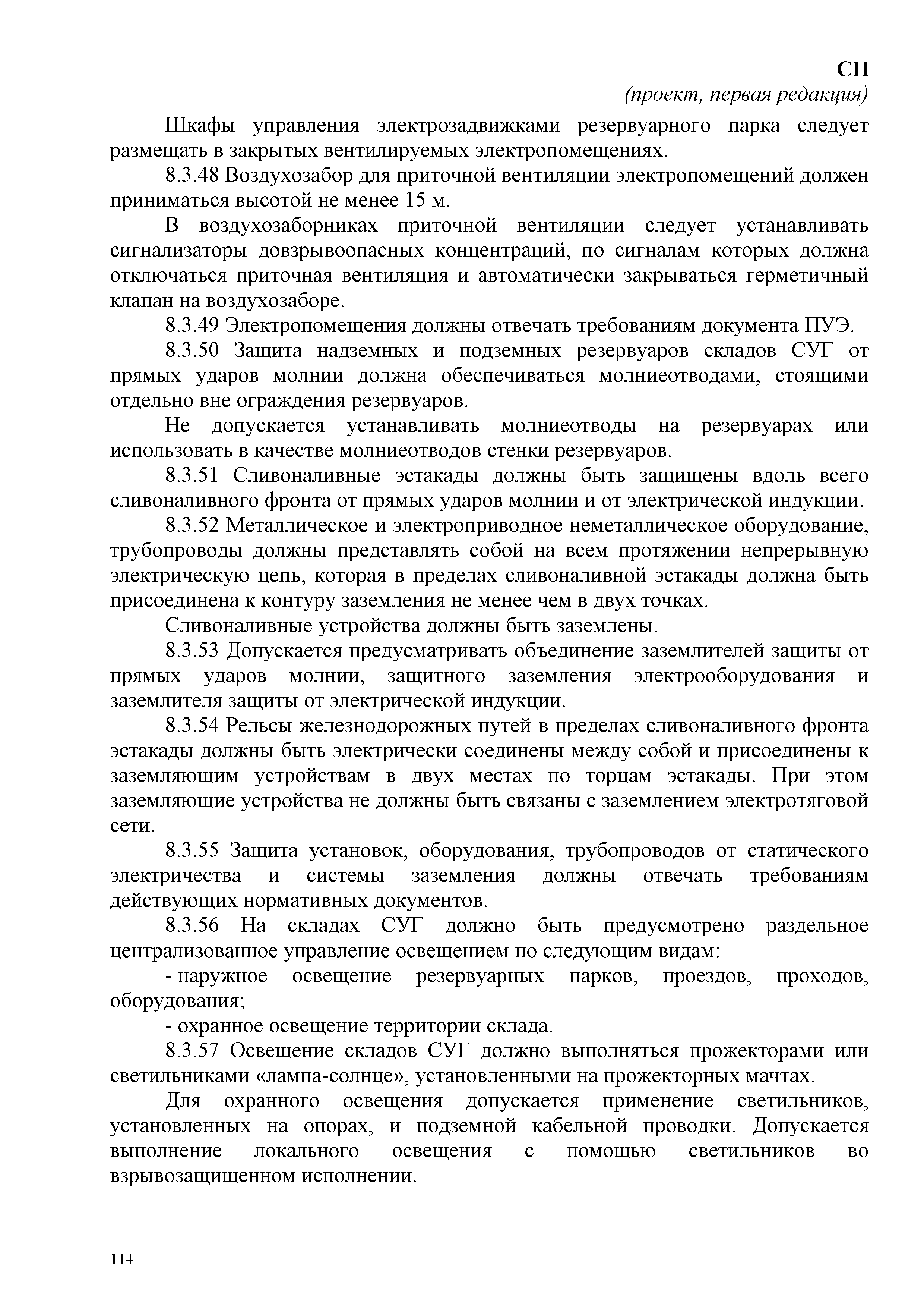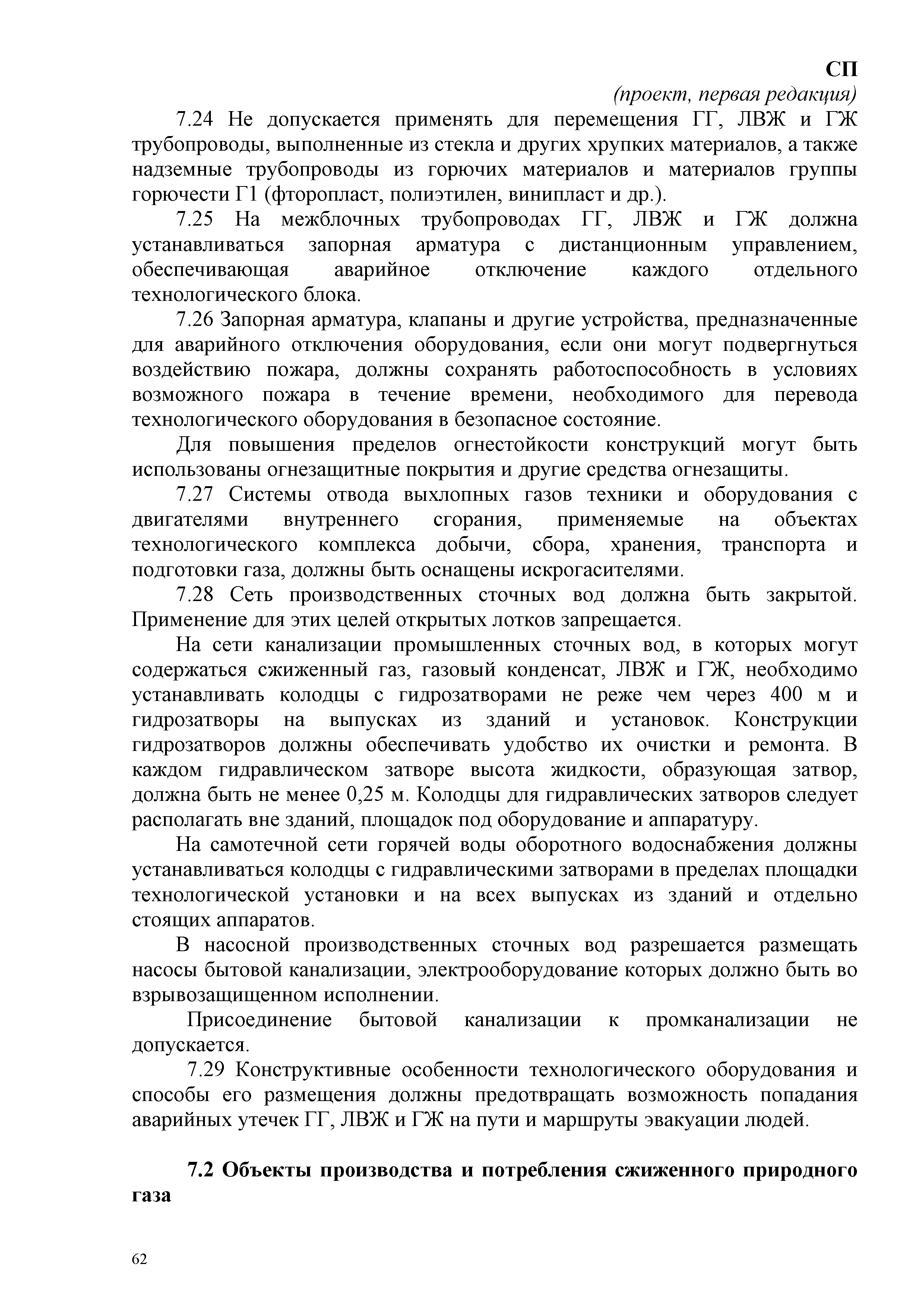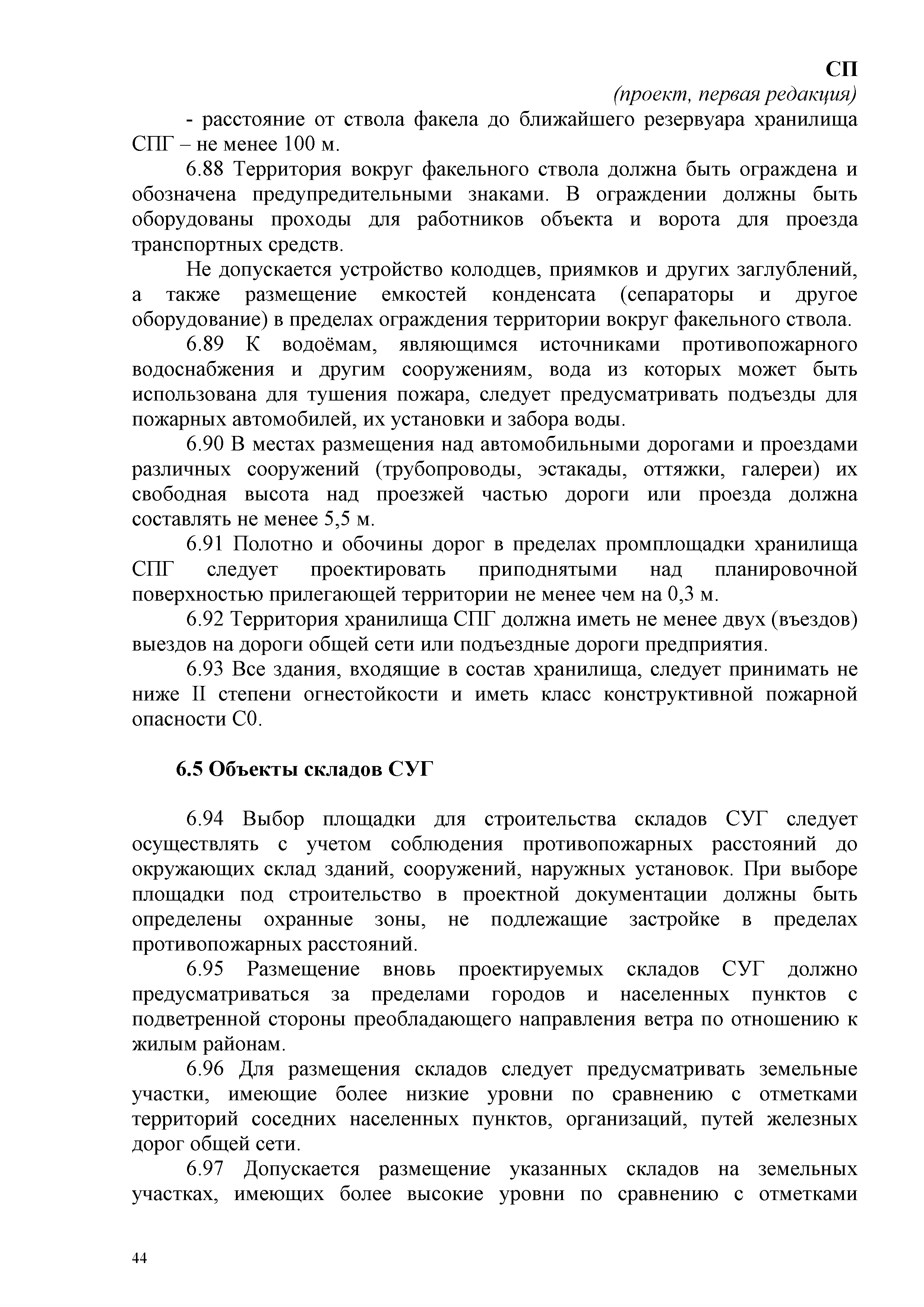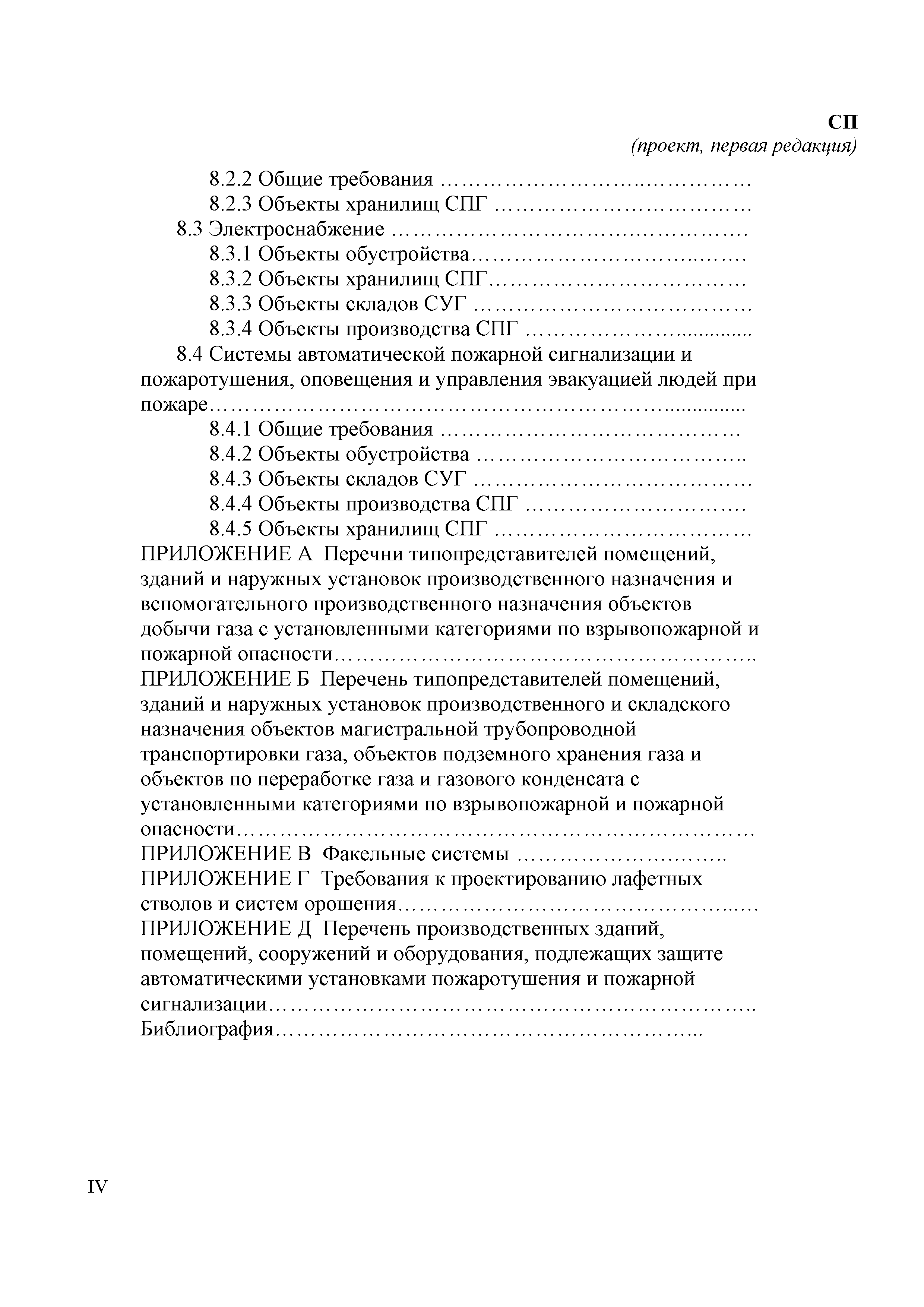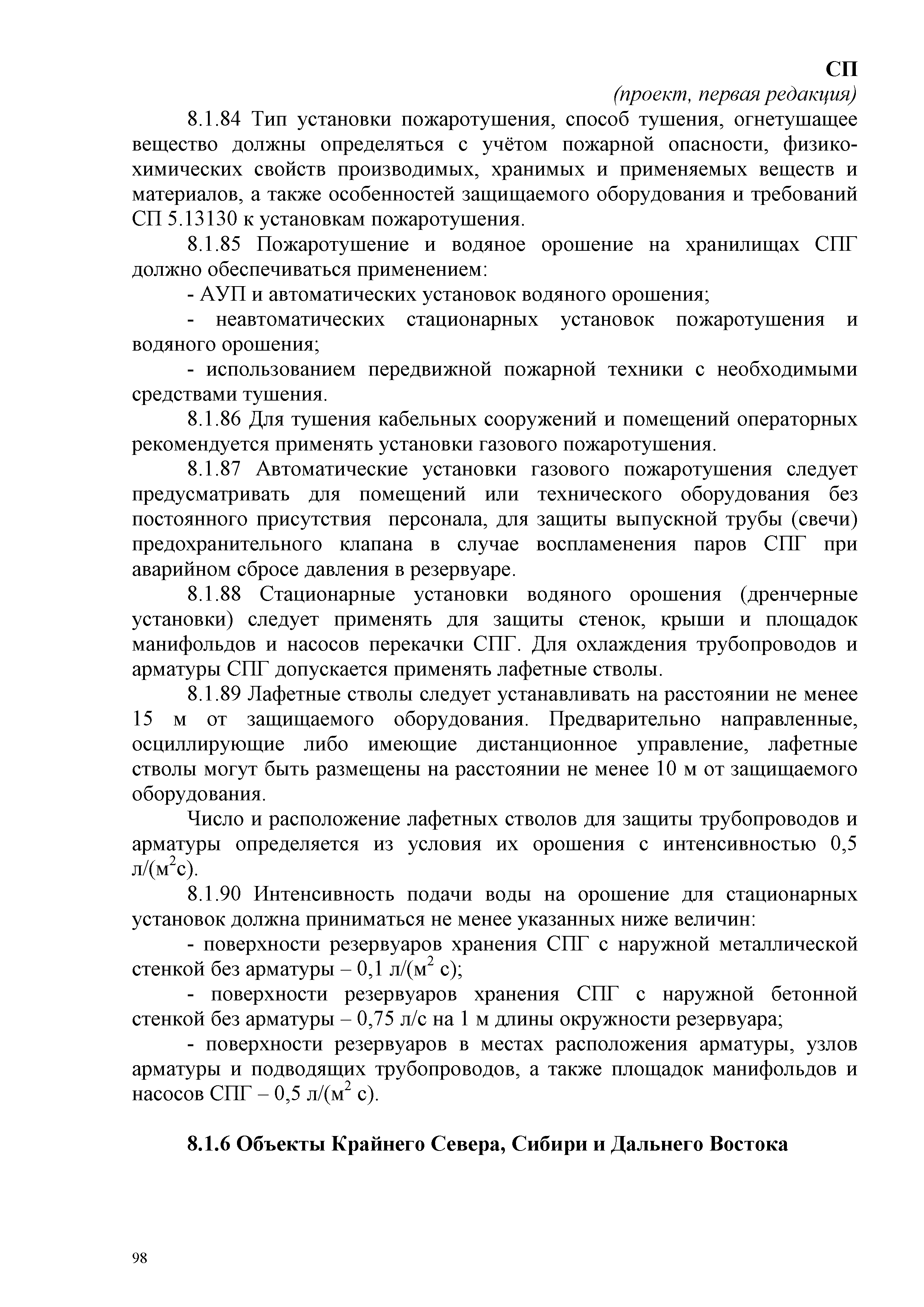 | Оглавление: | 1 Область применения 2 Нормативные ссылки 3 Термины, определения и сокращения 4 Основные положения 5 Требования к объектам пожарной охраны 6 Требования к генеральному плану и размещению зданий, наружных установок 6.1 Объекты обустройства газовых месторождений 6.2 Объекты по производству и переработке газа и газового конденсата 6.3 Объекты производства и потребления СПГ 6.4 Объекты хранилищ сниженного природного газа 6.5 Объекты складов СУГ 6.6 Резервуарные парки СУГ 6.7 Промежуточные склады СУГ 6.8 Склады СУГ, размещаемые в товарно-сырьевой зоне организации 6.9 Склады СУГ товарно-сырьевой зоне организации 6.10 Склады изотермического хранения СУГ 7 Требования пожарной безопасности к технологическому оборудованию объектов газовой промышленности 7.1 Объекты обустройства газовых месторождений 7.2 Объекты производства и потребления сжиженного природного газа 7.3 Объекты хранилищ сжиженного природного газа в подземных двухоболочечных резервуарах 7.4 Склады СУГ с резервуарами под давлением 8 Инженерные решения 8.1 Противопожарное водоснабжение 8.1.1 Общие требования 8.1.2 Объекты обустройства 8.1.3 Объекты производства СПГ 8.1.4 Склады СУГ 8.1.5 Хранилища СПГ 8.1.6 Объекты Крайнего Севера, Сибири и Дальнего Востока 8.2 Системы отопления, вентиляции и кондиционирования 8.2.1 Системы дымоудаления 8.2.2 Общие требования 8.3 Электроснабжение 8.3.1 Объекты обустройства 8.3.2 Объекты хранилищ СПГ 8.3.3 Объекты складов СУГ 8.3.4 Объекты производства СПГ 8.4 Системы автоматической пожарной сигнализации и пожаротушения, оповещения и управления эвакуацией людей при пожаре 8.4.1 Общие требования 8.4.2 Объекты обустройства 8.4.3 Объекты складов СУГ 8.4.4 Объекты производства СПГ 8.4.5 Объекты хранилищ СПГ Приложение А Перечни типопредставителей помещений, зданий и наружных установок производственного назначения и вспомогательного производственного назначения объектов добычи газа с установленными категориями по взрывопожарной и пожарной опасности Приложение Б Перечень типопредставителей помещений, зданий и наружных установок производственного назначения и вспомогательного производственного газа с установленными категориями по взрывопожарной и пожарной безопасности Приложение В Факельные системы Приложение Г Требования к проектированию лафетных стволов и систем орошения Приложение Д Перечень производственных зданий, помещений, сооружений и оборудования, подлежащих защите автоматическими установками пожаротушения и пожарной сигнализации Библиография |