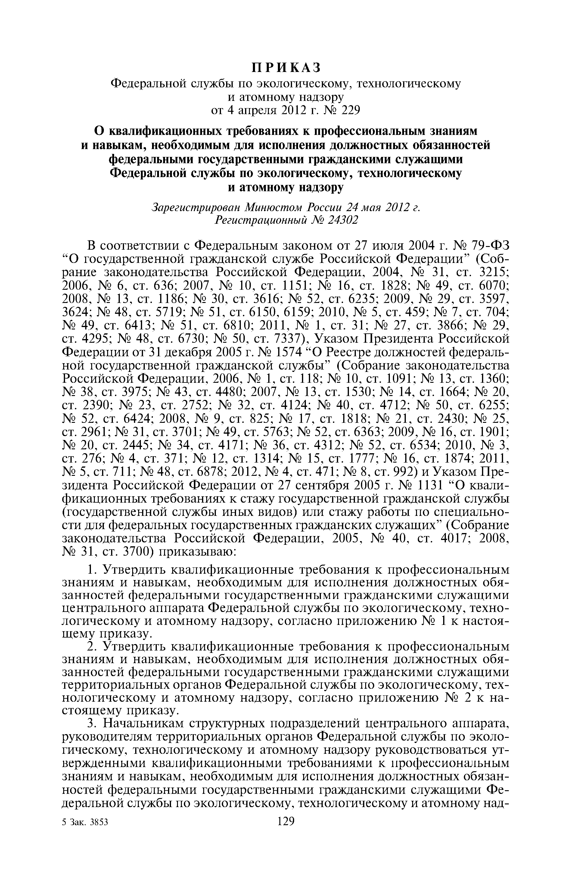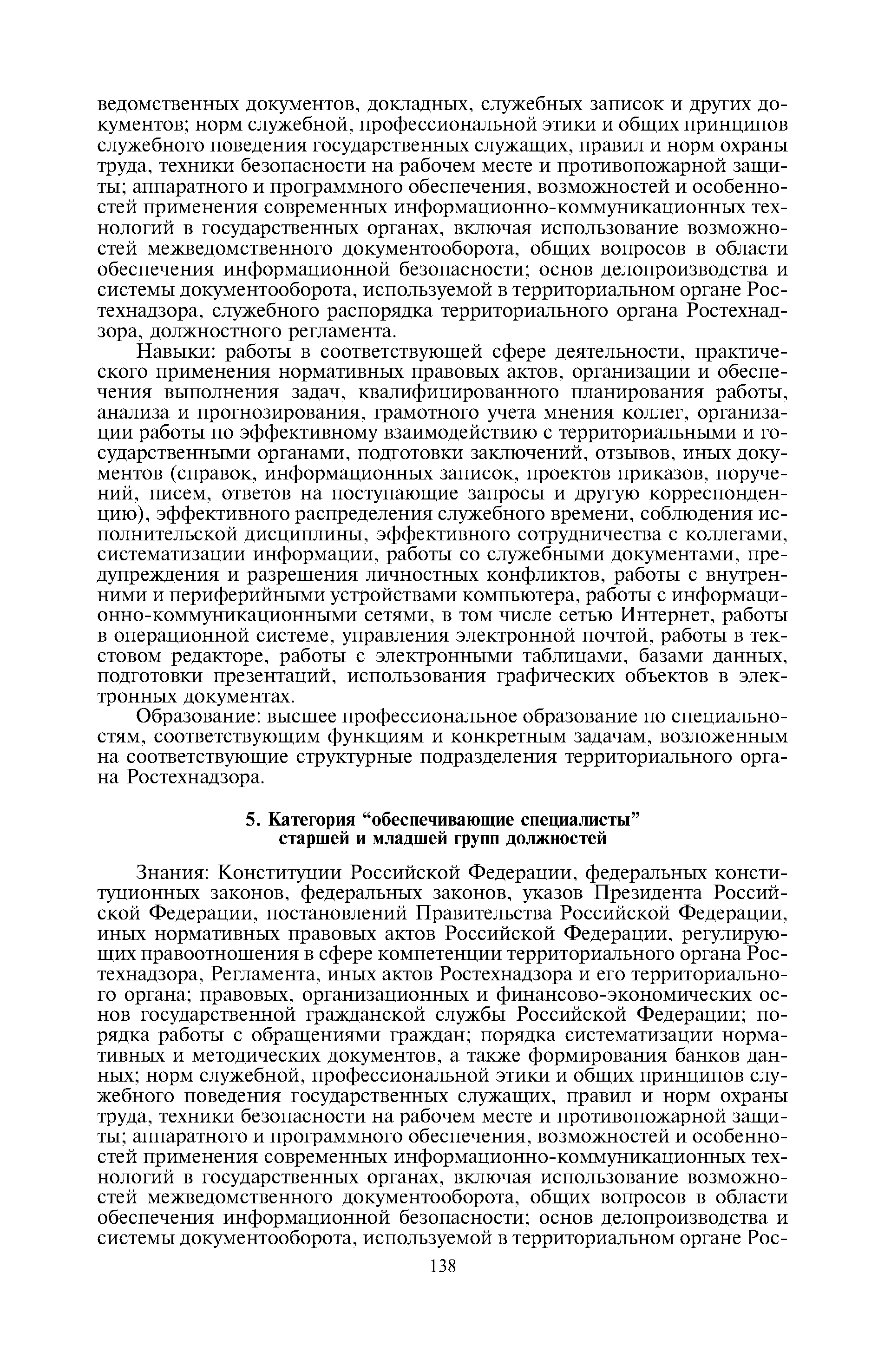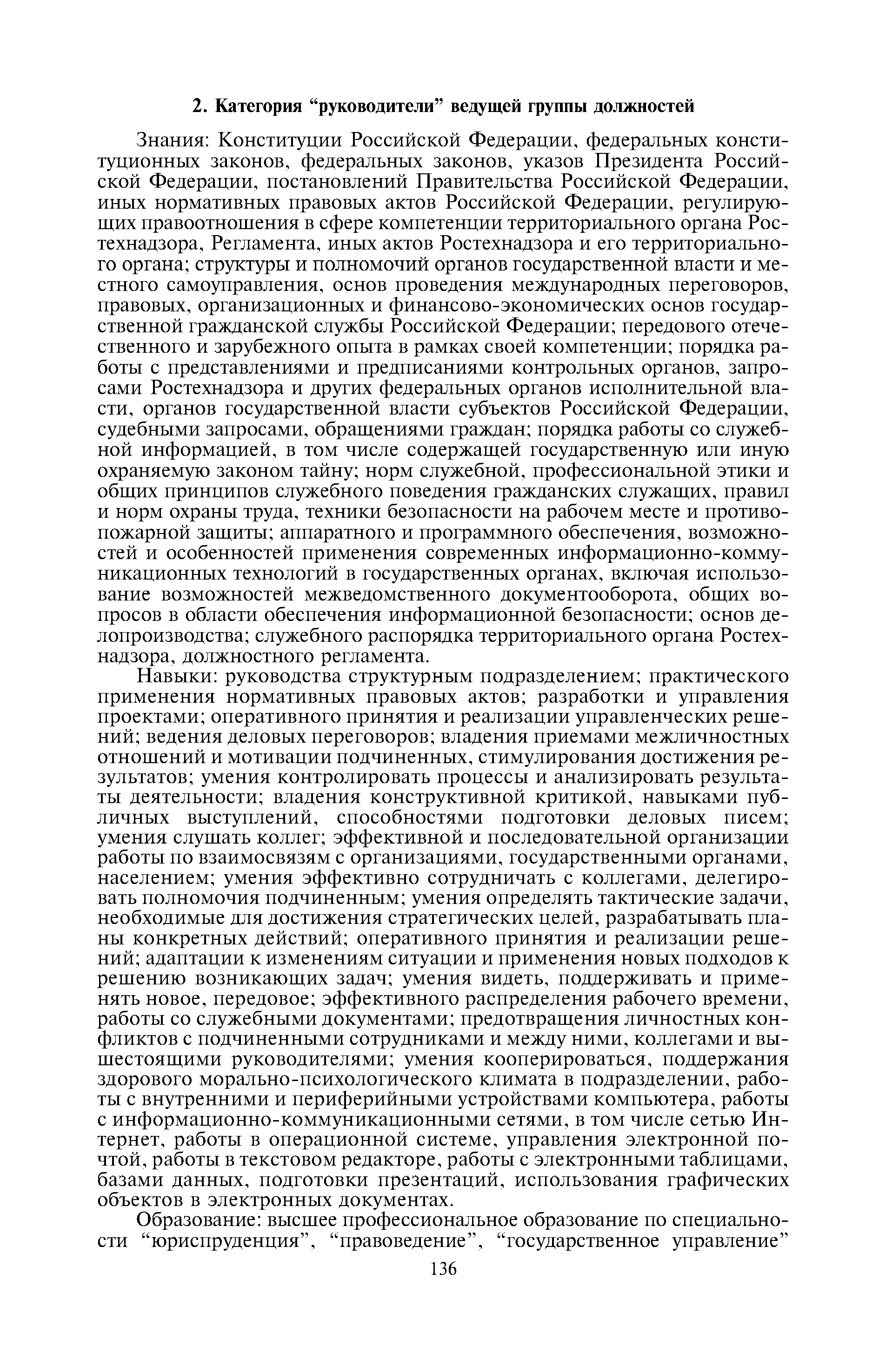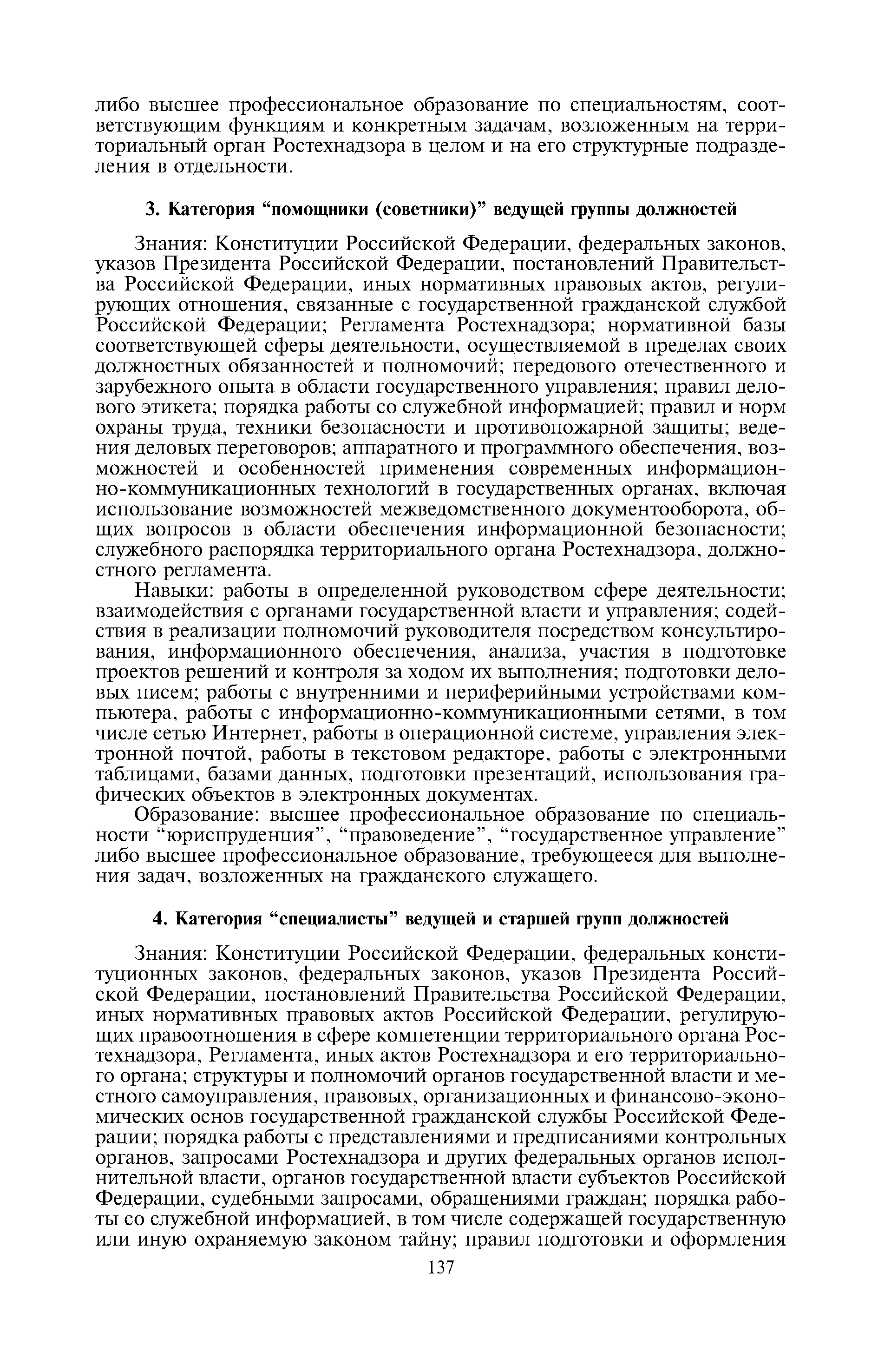 Квалификационные требования к профессиональным знаниям и навыкам, необходимым для исполнения должностных обязанностей федеральными государственными гражданскими служащими территориальных органов Федеральной службы по экологическому, технологическому и атомному надзору| Статус: | действует | | Название рус.: | Квалификационные требования к профессиональным знаниям и навыкам, необходимым для исполнения должностных обязанностей федеральными государственными гражданскими служащими территориальных органов Федеральной службы по экологическому, технологическому и атомному надзору | | Дата добавления в базу: | 01.10.2014 | | Дата актуализации: | 01.01.2021 | | Дата введения: | 21.09.2012 | | Оглавление: | 1 Категория "руководители" главной групп должностей 2 Категория "руководители" ведущей групп должностей 3 Категория "помощники (советники)" ведущей группы должностей 4 Категория "специалисты" ведущей и старшей групп должностей 5 Категория "обеспечивающие специалисты" старшей и младшей групп должностей | | Утверждён: | 04.04.2012 Федеральная служба по экологическому, технологическому и атомному надзору (229)