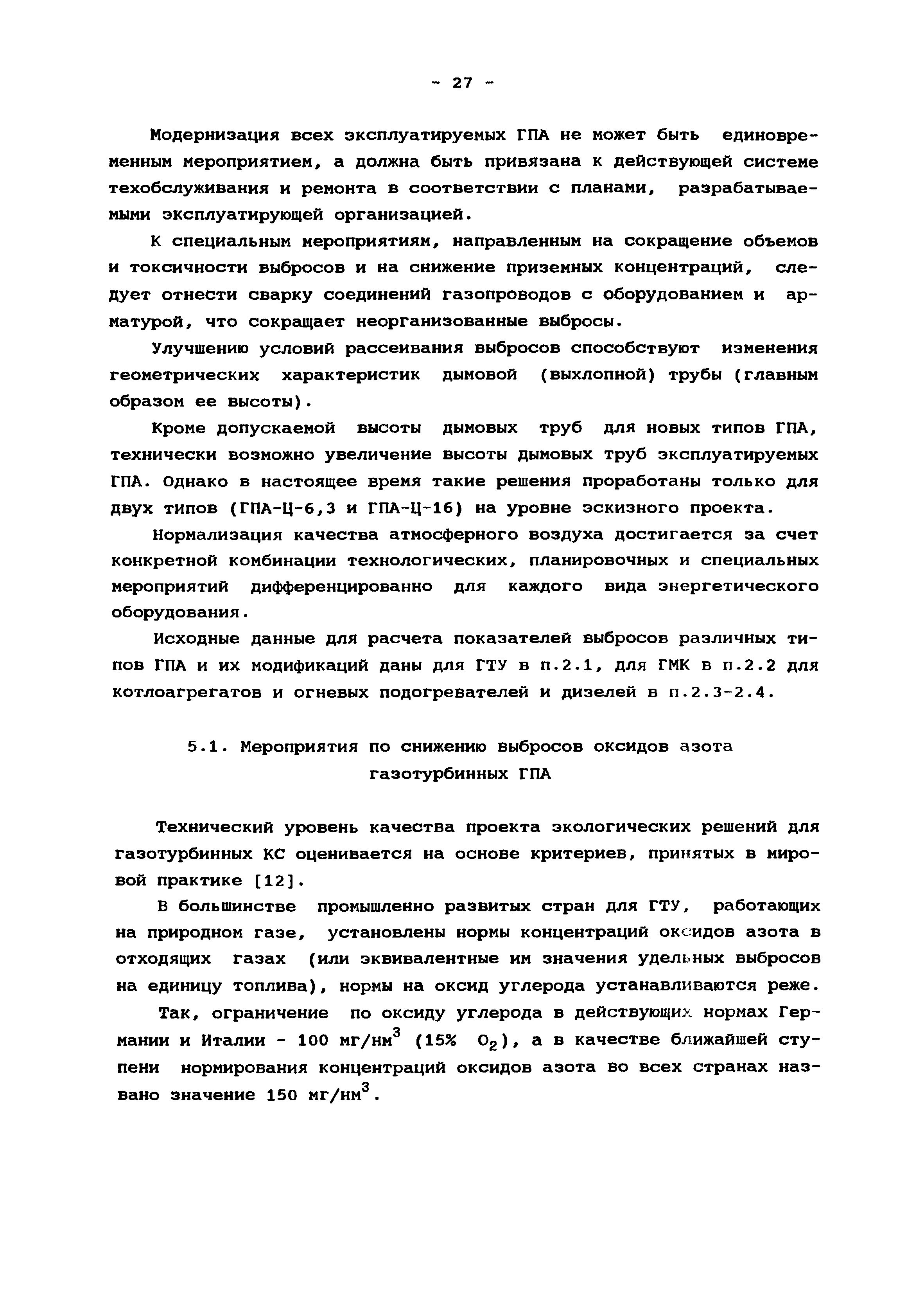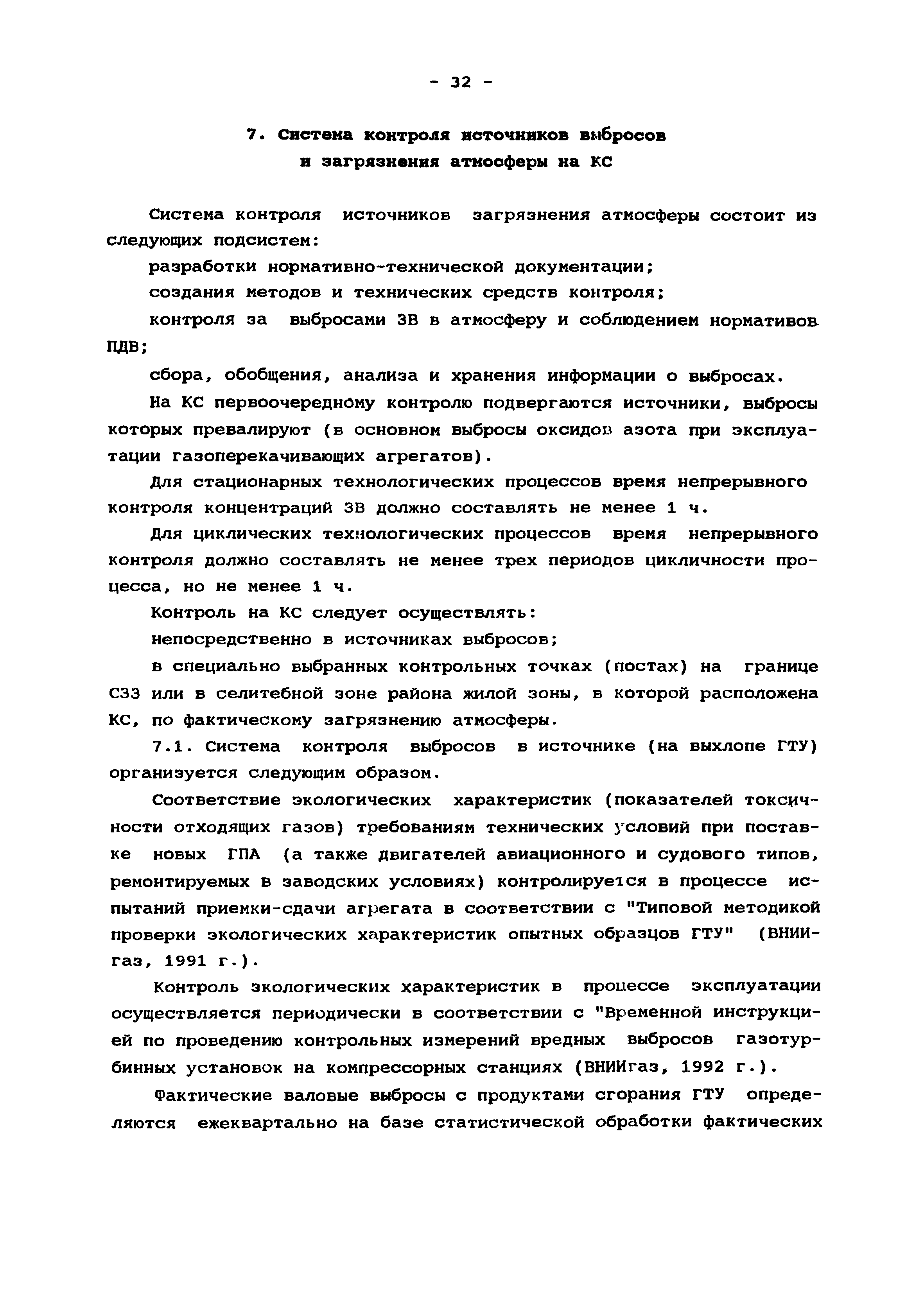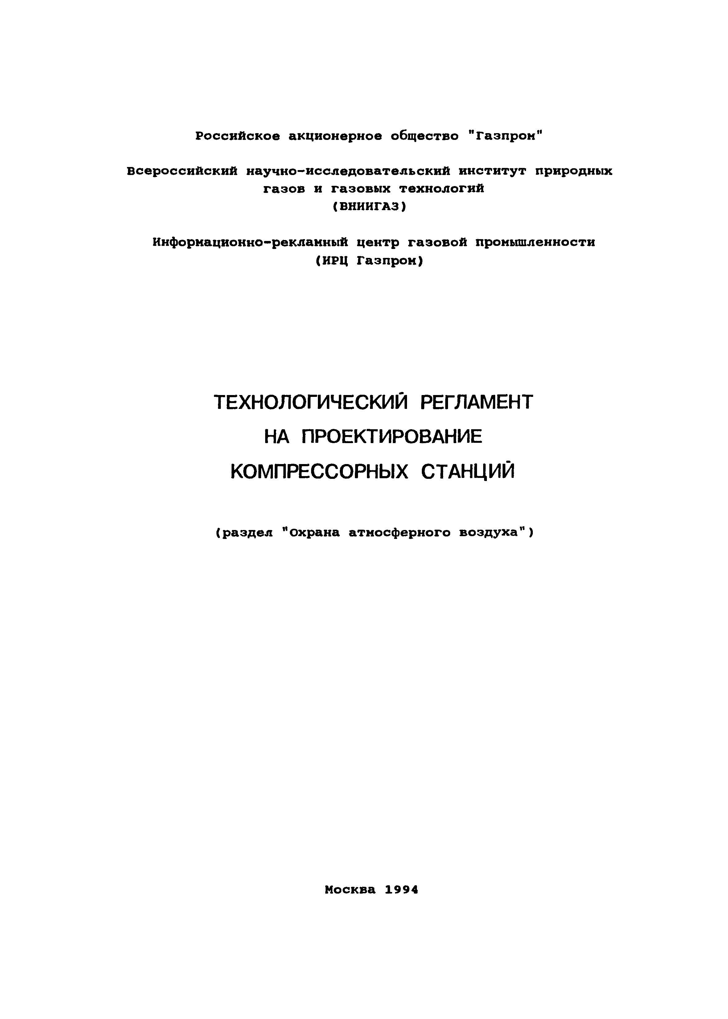 разработка предложений по нормативам предельно допустимых выбросов (ПДВ) загрязняющих веществ и соблюдение требований по нормативам ПДВ; выбор оптимальных технических и проектных решений, способствующих обеспечению социально-эколого-экономической сбалансированности хозяйственного развития объекта, снижению уровня негативного воздействия на окружающую среду до назначенного приемлемого уровня. | | Оглавление: | 1. Общие положения 2. Выбросы загрязняющих веществ с продуктами сгорания энерготехнологического оборудования 2.1. Выбросы ЗВ с продуктами сгорания газотурбинных агрегатов 2.2 Выбросы загрязняющих веществ с отходящими газами газомотокомпрессоров (ГМК) 2.3. Выбросы загрязняющих веществ с уходящими газами котельных установок и огневых подогревателей 2.4. Выбросы загрязняющих веществ с отработавшими газами агрегатов электростанций собственных нужд 3. Выбросы природного газа на КС 3.1. Структура выбросов природного газа на КС 3.2. Выбросы природного газа при пуске ГПА 3.3. Выбросы природного газа при остановке ГПА 3.4. Выбросы природного газа из установок очистки 3.5. Суммарные выбросы природного газа по компрессорному цеху 4. Оценка уровня загрязнения атмосферы в районе расположения КС. Расчет рассеивания выбросов загрязняющих веществ в атмосфере 4.1. Подготовка исходных данных для расчета концентрации ЗВ в атмосфере 4.2. Фоновое загрязнение атмосферы 4.3. Метеорологические характеристики и коэффициенты, определяющие условия рассеивания ЗВ в атмосфере 4.4. Расчет размеров санитарно-защитной зоны 5. Комплекс воздухоохранных мероприятий на КС и их технический уровень 5.1. Мероприятия по снижению выбросов оксидов азота газотурбинных ГПА 5.2. Мероприятия по ограничению выбросов оксидов азота в атмосферу от поршневых газоперекачивающих и энергетических установок 5.3. Оценка соответствия воздухоохранных мероприятий международным требованиям по ограничению выбросов ЗВ 6. Мероприятия по регулированию выбросов в периоды неблагоприятных метеоусловий 7. Система контроля источников выбросов и загрязнения атмосферы на КС Список использованной литературы Приложение 1. Характеристика основных загрязняющих веществ, выбрасываемых в атмосферу на КС Приложение 2. Карта-схема предприятия | | Разработан: | ВНИИгаз (VNIIgaz ) ИРЦ Газпром