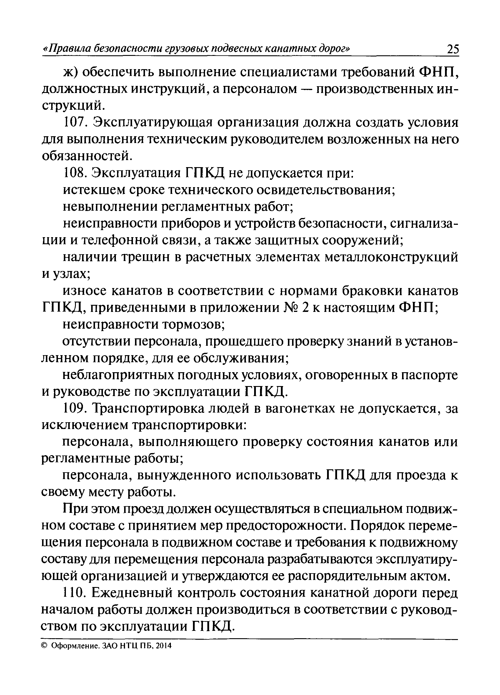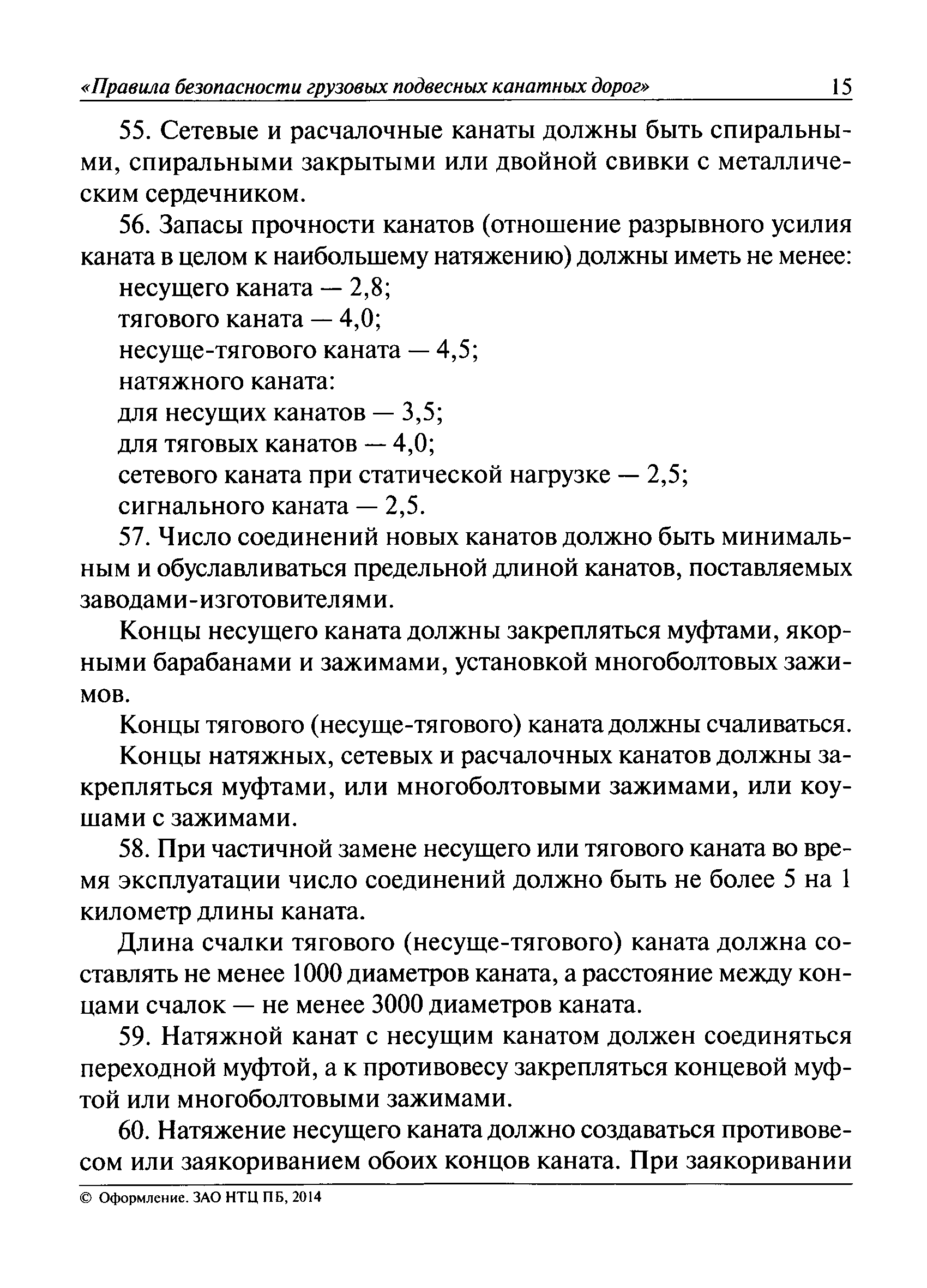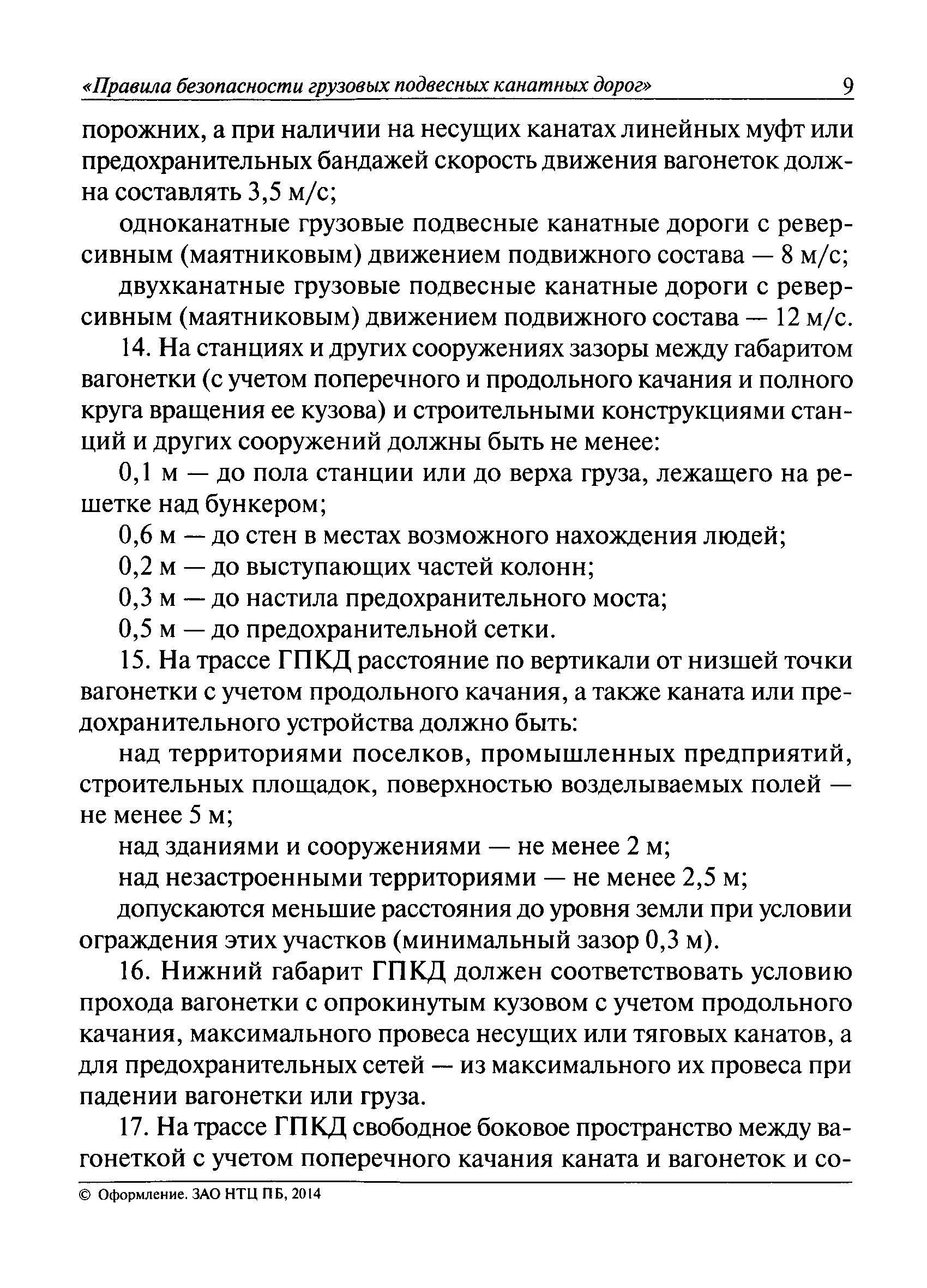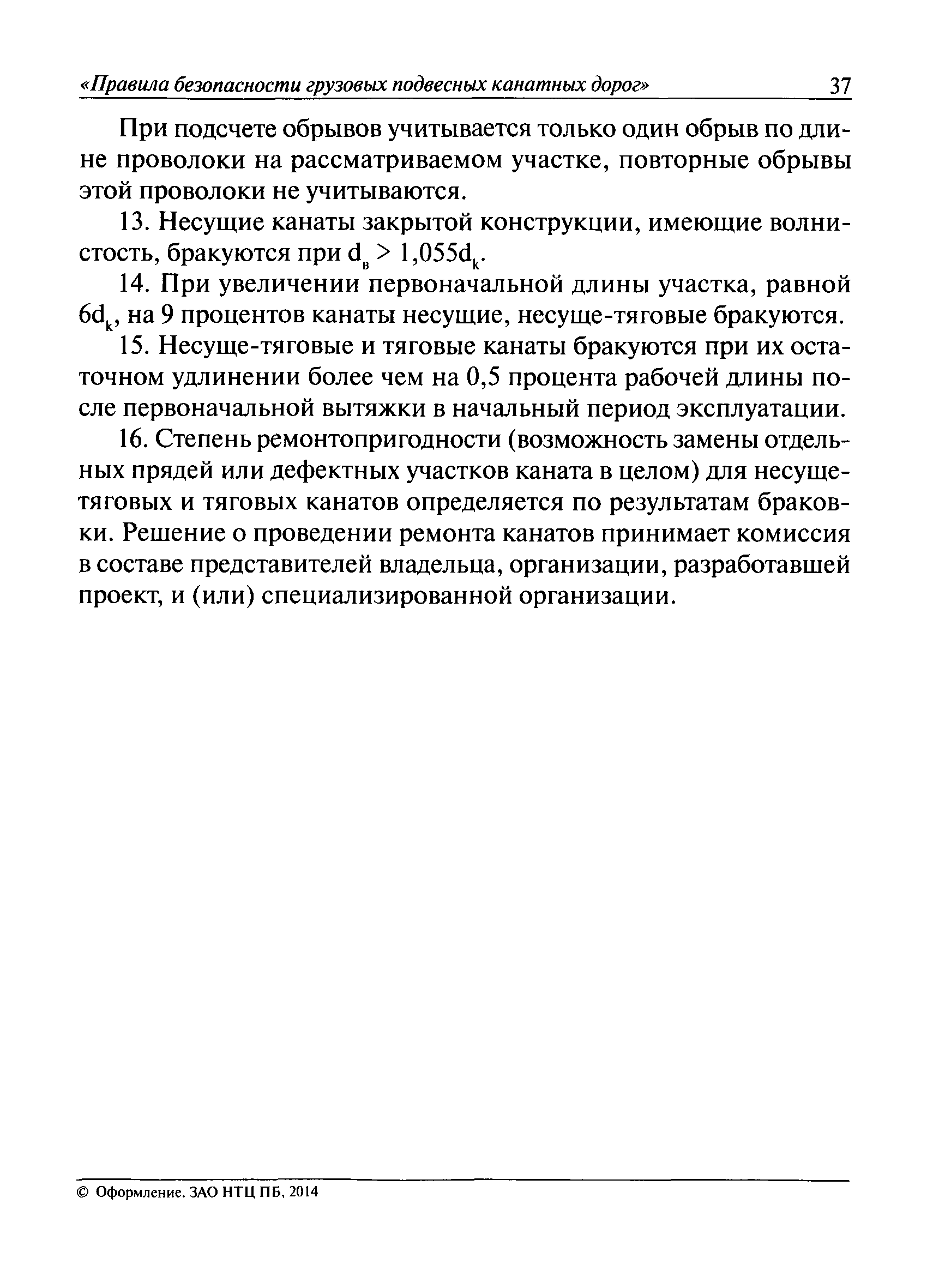 | Оглавление: | I. Общие положения II. Требования при изготовлении III. Общие требования к безопасности технологических процессов IV. Приемка и ввод в эксплуатацию V. Регистрация VI. Организация эксплуатации VII. Регламентные работы VIII. Техническое освидетельствование и экспертиза промышленной безопасности IХ. Требования к руководству по эксплуатации Х. Переходные положения Приложение № 1. Термины и определения Приложение № 2. Нормы браковки стальных канатов грузовой подвесной канатной дороги Приложение № 3. Паспорт грузовой подвесной канатной дороги Приложение № 4. Перечень работ, выполняемых специализированными организациями или ремонтными службами (подразделениями) эксплуатирующей организации |