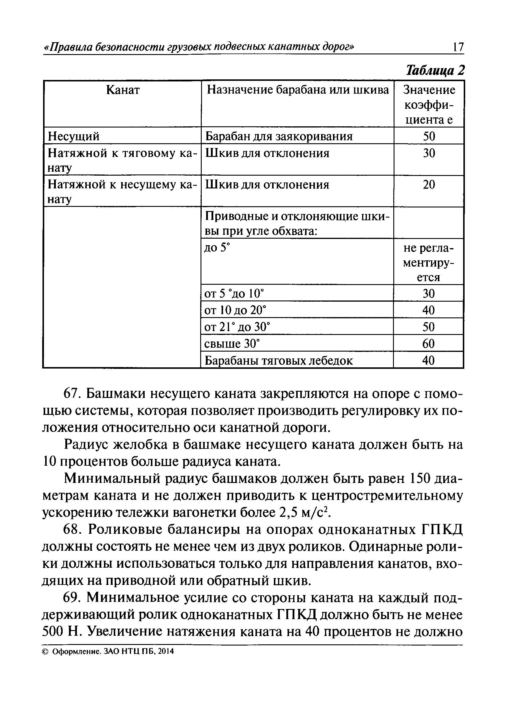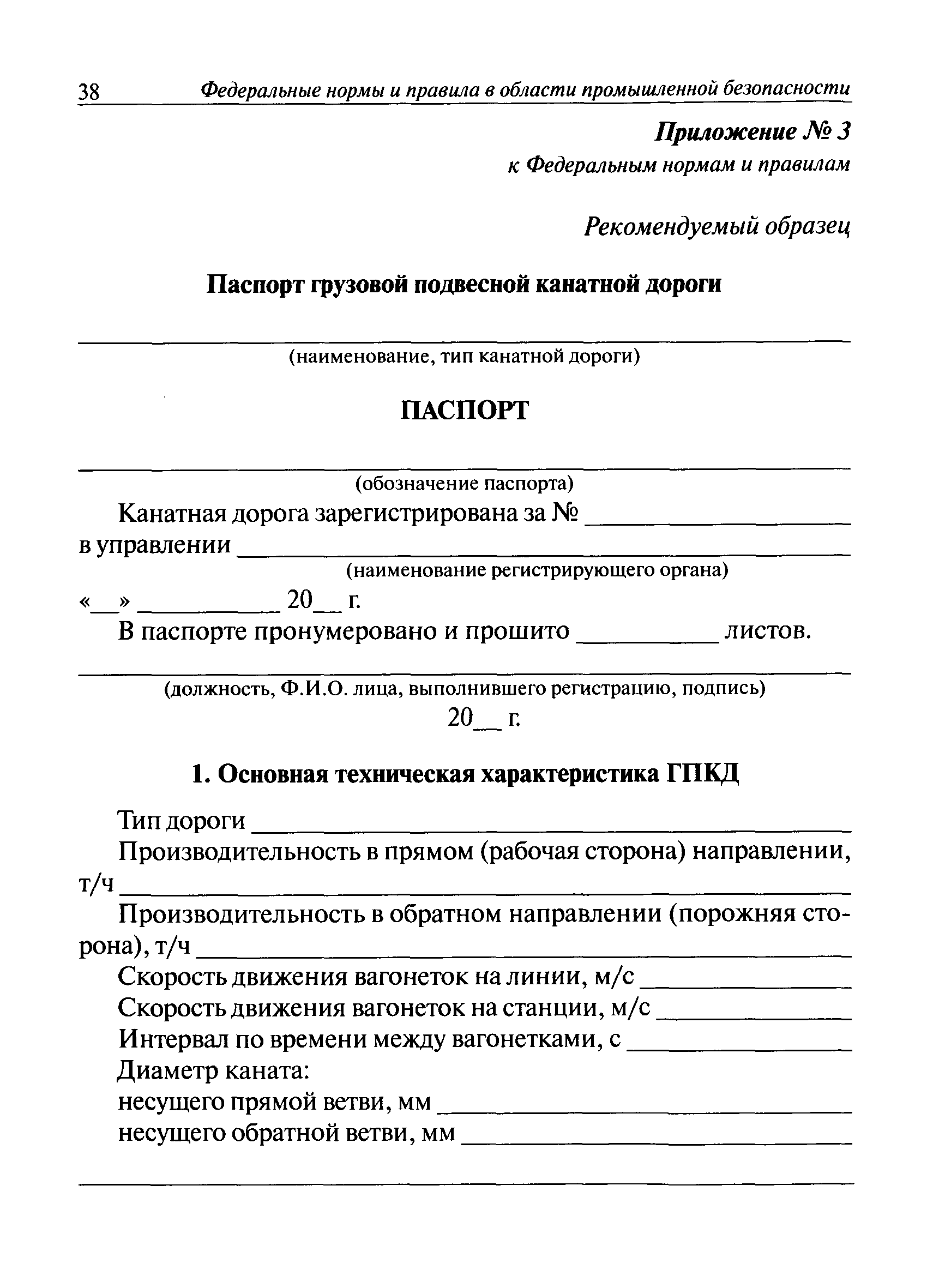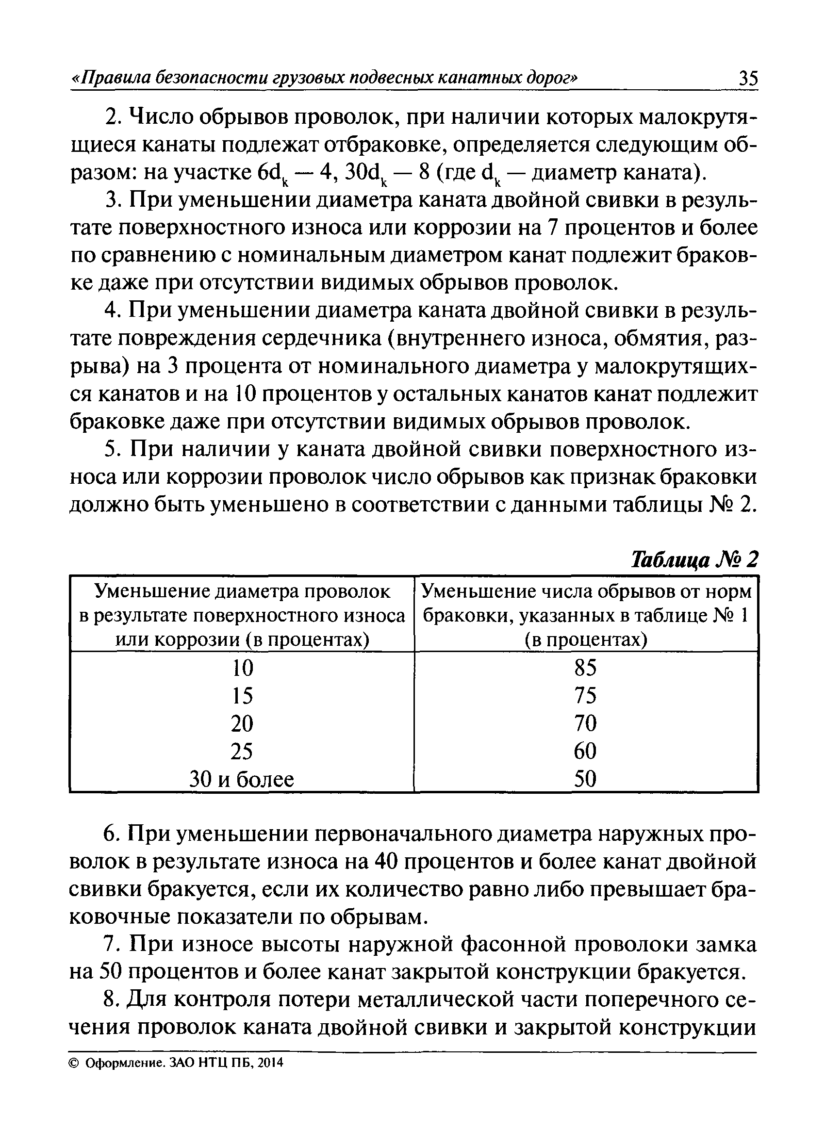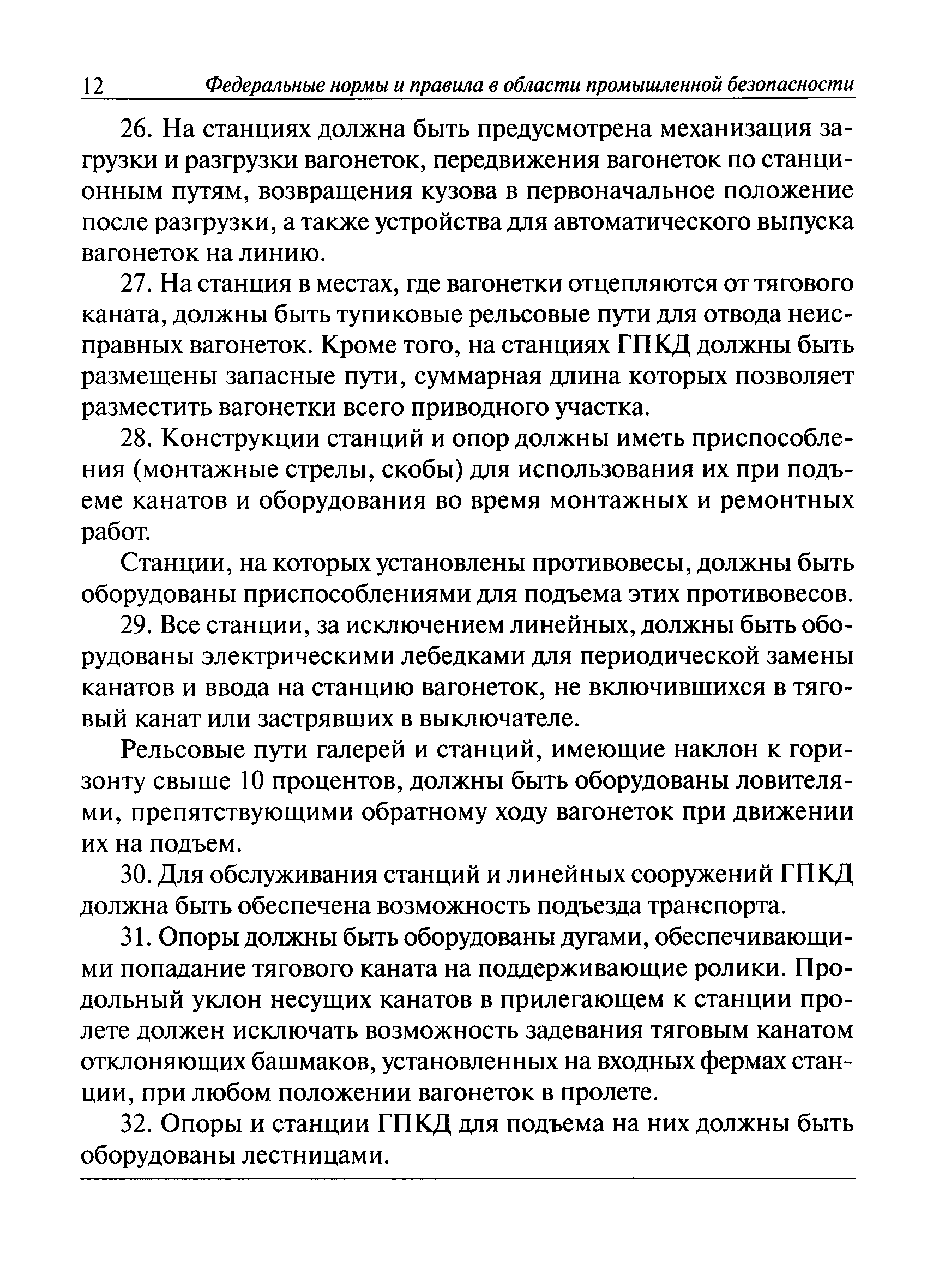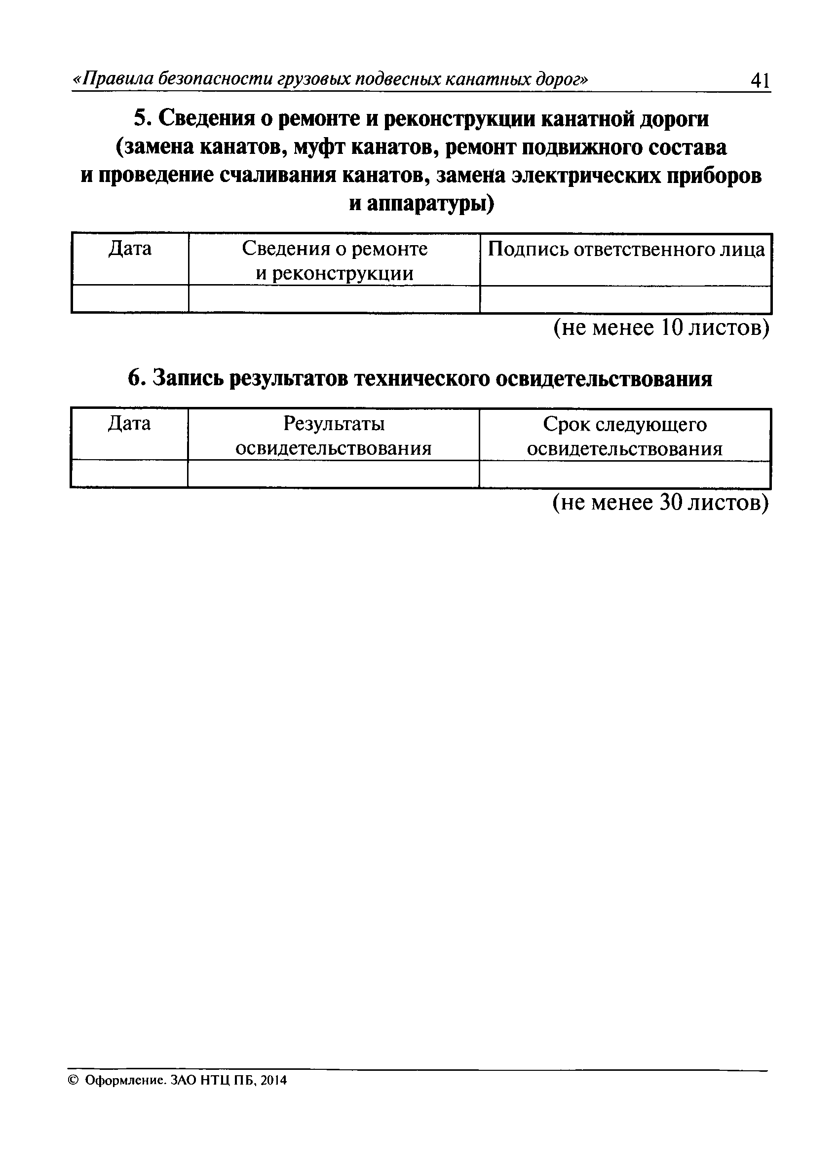 | Оглавление: | I. Общие положения II. Требования при изготовлении III. Общие требования к безопасности технологических процессов IV. Приемка и ввод в эксплуатацию V. Регистрация VI. Организация эксплуатации VII. Регламентные работы VIII. Техническое освидетельствование и экспертиза промышленной безопасности IХ. Требования к руководству по эксплуатации Х. Переходные положения Приложение № 1. Термины и определения Приложение № 2. Нормы браковки стальных канатов грузовой подвесной канатной дороги Приложение № 3. Паспорт грузовой подвесной канатной дороги Приложение № 4. Перечень работ, выполняемых специализированными организациями или ремонтными службами (подразделениями) эксплуатирующей организации |