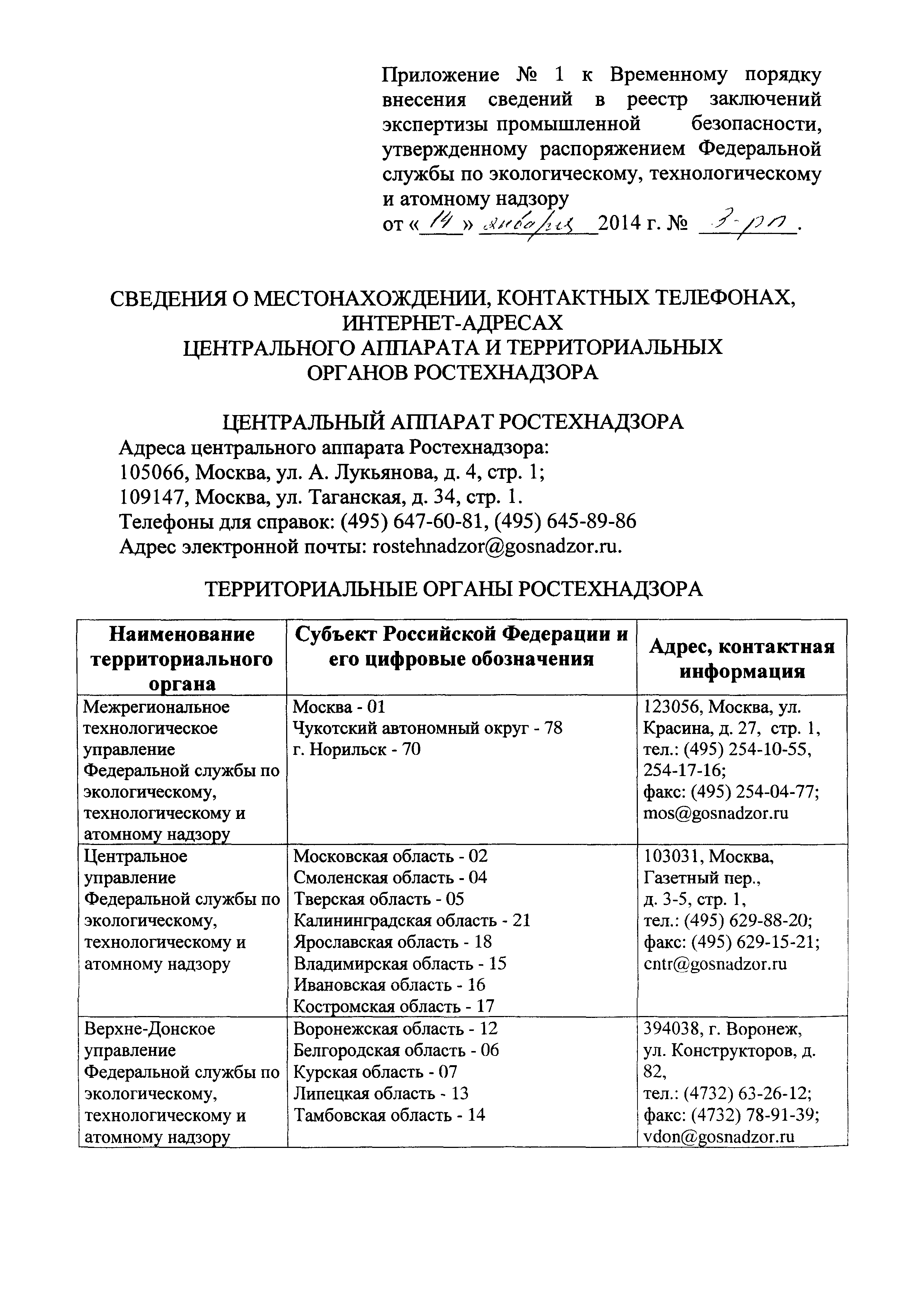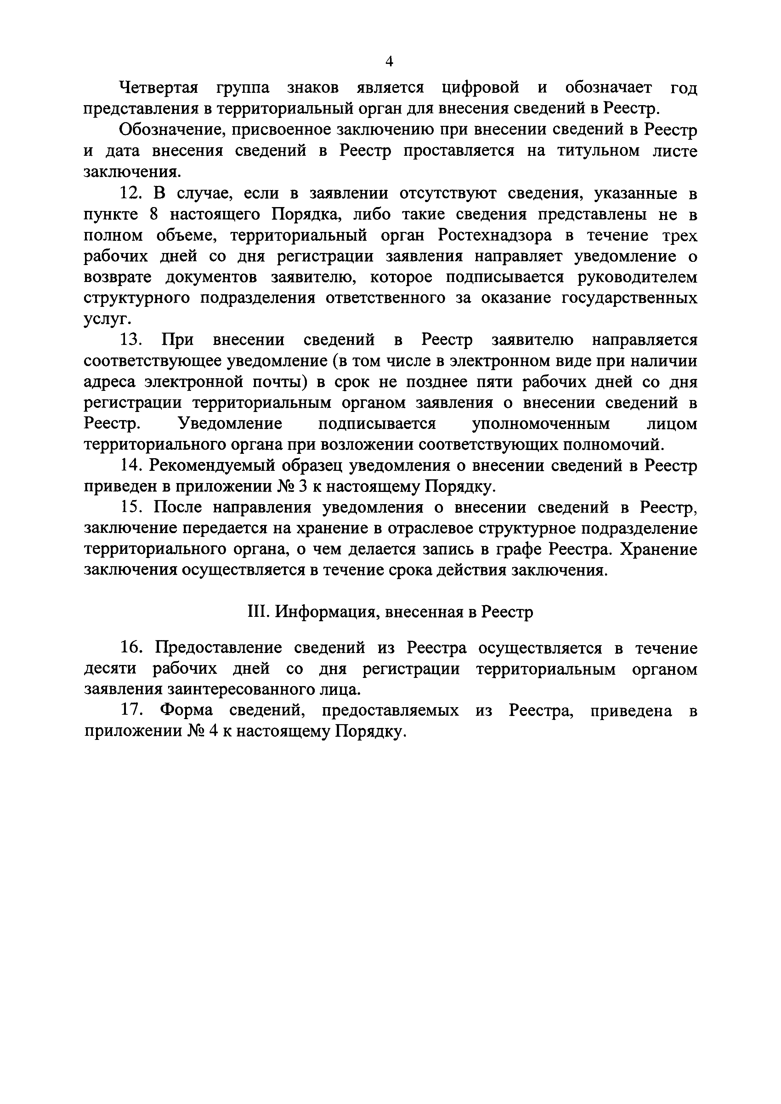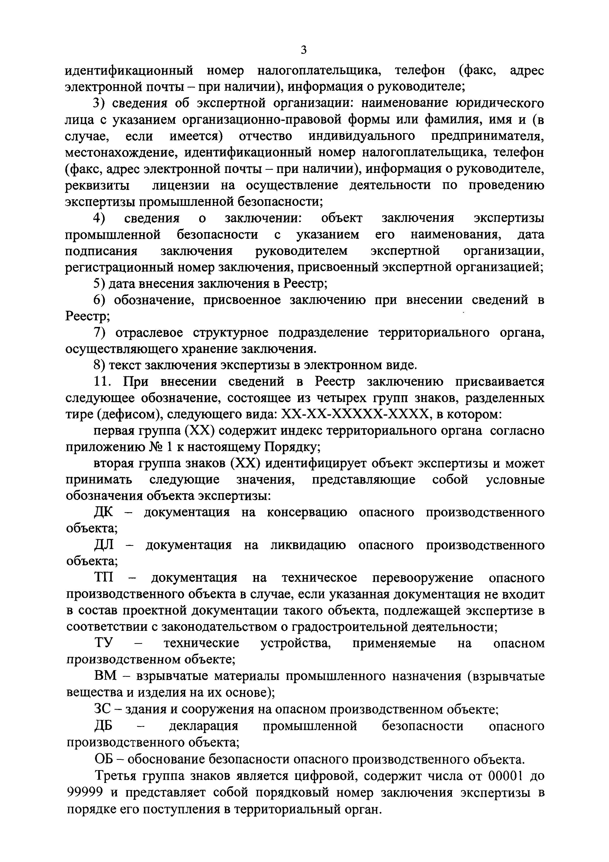 | Оглавление: | I. Общие положения II. Порядок внесения сведений в Реестр III. Информация, внесенная в Реестр Приложение № 1. Сведения о местонахождении, контактных телефонах, интернет-адресах центрального аппарата и территориальных органов Ростехнадзора Приложение № 2. Заявление о внесении в Реестр заключений экспертизы промышленной безопасности Приложение № 3. Уведомление о внесении сведений в Реестр заключений экспертизы промышленной безопасности Приложение № 4. Форма сведений, предоставляемых из Реестра заключений экспертизы промышленной безопасности Приложение № 5. Требования к форматам электронных документов и типам электронных носителей, предоставляемых в Ростехнадзор |