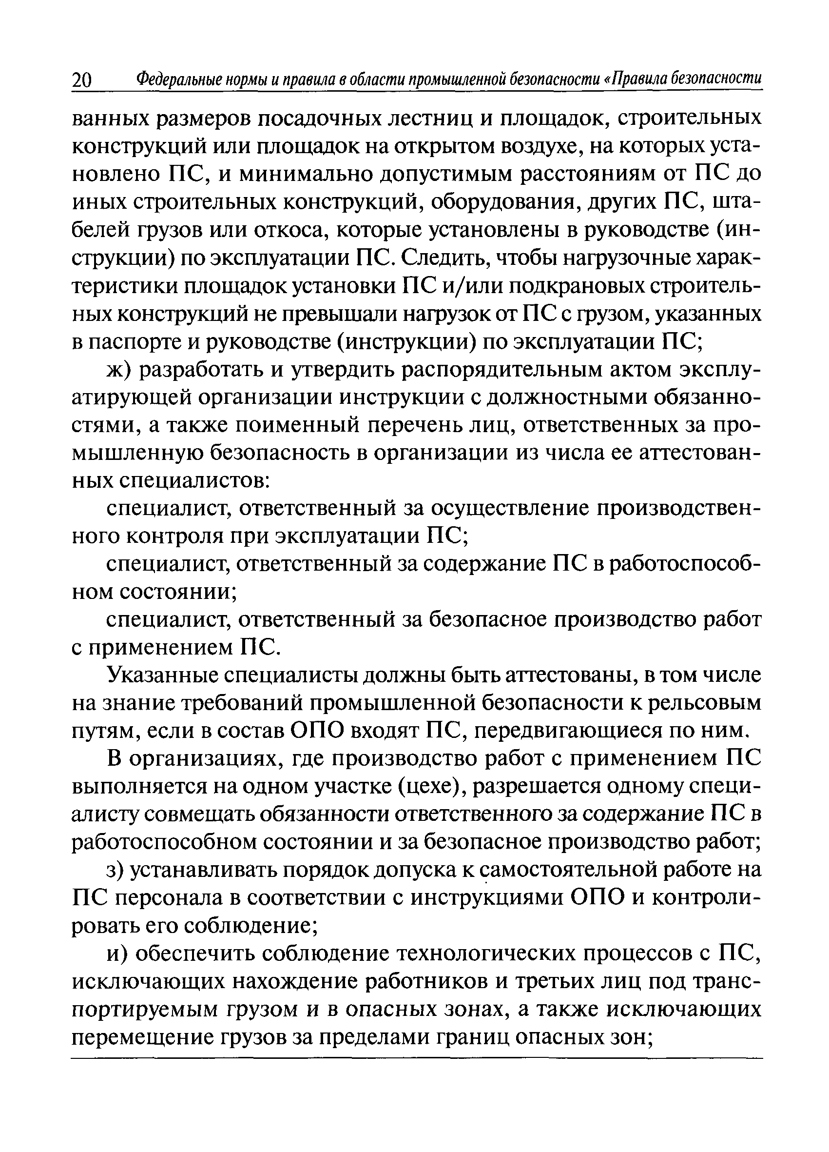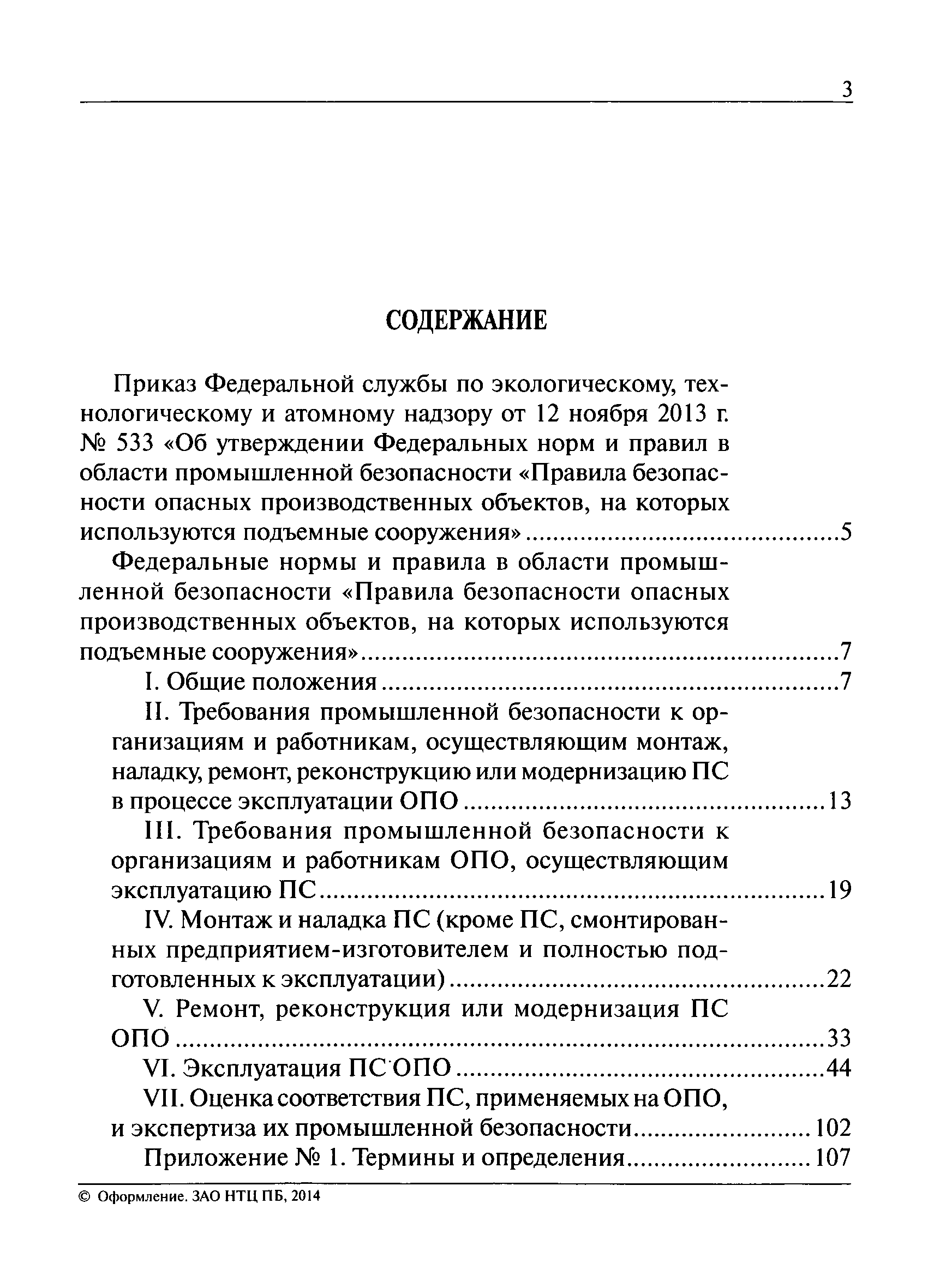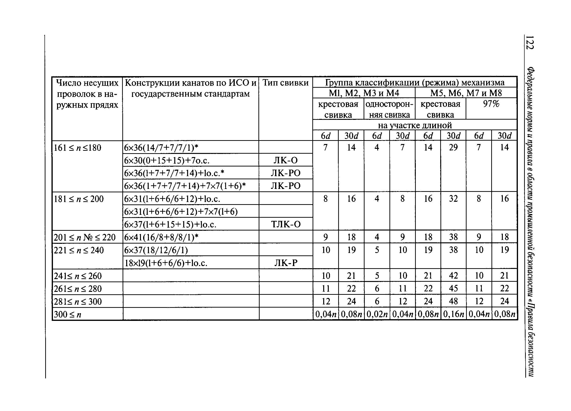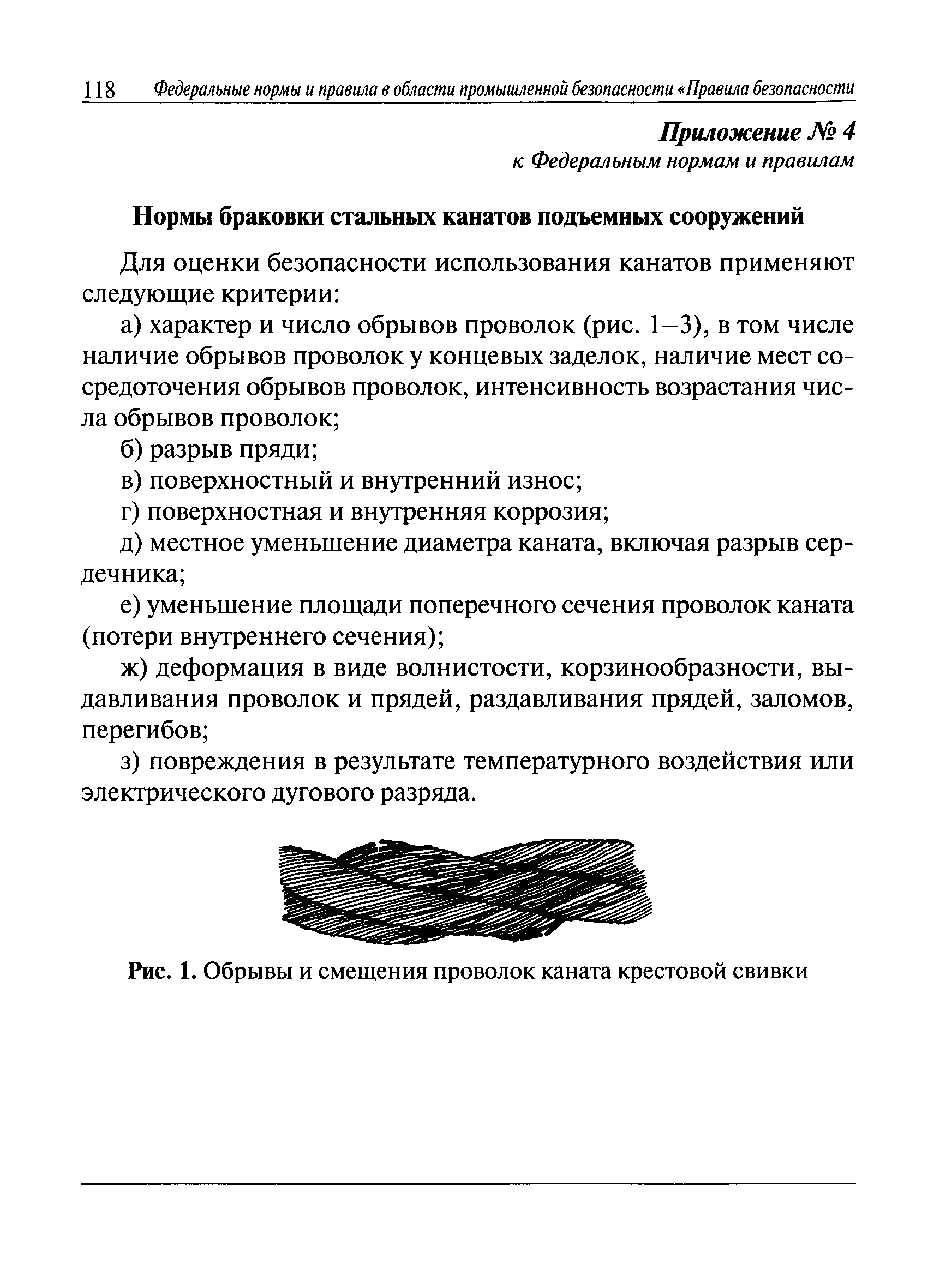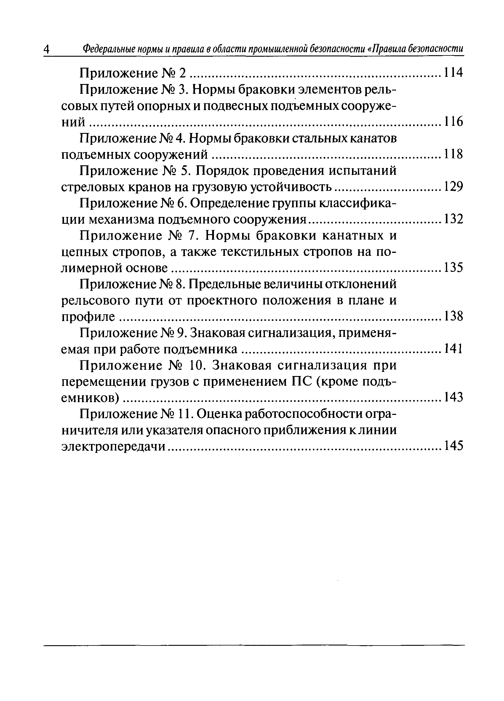| Оглавление: | I. Общие положения II. Требования промышленной безопасности к организациям и работникам, осуществляющим монтаж, наладку, ремонт, реконструкцию или модернизацию ПС в процессе эксплуатации ОПО III. Требования промышленной безопасности к организациям и работникам ОПО, осуществляющим эксплуатацию ПС IV. Монтаж и наладка ПС (кроме ПС, смонтированных предприятием- изготовителем и полностью подготовленных к эксплуатации) V. Ремонт, реконструкция или модернизация ПС ОПО VI. Эксплуатация ПС ОПО VII. Оценка соответствия ПС, применяемых на ОПО и экспертиза их промышленной безопасности Приложение № 1 Термины и определения Приложение № 2 Уменьшение величины полезной грузоподъемности крана при оснащении его механизированным и/или электрифицированным грузозахватным приспособлением, в том числе моторным грейфером или электромагнитом. Приложение № 3 Нормы браковки элементов рельсовых путей опорных и подвесных подъемных сооружений Приложение № 4 Нормы браковки стальных канатов подъемных сооружений Приложение № 5 Порядок проведения испытаний стреловых кранов на грузовую устойчивость Приложение № 6 Определение группы классификации механизма подъемного сооружения Приложение № 7 Нормы браковки канатных и цепных стропов, а также текстильных стропов на полимерной основе. Приложение № 8 Предельные величины отклонений рельсового пути от проектного положения в плане и профиле Приложение № 9 Знаковая сигнализация, применяемая при работе подъемника (вышки) Приложение № 10 Знаковая сигнализация при перемещении грузов с применением ПС (кроме подъемников (вышек) Приложение № 11 Оценка работоспособности ограничителя или указателя опасного приближения к линии электропередач |