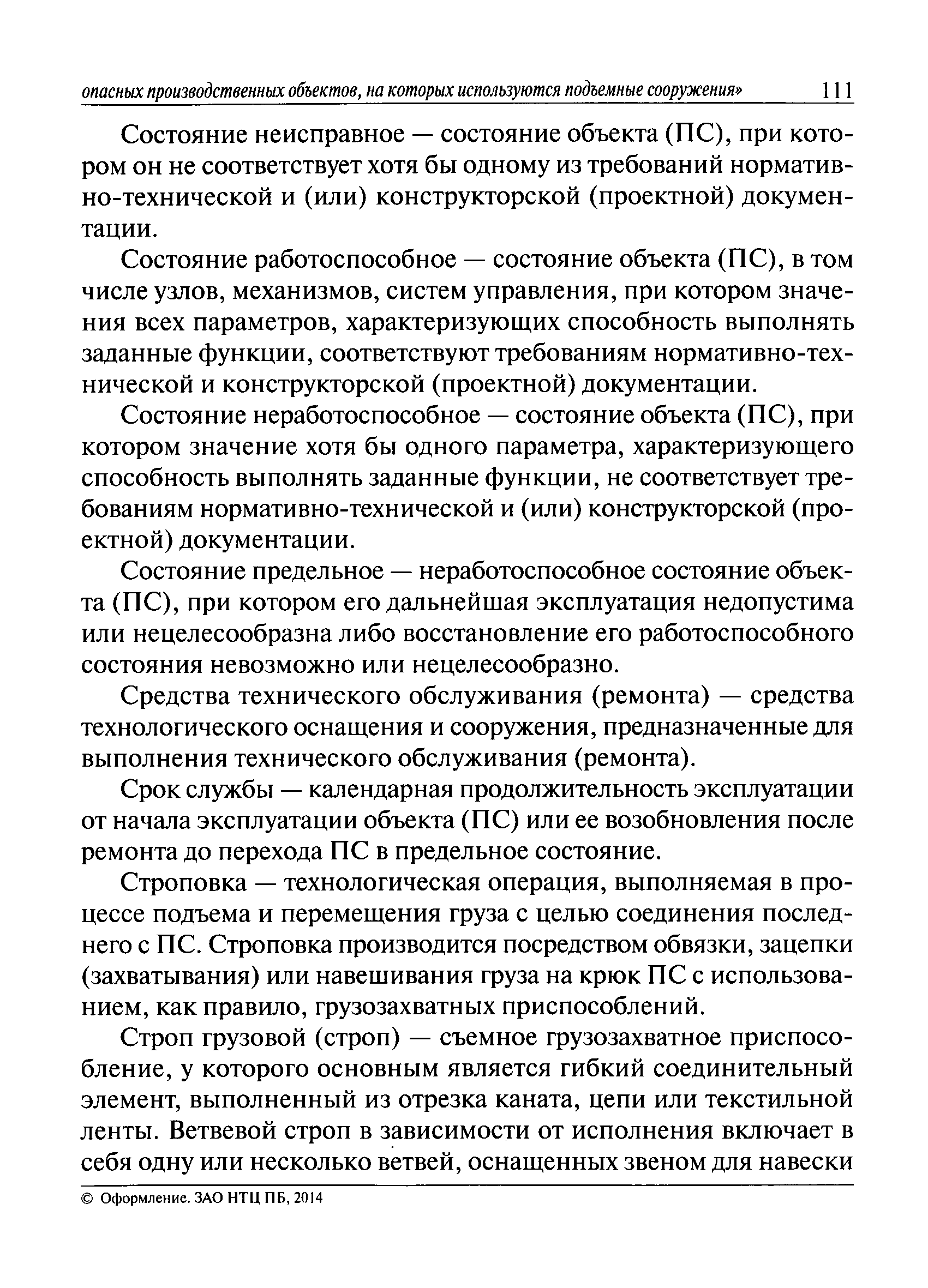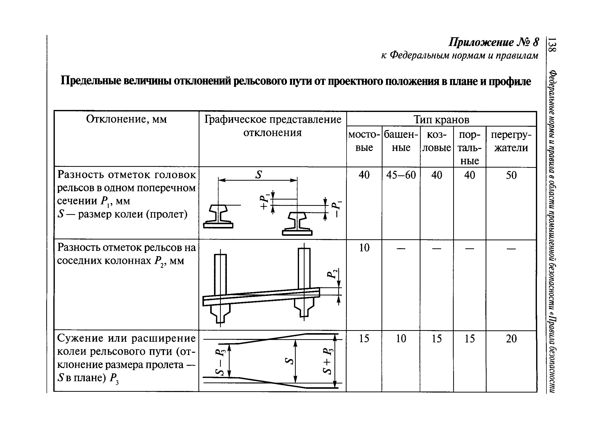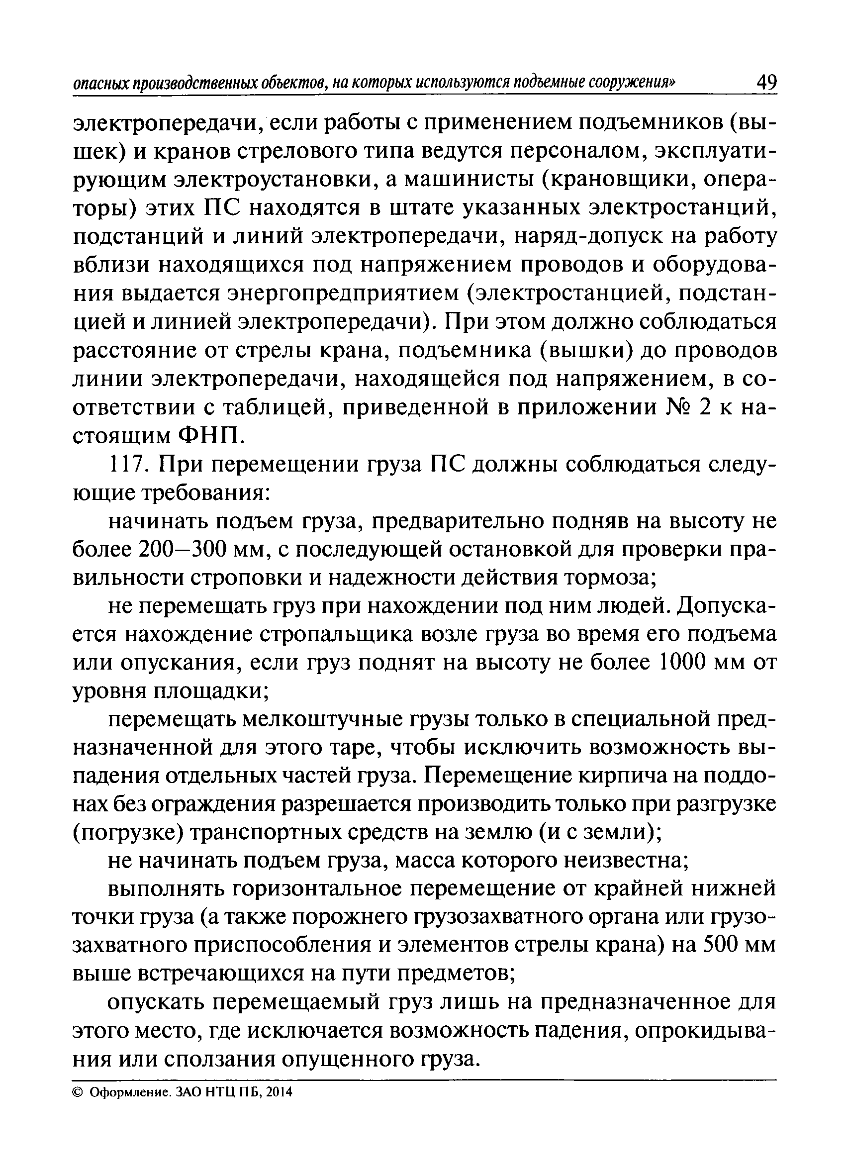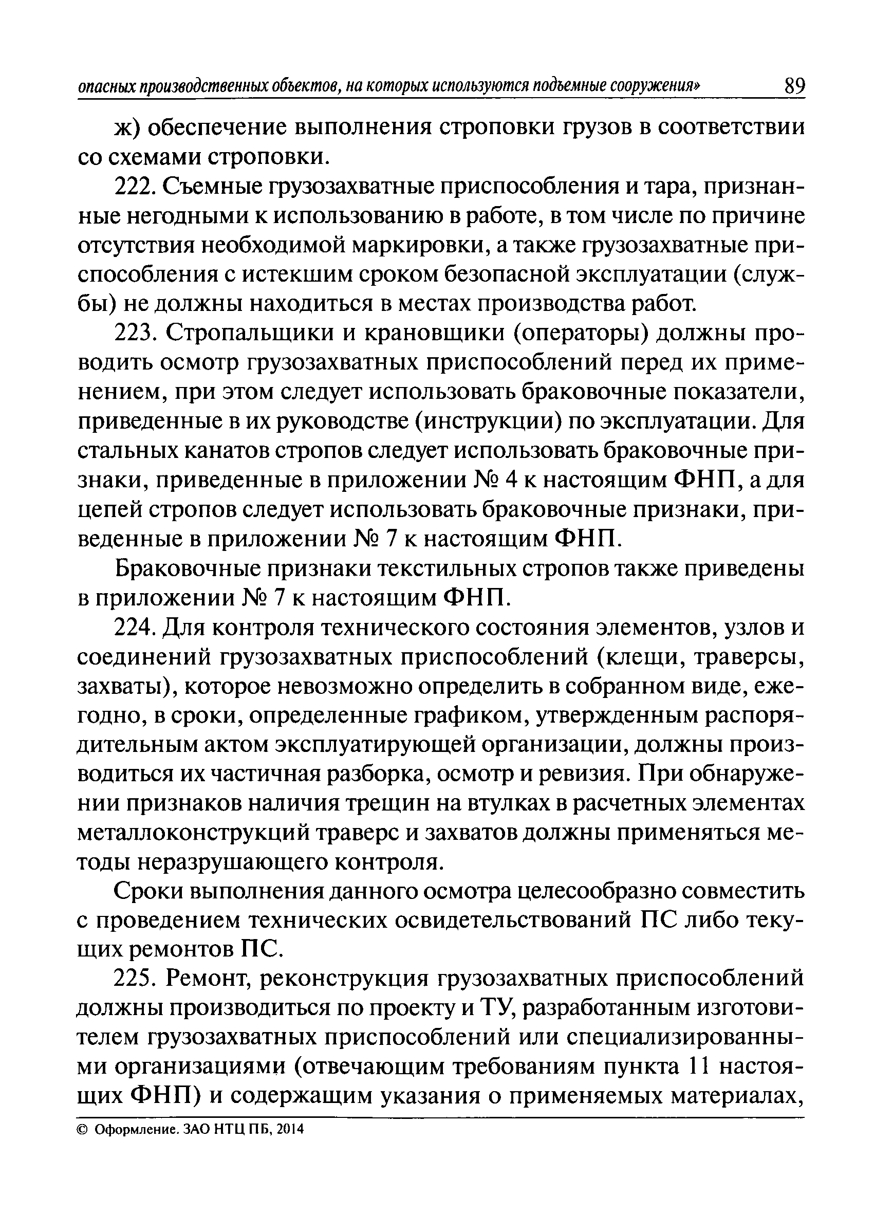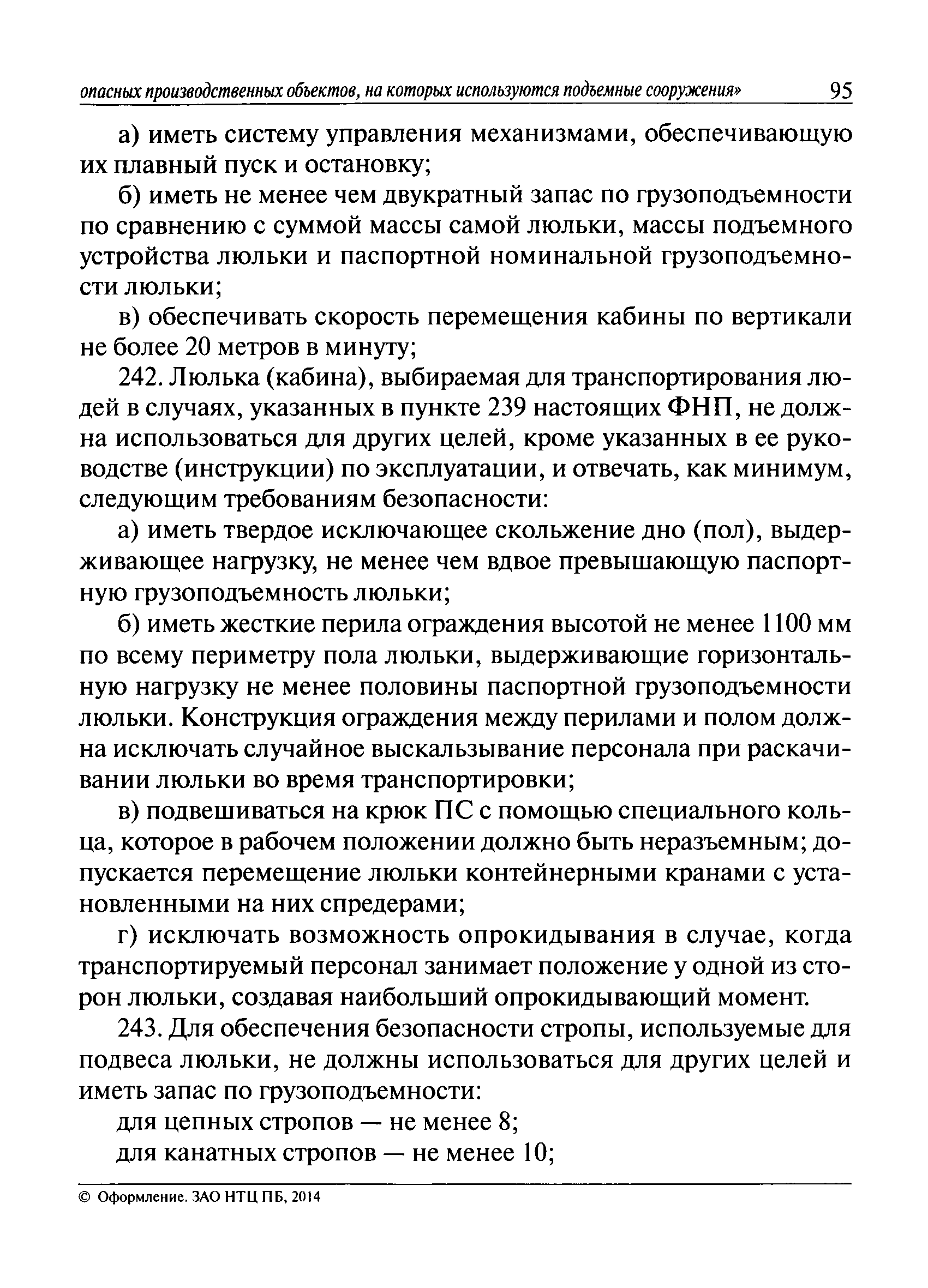 | Оглавление: | I. Общие положения II. Требования промышленной безопасности к организациям и работникам, осуществляющим монтаж, наладку, ремонт, реконструкцию или модернизацию ПС в процессе эксплуатации ОПО III. Требования промышленной безопасности к организациям и работникам ОПО, осуществляющим эксплуатацию ПС IV. Монтаж и наладка ПС (кроме ПС, смонтированных предприятием- изготовителем и полностью подготовленных к эксплуатации) V. Ремонт, реконструкция или модернизация ПС ОПО VI. Эксплуатация ПС ОПО VII. Оценка соответствия ПС, применяемых на ОПО и экспертиза их промышленной безопасности Приложение № 1 Термины и определения Приложение № 2 Уменьшение величины полезной грузоподъемности крана при оснащении его механизированным и/или электрифицированным грузозахватным приспособлением, в том числе моторным грейфером или электромагнитом. Приложение № 3 Нормы браковки элементов рельсовых путей опорных и подвесных подъемных сооружений Приложение № 4 Нормы браковки стальных канатов подъемных сооружений Приложение № 5 Порядок проведения испытаний стреловых кранов на грузовую устойчивость Приложение № 6 Определение группы классификации механизма подъемного сооружения Приложение № 7 Нормы браковки канатных и цепных стропов, а также текстильных стропов на полимерной основе. Приложение № 8 Предельные величины отклонений рельсового пути от проектного положения в плане и профиле Приложение № 9 Знаковая сигнализация, применяемая при работе подъемника (вышки) Приложение № 10 Знаковая сигнализация при перемещении грузов с применением ПС (кроме подъемников (вышек) Приложение № 11 Оценка работоспособности ограничителя или указателя опасного приближения к линии электропередач |