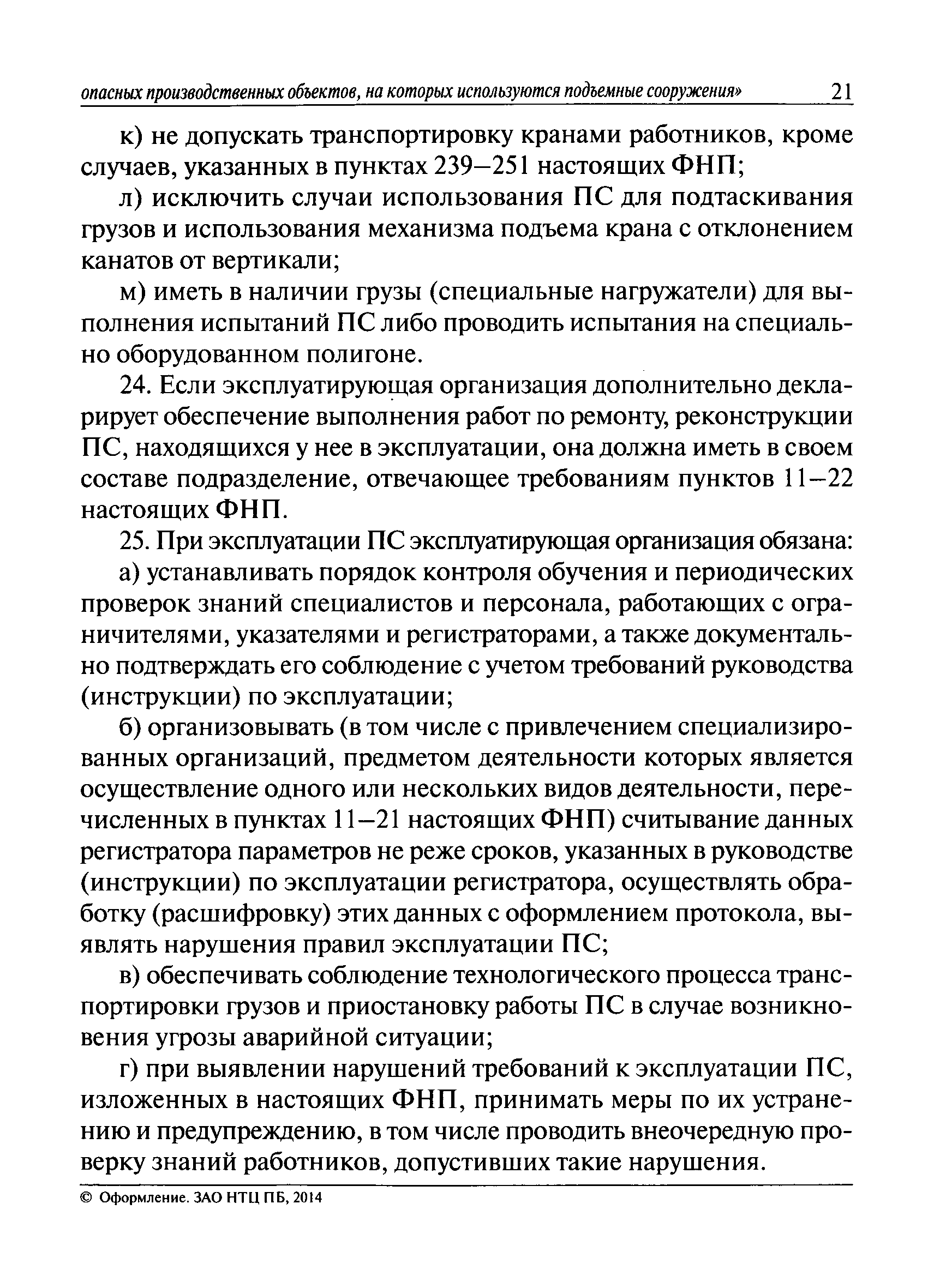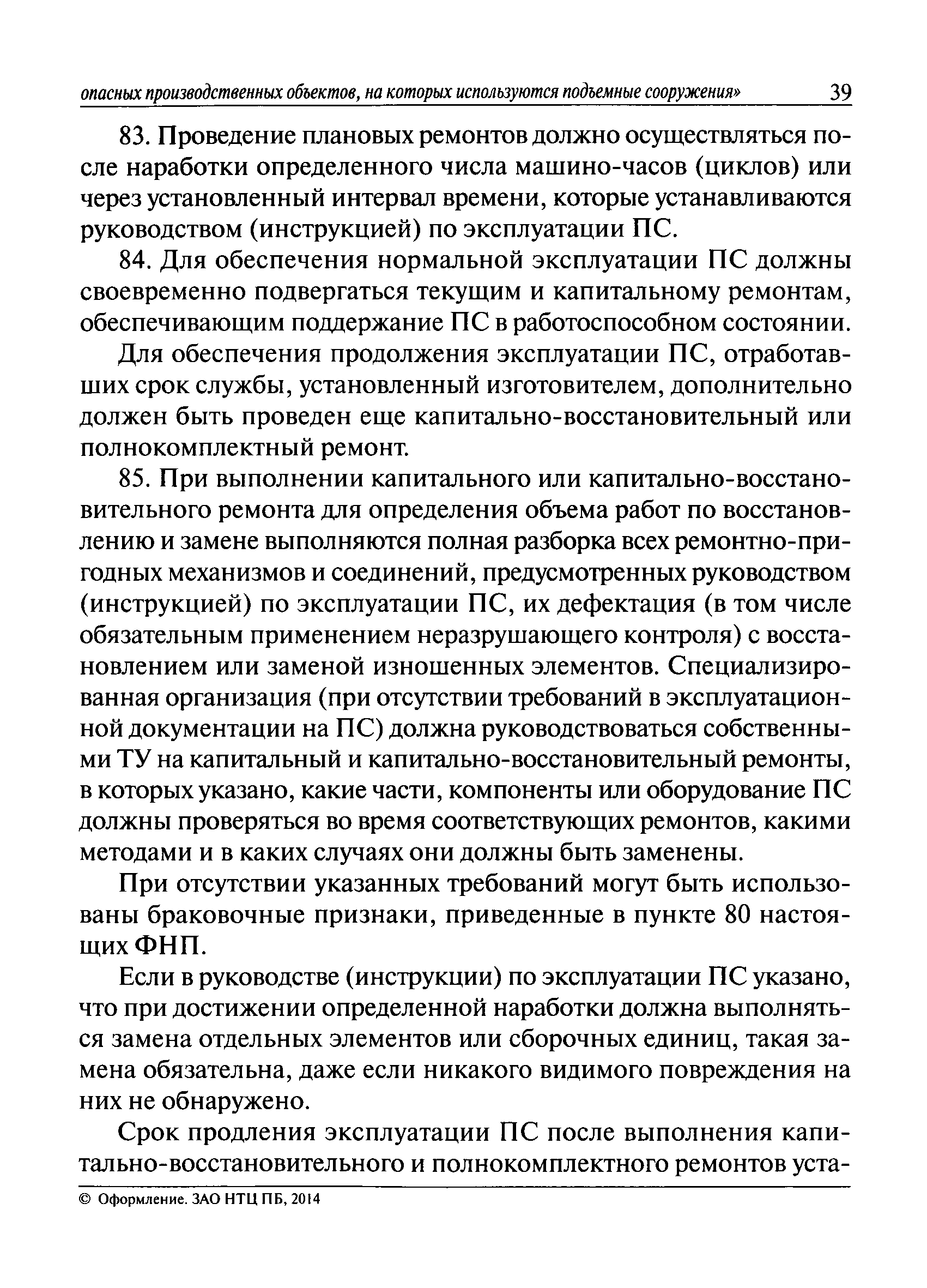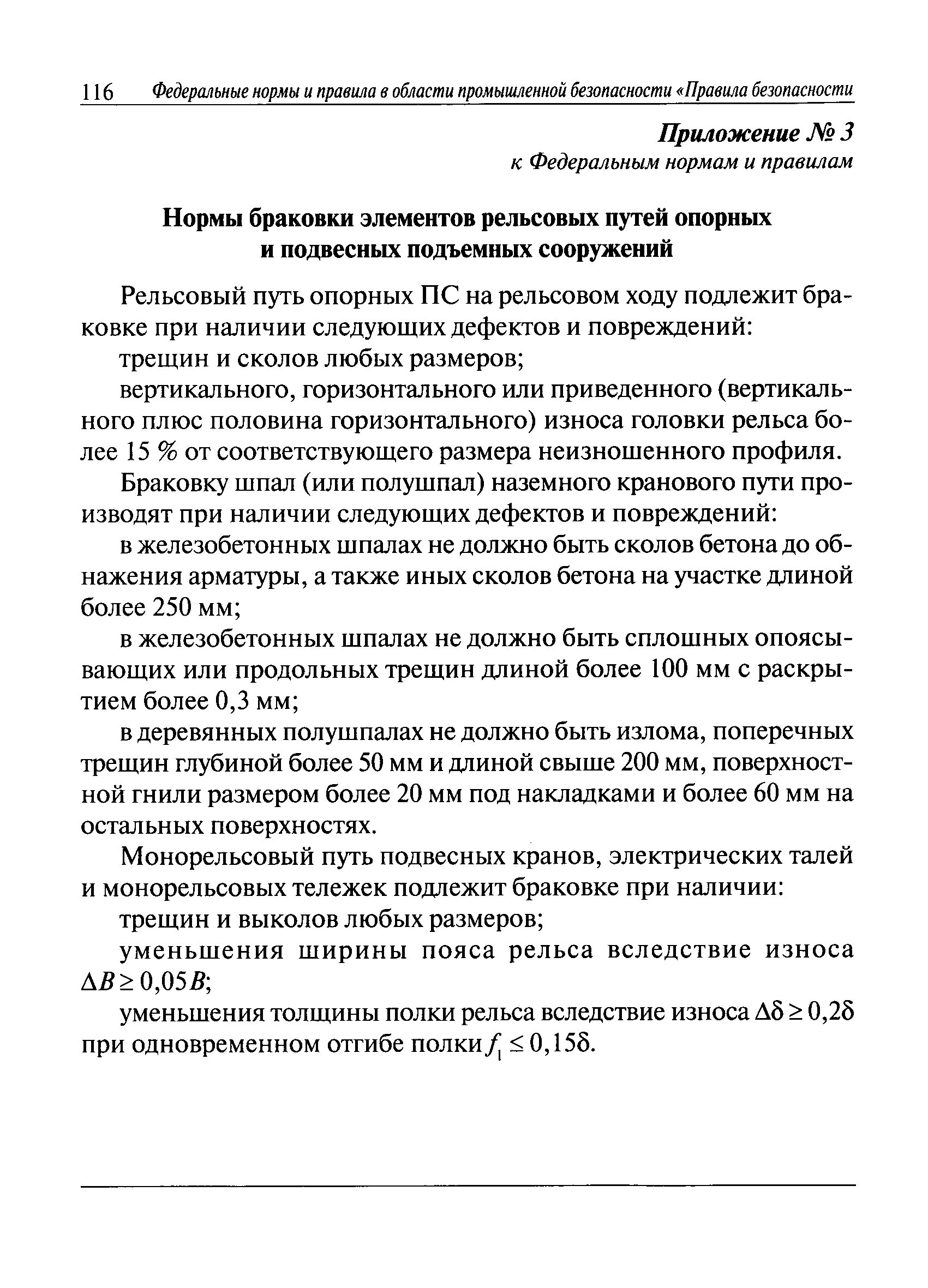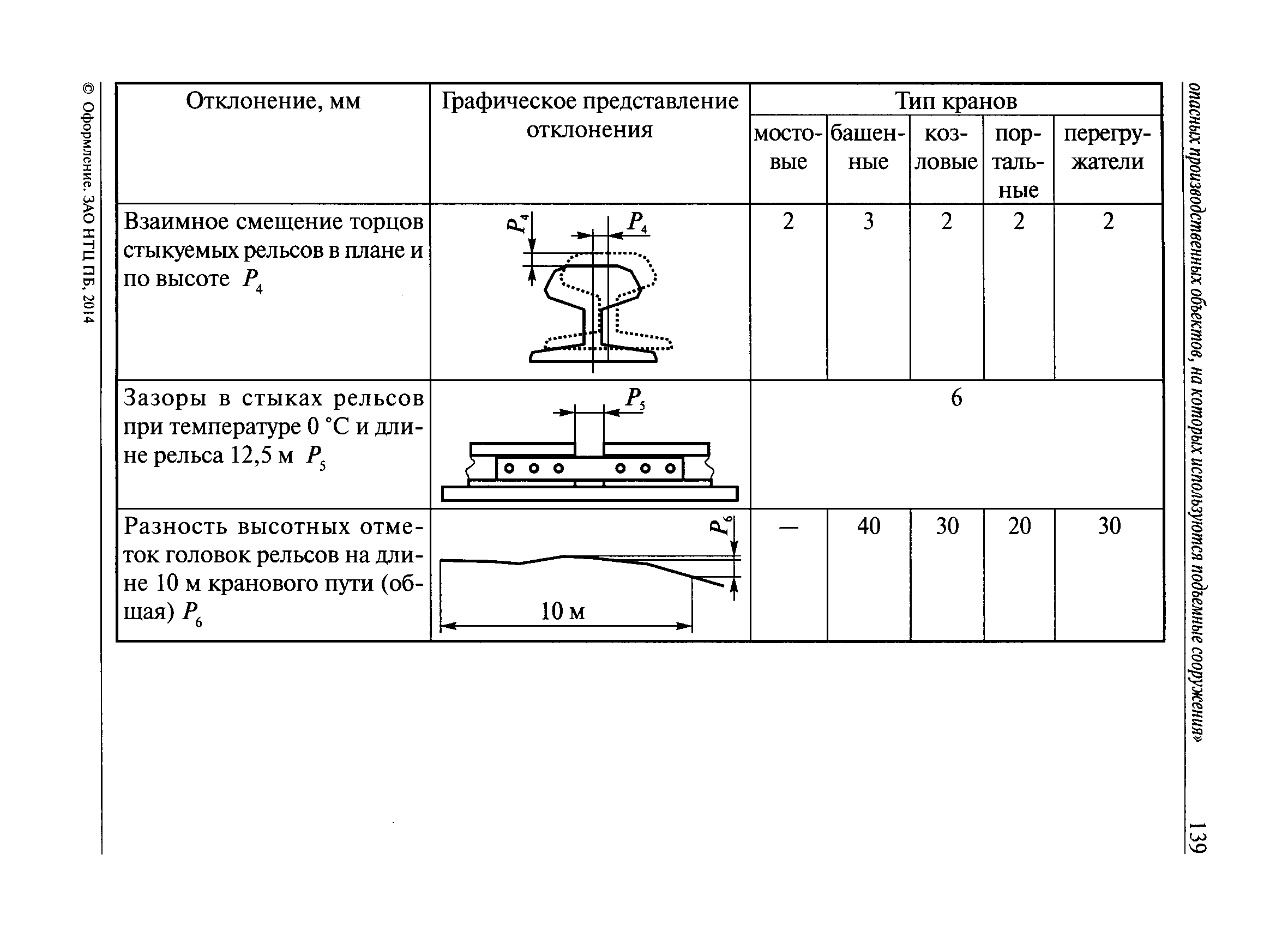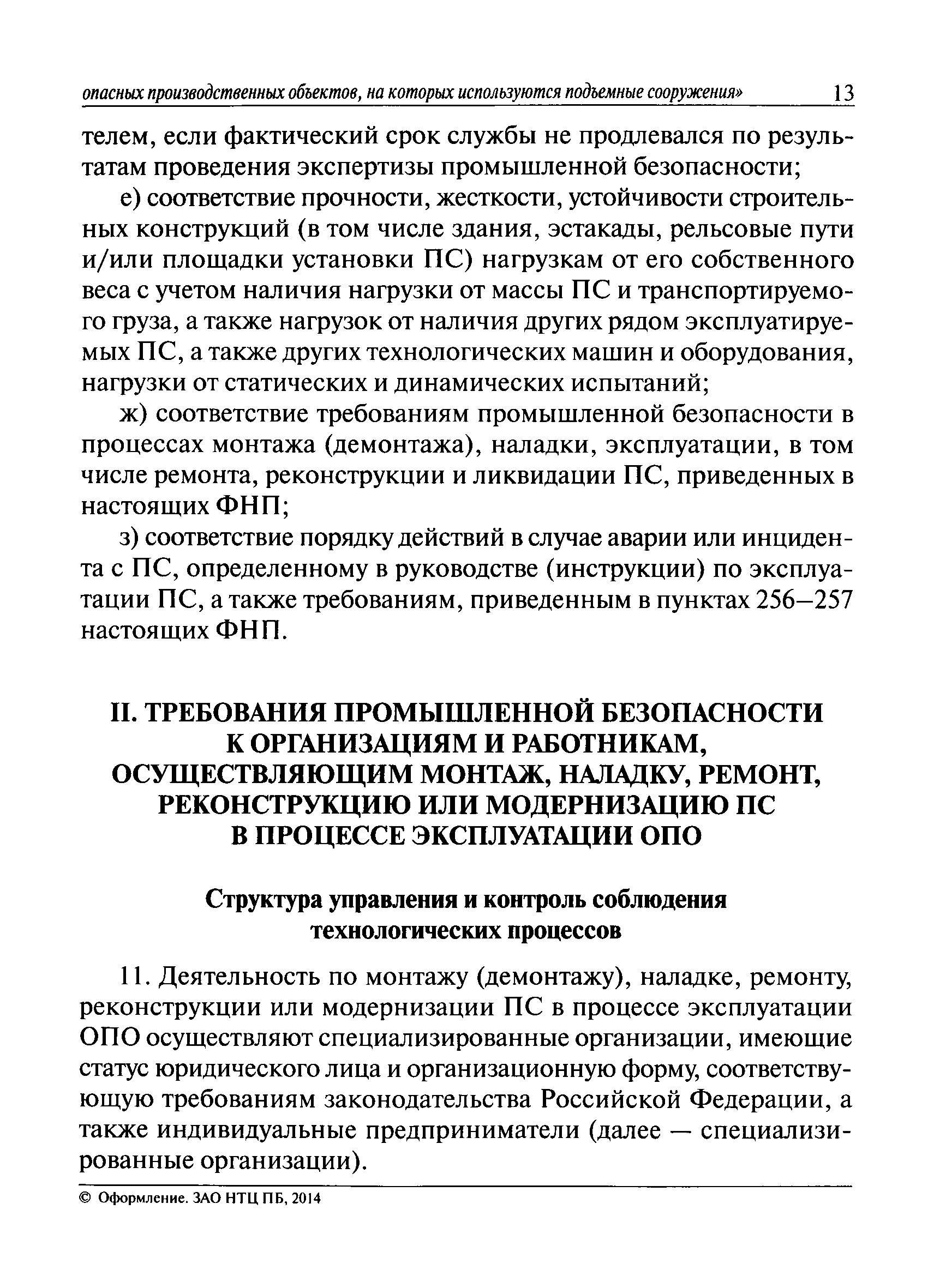 | Оглавление: | I. Общие положения II. Требования промышленной безопасности к организациям и работникам, осуществляющим монтаж, наладку, ремонт, реконструкцию или модернизацию ПС в процессе эксплуатации ОПО III. Требования промышленной безопасности к организациям и работникам ОПО, осуществляющим эксплуатацию ПС IV. Монтаж и наладка ПС (кроме ПС, смонтированных предприятием- изготовителем и полностью подготовленных к эксплуатации) V. Ремонт, реконструкция или модернизация ПС ОПО VI. Эксплуатация ПС ОПО VII. Оценка соответствия ПС, применяемых на ОПО и экспертиза их промышленной безопасности Приложение № 1 Термины и определения Приложение № 2 Уменьшение величины полезной грузоподъемности крана при оснащении его механизированным и/или электрифицированным грузозахватным приспособлением, в том числе моторным грейфером или электромагнитом. Приложение № 3 Нормы браковки элементов рельсовых путей опорных и подвесных подъемных сооружений Приложение № 4 Нормы браковки стальных канатов подъемных сооружений Приложение № 5 Порядок проведения испытаний стреловых кранов на грузовую устойчивость Приложение № 6 Определение группы классификации механизма подъемного сооружения Приложение № 7 Нормы браковки канатных и цепных стропов, а также текстильных стропов на полимерной основе. Приложение № 8 Предельные величины отклонений рельсового пути от проектного положения в плане и профиле Приложение № 9 Знаковая сигнализация, применяемая при работе подъемника (вышки) Приложение № 10 Знаковая сигнализация при перемещении грузов с применением ПС (кроме подъемников (вышек) Приложение № 11 Оценка работоспособности ограничителя или указателя опасного приближения к линии электропередач |