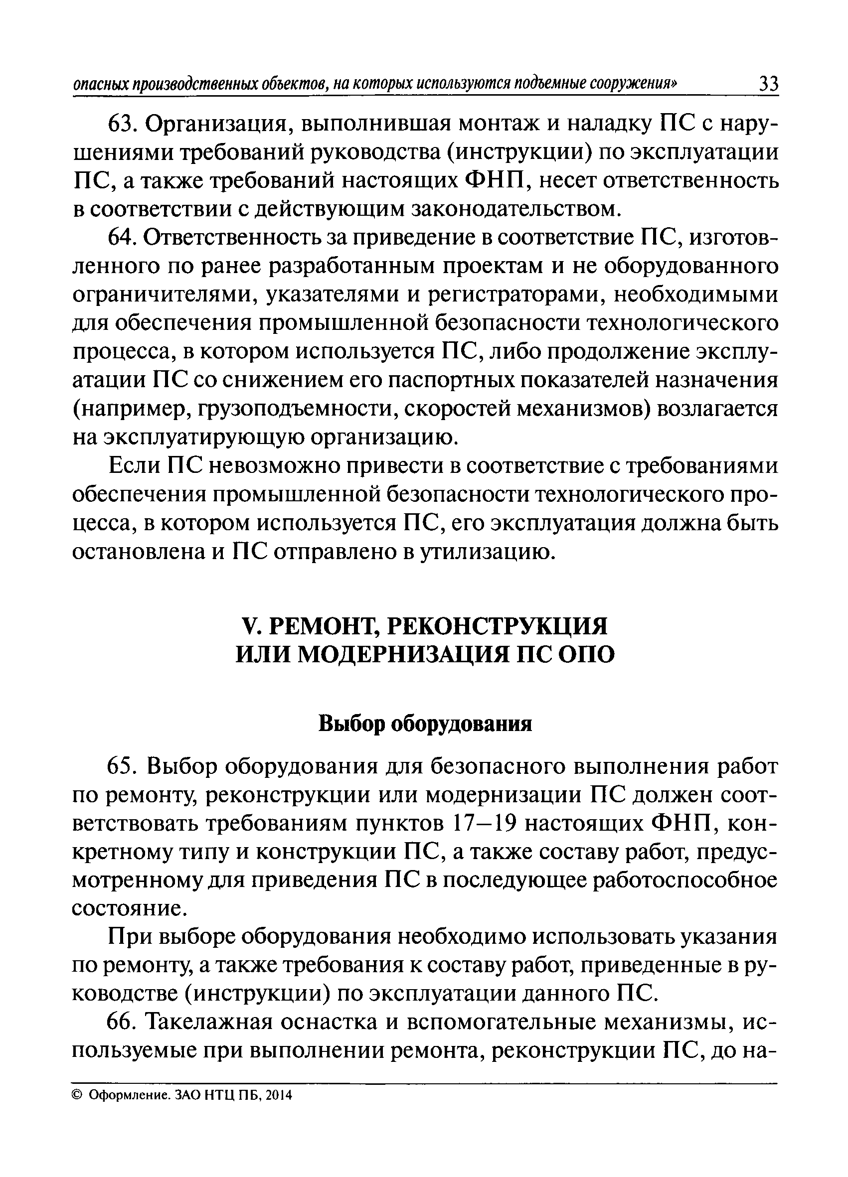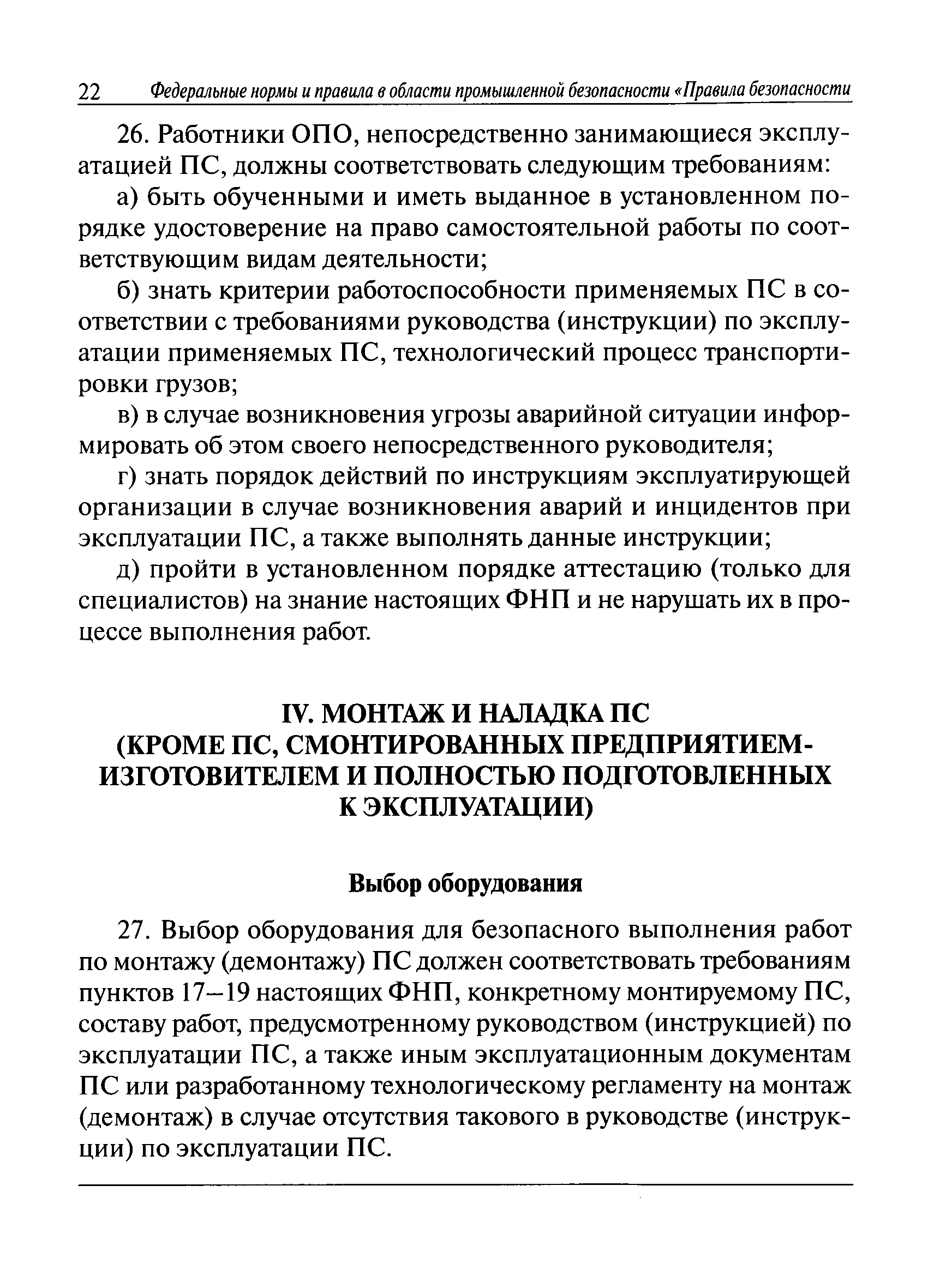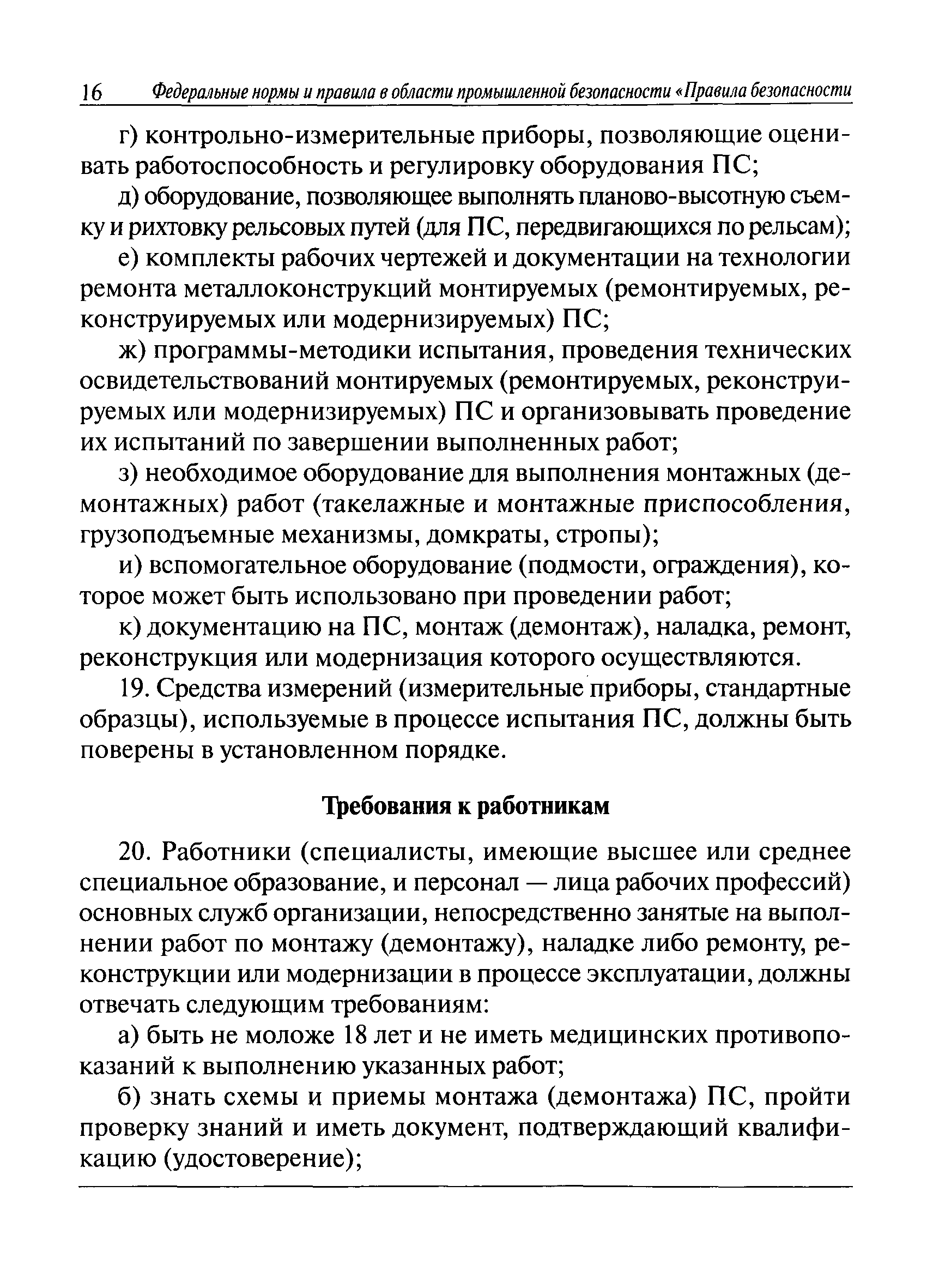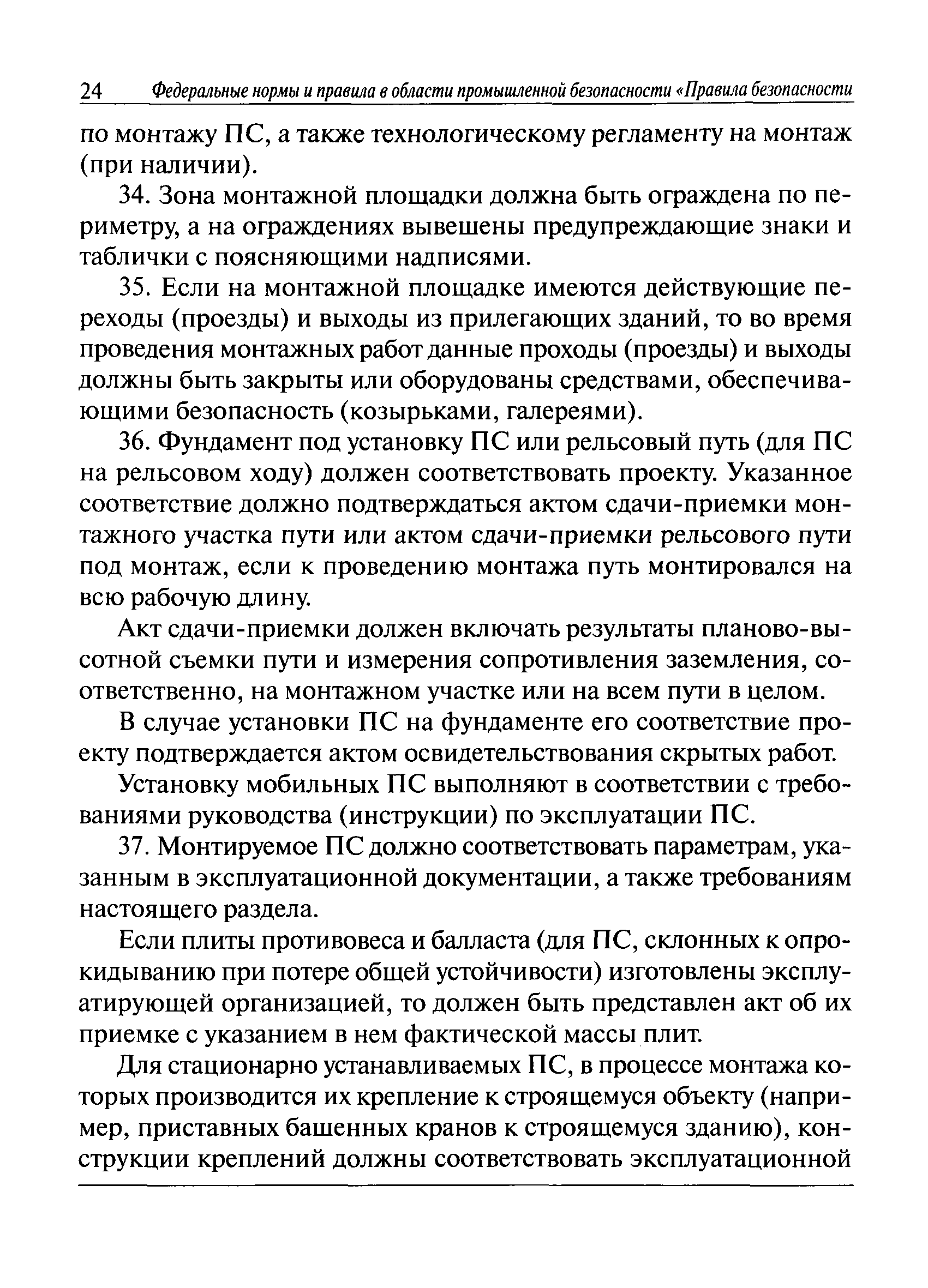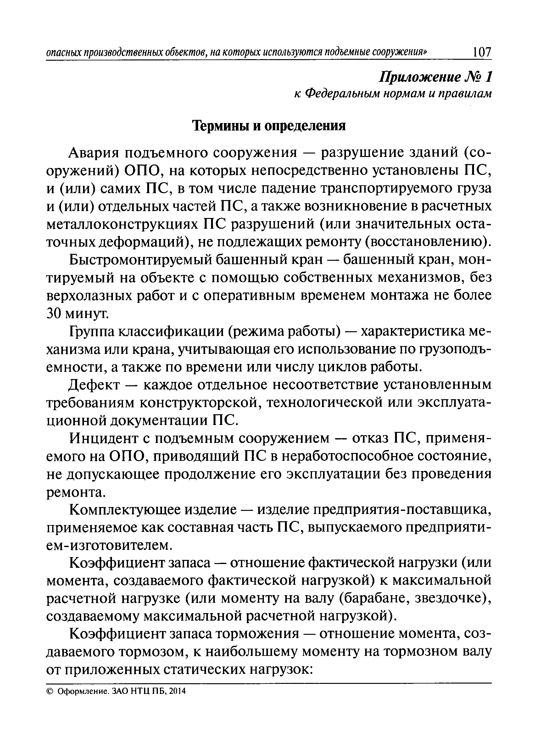 | Оглавление: | I. Общие положения II. Требования промышленной безопасности к организациям и работникам, осуществляющим монтаж, наладку, ремонт, реконструкцию или модернизацию ПС в процессе эксплуатации ОПО III. Требования промышленной безопасности к организациям и работникам ОПО, осуществляющим эксплуатацию ПС IV. Монтаж и наладка ПС (кроме ПС, смонтированных предприятием- изготовителем и полностью подготовленных к эксплуатации) V. Ремонт, реконструкция или модернизация ПС ОПО VI. Эксплуатация ПС ОПО VII. Оценка соответствия ПС, применяемых на ОПО и экспертиза их промышленной безопасности Приложение № 1 Термины и определения Приложение № 2 Уменьшение величины полезной грузоподъемности крана при оснащении его механизированным и/или электрифицированным грузозахватным приспособлением, в том числе моторным грейфером или электромагнитом. Приложение № 3 Нормы браковки элементов рельсовых путей опорных и подвесных подъемных сооружений Приложение № 4 Нормы браковки стальных канатов подъемных сооружений Приложение № 5 Порядок проведения испытаний стреловых кранов на грузовую устойчивость Приложение № 6 Определение группы классификации механизма подъемного сооружения Приложение № 7 Нормы браковки канатных и цепных стропов, а также текстильных стропов на полимерной основе. Приложение № 8 Предельные величины отклонений рельсового пути от проектного положения в плане и профиле Приложение № 9 Знаковая сигнализация, применяемая при работе подъемника (вышки) Приложение № 10 Знаковая сигнализация при перемещении грузов с применением ПС (кроме подъемников (вышек) Приложение № 11 Оценка работоспособности ограничителя или указателя опасного приближения к линии электропередач |