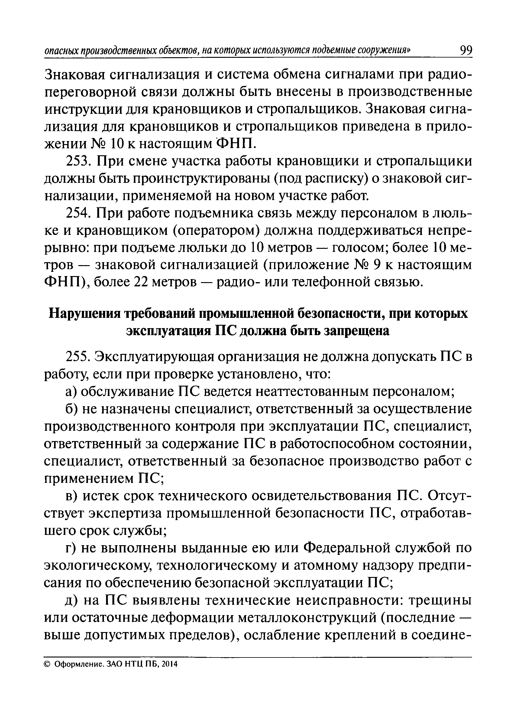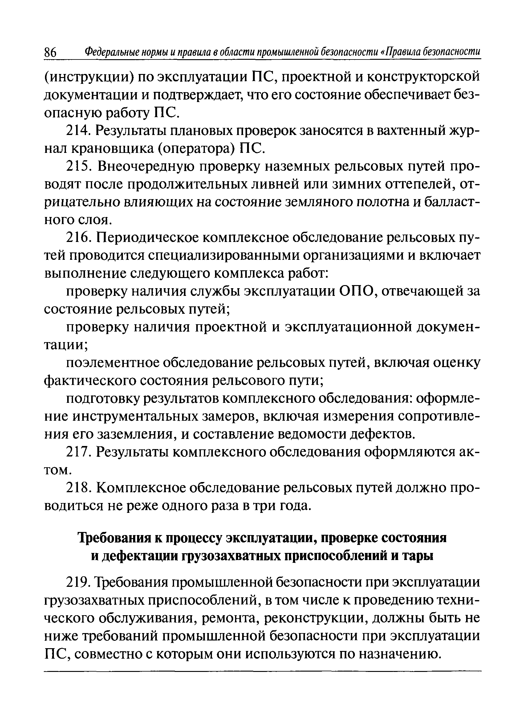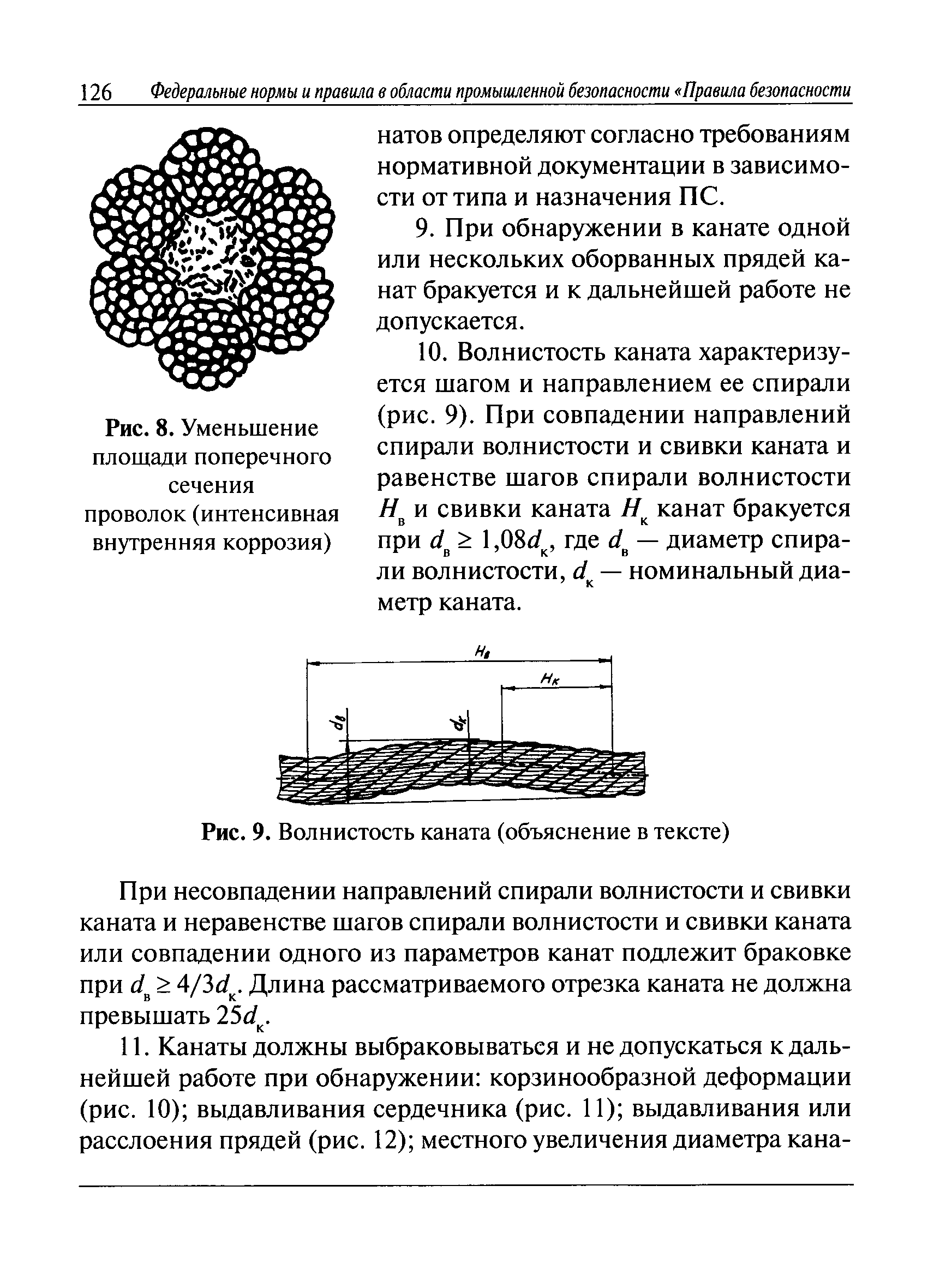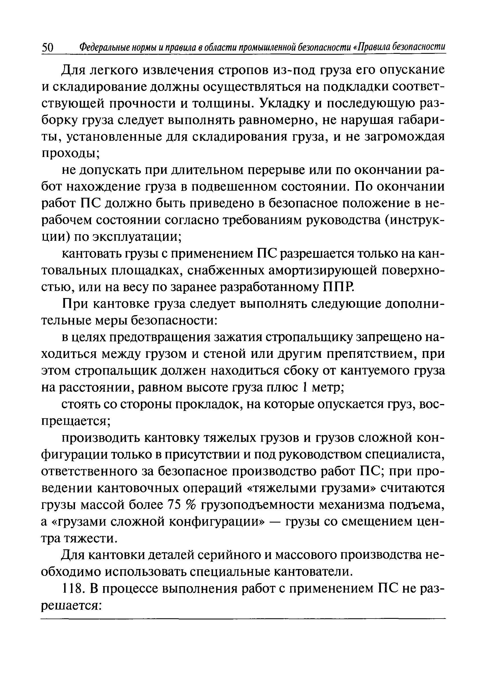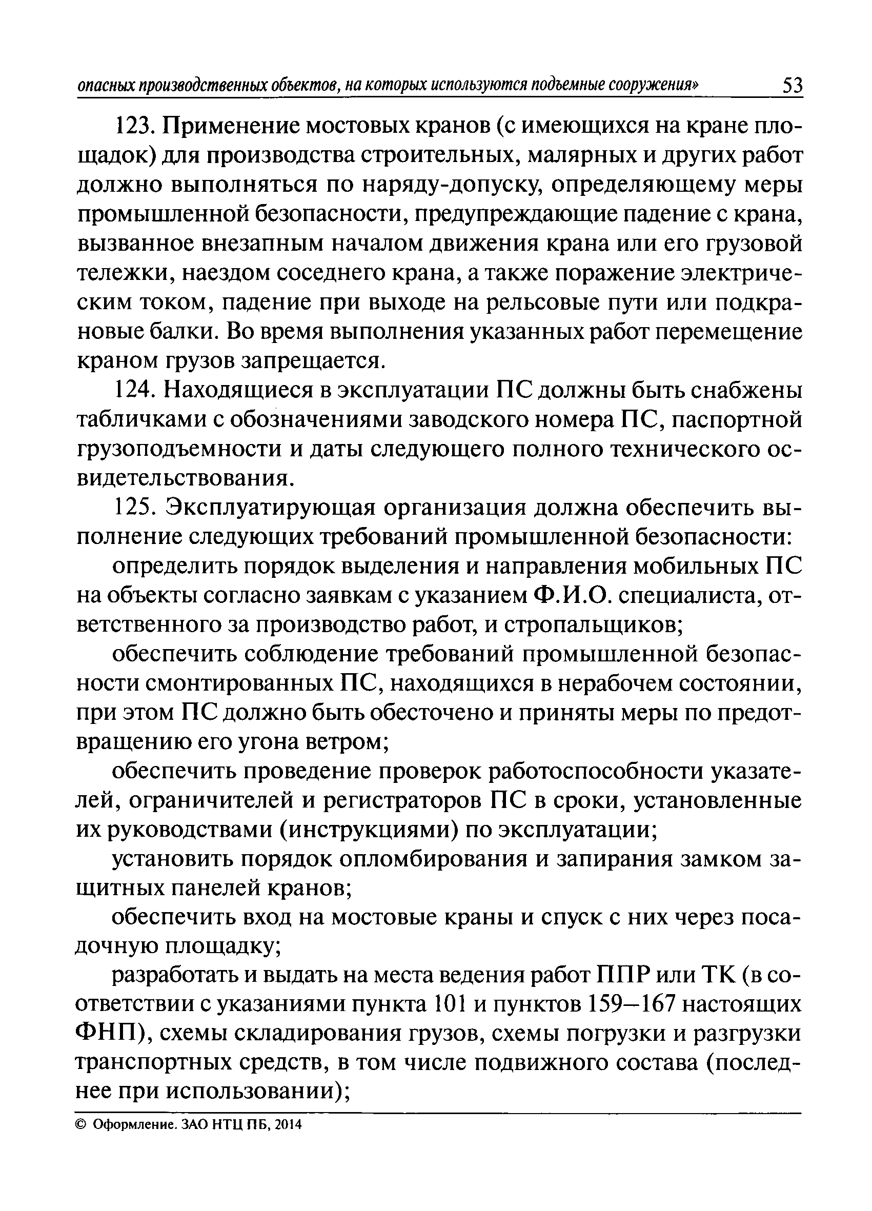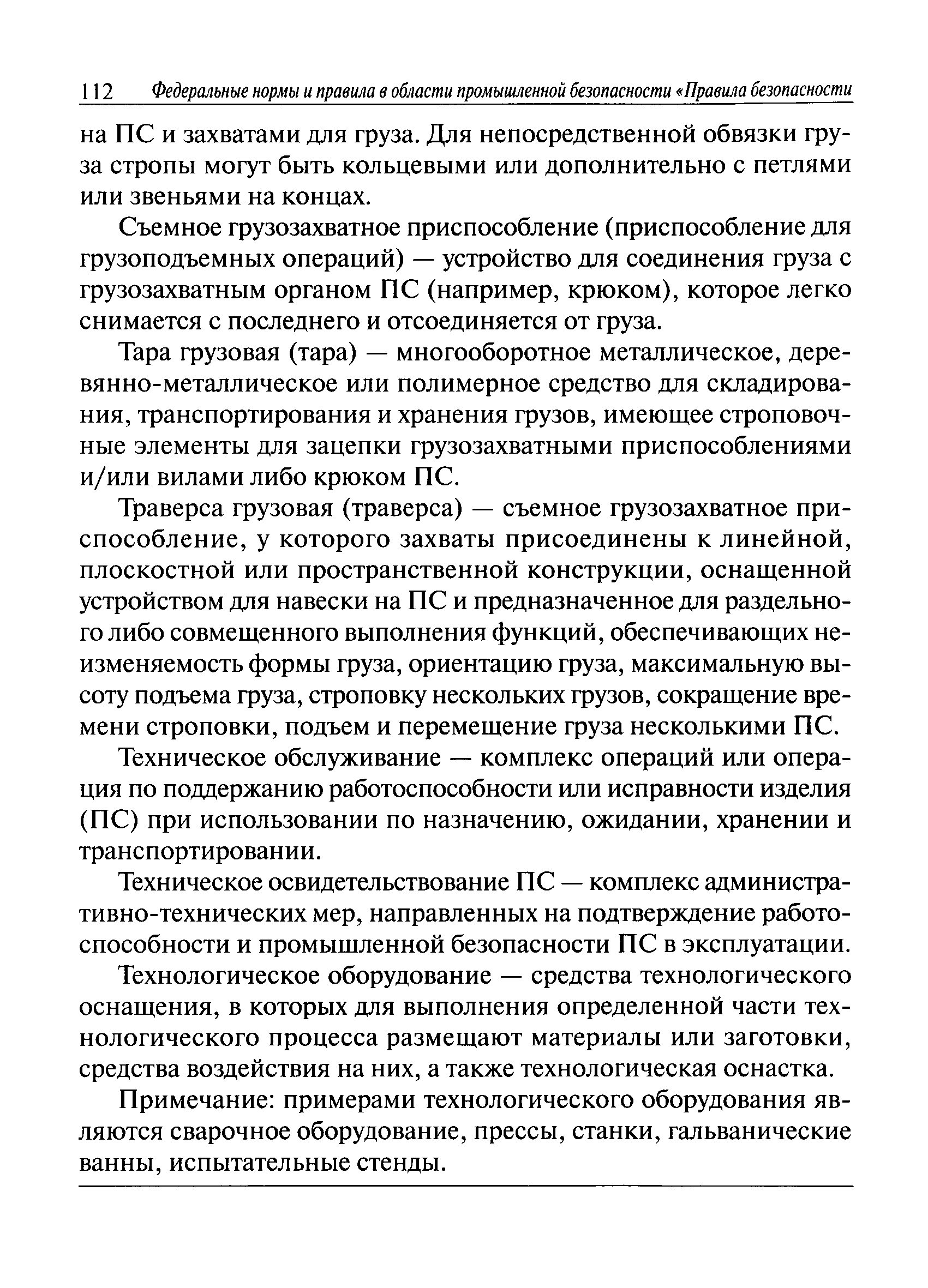 | Оглавление: | I. Общие положения II. Требования промышленной безопасности к организациям и работникам, осуществляющим монтаж, наладку, ремонт, реконструкцию или модернизацию ПС в процессе эксплуатации ОПО III. Требования промышленной безопасности к организациям и работникам ОПО, осуществляющим эксплуатацию ПС IV. Монтаж и наладка ПС (кроме ПС, смонтированных предприятием- изготовителем и полностью подготовленных к эксплуатации) V. Ремонт, реконструкция или модернизация ПС ОПО VI. Эксплуатация ПС ОПО VII. Оценка соответствия ПС, применяемых на ОПО и экспертиза их промышленной безопасности Приложение № 1 Термины и определения Приложение № 2 Уменьшение величины полезной грузоподъемности крана при оснащении его механизированным и/или электрифицированным грузозахватным приспособлением, в том числе моторным грейфером или электромагнитом. Приложение № 3 Нормы браковки элементов рельсовых путей опорных и подвесных подъемных сооружений Приложение № 4 Нормы браковки стальных канатов подъемных сооружений Приложение № 5 Порядок проведения испытаний стреловых кранов на грузовую устойчивость Приложение № 6 Определение группы классификации механизма подъемного сооружения Приложение № 7 Нормы браковки канатных и цепных стропов, а также текстильных стропов на полимерной основе. Приложение № 8 Предельные величины отклонений рельсового пути от проектного положения в плане и профиле Приложение № 9 Знаковая сигнализация, применяемая при работе подъемника (вышки) Приложение № 10 Знаковая сигнализация при перемещении грузов с применением ПС (кроме подъемников (вышек) Приложение № 11 Оценка работоспособности ограничителя или указателя опасного приближения к линии электропередач |
