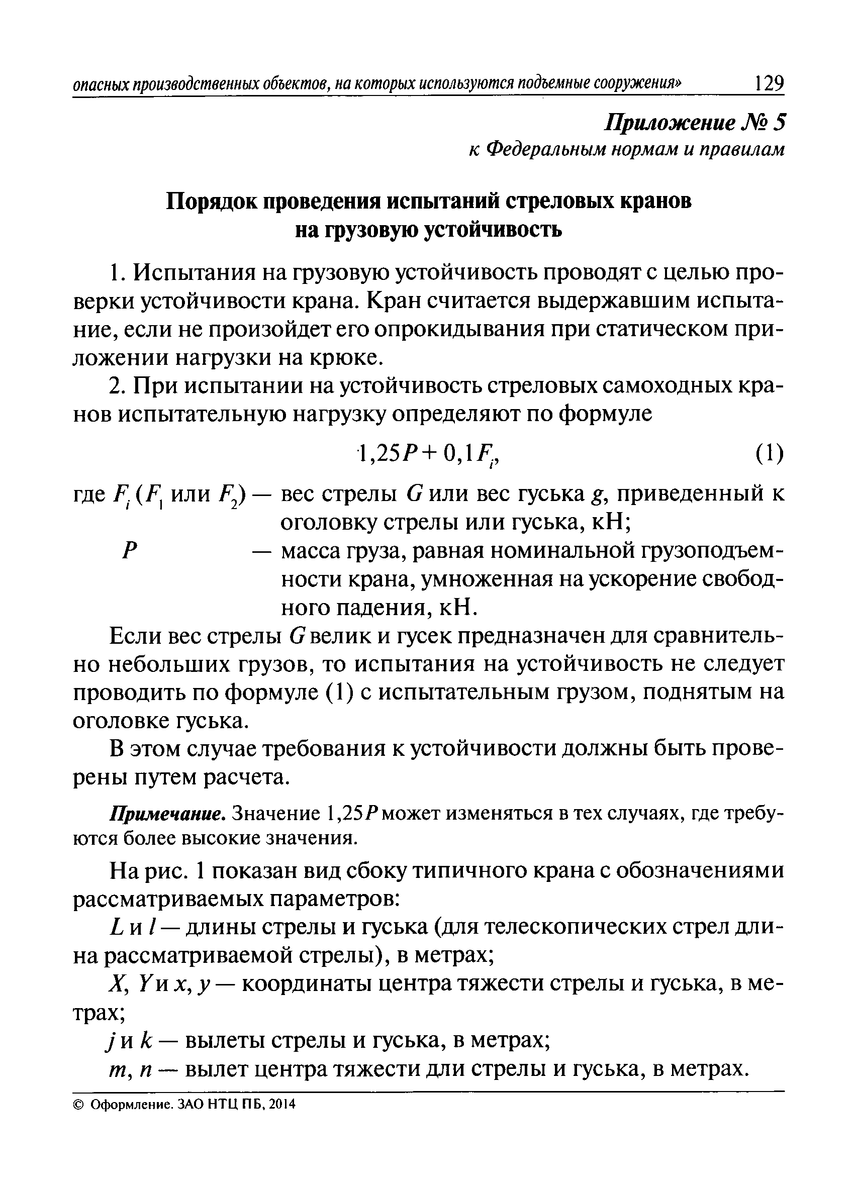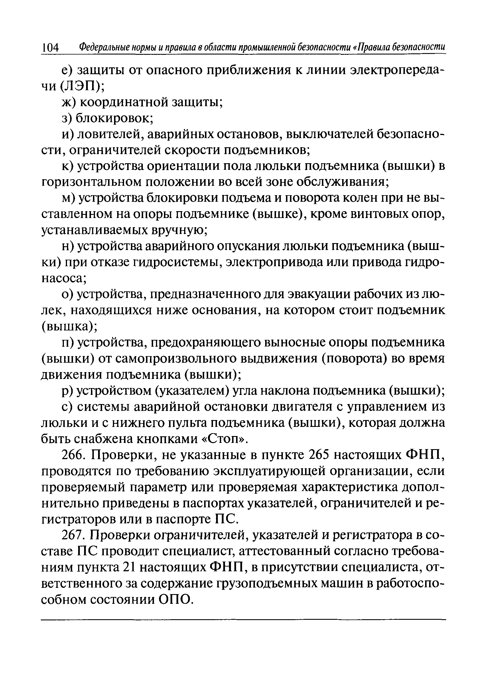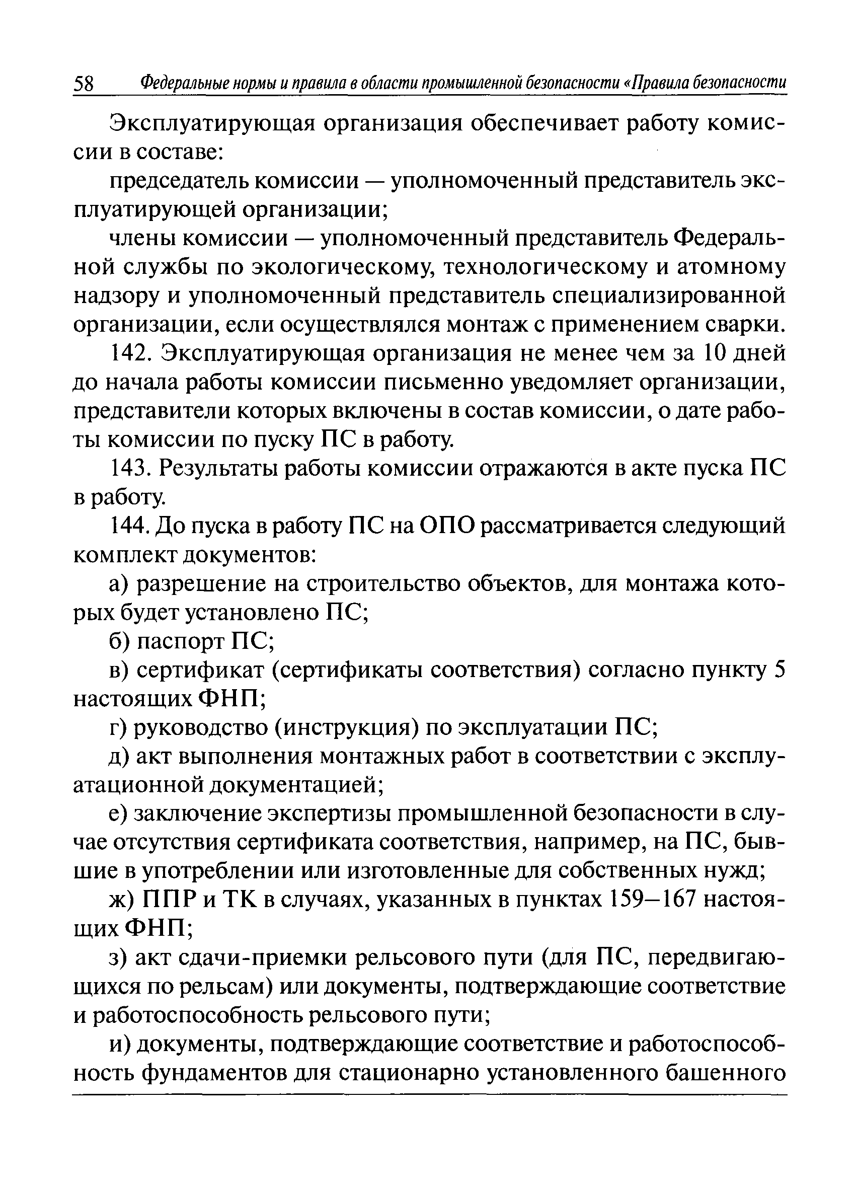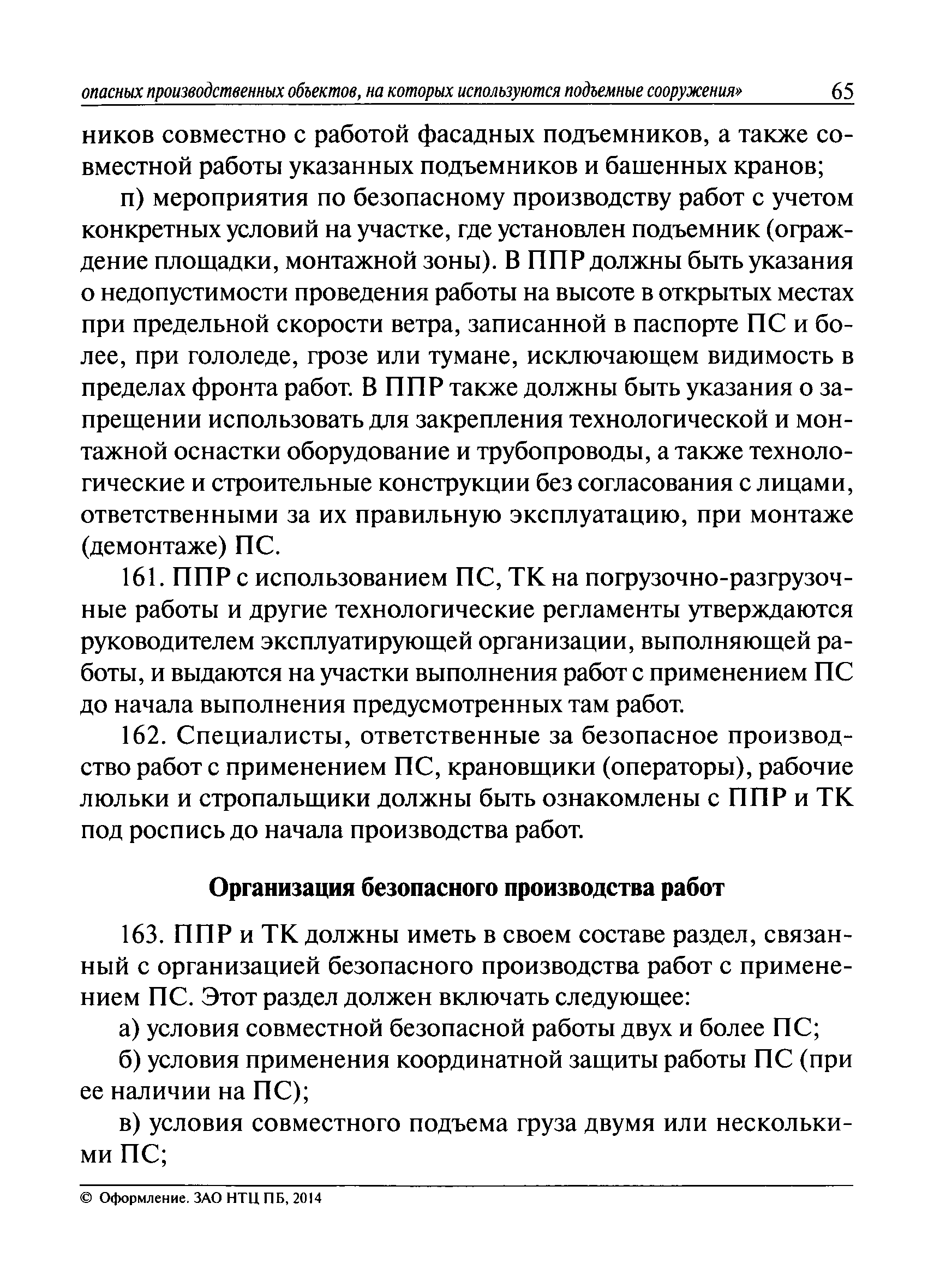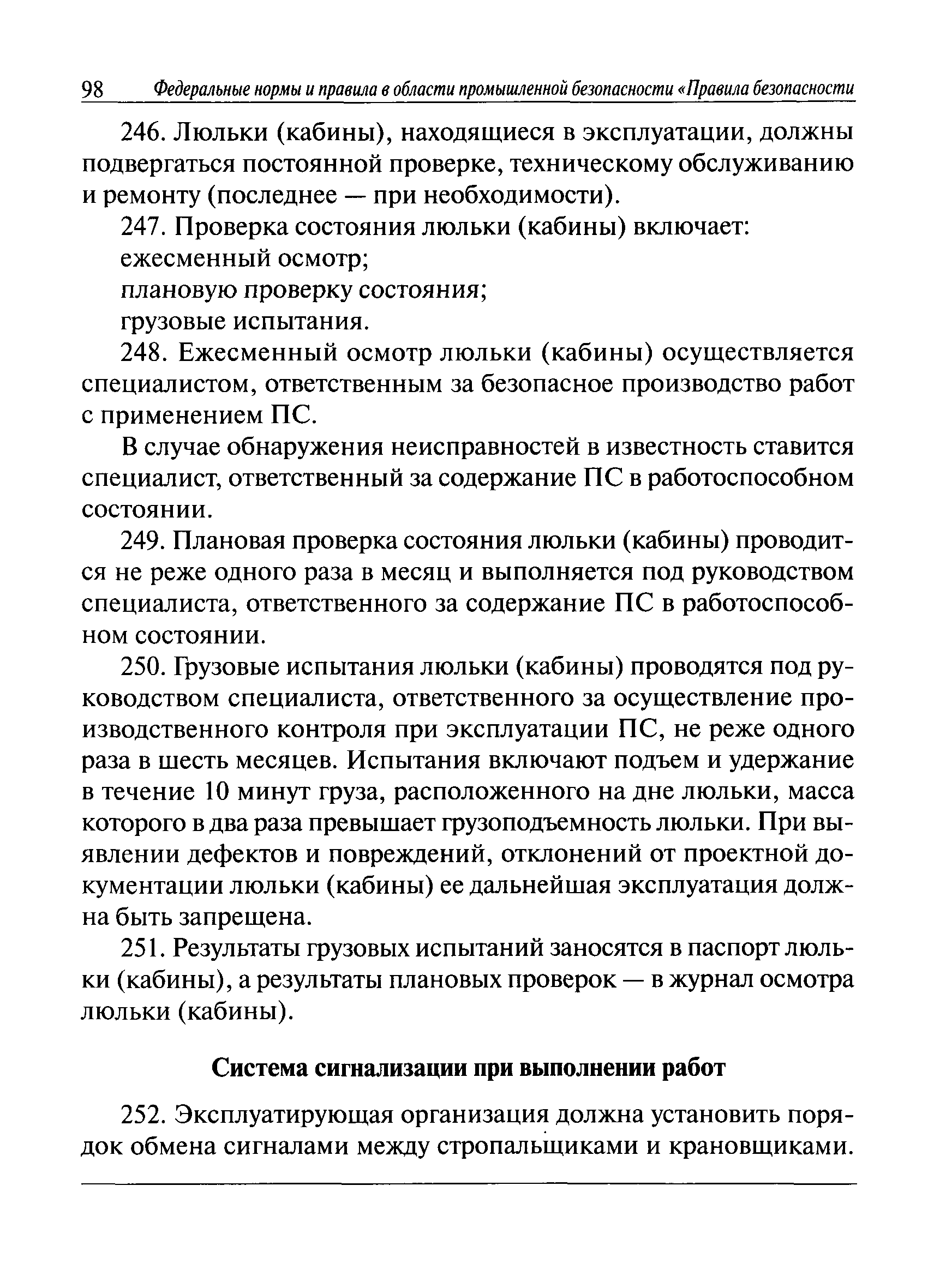| Оглавление: | I. Общие положения II. Требования промышленной безопасности к организациям и работникам, осуществляющим монтаж, наладку, ремонт, реконструкцию или модернизацию ПС в процессе эксплуатации ОПО III. Требования промышленной безопасности к организациям и работникам ОПО, осуществляющим эксплуатацию ПС IV. Монтаж и наладка ПС (кроме ПС, смонтированных предприятием- изготовителем и полностью подготовленных к эксплуатации) V. Ремонт, реконструкция или модернизация ПС ОПО VI. Эксплуатация ПС ОПО VII. Оценка соответствия ПС, применяемых на ОПО и экспертиза их промышленной безопасности Приложение № 1 Термины и определения Приложение № 2 Уменьшение величины полезной грузоподъемности крана при оснащении его механизированным и/или электрифицированным грузозахватным приспособлением, в том числе моторным грейфером или электромагнитом. Приложение № 3 Нормы браковки элементов рельсовых путей опорных и подвесных подъемных сооружений Приложение № 4 Нормы браковки стальных канатов подъемных сооружений Приложение № 5 Порядок проведения испытаний стреловых кранов на грузовую устойчивость Приложение № 6 Определение группы классификации механизма подъемного сооружения Приложение № 7 Нормы браковки канатных и цепных стропов, а также текстильных стропов на полимерной основе. Приложение № 8 Предельные величины отклонений рельсового пути от проектного положения в плане и профиле Приложение № 9 Знаковая сигнализация, применяемая при работе подъемника (вышки) Приложение № 10 Знаковая сигнализация при перемещении грузов с применением ПС (кроме подъемников (вышек) Приложение № 11 Оценка работоспособности ограничителя или указателя опасного приближения к линии электропередач |