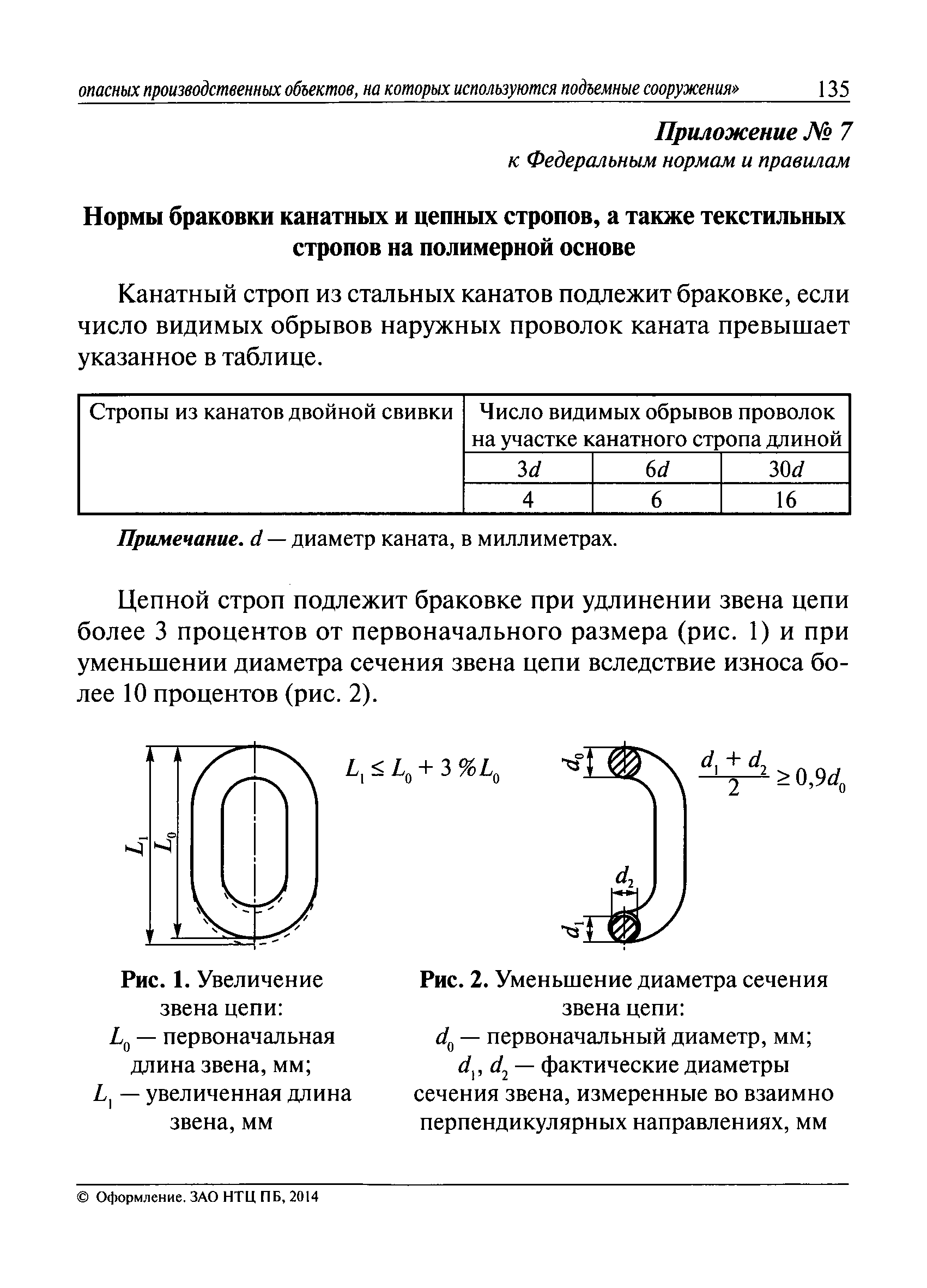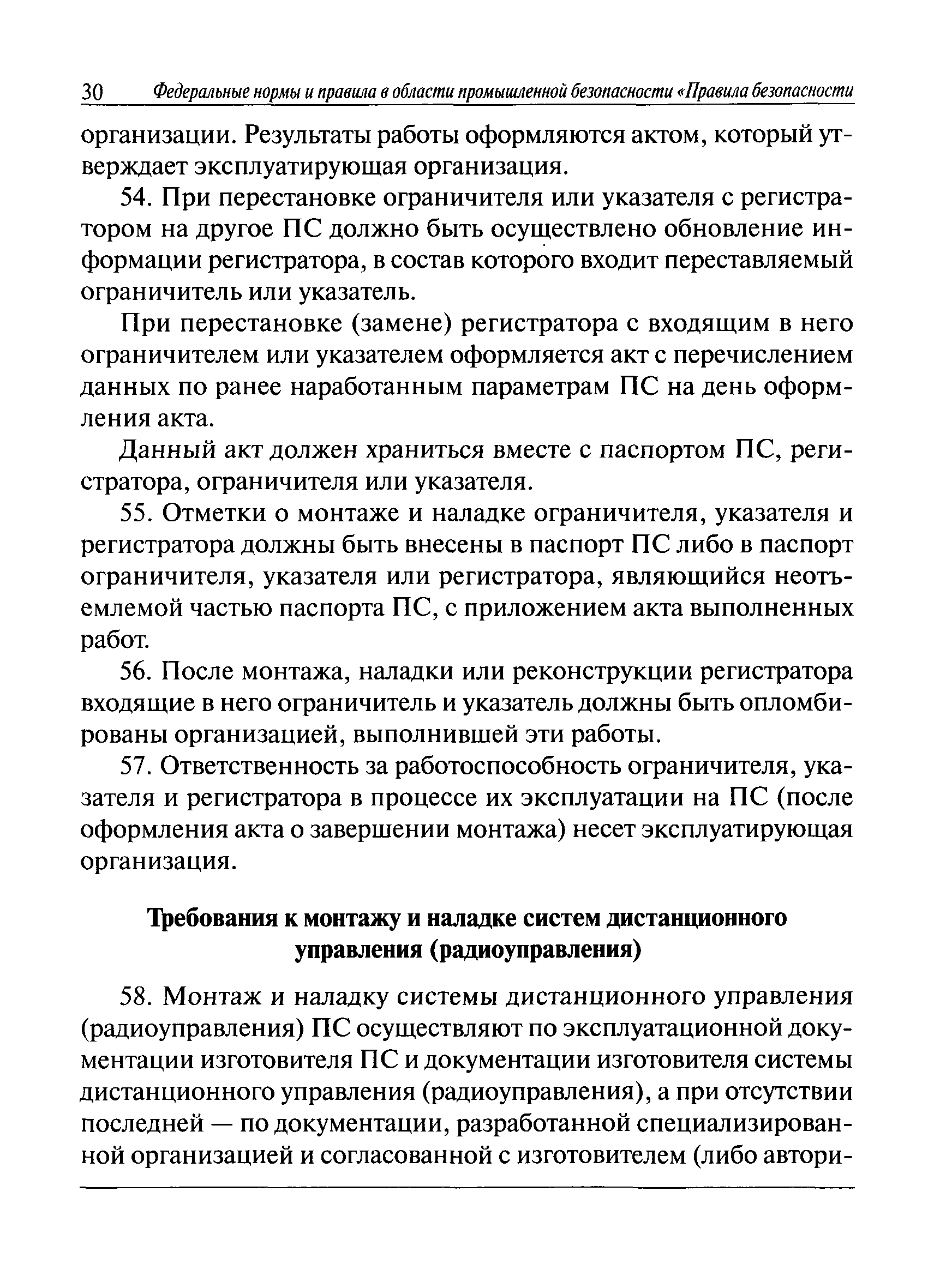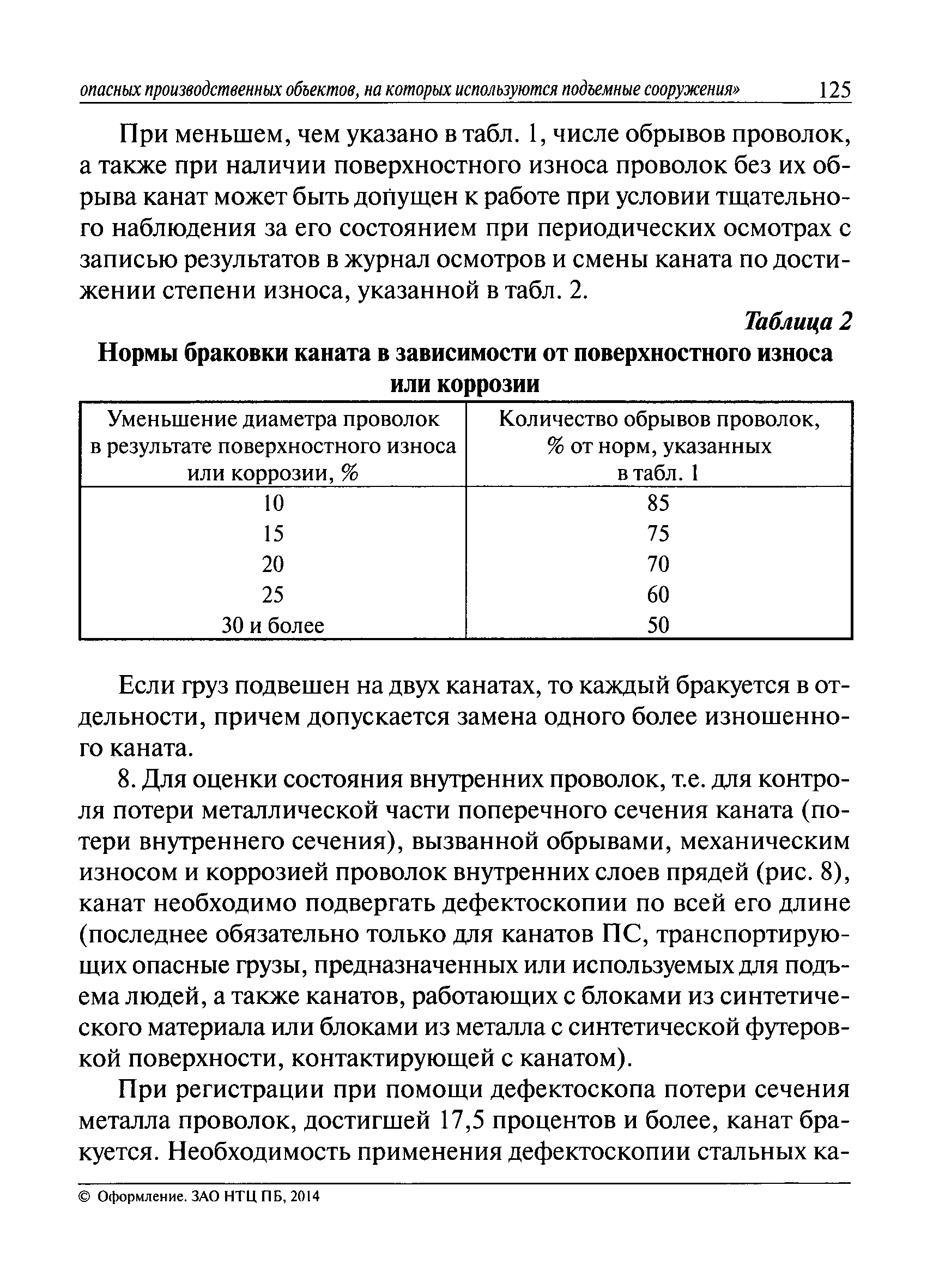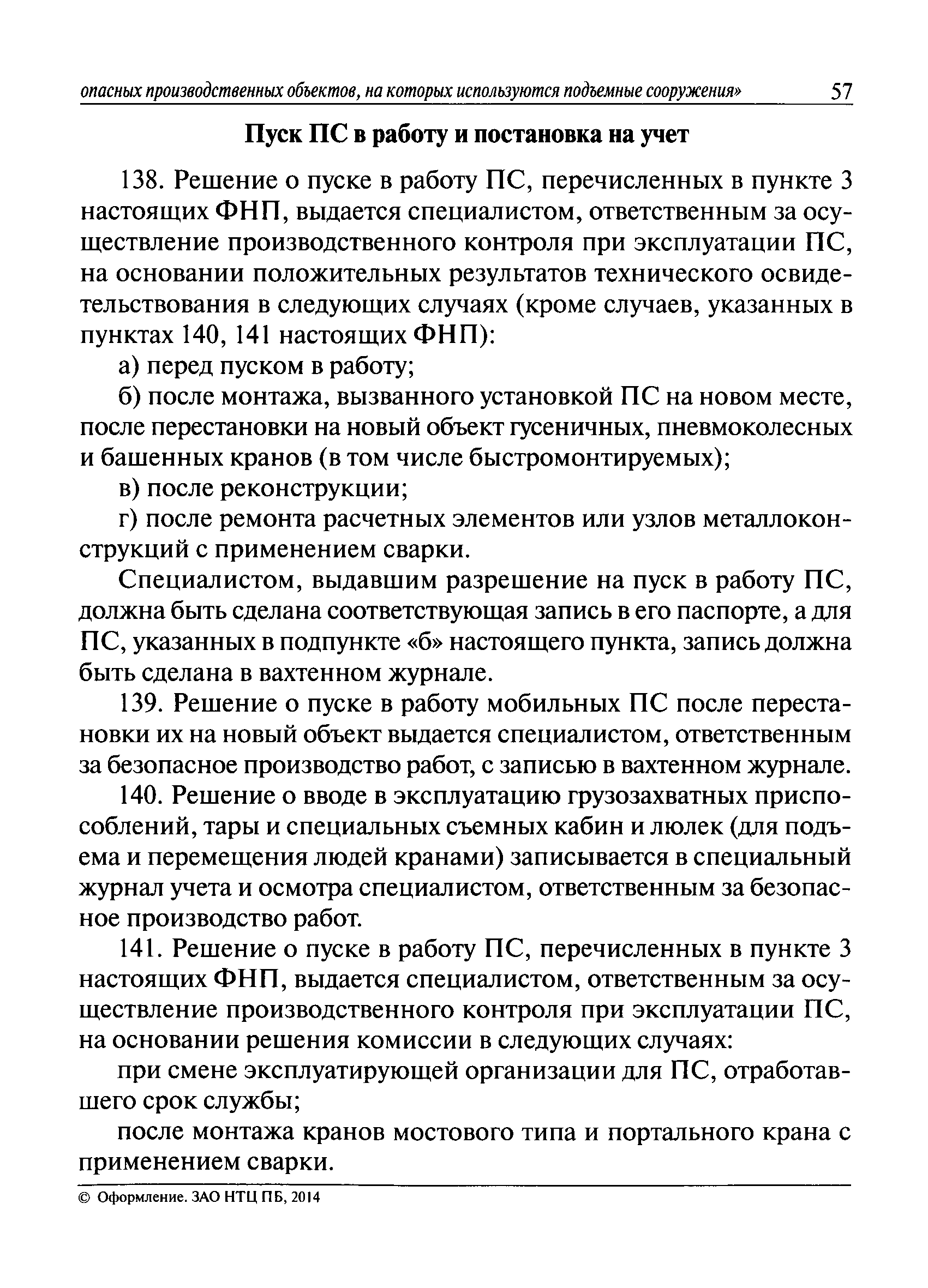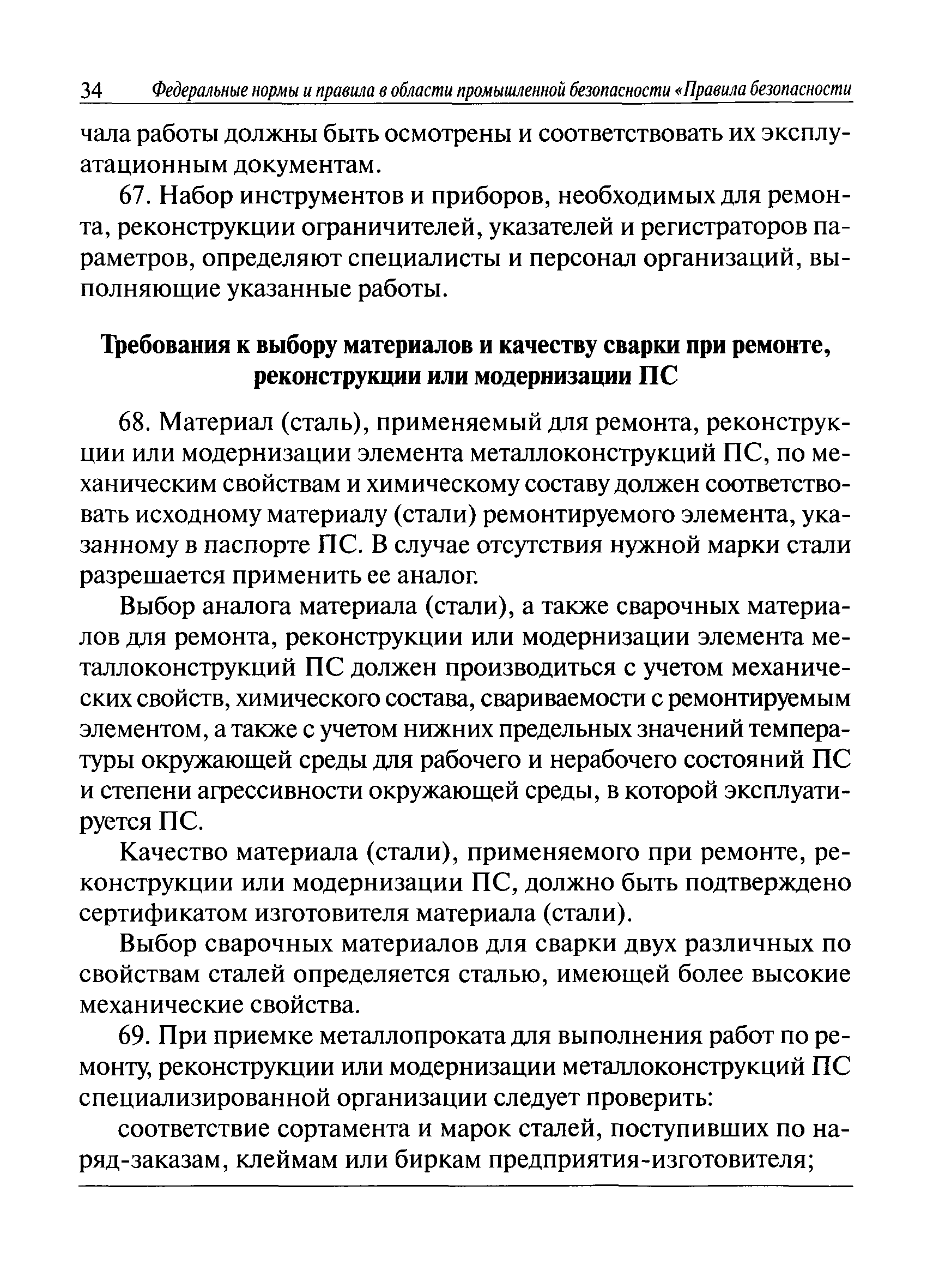 | Оглавление: | I. Общие положения II. Требования промышленной безопасности к организациям и работникам, осуществляющим монтаж, наладку, ремонт, реконструкцию или модернизацию ПС в процессе эксплуатации ОПО III. Требования промышленной безопасности к организациям и работникам ОПО, осуществляющим эксплуатацию ПС IV. Монтаж и наладка ПС (кроме ПС, смонтированных предприятием- изготовителем и полностью подготовленных к эксплуатации) V. Ремонт, реконструкция или модернизация ПС ОПО VI. Эксплуатация ПС ОПО VII. Оценка соответствия ПС, применяемых на ОПО и экспертиза их промышленной безопасности Приложение № 1 Термины и определения Приложение № 2 Уменьшение величины полезной грузоподъемности крана при оснащении его механизированным и/или электрифицированным грузозахватным приспособлением, в том числе моторным грейфером или электромагнитом. Приложение № 3 Нормы браковки элементов рельсовых путей опорных и подвесных подъемных сооружений Приложение № 4 Нормы браковки стальных канатов подъемных сооружений Приложение № 5 Порядок проведения испытаний стреловых кранов на грузовую устойчивость Приложение № 6 Определение группы классификации механизма подъемного сооружения Приложение № 7 Нормы браковки канатных и цепных стропов, а также текстильных стропов на полимерной основе. Приложение № 8 Предельные величины отклонений рельсового пути от проектного положения в плане и профиле Приложение № 9 Знаковая сигнализация, применяемая при работе подъемника (вышки) Приложение № 10 Знаковая сигнализация при перемещении грузов с применением ПС (кроме подъемников (вышек) Приложение № 11 Оценка работоспособности ограничителя или указателя опасного приближения к линии электропередач |