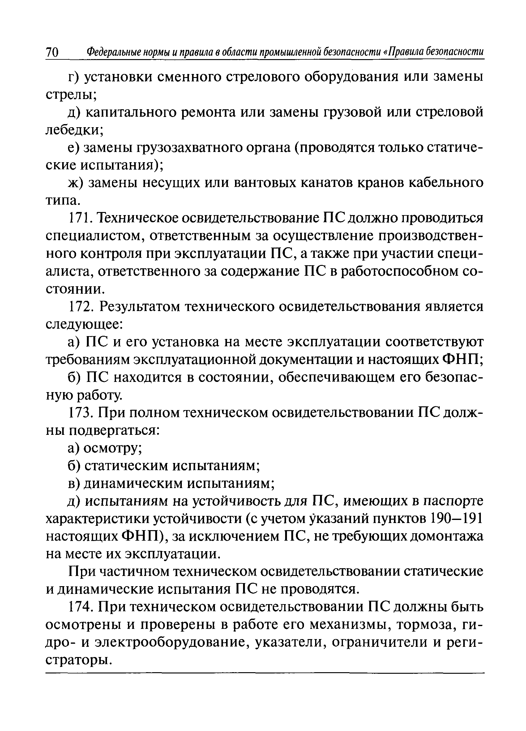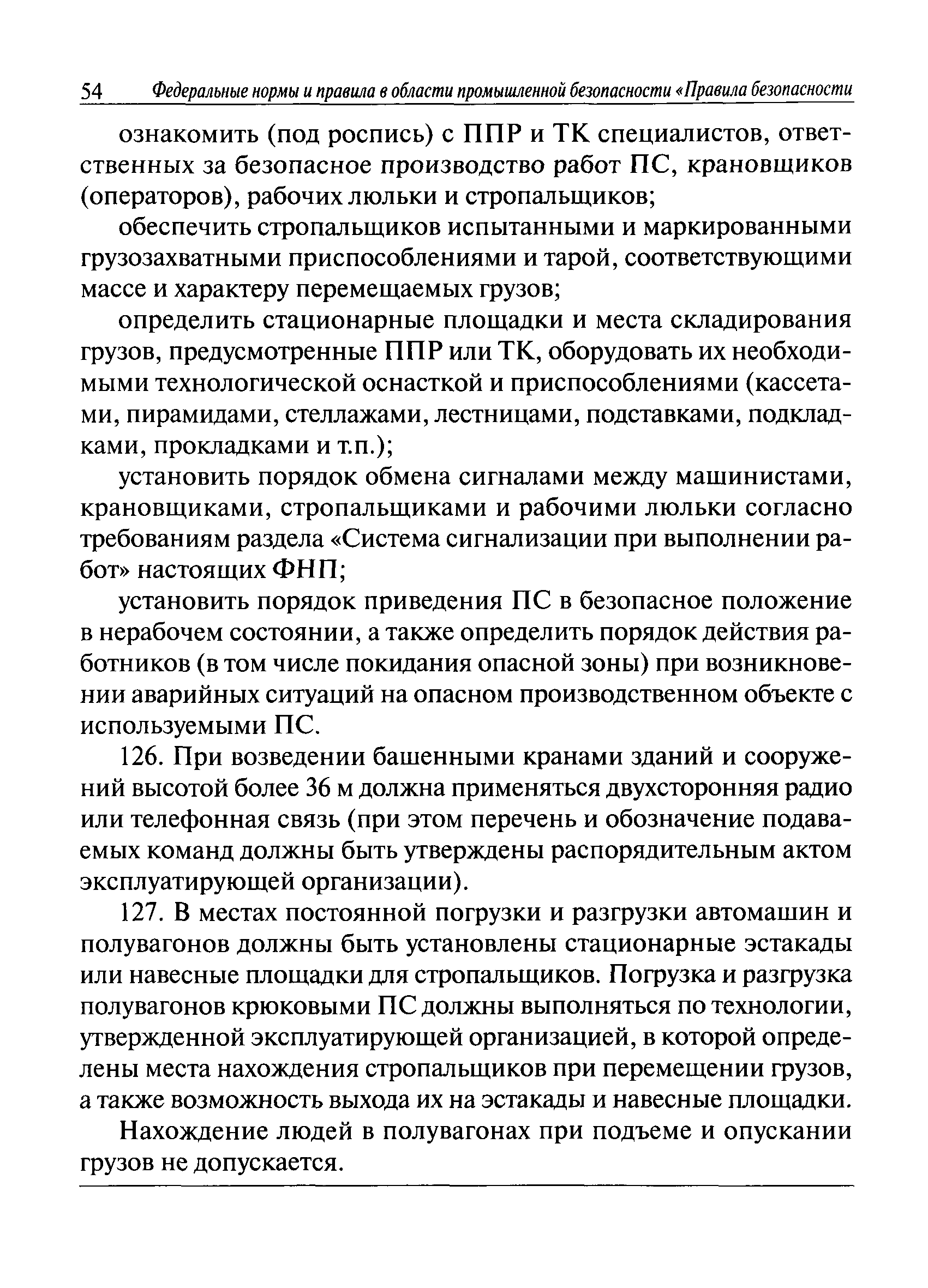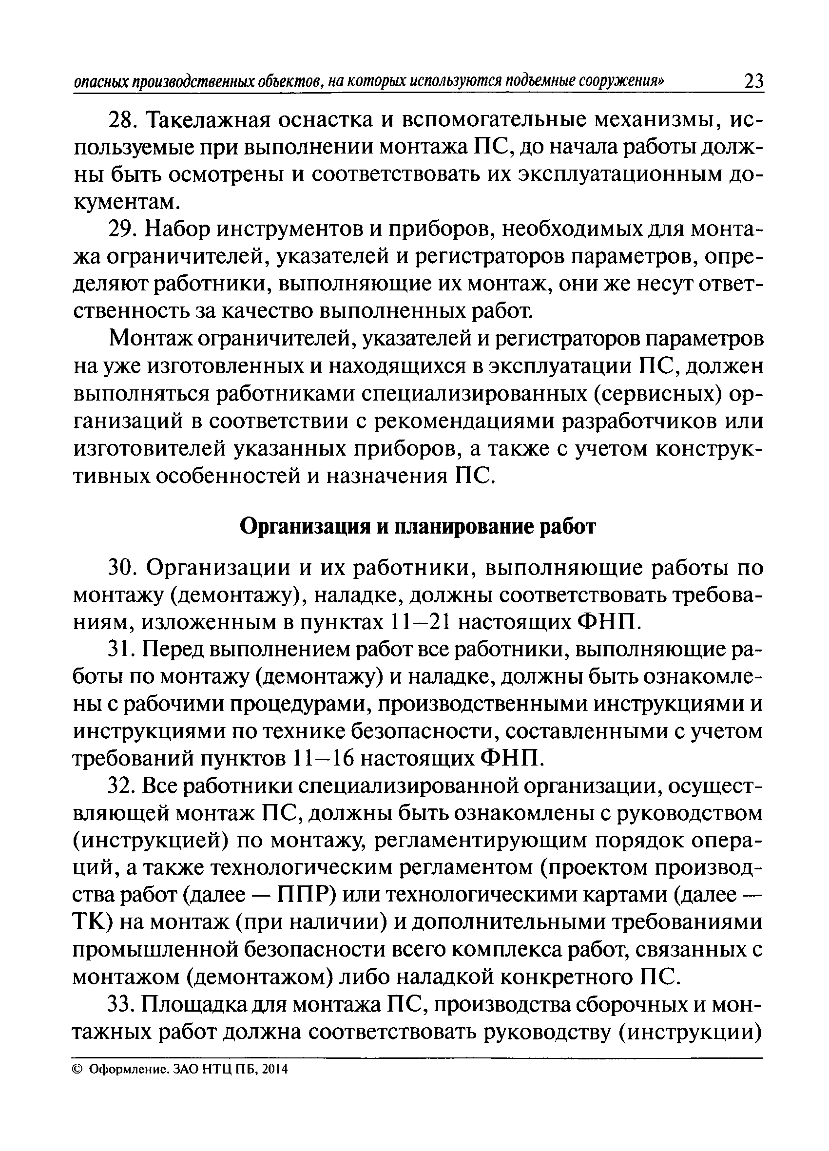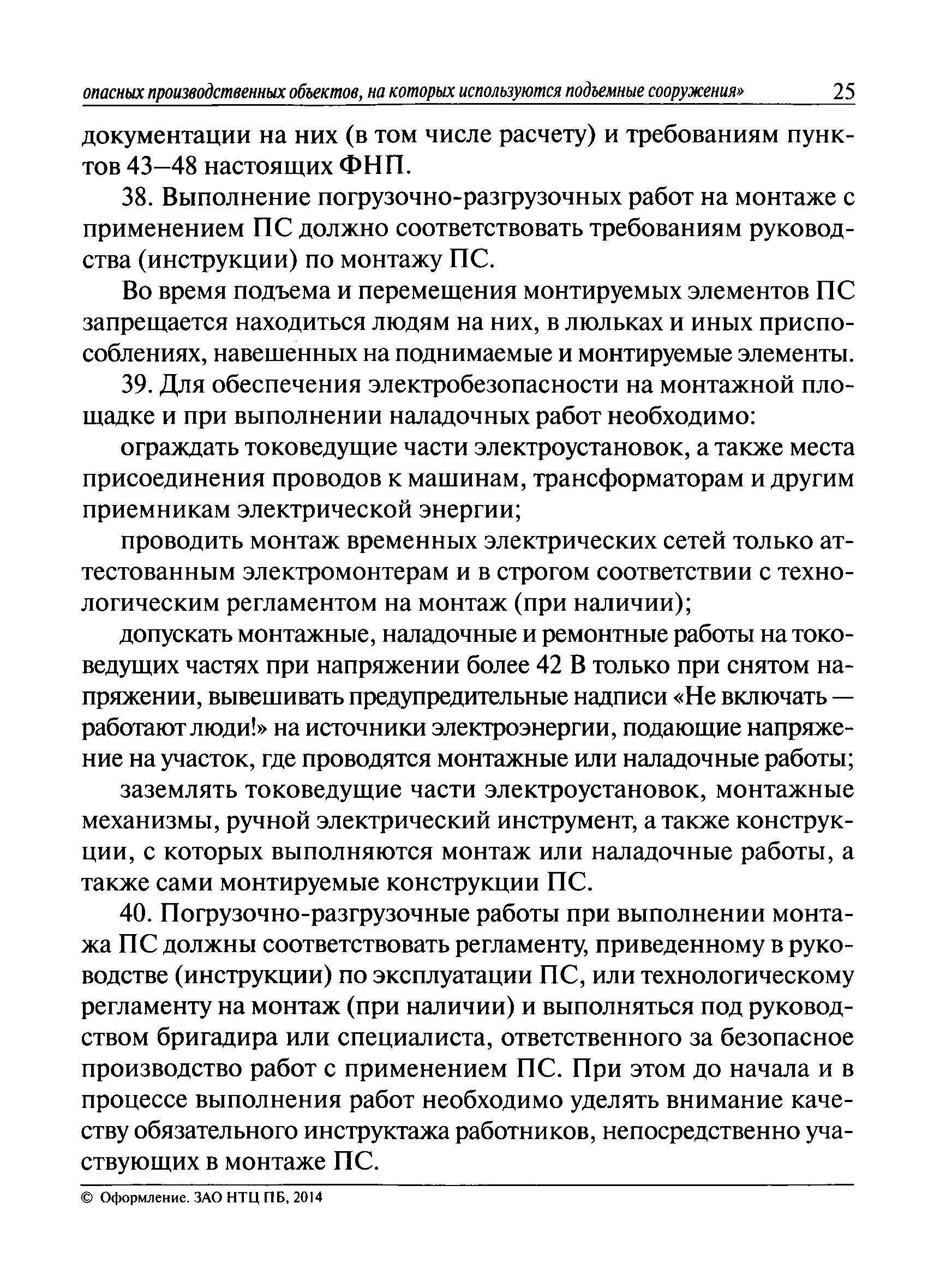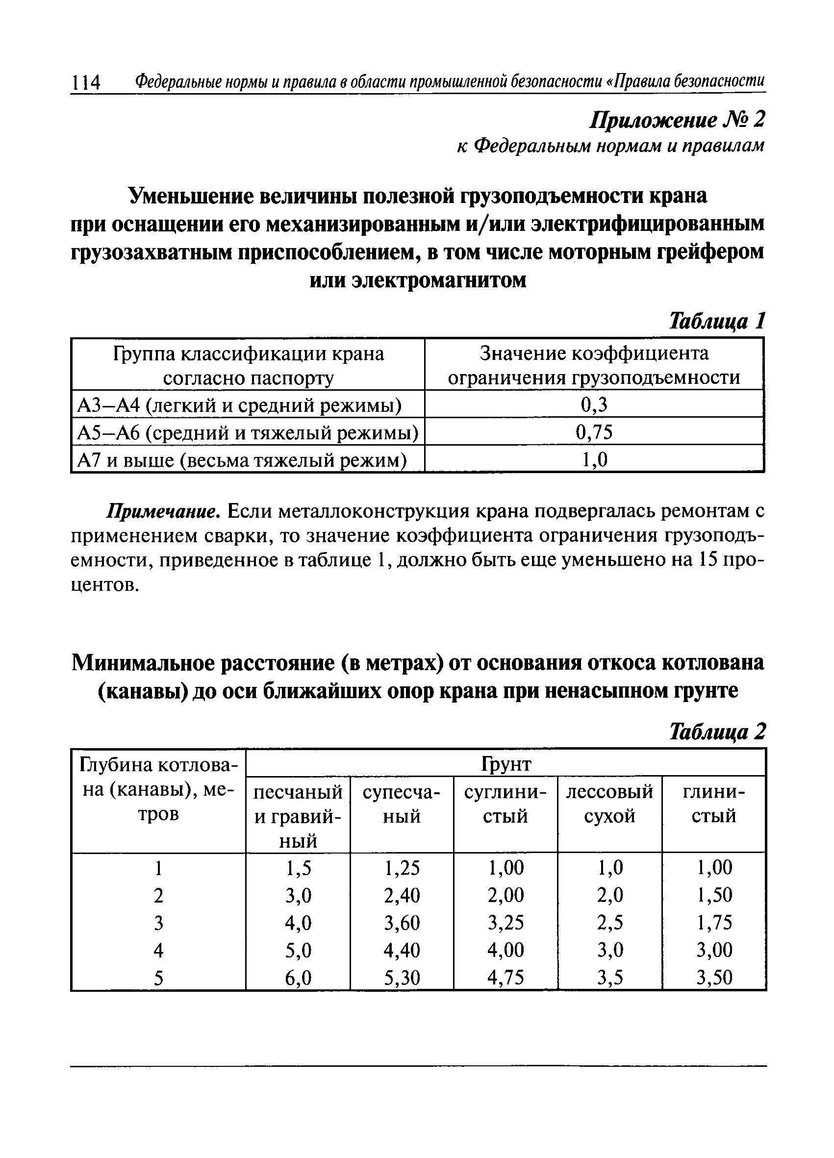 | Оглавление: | I. Общие положения II. Требования промышленной безопасности к организациям и работникам, осуществляющим монтаж, наладку, ремонт, реконструкцию или модернизацию ПС в процессе эксплуатации ОПО III. Требования промышленной безопасности к организациям и работникам ОПО, осуществляющим эксплуатацию ПС IV. Монтаж и наладка ПС (кроме ПС, смонтированных предприятием- изготовителем и полностью подготовленных к эксплуатации) V. Ремонт, реконструкция или модернизация ПС ОПО VI. Эксплуатация ПС ОПО VII. Оценка соответствия ПС, применяемых на ОПО и экспертиза их промышленной безопасности Приложение № 1 Термины и определения Приложение № 2 Уменьшение величины полезной грузоподъемности крана при оснащении его механизированным и/или электрифицированным грузозахватным приспособлением, в том числе моторным грейфером или электромагнитом. Приложение № 3 Нормы браковки элементов рельсовых путей опорных и подвесных подъемных сооружений Приложение № 4 Нормы браковки стальных канатов подъемных сооружений Приложение № 5 Порядок проведения испытаний стреловых кранов на грузовую устойчивость Приложение № 6 Определение группы классификации механизма подъемного сооружения Приложение № 7 Нормы браковки канатных и цепных стропов, а также текстильных стропов на полимерной основе. Приложение № 8 Предельные величины отклонений рельсового пути от проектного положения в плане и профиле Приложение № 9 Знаковая сигнализация, применяемая при работе подъемника (вышки) Приложение № 10 Знаковая сигнализация при перемещении грузов с применением ПС (кроме подъемников (вышек) Приложение № 11 Оценка работоспособности ограничителя или указателя опасного приближения к линии электропередач |