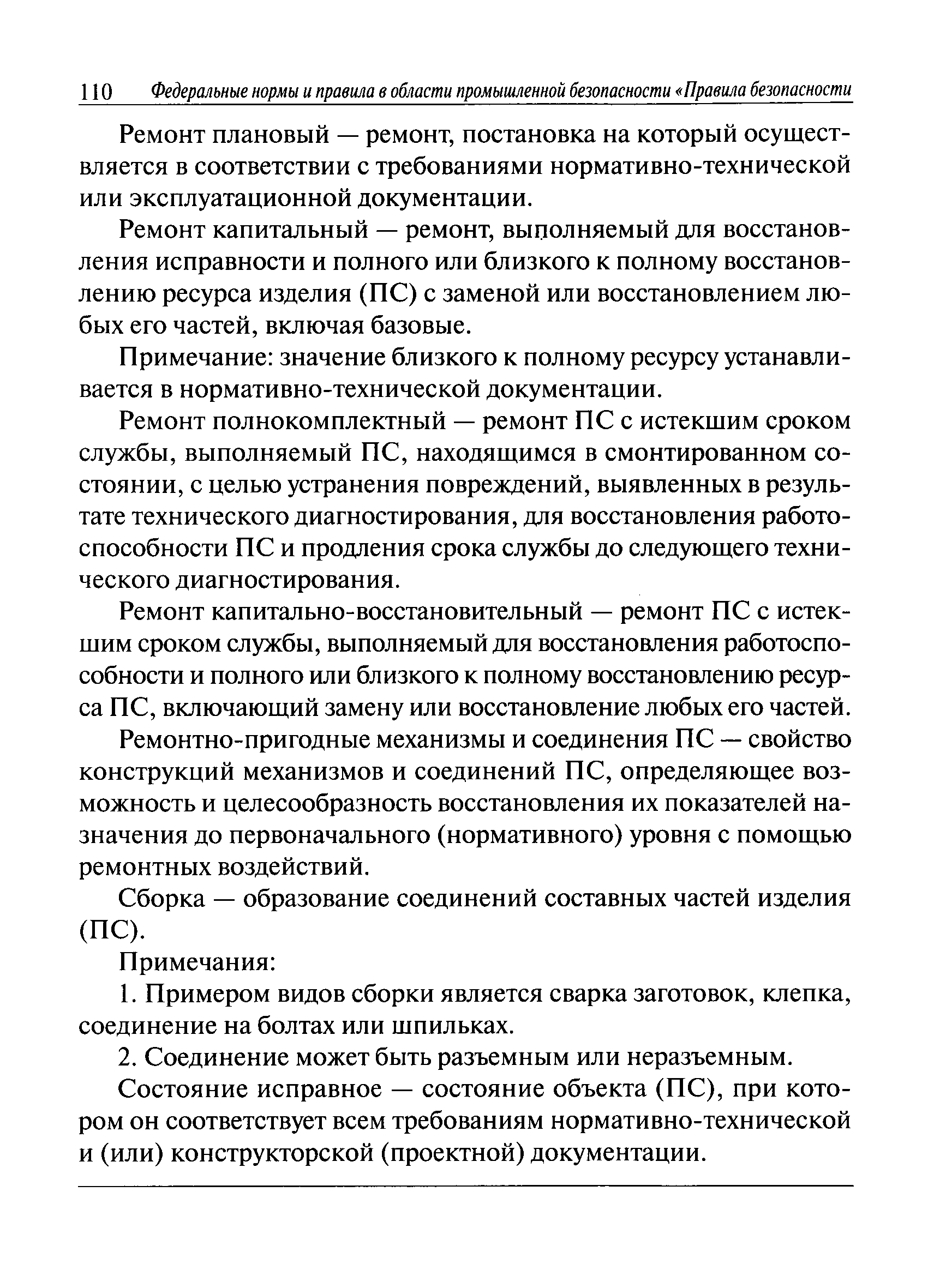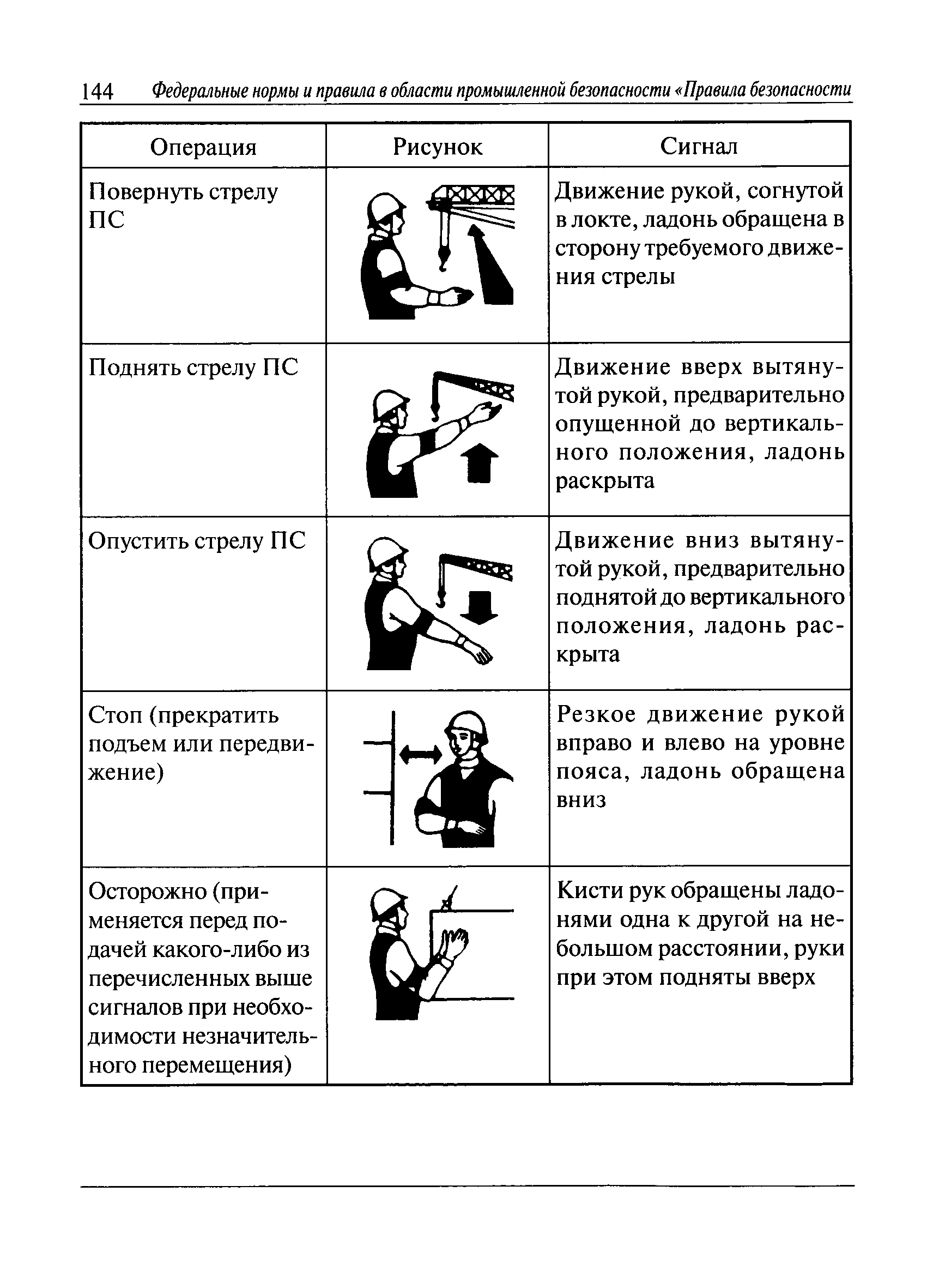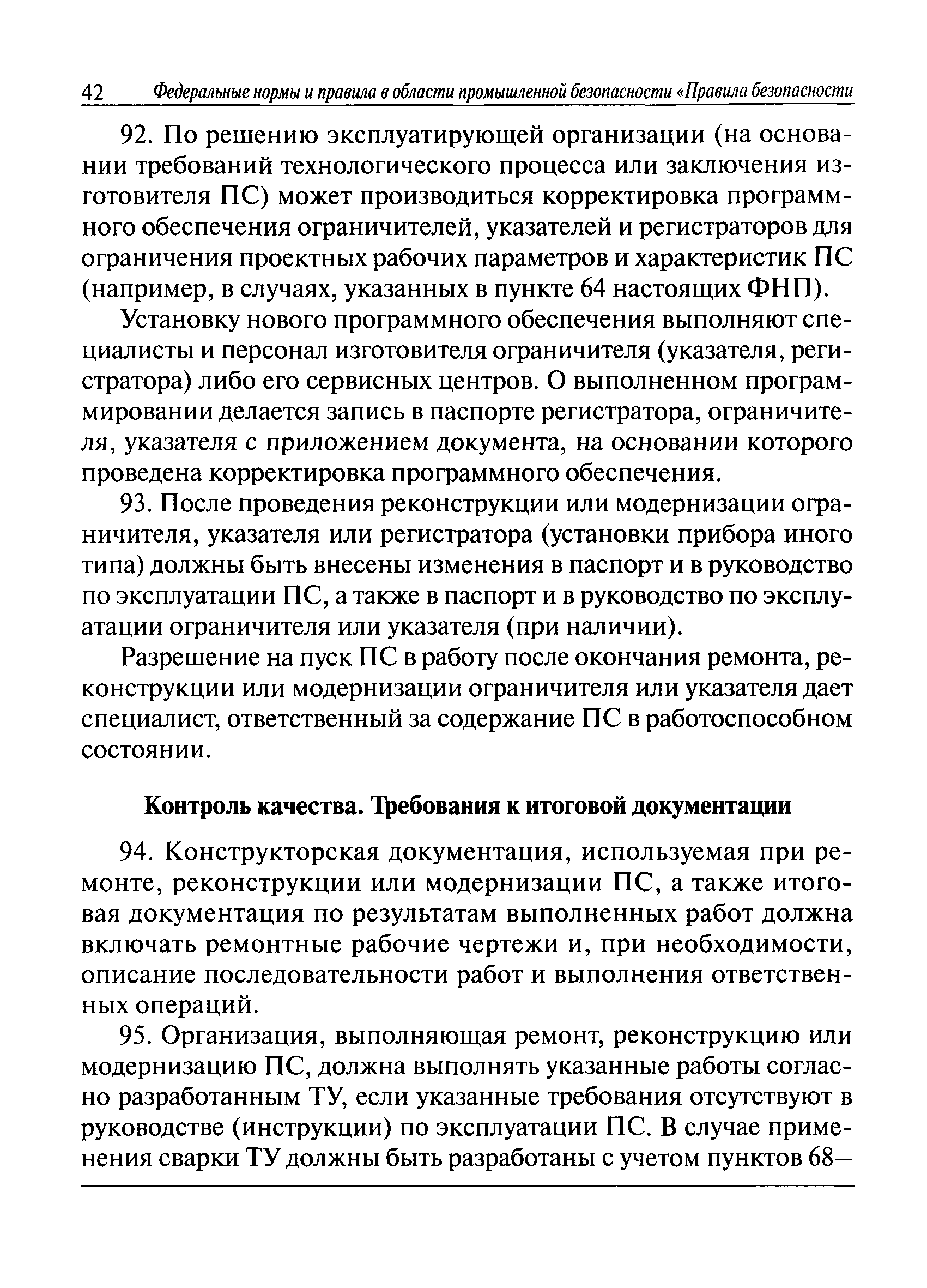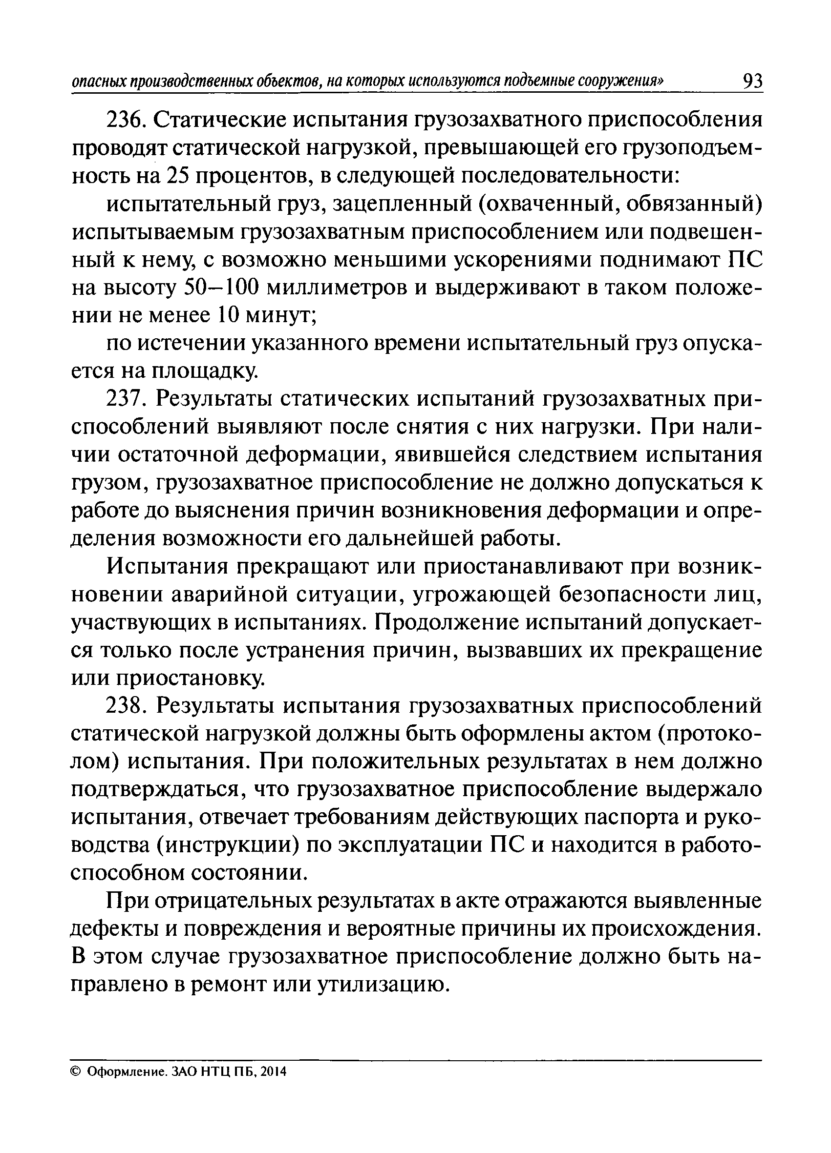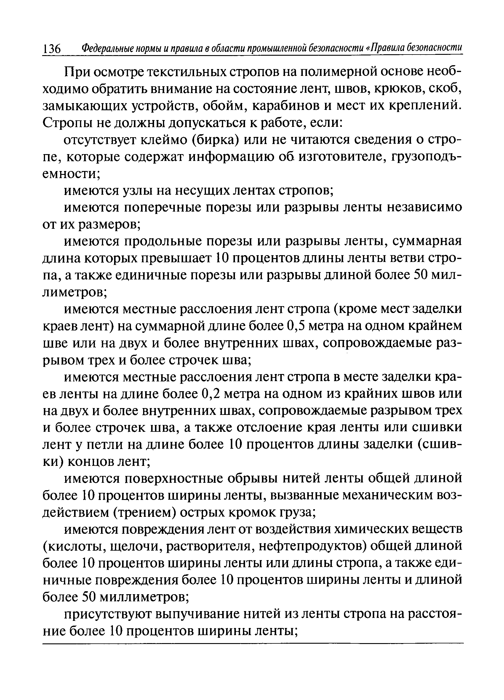 | Оглавление: | I. Общие положения II. Требования промышленной безопасности к организациям и работникам, осуществляющим монтаж, наладку, ремонт, реконструкцию или модернизацию ПС в процессе эксплуатации ОПО III. Требования промышленной безопасности к организациям и работникам ОПО, осуществляющим эксплуатацию ПС IV. Монтаж и наладка ПС (кроме ПС, смонтированных предприятием- изготовителем и полностью подготовленных к эксплуатации) V. Ремонт, реконструкция или модернизация ПС ОПО VI. Эксплуатация ПС ОПО VII. Оценка соответствия ПС, применяемых на ОПО и экспертиза их промышленной безопасности Приложение № 1 Термины и определения Приложение № 2 Уменьшение величины полезной грузоподъемности крана при оснащении его механизированным и/или электрифицированным грузозахватным приспособлением, в том числе моторным грейфером или электромагнитом. Приложение № 3 Нормы браковки элементов рельсовых путей опорных и подвесных подъемных сооружений Приложение № 4 Нормы браковки стальных канатов подъемных сооружений Приложение № 5 Порядок проведения испытаний стреловых кранов на грузовую устойчивость Приложение № 6 Определение группы классификации механизма подъемного сооружения Приложение № 7 Нормы браковки канатных и цепных стропов, а также текстильных стропов на полимерной основе. Приложение № 8 Предельные величины отклонений рельсового пути от проектного положения в плане и профиле Приложение № 9 Знаковая сигнализация, применяемая при работе подъемника (вышки) Приложение № 10 Знаковая сигнализация при перемещении грузов с применением ПС (кроме подъемников (вышек) Приложение № 11 Оценка работоспособности ограничителя или указателя опасного приближения к линии электропередач |