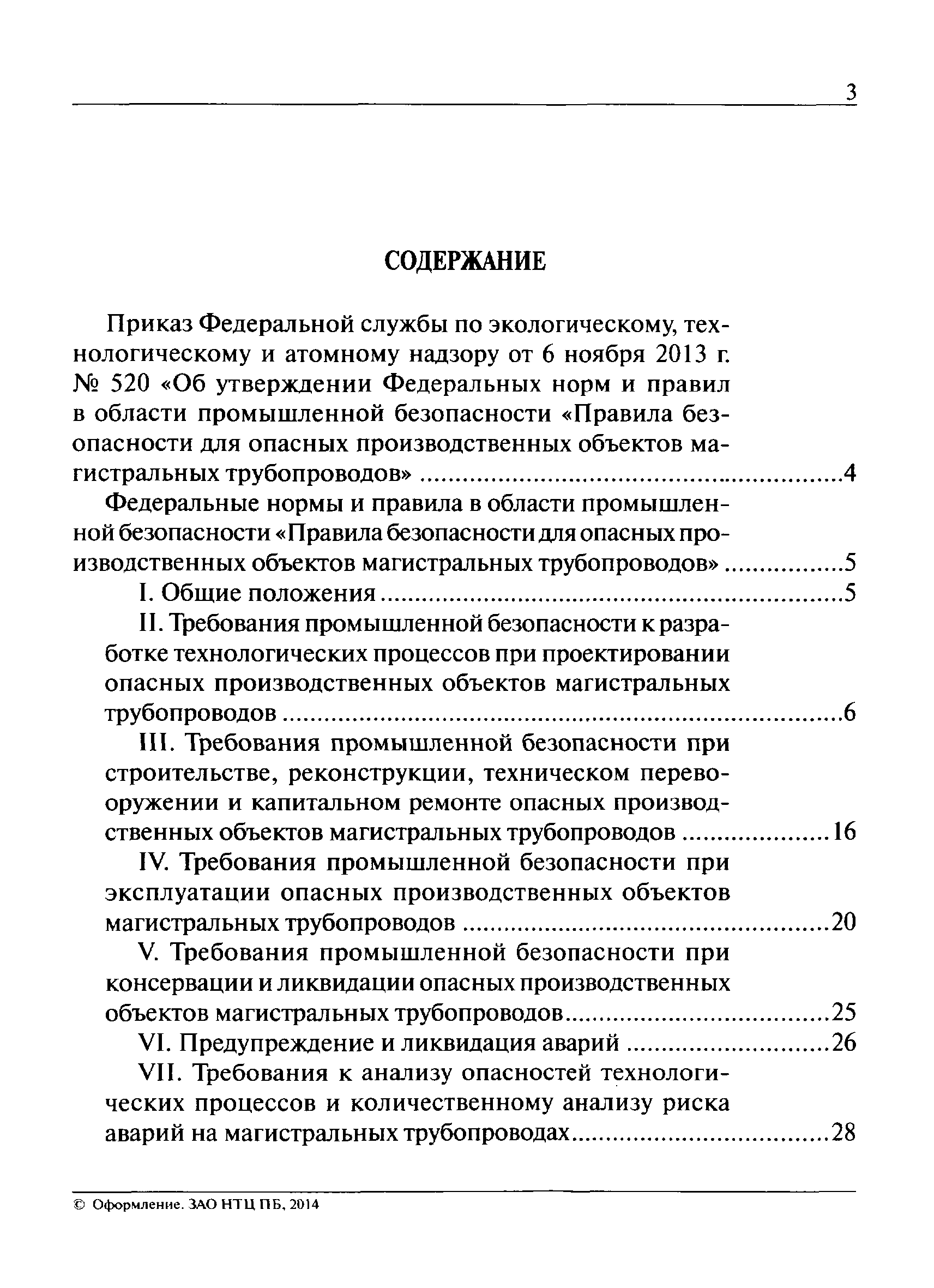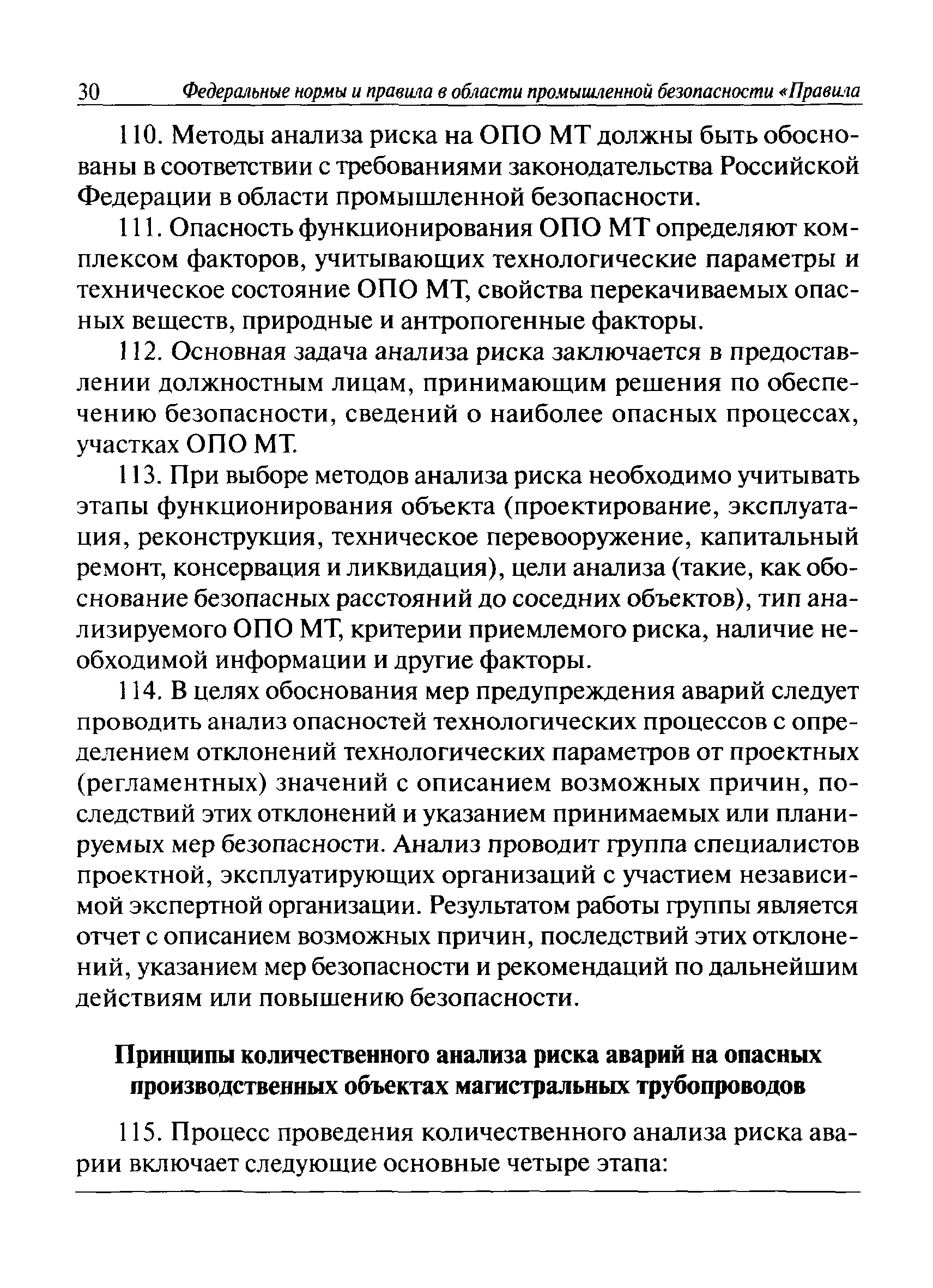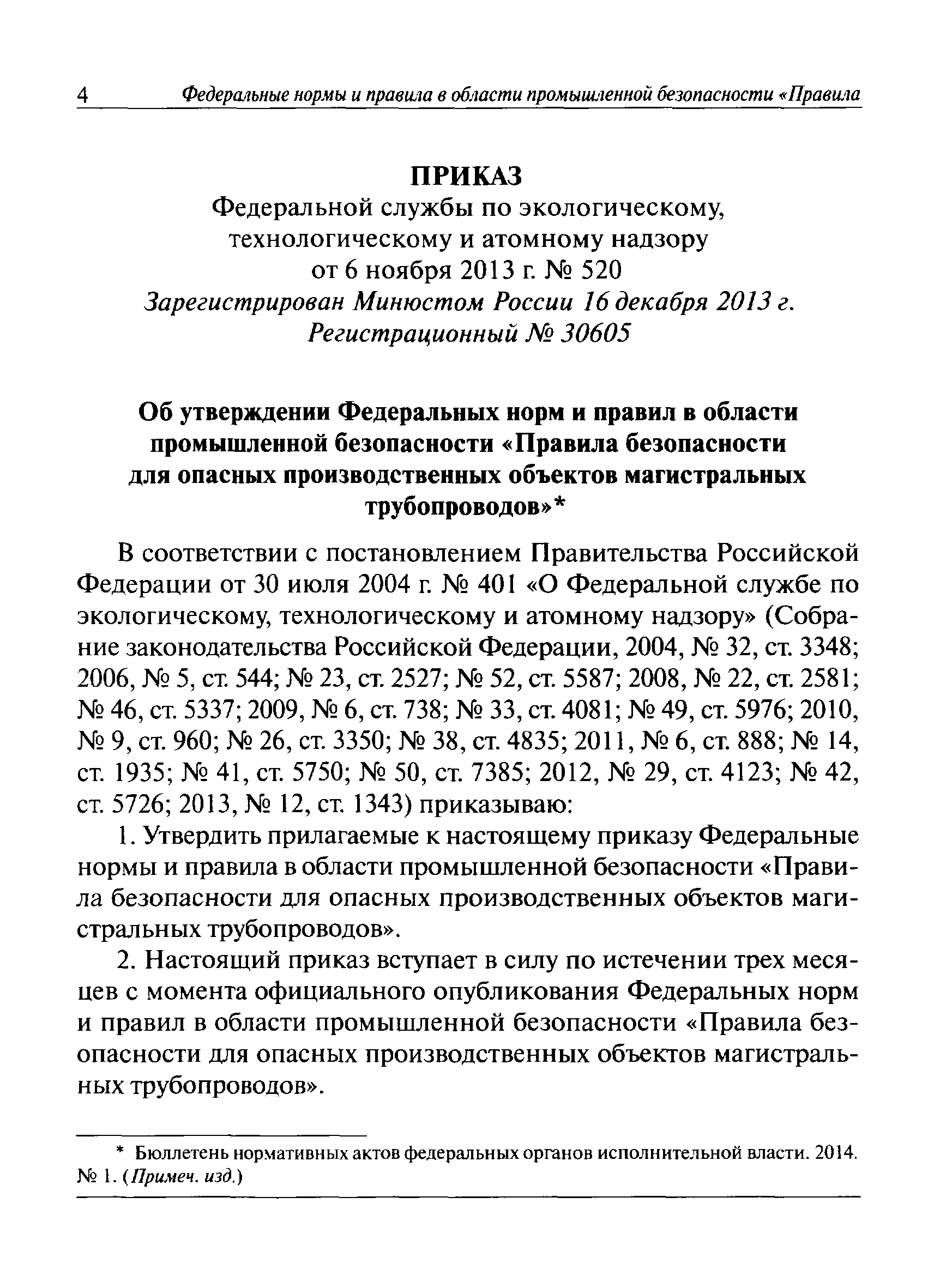 | Оглавление: | Приказ Федеральной службы по экологическому, технологическому и атомному надзору от 6 ноября 2013 г. № 520 «Об утверждении Федеральных норм и правил в области промышленной безопасности «Правила безопасности для опасных производственных объектов магистральных трубопроводов» Федеральные нормы и правила в области промышленной безопасности «Правила безопасности для опасных производственных объектов магистральных трубопроводов» I. Общие положения II. Требования промышленной безопасности к разработке технологических процессов при проектировании опасных производственных объектов магистральных трубопроводов Общие требования Требования промышленной безопасности при проектировании объектов линейной части магистральных трубопроводов Требования промышленной безопасности при проектировании площадочных сооружений магистральных трубопроводов III. Требования промышленной безопасности при строительстве, реконструкции, техническом перевооружении и капитальном ремонте опасных производственных объектов магистральных трубопроводов IV. Требования промышленной безопасности при эксплуатации опасных производственных объектов магистральных трубопроводов. Технологические регламенты на эксплуатацию магистральных трубопроводов Техническое обслуживание и ремонтные работы на опасных производственных объектах магистрального трубопровода Техническое диагностирование опасных производственных объектов магистральных трубопроводов V. Требования промышленной безопасности при консервации и ликвидации опасных производственных объектов магистральных трубопроводов VI. Предупреждение и ликвидация аварий VII. Требования к анализу опасностей технологических процессов и количественному анализу риска аварий на магистральных трубопроводах Общие положения Принципы количественного анализа риска аварий на опасных производственных объектах магистральных трубопроводов Требования к оформлению результатов анализа риска аварии на магистральном трубопроводе Определение безопасных расстояний |