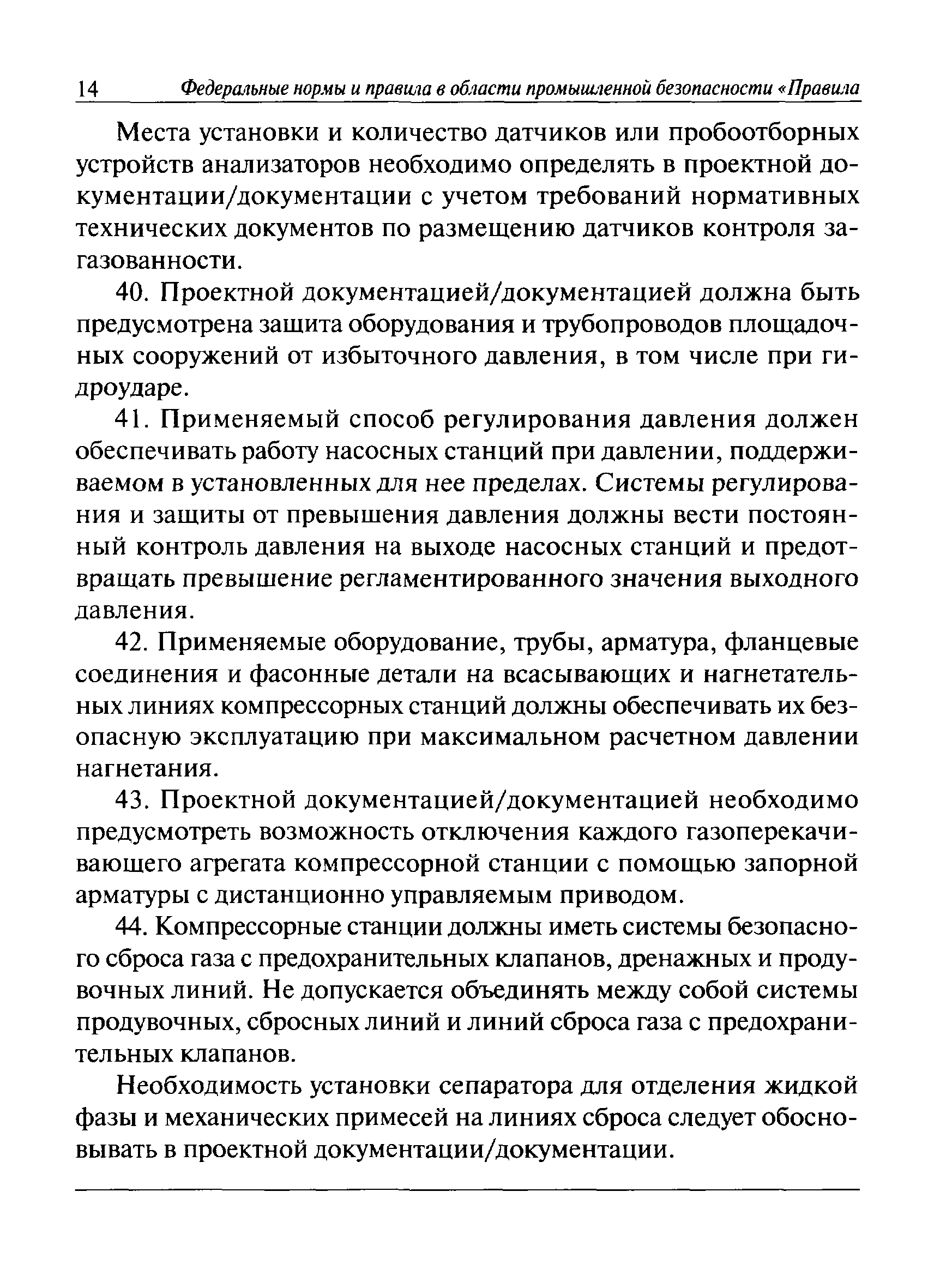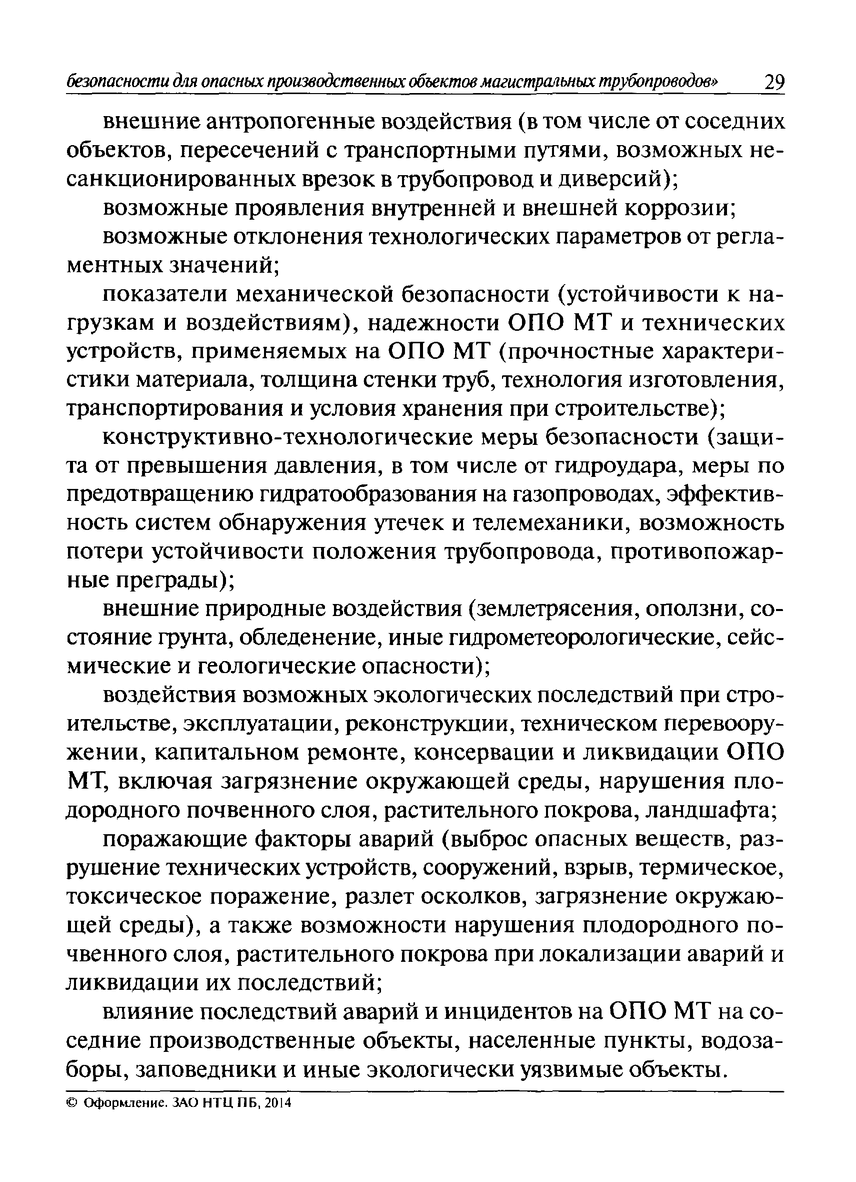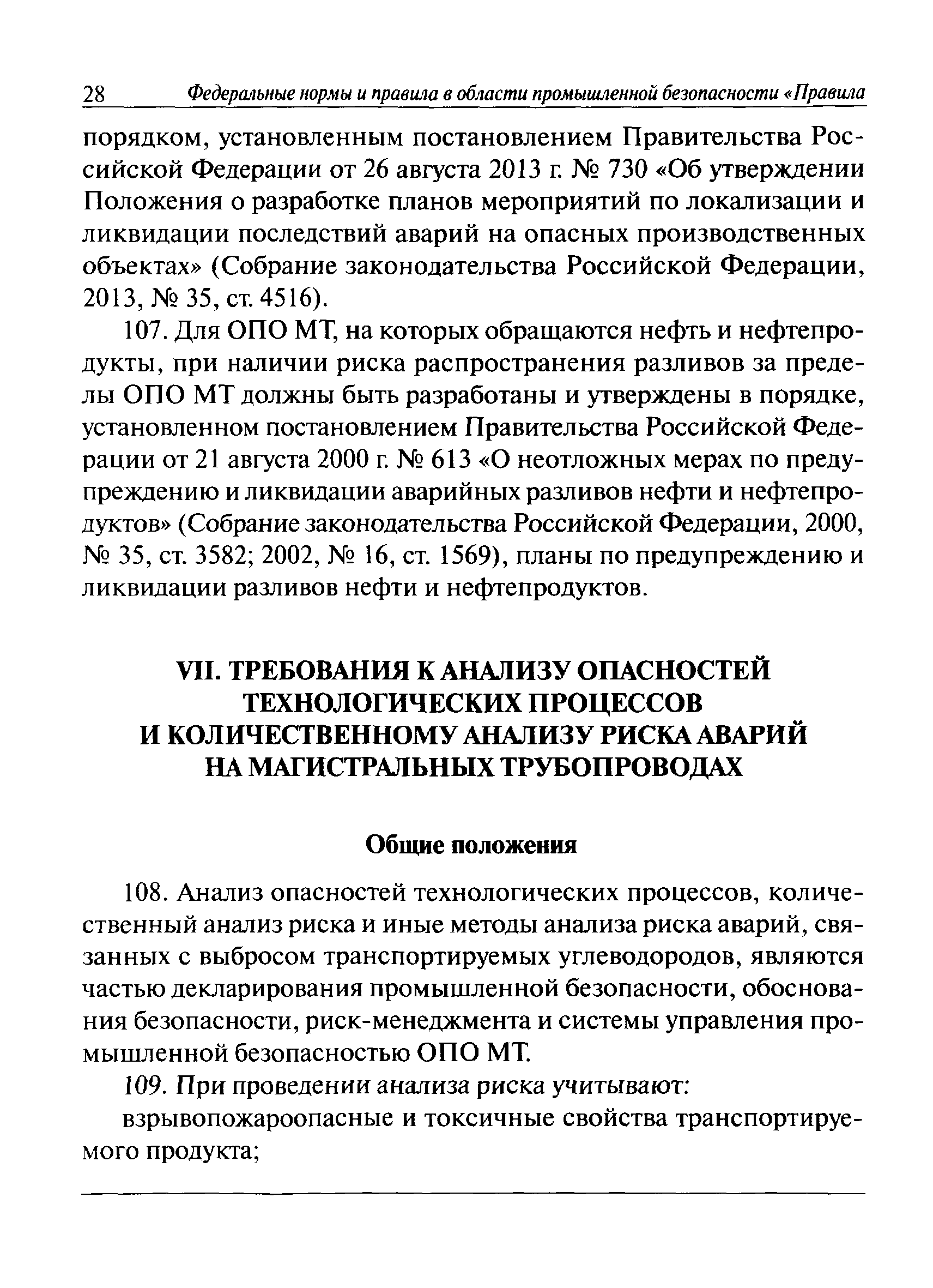 | Оглавление: | Приказ Федеральной службы по экологическому, технологическому и атомному надзору от 6 ноября 2013 г. № 520 «Об утверждении Федеральных норм и правил в области промышленной безопасности «Правила безопасности для опасных производственных объектов магистральных трубопроводов» Федеральные нормы и правила в области промышленной безопасности «Правила безопасности для опасных производственных объектов магистральных трубопроводов» I. Общие положения II. Требования промышленной безопасности к разработке технологических процессов при проектировании опасных производственных объектов магистральных трубопроводов Общие требования Требования промышленной безопасности при проектировании объектов линейной части магистральных трубопроводов Требования промышленной безопасности при проектировании площадочных сооружений магистральных трубопроводов III. Требования промышленной безопасности при строительстве, реконструкции, техническом перевооружении и капитальном ремонте опасных производственных объектов магистральных трубопроводов IV. Требования промышленной безопасности при эксплуатации опасных производственных объектов магистральных трубопроводов. Технологические регламенты на эксплуатацию магистральных трубопроводов Техническое обслуживание и ремонтные работы на опасных производственных объектах магистрального трубопровода Техническое диагностирование опасных производственных объектов магистральных трубопроводов V. Требования промышленной безопасности при консервации и ликвидации опасных производственных объектов магистральных трубопроводов VI. Предупреждение и ликвидация аварий VII. Требования к анализу опасностей технологических процессов и количественному анализу риска аварий на магистральных трубопроводах Общие положения Принципы количественного анализа риска аварий на опасных производственных объектах магистральных трубопроводов Требования к оформлению результатов анализа риска аварии на магистральном трубопроводе Определение безопасных расстояний |