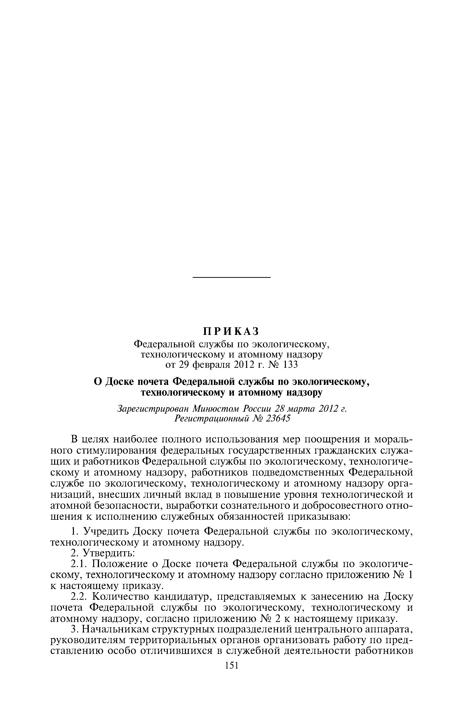 Количество кандидатур, представляемых к занесению на Доску почета Федеральной службы по экологическому, технологическому и атомному надзору| Статус: | действует | | Название рус.: | Количество кандидатур, представляемых к занесению на Доску почета Федеральной службы по экологическому, технологическому и атомному надзору | | Дата добавления в базу: | 01.10.2014 | | Дата актуализации: | 01.01.2021 | | Дата введения: | 15.06.2012 | | Оглавление: | I. Общие положения II. Порядок занесения на Доску почета | | Утверждён: | 29.02.2012 Федеральная служба по экологическому, технологическому и атомному надзору (133)
