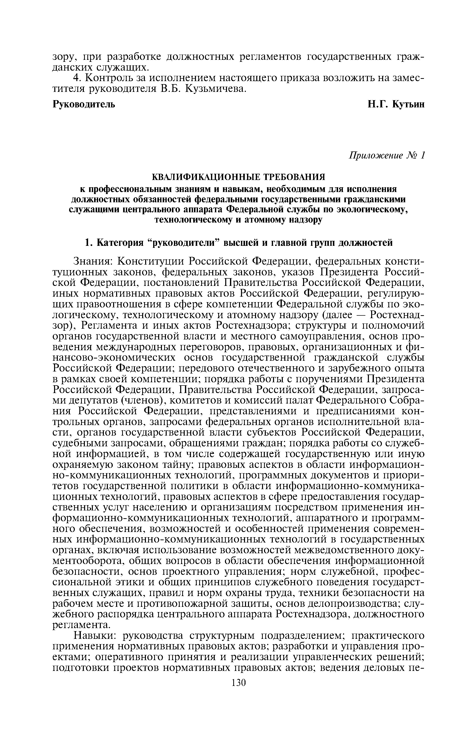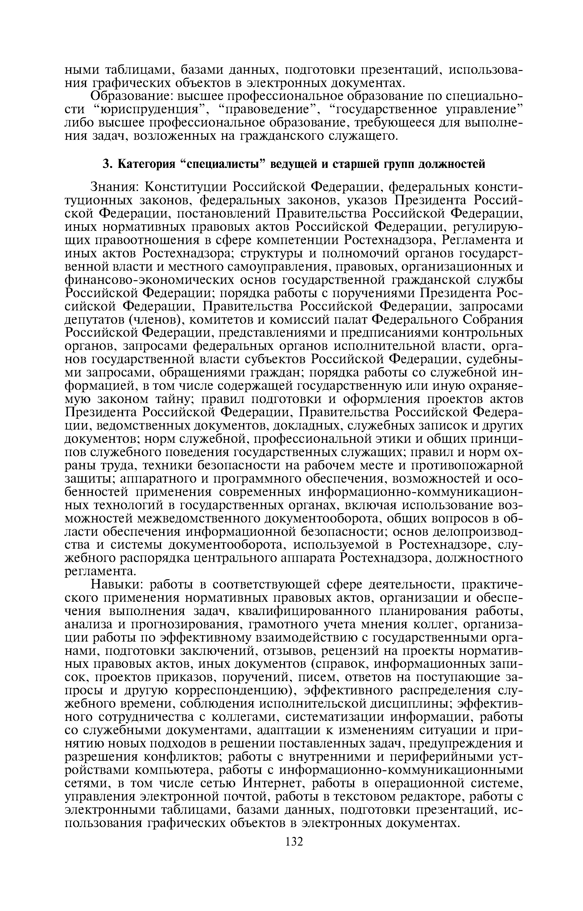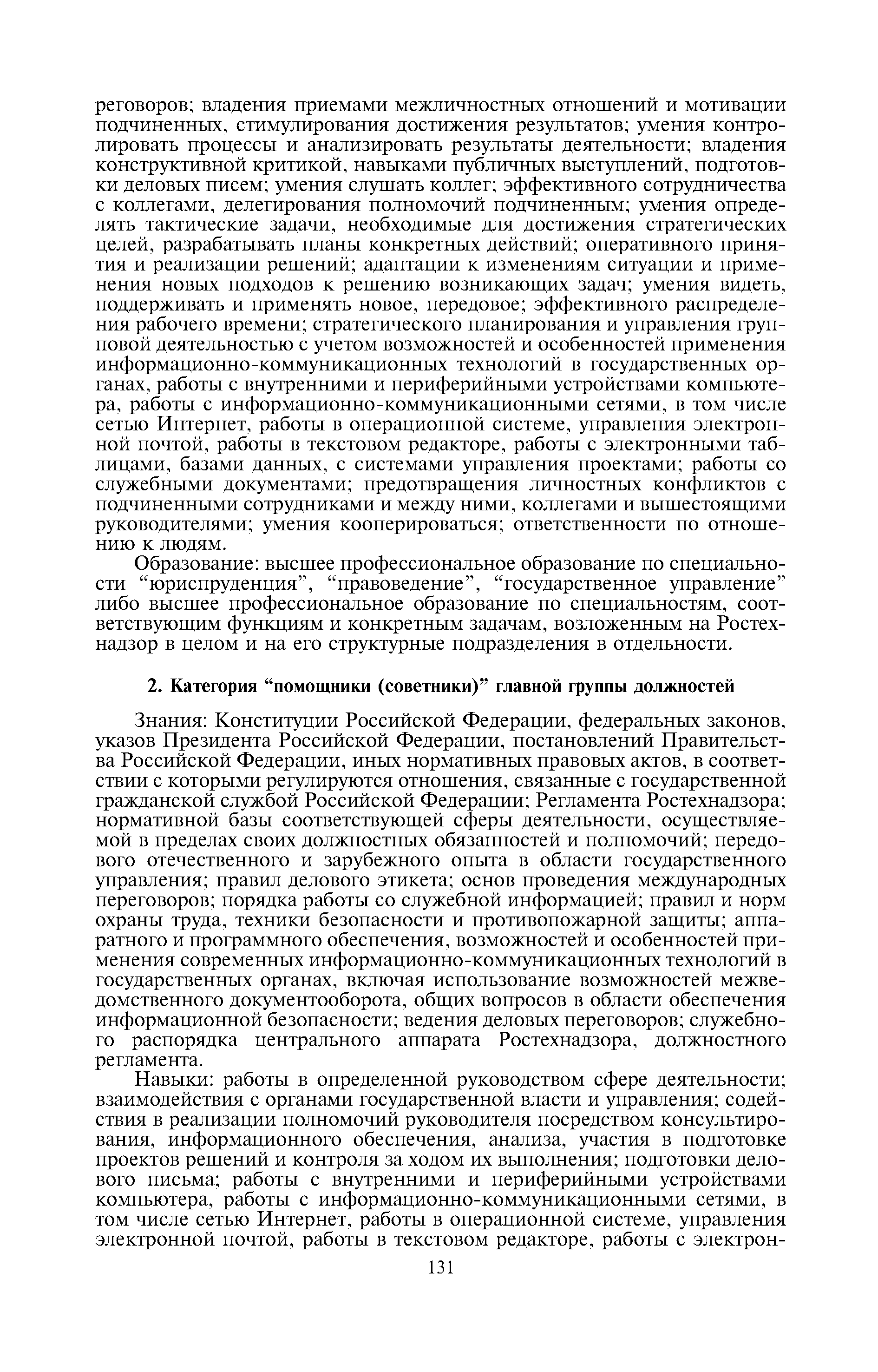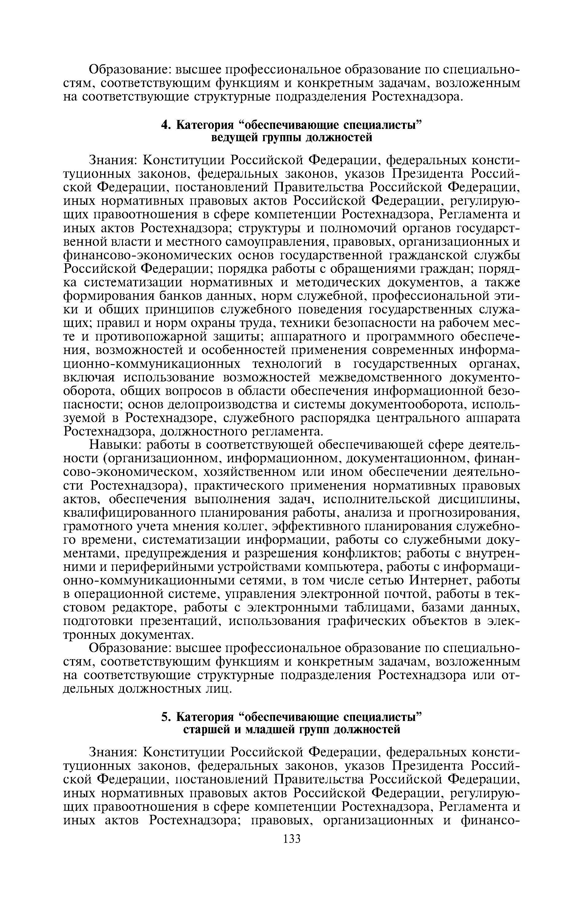 Квалификационные требования к профессиональным знаниям и навыкам, необходимым для исполнения должностных обязанностей федеральными государственными гражданскими служащими центрального аппарата Федеральной службы по экологическому, технологическому и атомному надзору| Статус: | утратил силу | | Название рус.: | Квалификационные требования к профессиональным знаниям и навыкам, необходимым для исполнения должностных обязанностей федеральными государственными гражданскими служащими центрального аппарата Федеральной службы по экологическому, технологическому и атомному надзору | | Дата добавления в базу: | 01.10.2014 | | Дата актуализации: | 01.01.2021 | | Дата введения: | 21.09.2012 | | Дата окончания срока действия: | 21.05.2018 | | Оглавление: | 1 Категория "руководители" высшей и главной групп должностей 2 Категория "помощники (советники)" главной группы должностей 3 Категория "специалисты" ведущей и старшей групп должностей 4 Категория "обеспечивающие специалисты" ведущей группы должностей 5 Категория "обеспечивающие специалисты" старшей и младшей групп должностей | | Утверждён: | 04.04.2012 Федеральная служба по экологическому, технологическому и атомному надзору (229)