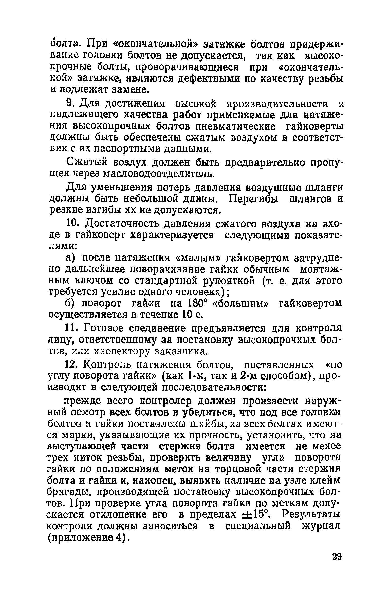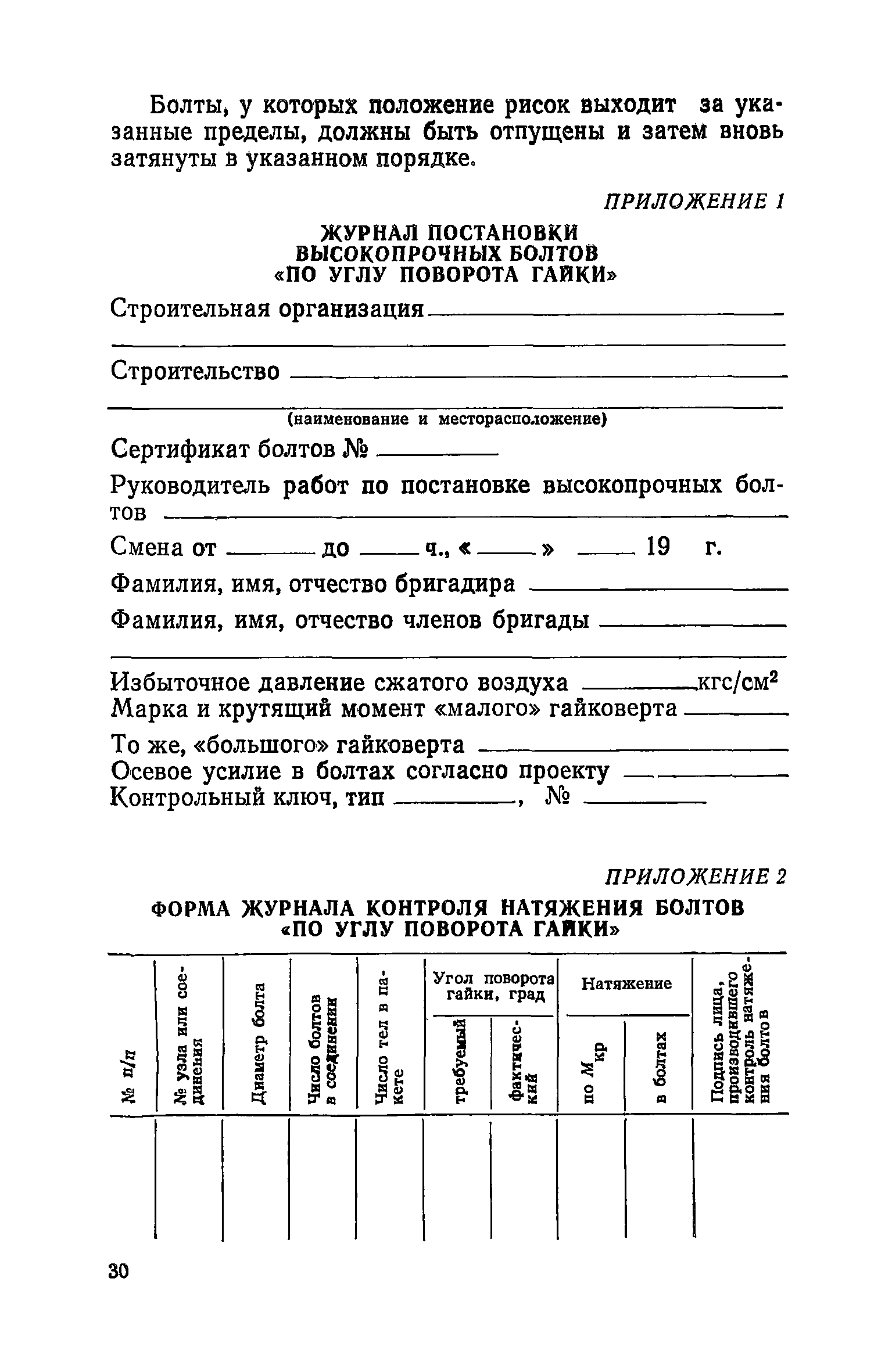 | Оглавление: | Приложение 1. Журнал постановки высокопрочных болтов "по углу поворота гайки" Приложение 2. Форма журнала контроля натяжения болтов "по углу поворота гайки" Приложение 3. Техническая характеристика гайковертов для натяжения высокопрочных болтов Приложение 4. Форма журнала контроля натяжения высокопрочных болтов "по углу поворота гайки" |