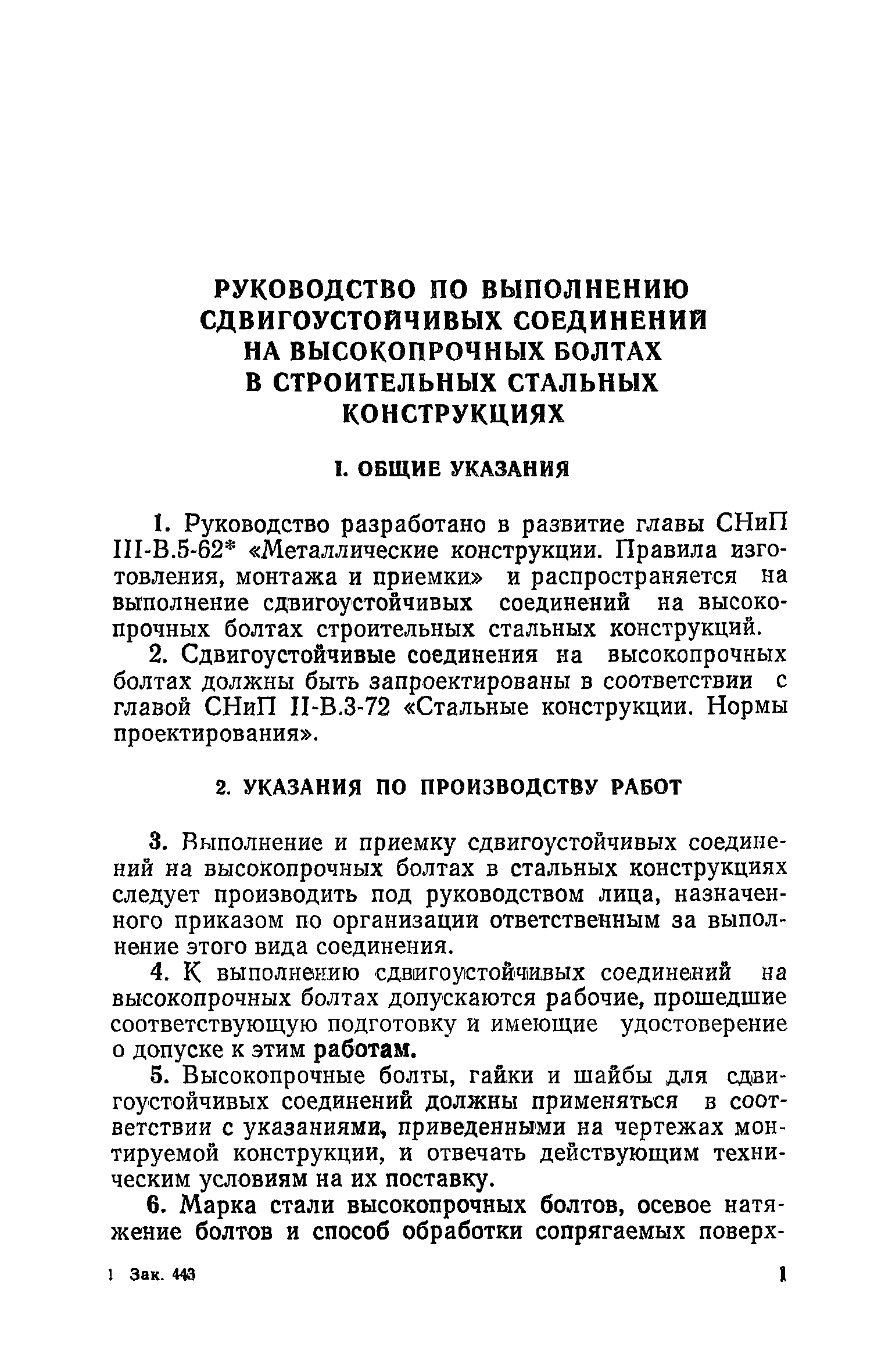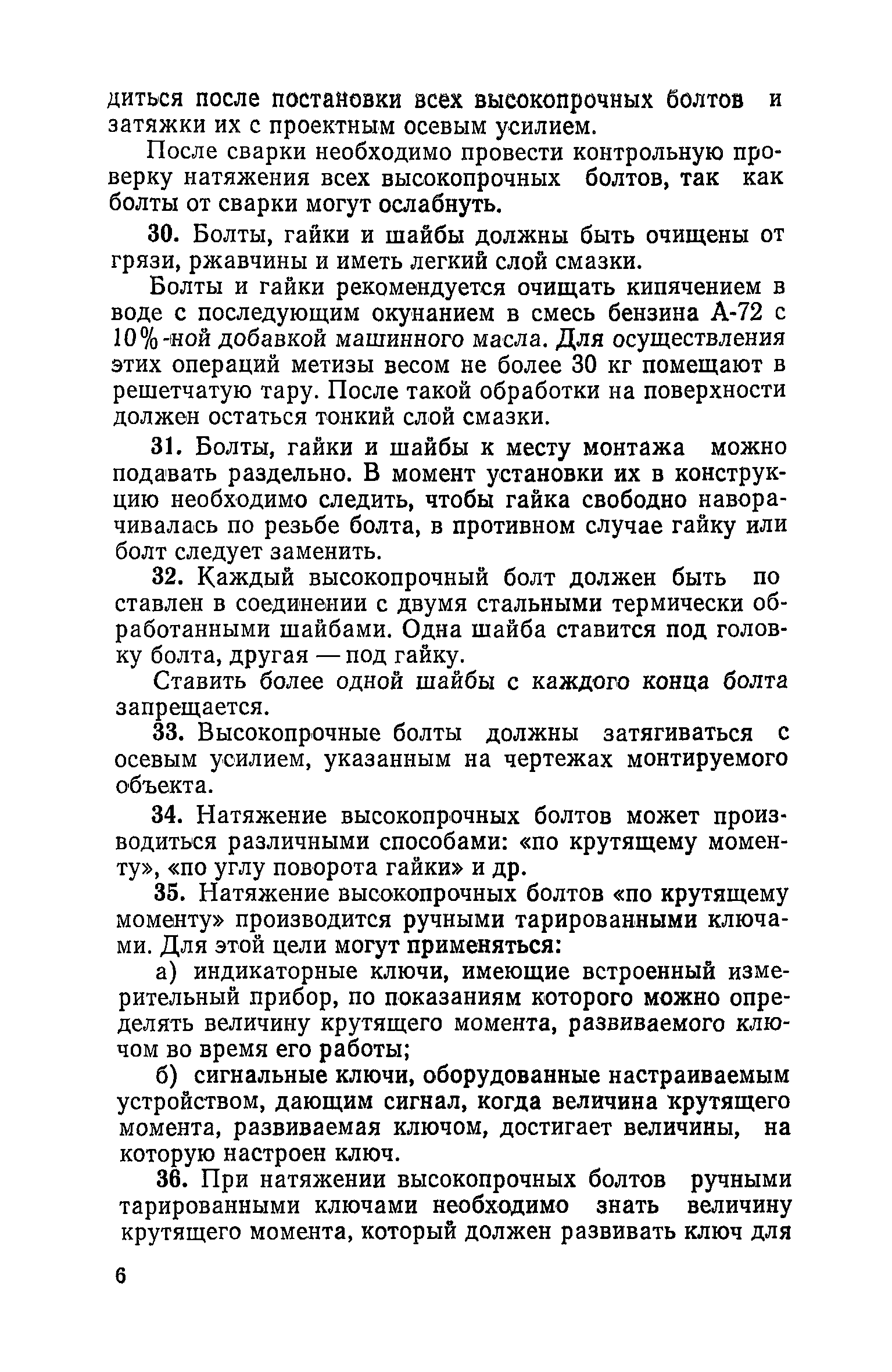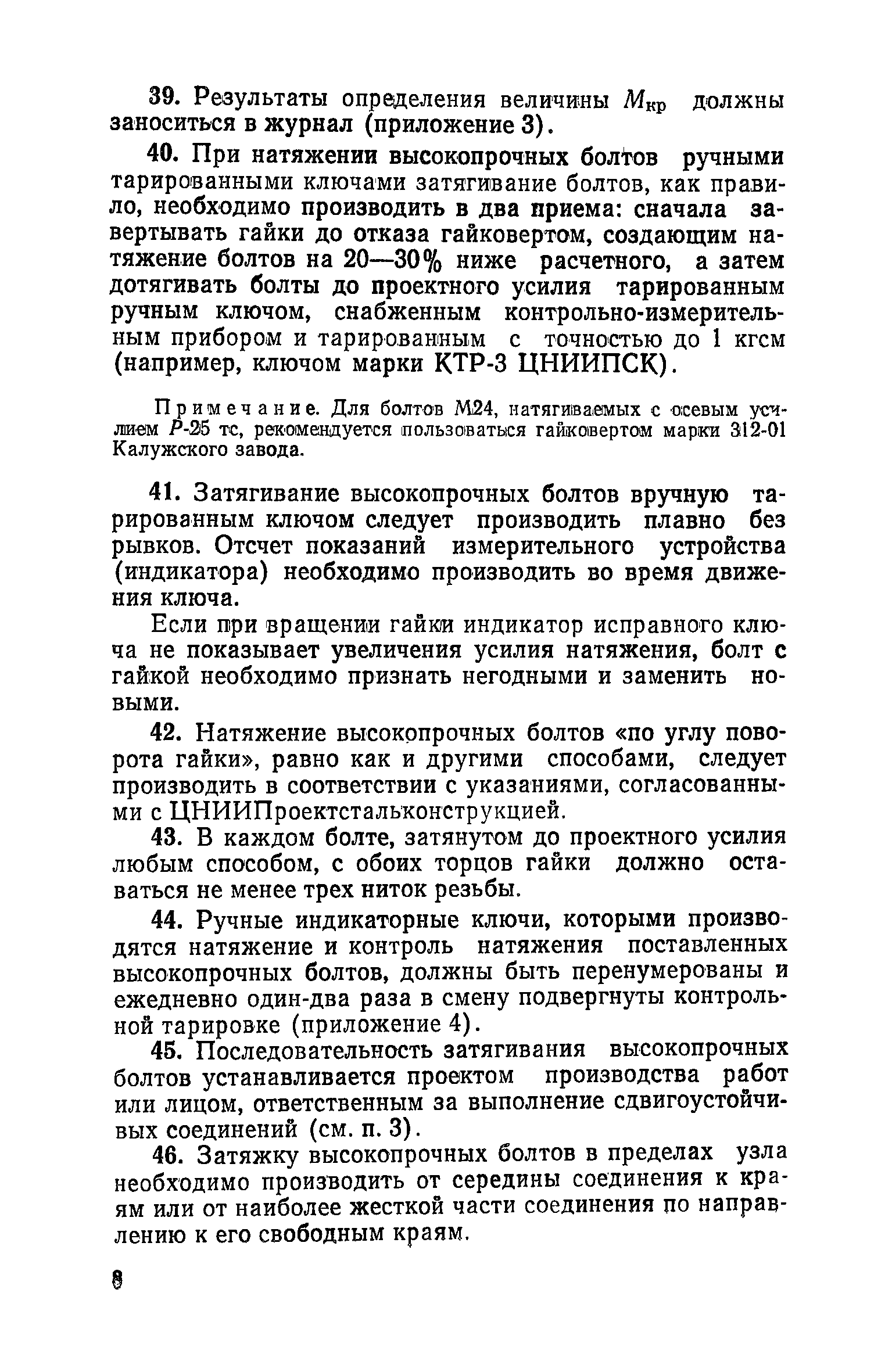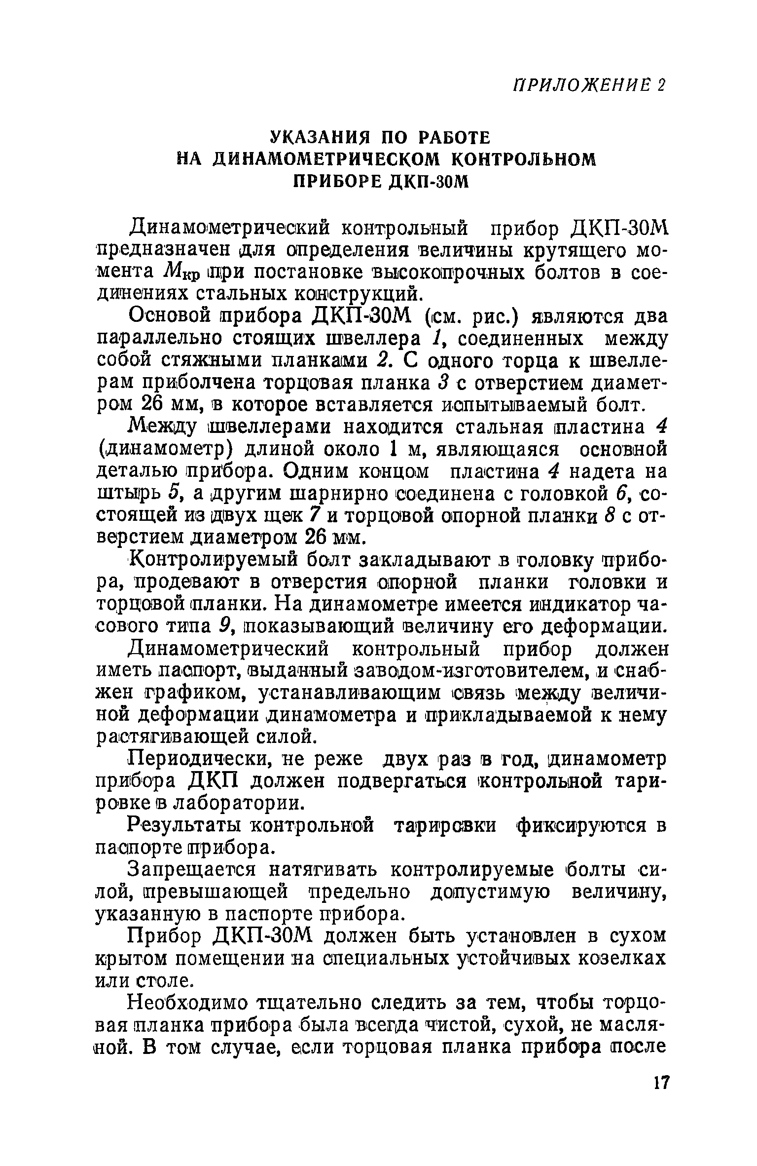 | Оглавление: | 1. Общие указания 2. Указания по производству работ 3. Требования к высокопрочным болтам, гайкам и шайбам Приложение 1. Форма журнала контроля качества подготовки поверхностей соединяемых элементов и деталей Приложение 2. Указания по работе на динамометрическом контрольном приборе ДКП-30М Приложение 3. Форма журнала для записи результатов определения величин крутящего момента Мир на приборе ДКП Приложение 4. Указания по контрольной тарировке ручных индикаторных и сигнальных ключей Приложение 5. Форма журнала постановки высокопрочных болтов ручными ключами "по крутящему моменту" Приложение 6. Определение расчетной площади сечения высокопрочного болта |