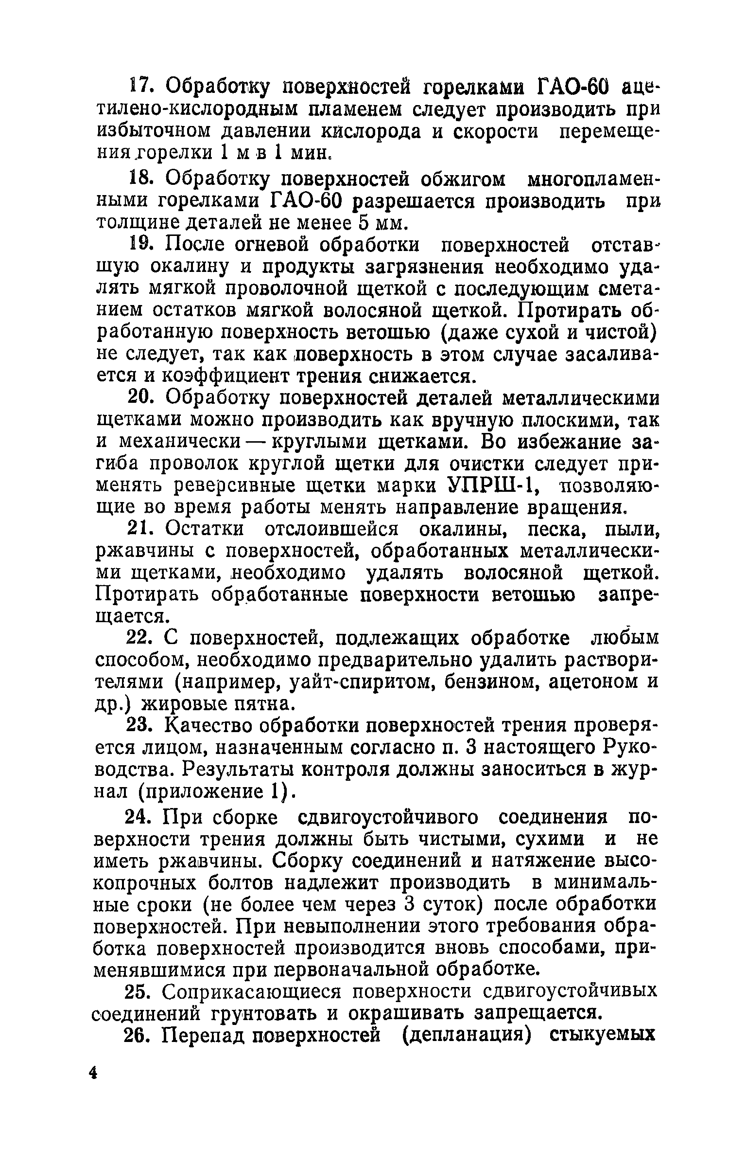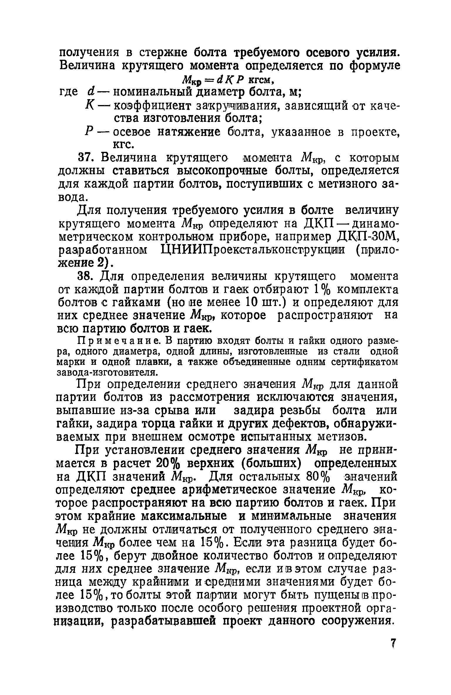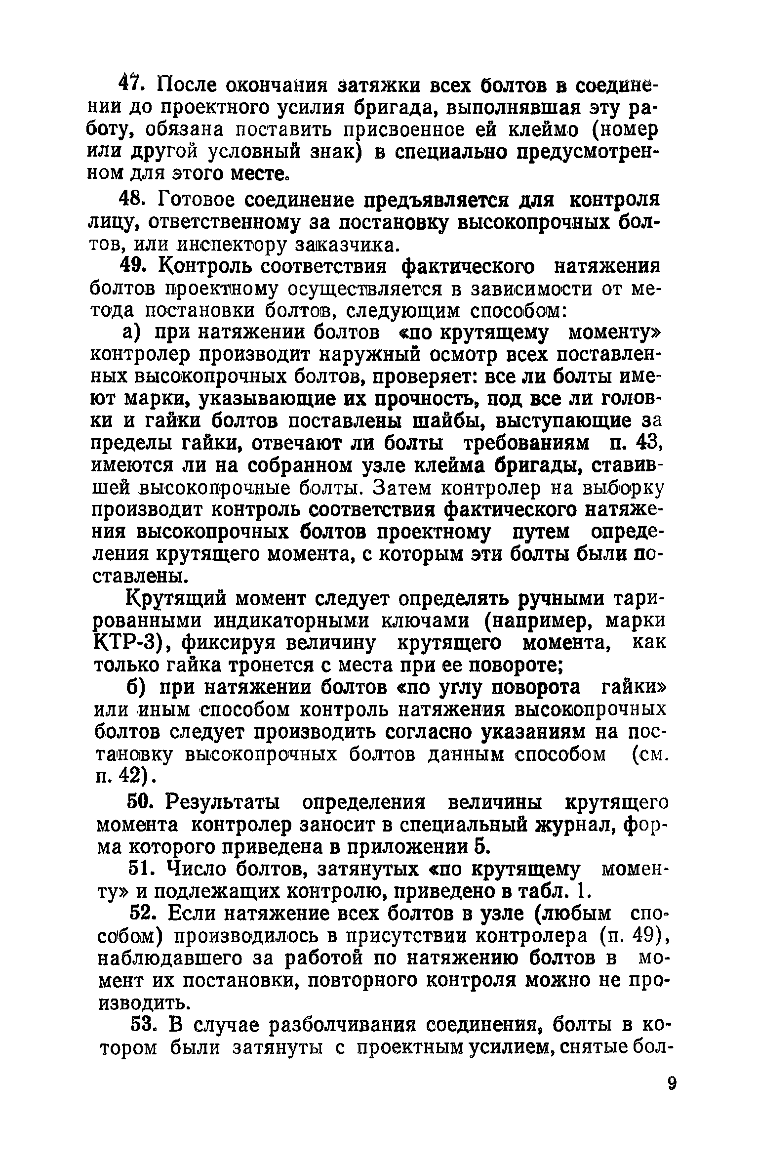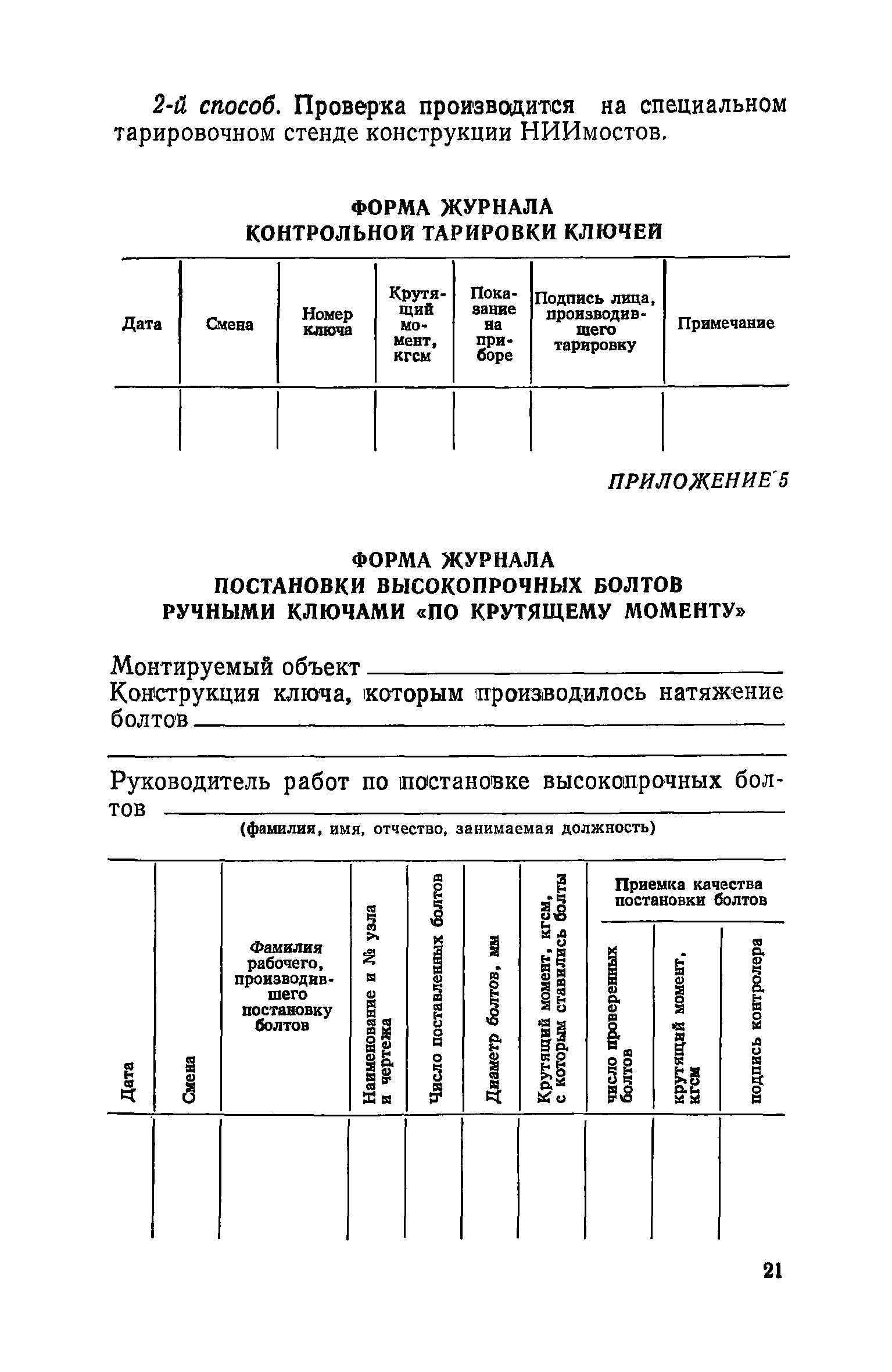 | Оглавление: | 1. Общие указания 2. Указания по производству работ 3. Требования к высокопрочным болтам, гайкам и шайбам Приложение 1. Форма журнала контроля качества подготовки поверхностей соединяемых элементов и деталей Приложение 2. Указания по работе на динамометрическом контрольном приборе ДКП-30М Приложение 3. Форма журнала для записи результатов определения величин крутящего момента Мир на приборе ДКП Приложение 4. Указания по контрольной тарировке ручных индикаторных и сигнальных ключей Приложение 5. Форма журнала постановки высокопрочных болтов ручными ключами "по крутящему моменту" Приложение 6. Определение расчетной площади сечения высокопрочного болта |