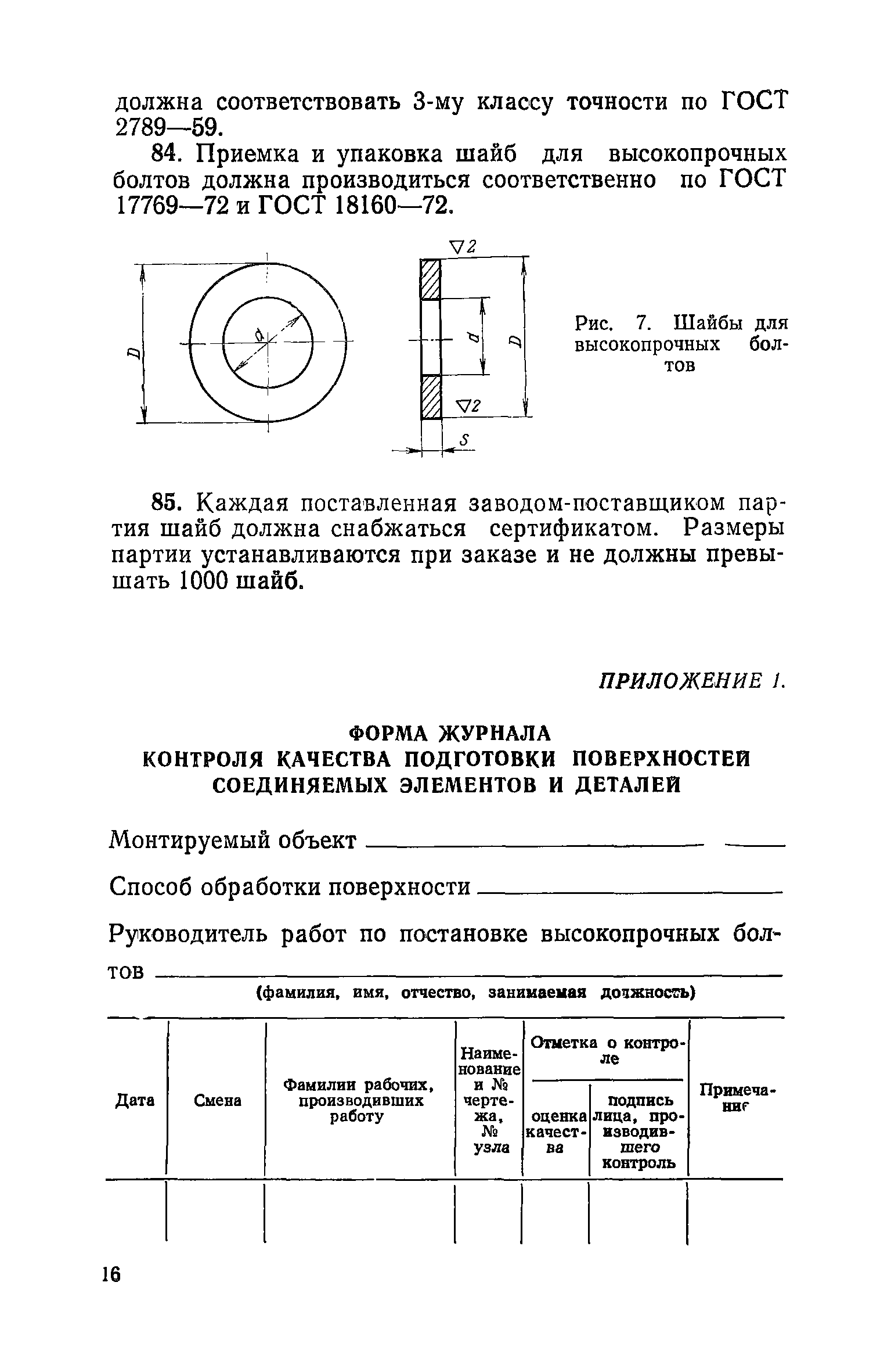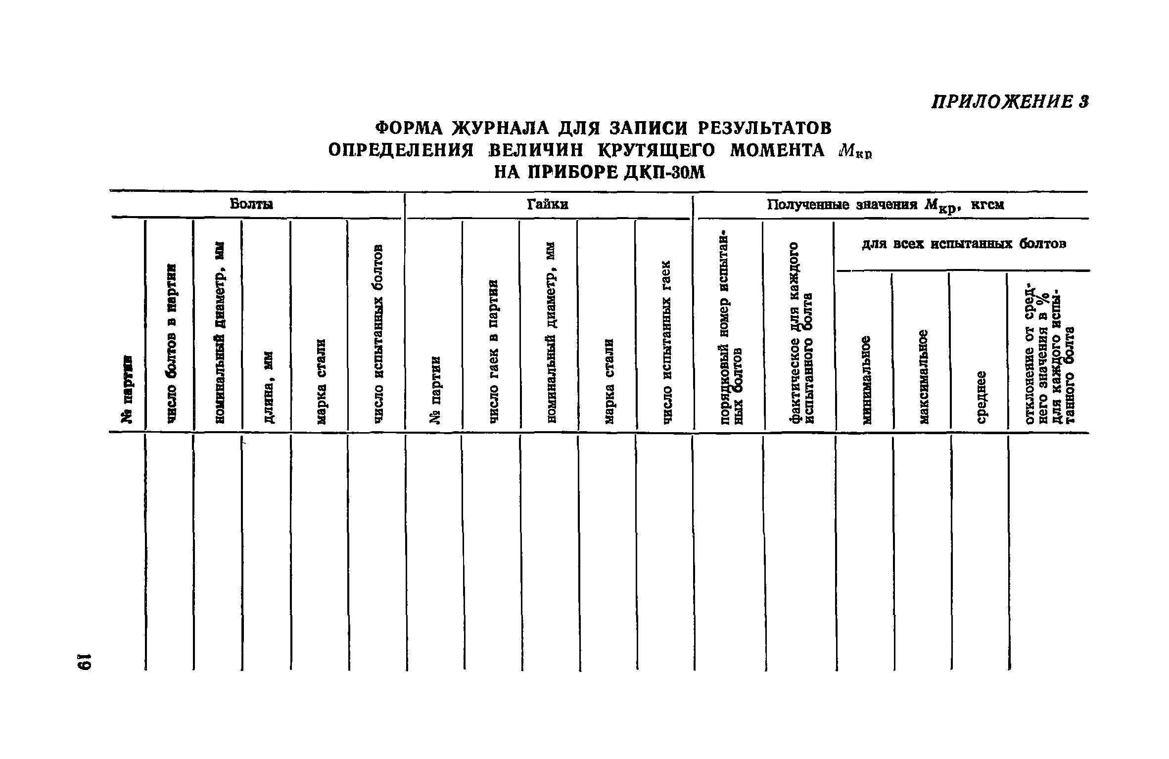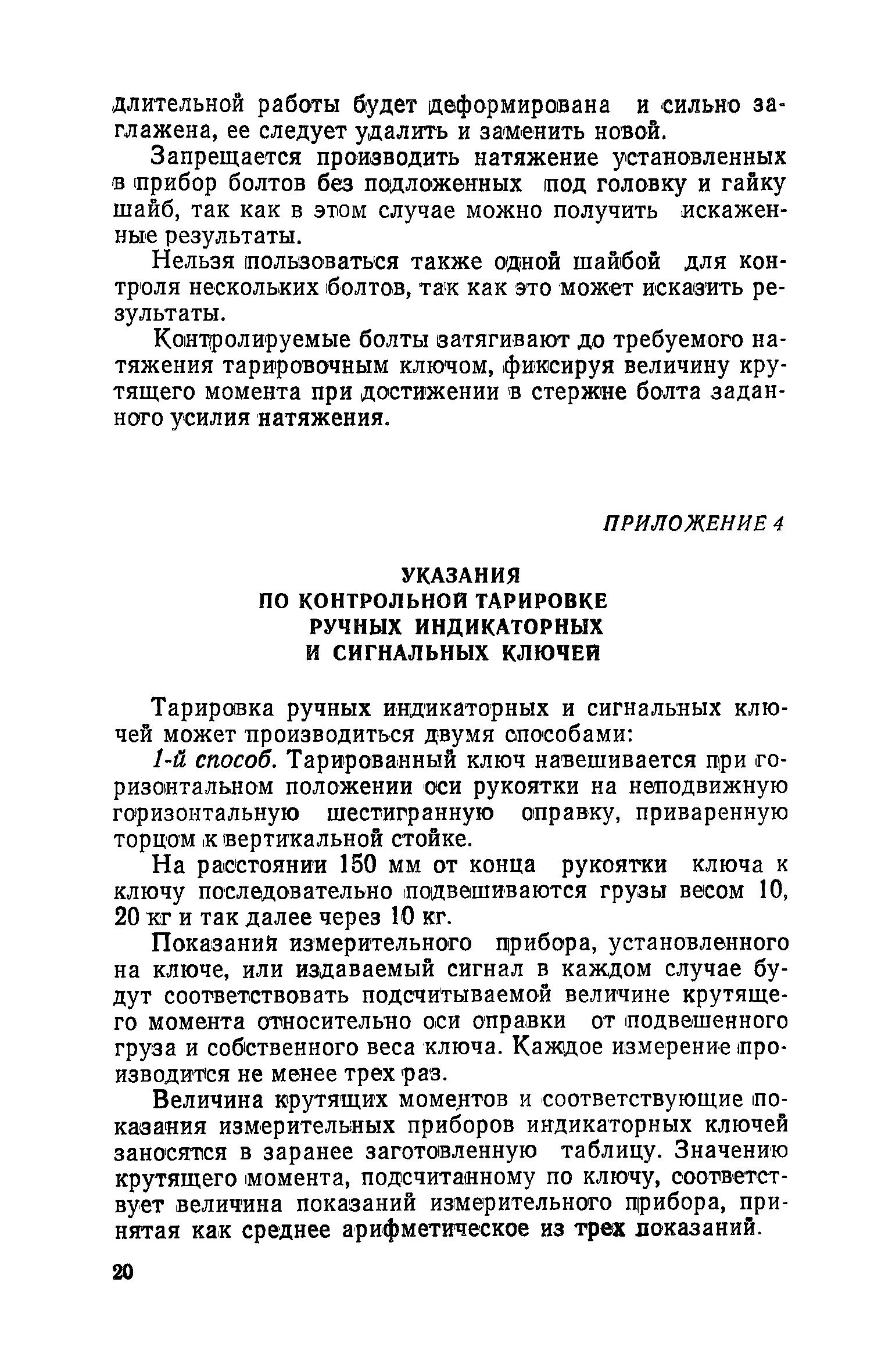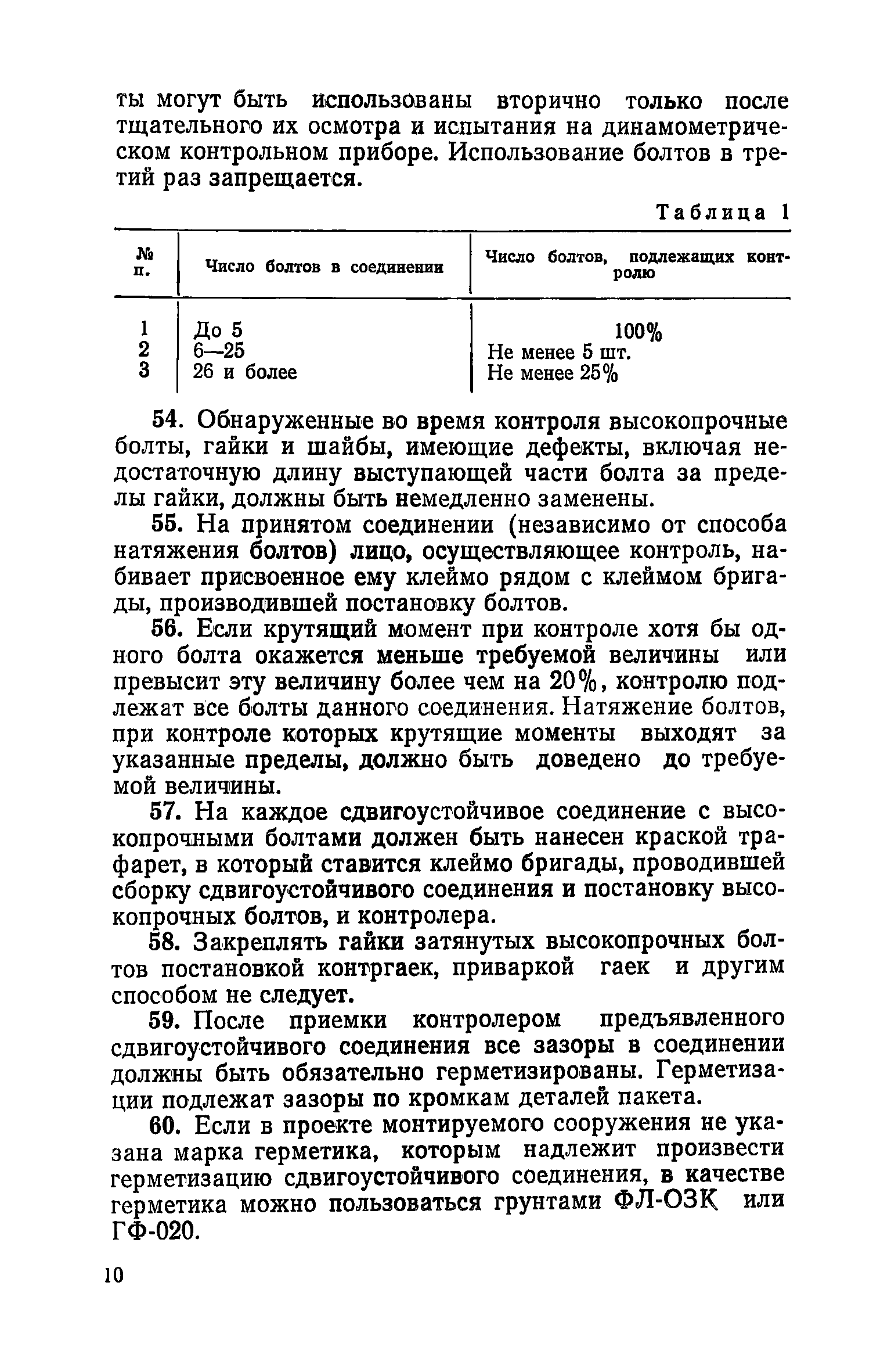 | Оглавление: | 1. Общие указания 2. Указания по производству работ 3. Требования к высокопрочным болтам, гайкам и шайбам Приложение 1. Форма журнала контроля качества подготовки поверхностей соединяемых элементов и деталей Приложение 2. Указания по работе на динамометрическом контрольном приборе ДКП-30М Приложение 3. Форма журнала для записи результатов определения величин крутящего момента Мир на приборе ДКП Приложение 4. Указания по контрольной тарировке ручных индикаторных и сигнальных ключей Приложение 5. Форма журнала постановки высокопрочных болтов ручными ключами "по крутящему моменту" Приложение 6. Определение расчетной площади сечения высокопрочного болта |