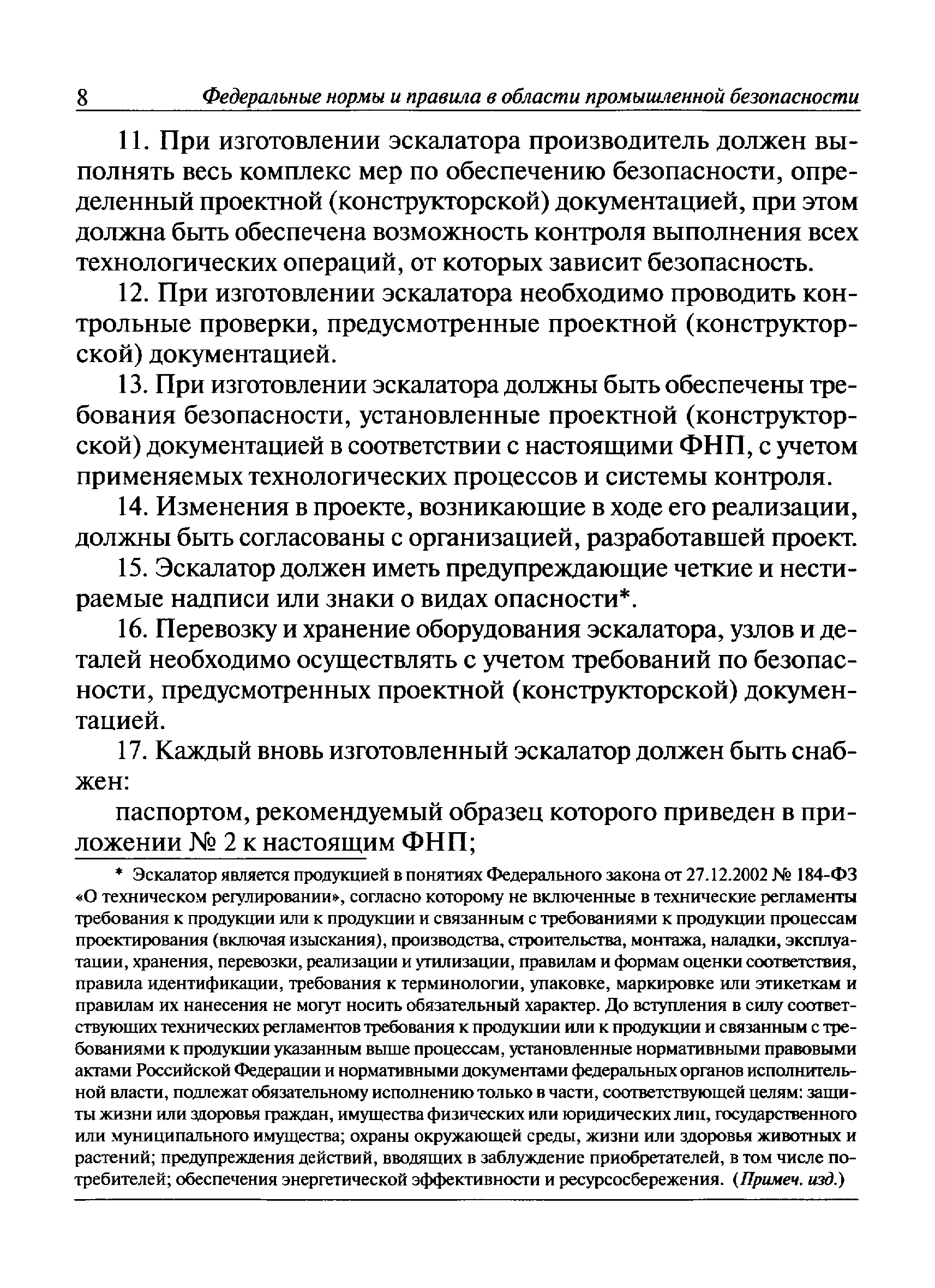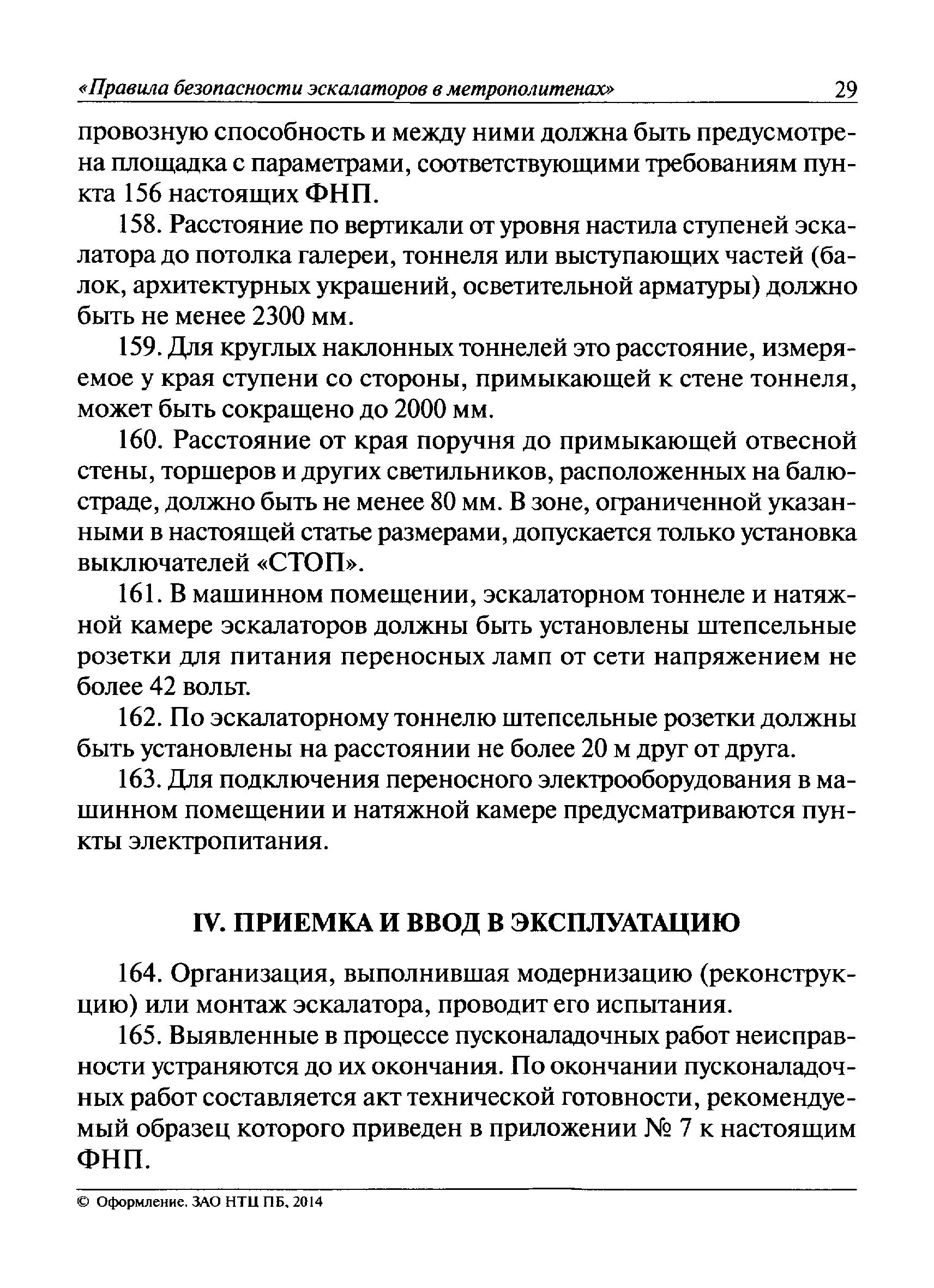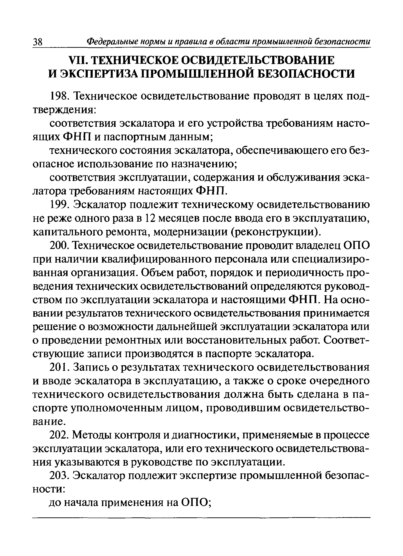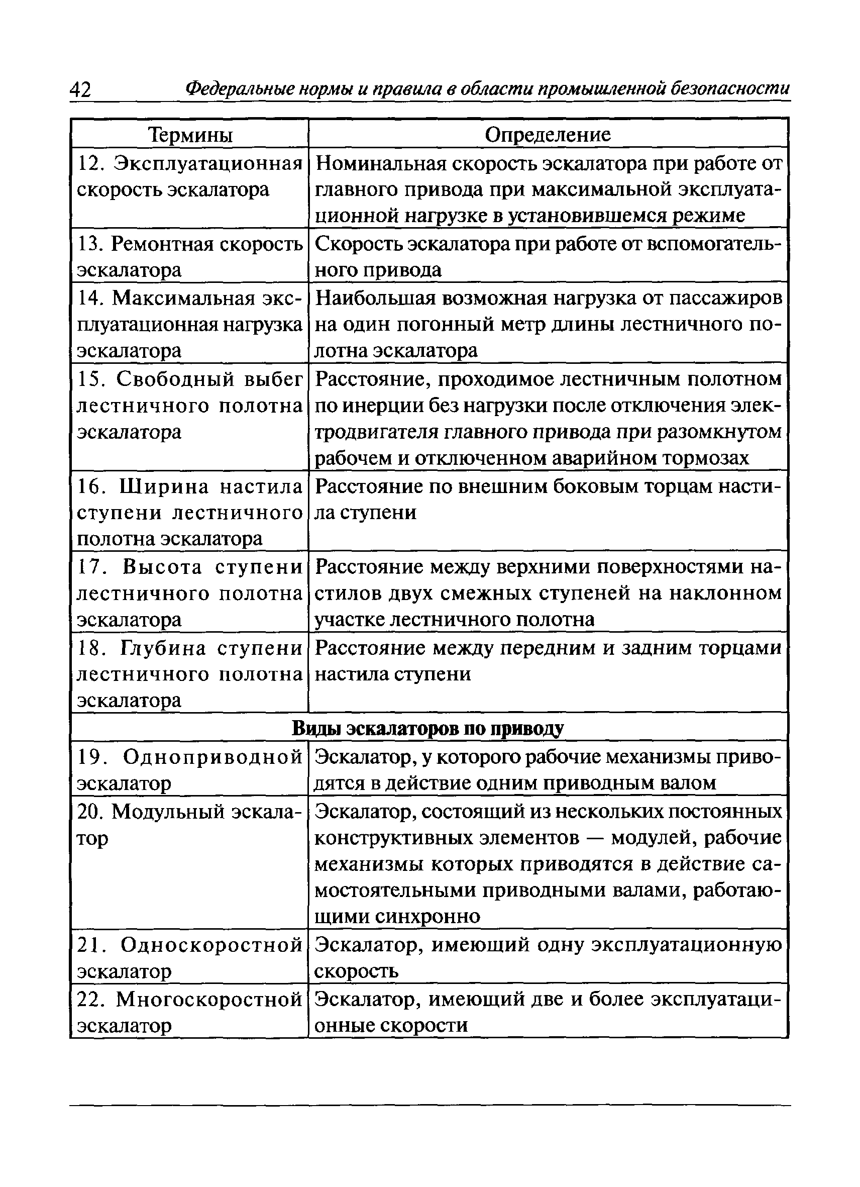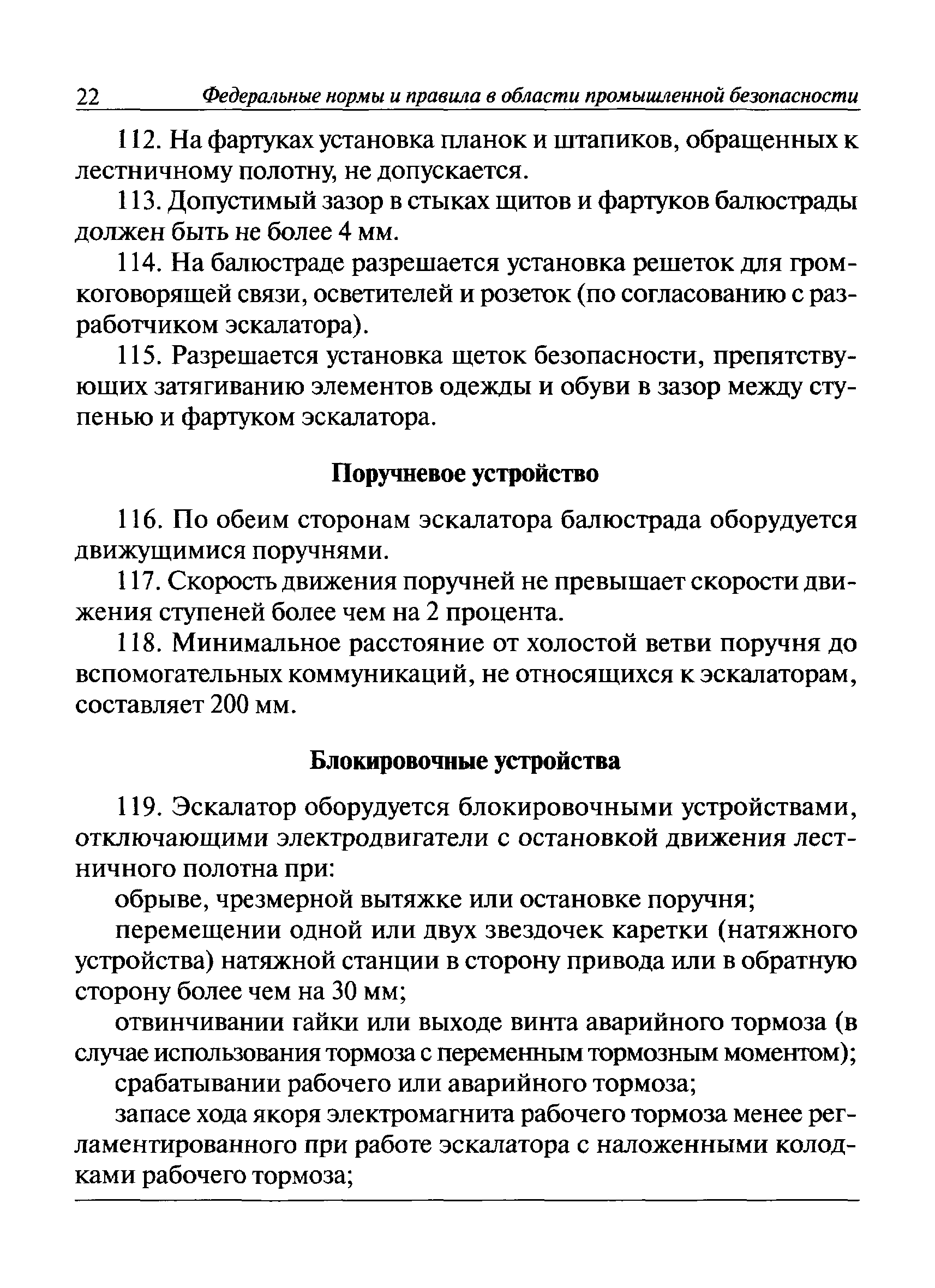 | Оглавление: | I Общие положения II Требования при изготовлении III Общие требования Основные параметры, размеры и нагрузки эскалаторов Материалы ответственных сварных конструкций. Сварка и контроль качества сварки Привод Тормозная система Лестничное полотно Входные площадки Направляющие бегунков ступеней Балюстрада Поручневое устройство Блокировочные устройства Аппараты управления Эскалаторные помещения и установка эскалаторов IV Приемка и ввод в эксплуатацию V Регистрация VI Организация эксплуатации VII Техническое освидетельствование и экспертиза промышленной безопасности VIII Требования к руководству по эксплуатации Приложение 1. Термины и определения Приложение 2. Паспорт эскалатора Приложение 3. Основные параметры эскалаторов Приложение 4. Основные размеры эскалаторов Приложение 5. Основные нагрузки, используемые при расчете и испытаниях эскалаторов Приложение 6. Схема расположения составных частей эскалатора Приложение 7. Акт технической готовности эскалатора Приложение 8. Акт о возможности ввода в эксплуатацию эскалатора |