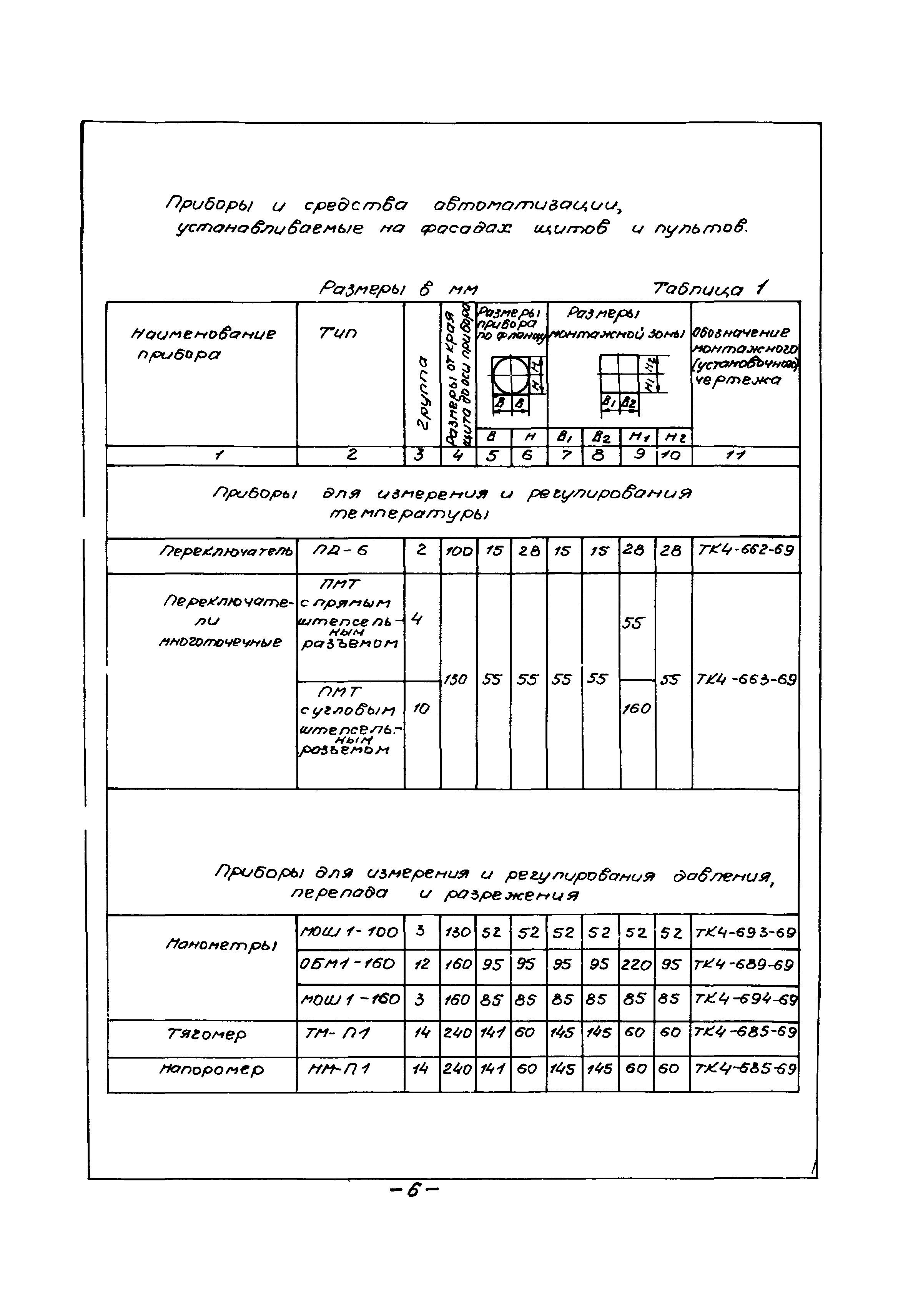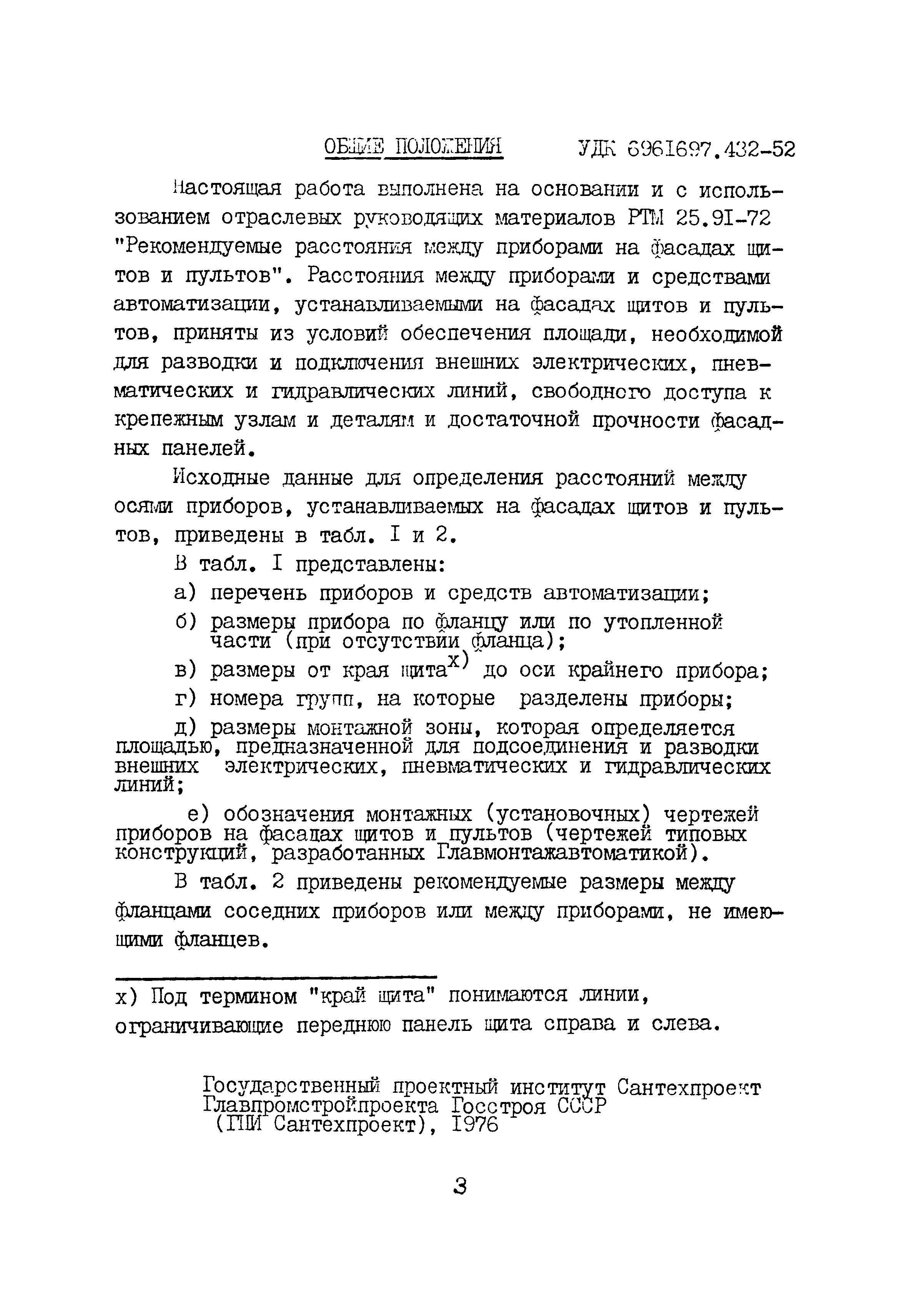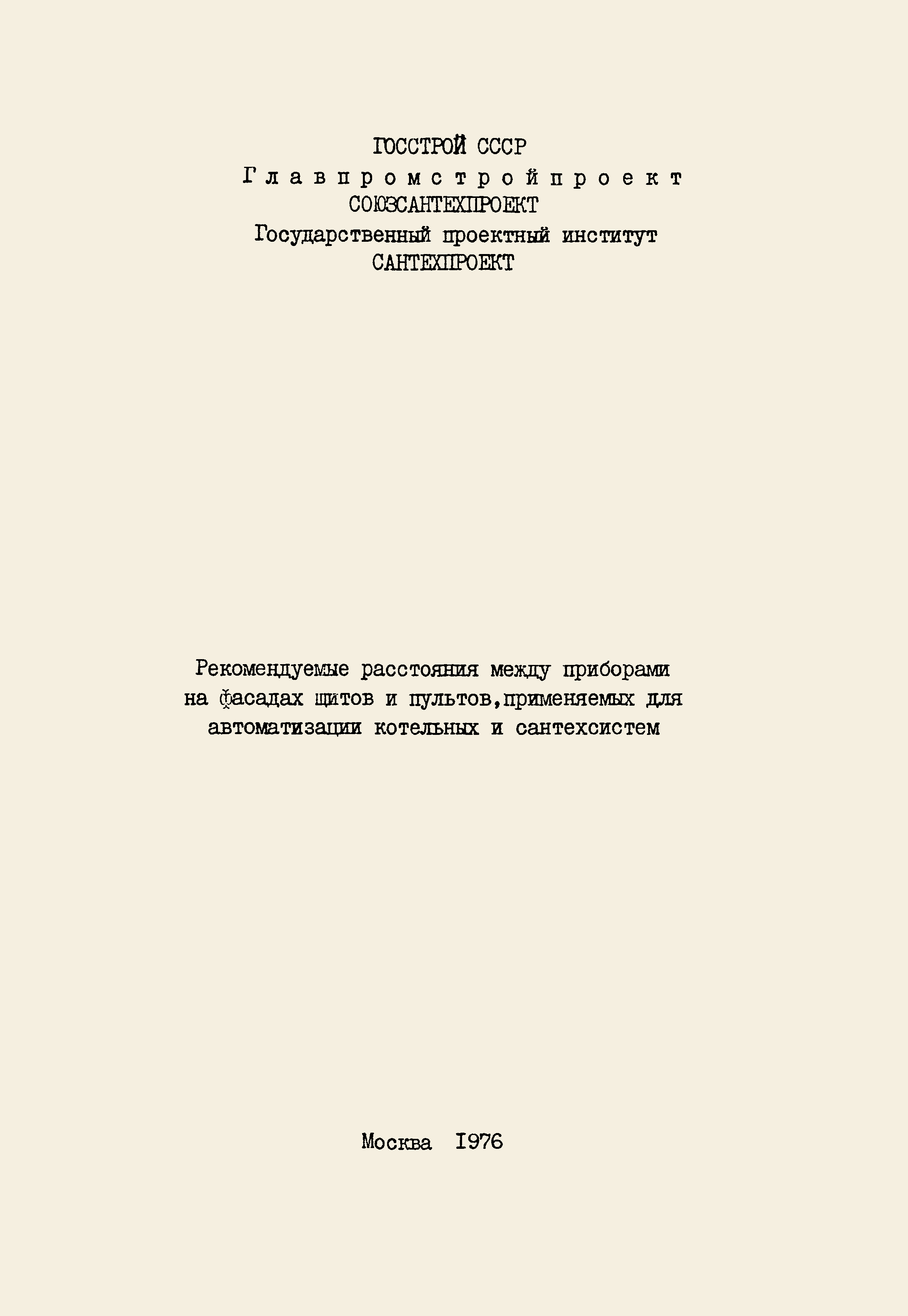 Рекомендуемые расстояния между приборами на фасадах щитов и пультов, применяемых для автоматизации котельных и сантехсистем| Статус: | справочные материалы, мп, тпр | | Название рус.: | Рекомендуемые расстояния между приборами на фасадах щитов и пультов, применяемых для автоматизации котельных и сантехсистем | | Дата добавления в базу: | 01.10.2014 | | Дата актуализации: | 01.01.2021 | | Область применения: | Документ действует при определении расстояния между приборами на фасадах щитов и пультов, применяемых для автоматизации котельных и сантехсистем | | Оглавление: | Общие положения Порядок расчета Приборы и средства автоматизации, устанавливаемые на фасадах щитов и пультов (таблица 1) Рекомендуемые расстояния между приборами и средствами автоматизации на фасадах щитов и пультов (таблица 2) Приборы и средства автоматизации, устанавливаемые на фасадах щитов и пультов (таблица 1) Рекомендуемые расстояния между приборами и средствами автоматизации на фасадах щитов и пультов (таблица 2) | | Разработан: | ГПИ Сантехпроект Госстроя СССР