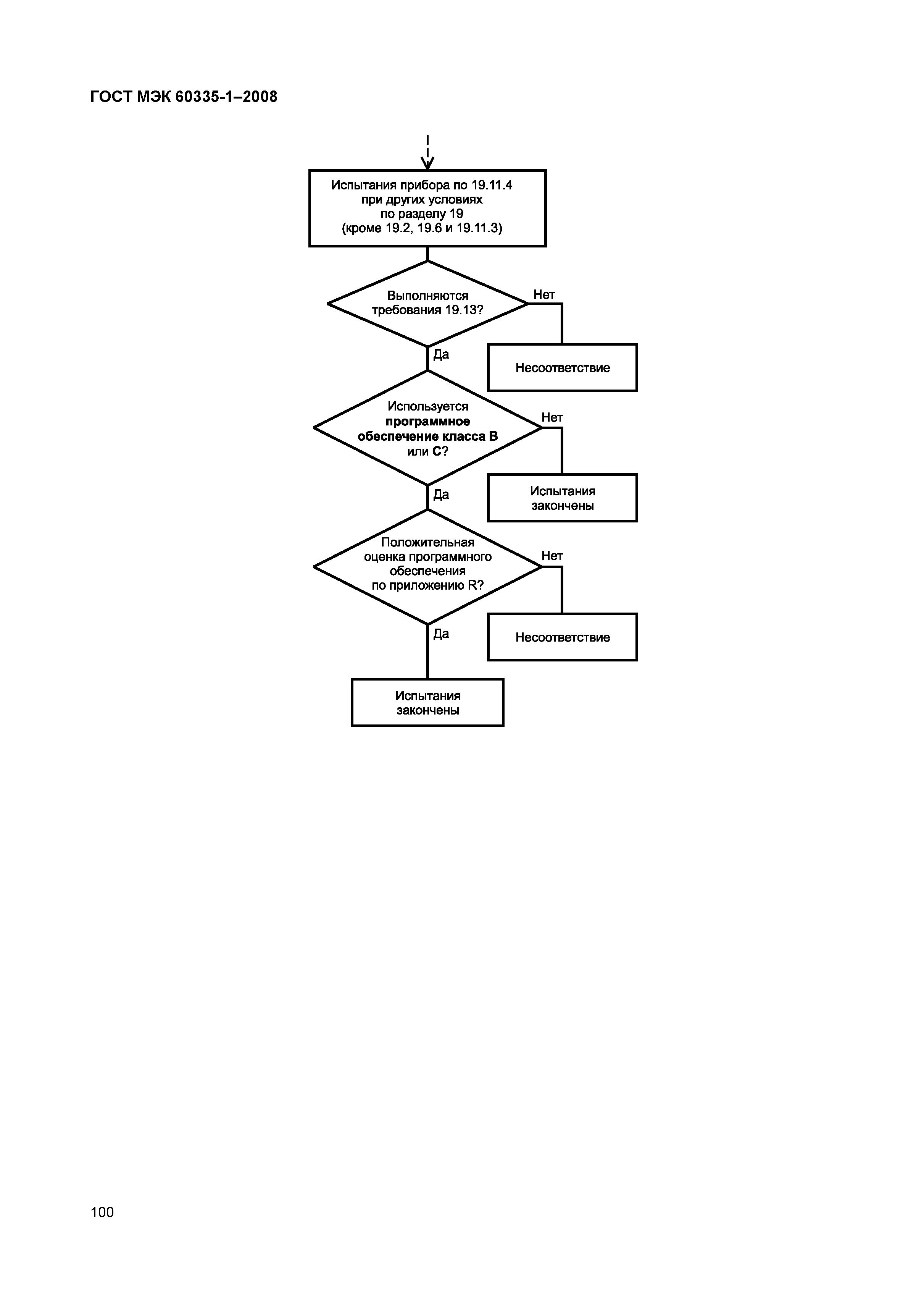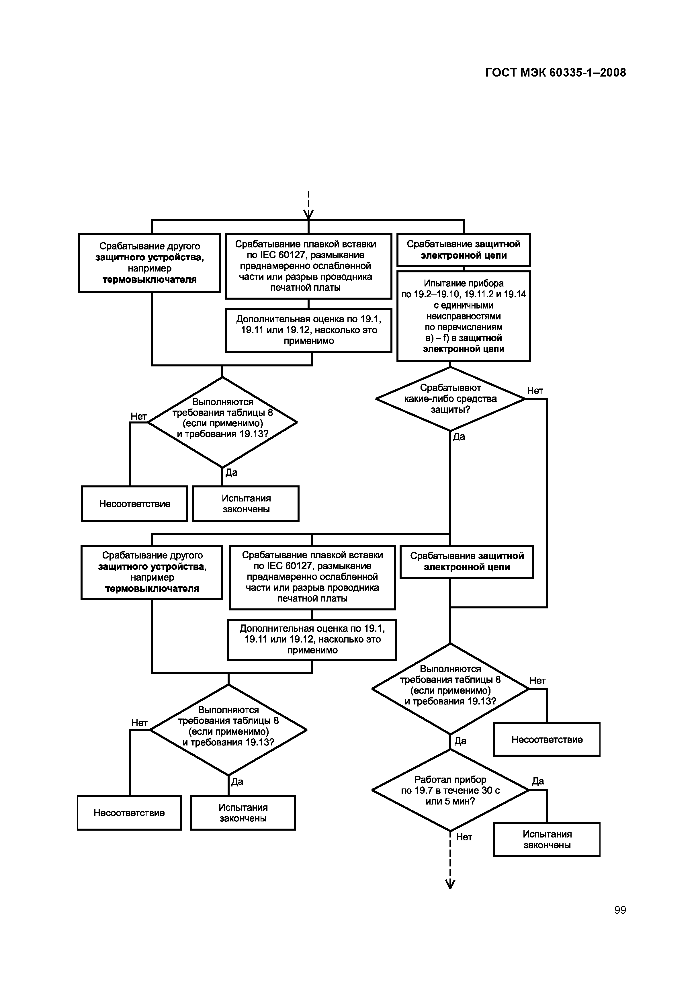 | Оглавление: | 1 Область применения 2 Нормативные ссылки 3 Термины и определения 4 Общие требования 5 Общие условия проведения испытаний 6 Классификация 7 Маркировка и инструкции 8 Защита от контакта с частями, находящимися под напряжением 9 Пуск электромеханических приборов 10 Потребляемые мощность и ток 11 Нагрев 12 Пробел 13 Ток утечки и электрическая прочность при рабочей температуре 14 Перенапряжения переходного процесса 15 Влагостойкость 17 Защита от перегрузки трансформаторов и соединенных с ними цепей 18 Износостойкость 19 Ненормальный режим работы 20 Устойчивость и механические опасности 21 Механическая прочность 22 Конструкция 23 Внутренняя проводка 24 Компоненты 25 Присоединение к источнику питания и внешние гибкие шнуры 26 Зажимы для внешних проводов 27 Средства для заземления 28 Винты и соединения 29 Зазоры, пути утечки и сплошная изоляция 30 Теплостойкость и огнестойкость 31 Стойкость к коррозии 32 Радиация, токсичность и подобные опасности Приложение А (справочное) Контрольные испытания Приложение В (обязательное) Приборы, питающиеся от перезаряжаемых батарей Приложение С (обязательное) Испытание двигателей на старение Приложение D (обязательное) Устройства тепловой защиты двигателей Приложение Е (обязательное) Испытание игольчатым пламенем Приложение F (обязательное) Конденсаторы Приложение G (обязательное) Безопасные разделительные трансформаторы Приложение Н (обязательное) Выключатели Приложение I (обязательное) двигатели с основной изоляцией, которая не соответствует номинальному напряжению прибора Приложение J (обязательное) Печатные платы с покрытием Приложение К (обязательное) Категории перенапряжения Приложение L (справочное) Руководство по измерению зазоров и путей утечки Приложение М (обязательное) Степень загрязнения Приложение N (обязательное) Испытание на трекингостойкость Приложение О (справочное) Выбор и последовательность испытаний по разделу 30 Приложение Р (справочное) Руководство по применению настоящего стандарта к приборам, используемым в теплом влажном равномерном климате Приложение Q (справочное) Последовательность испытаний по оценке электронных цепей Приложение R (обязательное) Оценка программного обеспечения Приложение ДА (справочное) Сведения о соответствии межгосударственных стандартов ссылочным международным стандартам Библиография Алфавитный указатель терминов на русском языке |