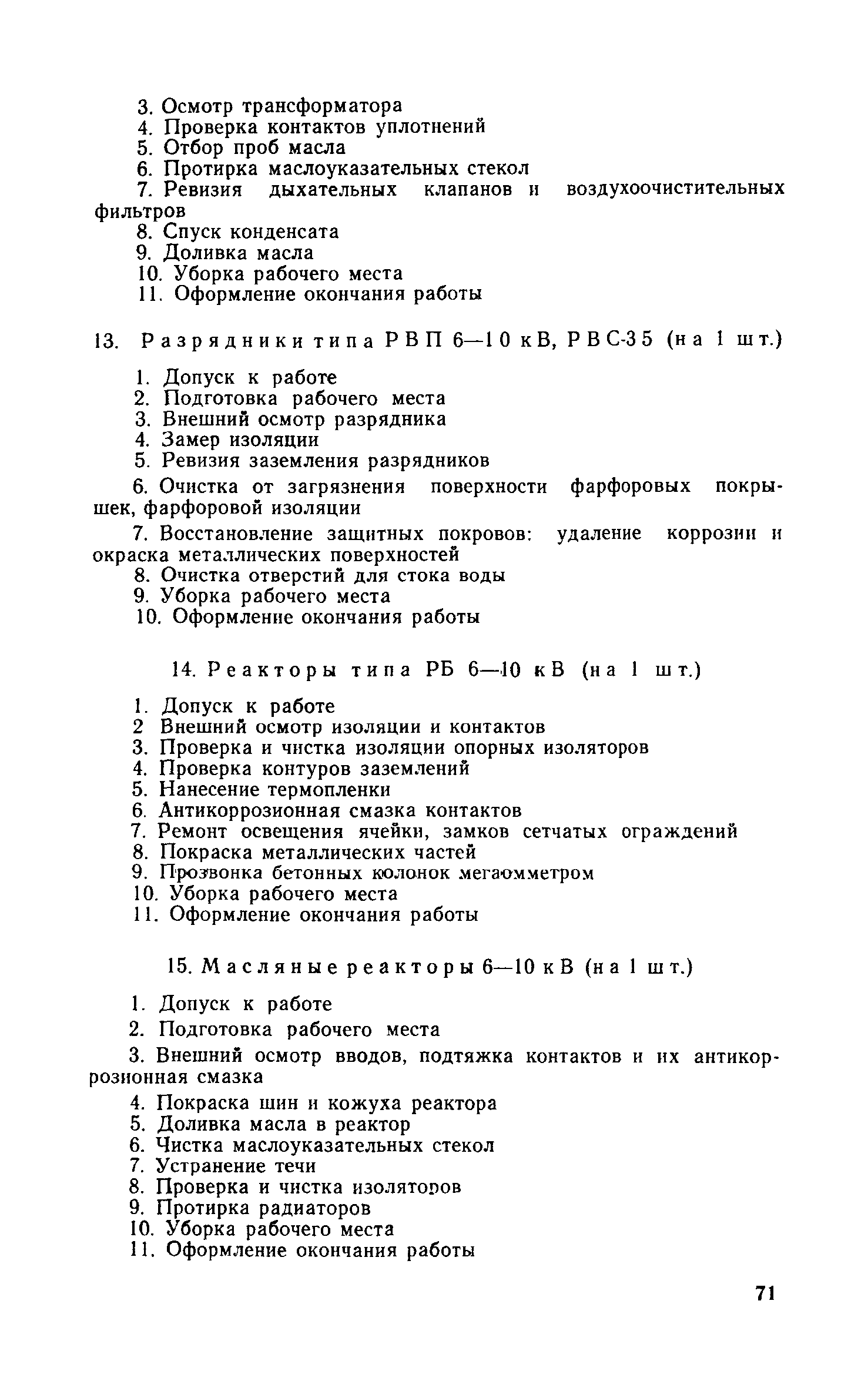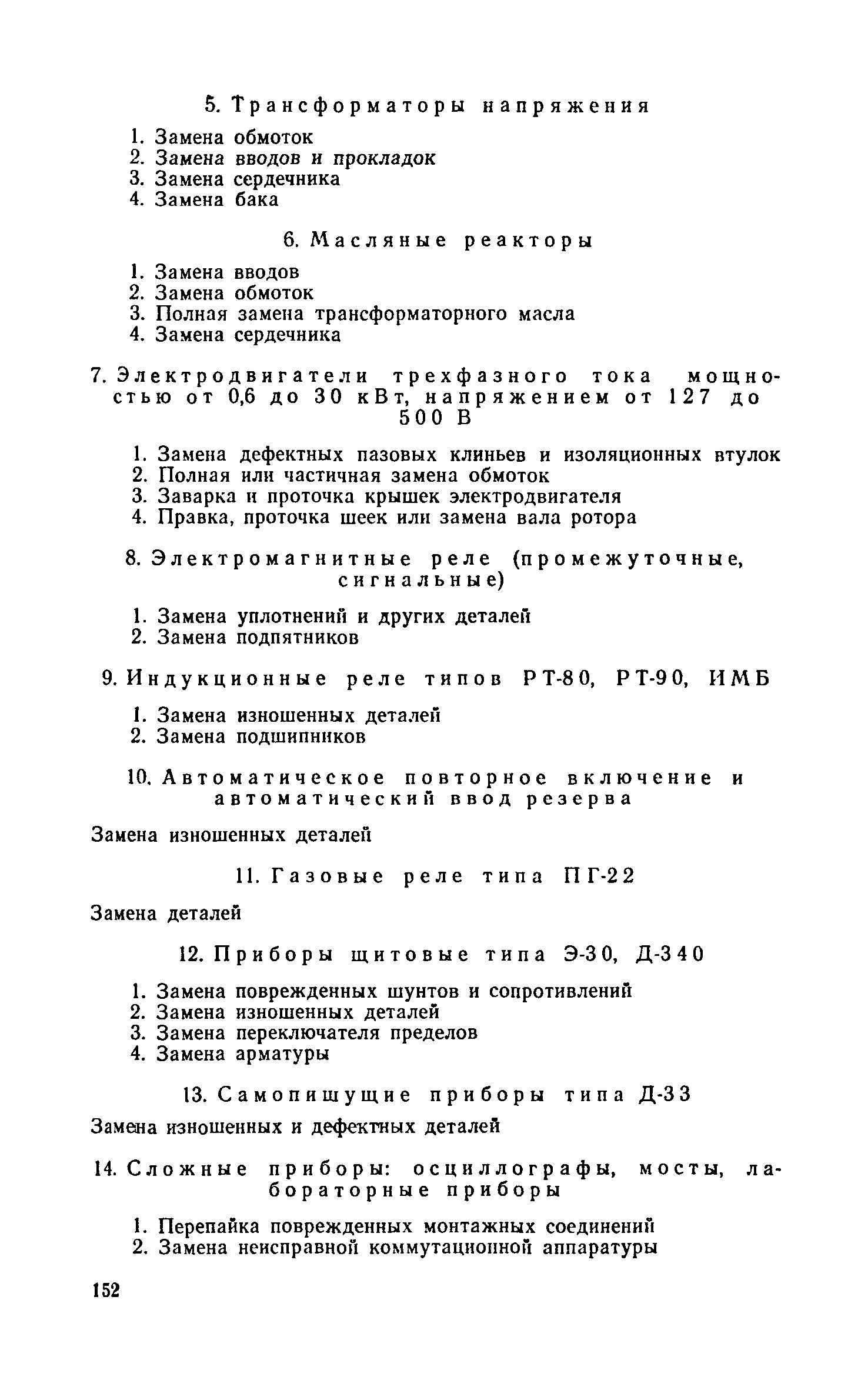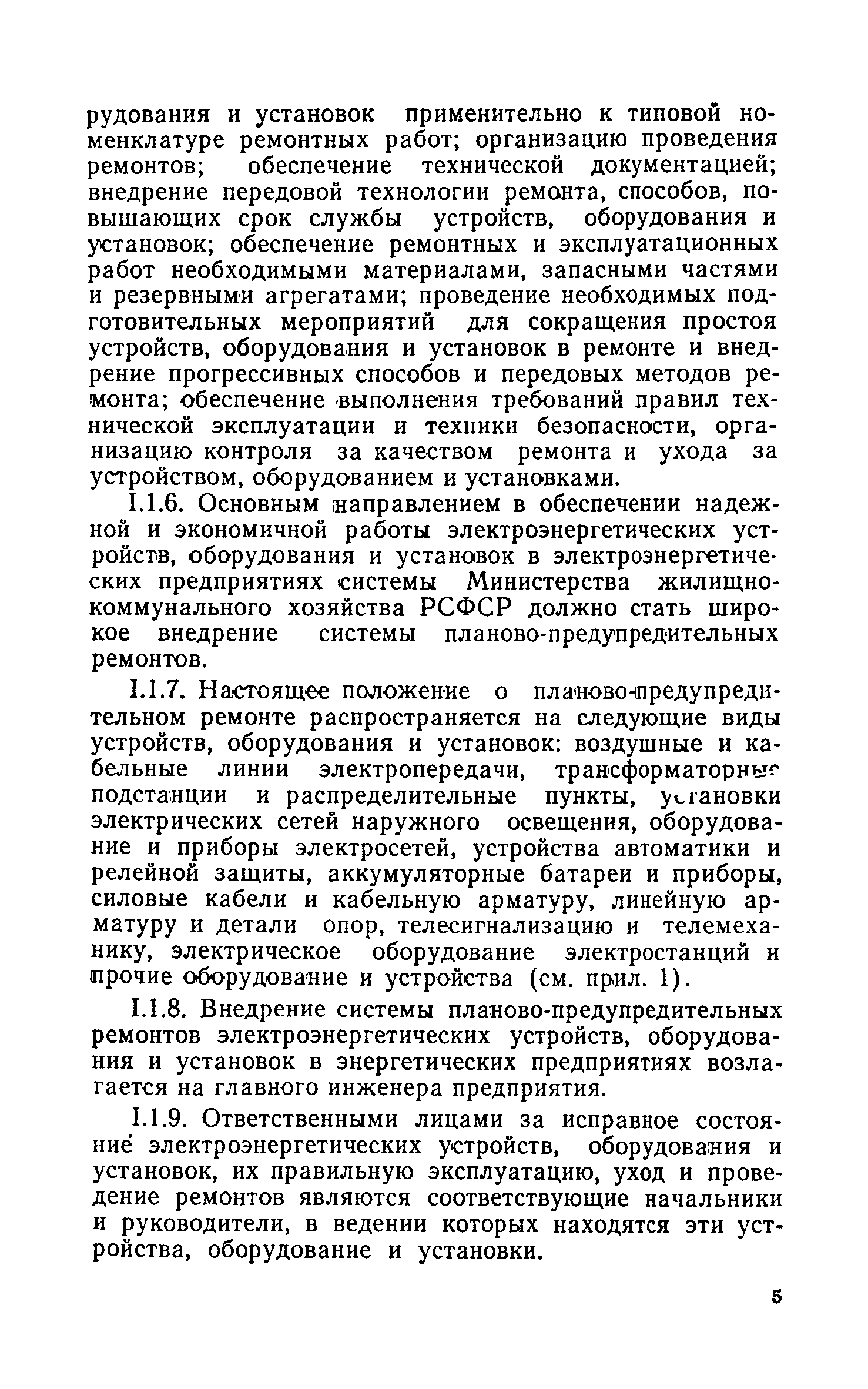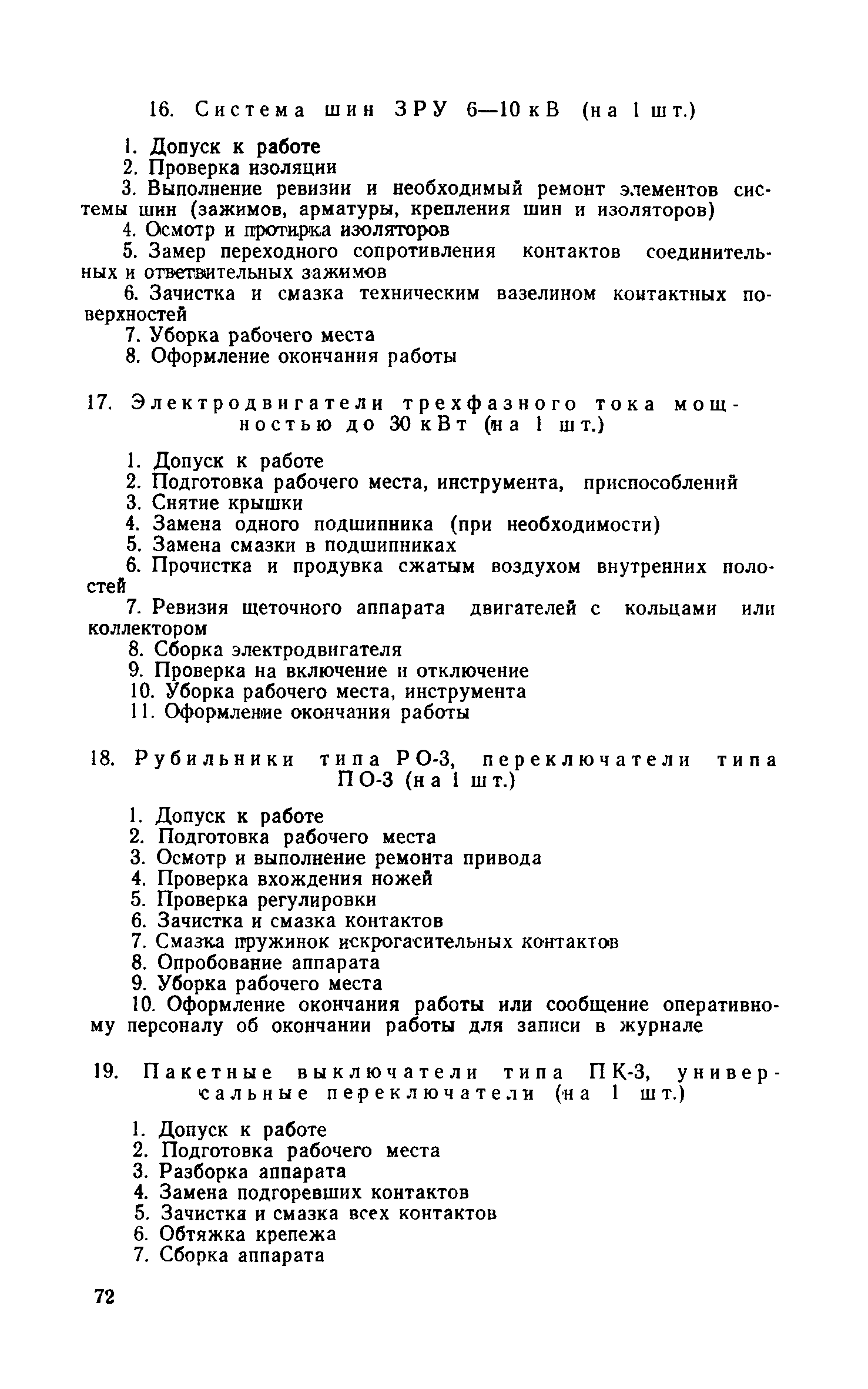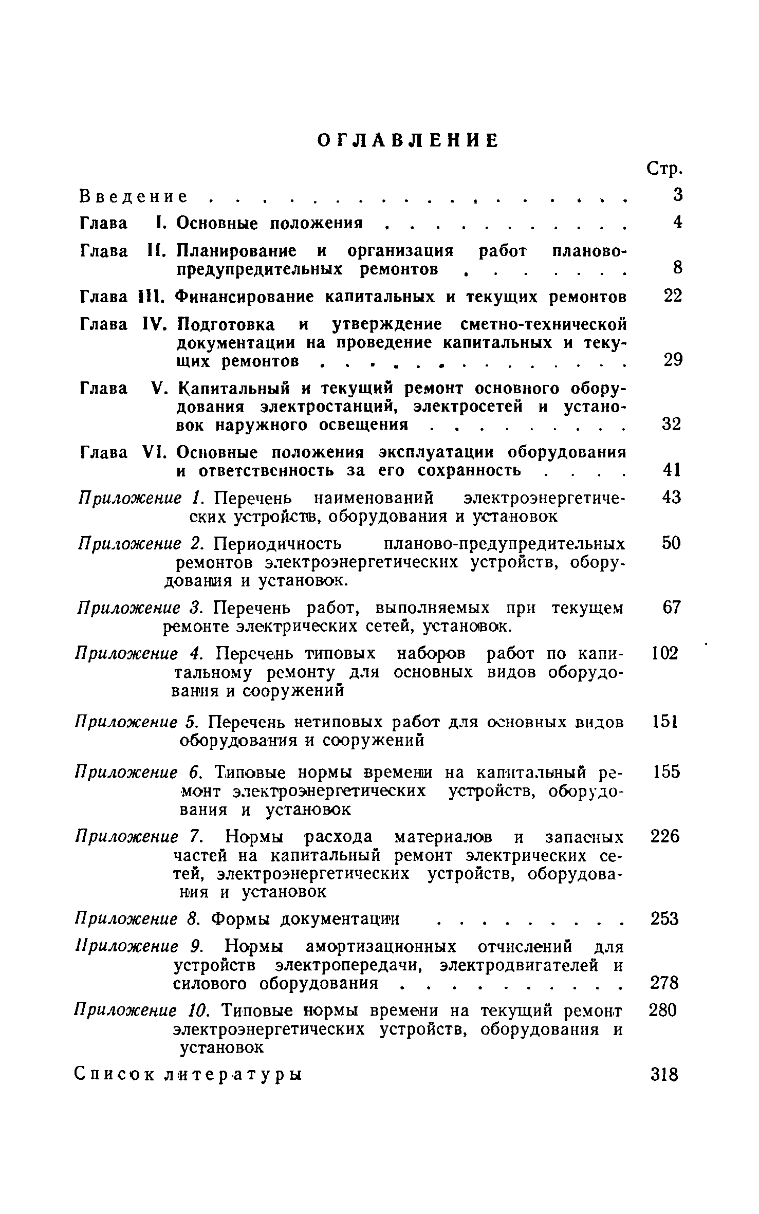Временное положение о планово-предупредительном ремонте электроэнергетических устройств, оборудования и установок электрических сетей, наружного освещения и электрической части электростанций системы Минжилкомхоза РСФСР| Статус: | отменен в рф | | Название рус.: | Временное положение о планово-предупредительном ремонте электроэнергетических устройств, оборудования и установок электрических сетей, наружного освещения и электрической части электростанций системы Минжилкомхоза РСФСР | | Дата добавления в базу: | 01.10.2014 | | Дата актуализации: | 01.01.2021 | | Дата введения: | 01.01.1979 | | Дата окончания срока действия: | 25.06.2020 | | Область применения: | В документе рассматриваются планирование, организация и финансирование капитальных и текущих ремонтов электроэнергетического оборудования. Даны перечни наименований электроэнергетического оборудования, на которое распространяется Положение. Приведены нормы расхода материалов и запасных частей на ремонт, нормы времени на выполнение этих работ, а также формы документации оформления планово-предупредительных ремонтов. Временное положение предназначено для работников, занимающихся эксплуатацией электрооборудования предприятий системы Минжилкомхоза РСФСР. | | Оглавление: | Введение Глава I. Основные положения Глава II. Планирование и организация работ планово-предупредительных ремонтов Глава III. Финансирование капитальных и текущих ремонтов Глава IV. Подготовка и утверждение сметно-технической документации на проведение капитальных и текущих ремонтов Глава V. Капитальный и текущий ремонт основного оборудования электростанций, электросетей и установок наружного освещения Глава VI. Основные положения эксплуатации оборудования и ответственность за его сохранность Приложение 1. Перечень наименований электроэнергетических устройств, оборудования и установок Приложение 2. Периодичность планово-предупредительных ремонтов электроэнергетических устройств, оборудования и установок Приложение 3. Перечень работ, выполняемых при текущем ремонте электрических сетей, установок Приложение 4. Перечень типовых наборов работ по капитальному ремонту для основных видов оборудования и сооружений Приложение 5. Перечень нетиповых работ для основных видов оборудования и сооружений Приложение 6. Типовые нормы времени на капитальный ремонт электроэнергетических устройств, оборудования и установок Приложение 7. Нормы расхода материалов и запасных частей на капитальный ремонт электрических сетей, электроэнергетических устройств, оборудования и установок частей на капитальный ремонт электрических сетей, электроэнергетических устройств, оборудования и установок Приложение 8. Формы документации Приложение 9. Нормы амортизационных отчислений для устройств электропередачи, электродвигателей и силового оборудования Приложение 10. Типовые нормы времени на текущий ремонт электроэнергетических устройств, оборудования и установок Список литературы | | Разработан: | Оргкоммунэнерго