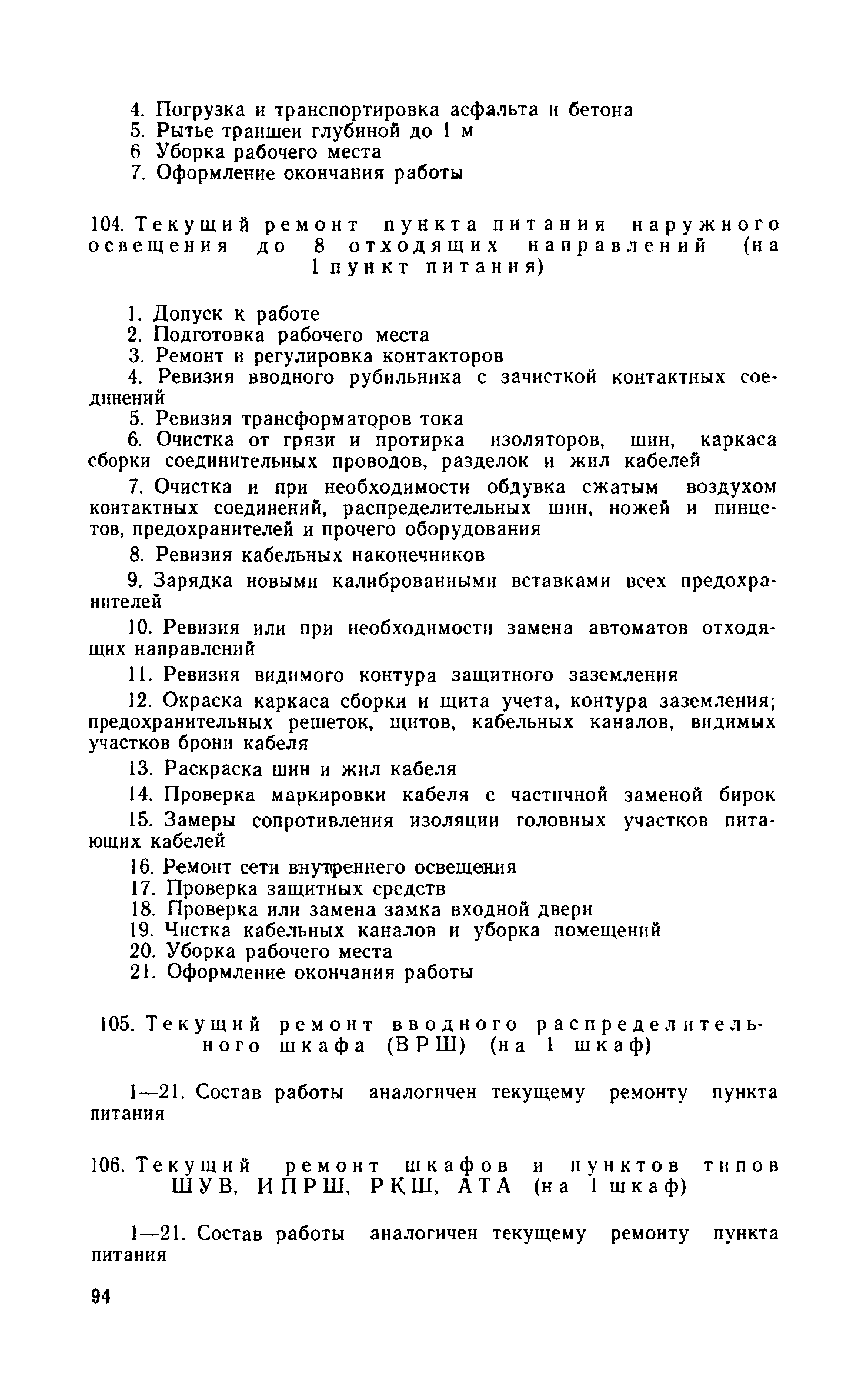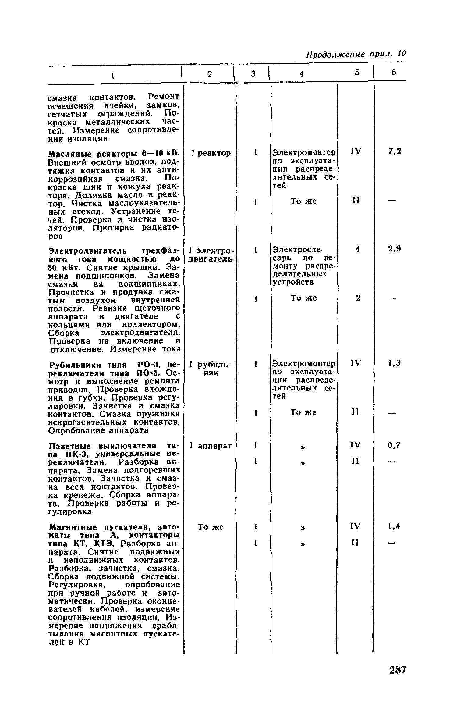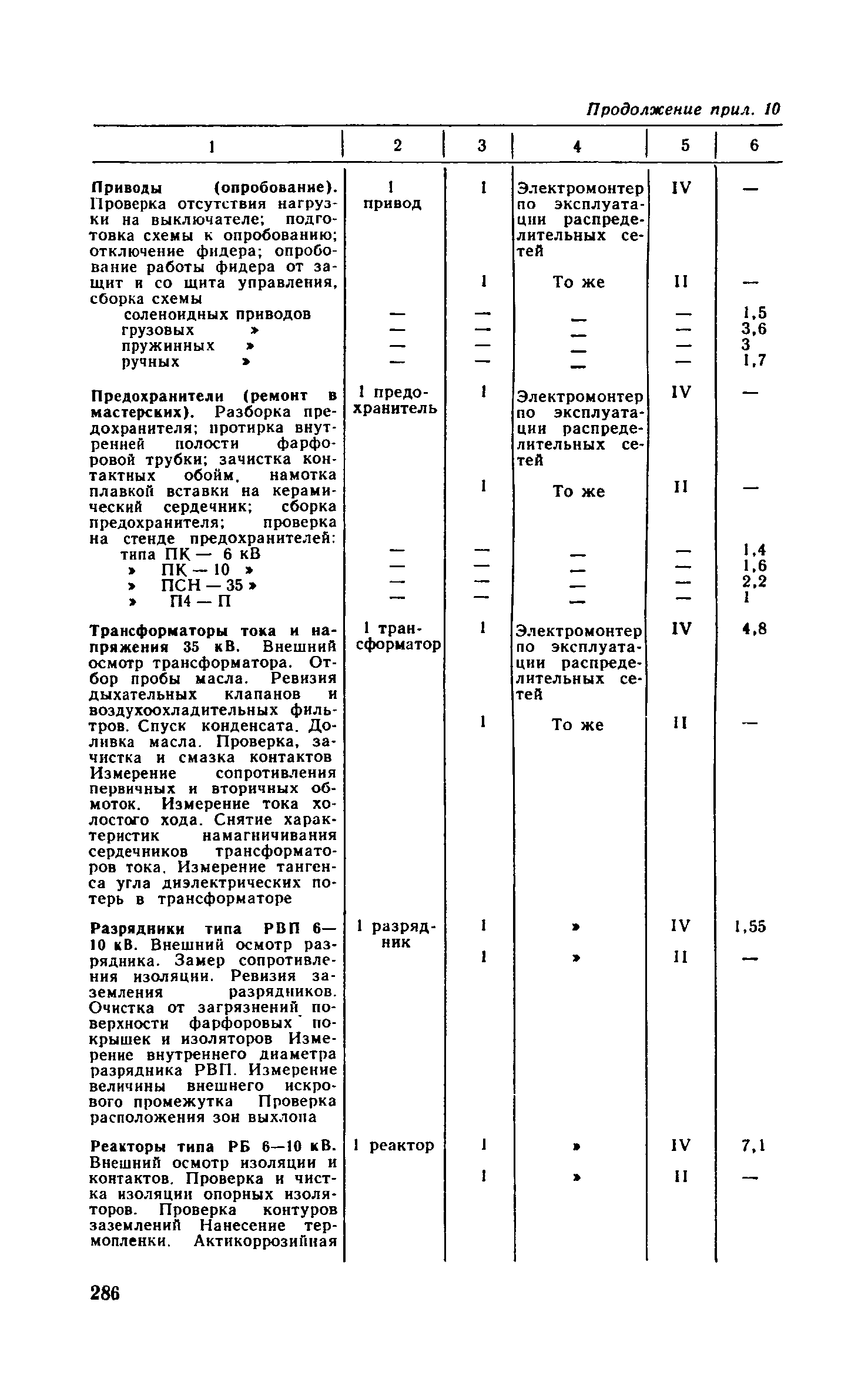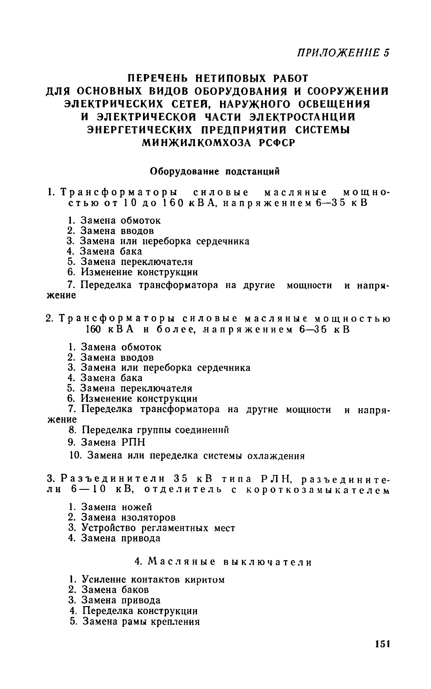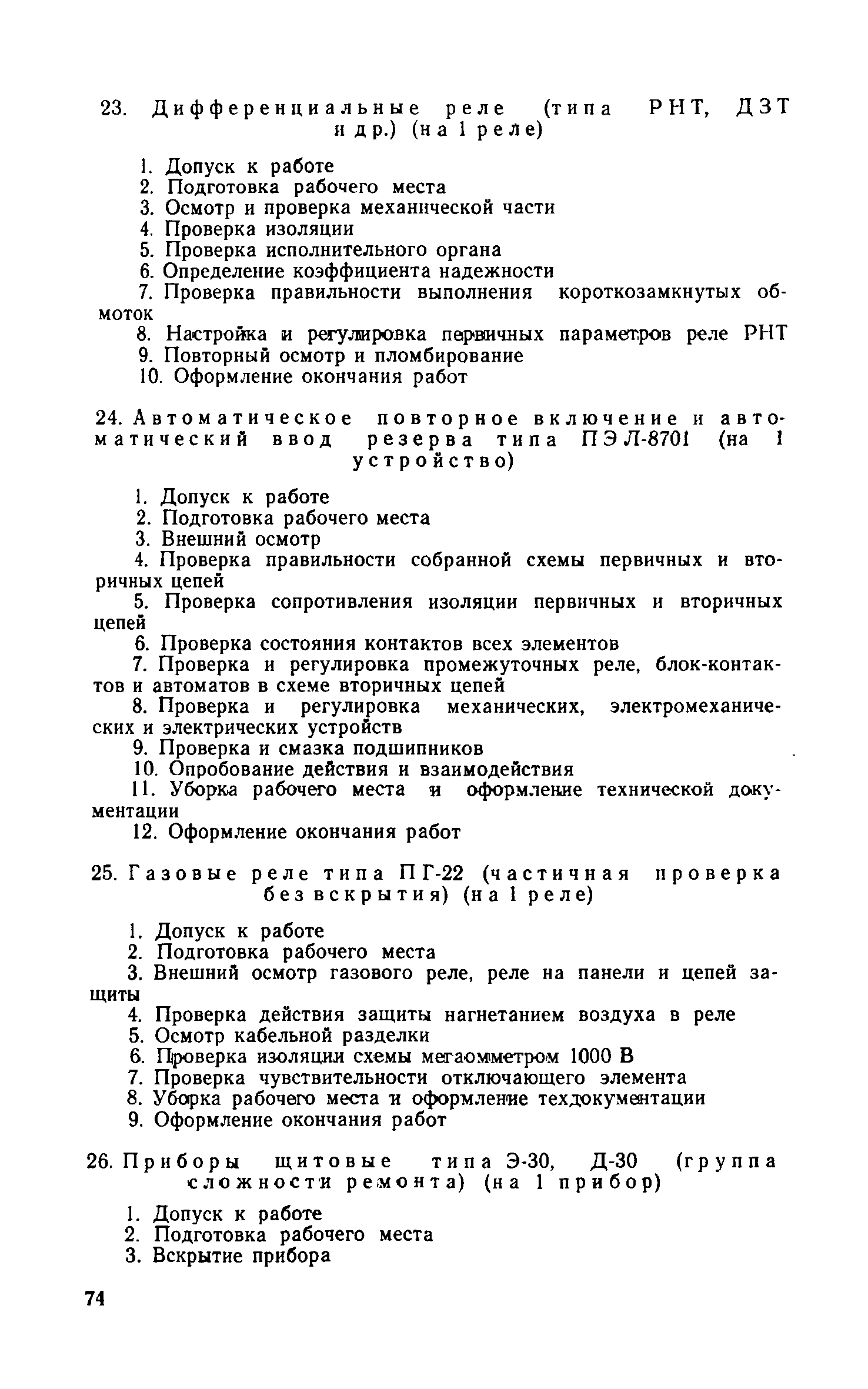 Временное положение о планово-предупредительном ремонте электроэнергетических устройств, оборудования и установок электрических сетей, наружного освещения и электрической части электростанций системы Минжилкомхоза РСФСР| Статус: | отменен в рф | | Название рус.: | Временное положение о планово-предупредительном ремонте электроэнергетических устройств, оборудования и установок электрических сетей, наружного освещения и электрической части электростанций системы Минжилкомхоза РСФСР | | Дата добавления в базу: | 01.10.2014 | | Дата актуализации: | 01.01.2021 | | Дата введения: | 01.01.1979 | | Дата окончания срока действия: | 25.06.2020 | | Область применения: | В документе рассматриваются планирование, организация и финансирование капитальных и текущих ремонтов электроэнергетического оборудования. Даны перечни наименований электроэнергетического оборудования, на которое распространяется Положение. Приведены нормы расхода материалов и запасных частей на ремонт, нормы времени на выполнение этих работ, а также формы документации оформления планово-предупредительных ремонтов. Временное положение предназначено для работников, занимающихся эксплуатацией электрооборудования предприятий системы Минжилкомхоза РСФСР. | | Оглавление: | Введение Глава I. Основные положения Глава II. Планирование и организация работ планово-предупредительных ремонтов Глава III. Финансирование капитальных и текущих ремонтов Глава IV. Подготовка и утверждение сметно-технической документации на проведение капитальных и текущих ремонтов Глава V. Капитальный и текущий ремонт основного оборудования электростанций, электросетей и установок наружного освещения Глава VI. Основные положения эксплуатации оборудования и ответственность за его сохранность Приложение 1. Перечень наименований электроэнергетических устройств, оборудования и установок Приложение 2. Периодичность планово-предупредительных ремонтов электроэнергетических устройств, оборудования и установок Приложение 3. Перечень работ, выполняемых при текущем ремонте электрических сетей, установок Приложение 4. Перечень типовых наборов работ по капитальному ремонту для основных видов оборудования и сооружений Приложение 5. Перечень нетиповых работ для основных видов оборудования и сооружений Приложение 6. Типовые нормы времени на капитальный ремонт электроэнергетических устройств, оборудования и установок Приложение 7. Нормы расхода материалов и запасных частей на капитальный ремонт электрических сетей, электроэнергетических устройств, оборудования и установок частей на капитальный ремонт электрических сетей, электроэнергетических устройств, оборудования и установок Приложение 8. Формы документации Приложение 9. Нормы амортизационных отчислений для устройств электропередачи, электродвигателей и силового оборудования Приложение 10. Типовые нормы времени на текущий ремонт электроэнергетических устройств, оборудования и установок Список литературы | | Разработан: | Оргкоммунэнерго