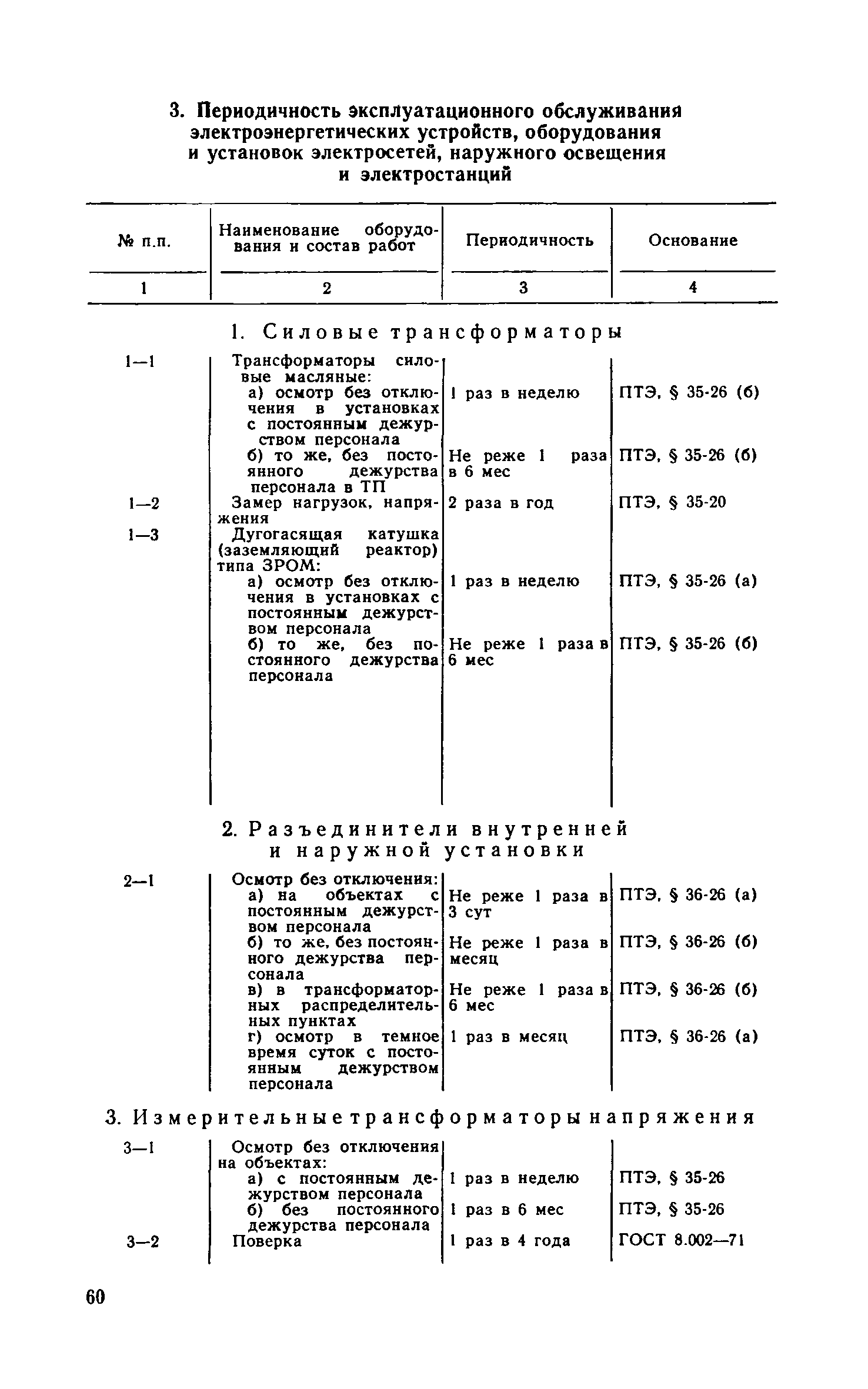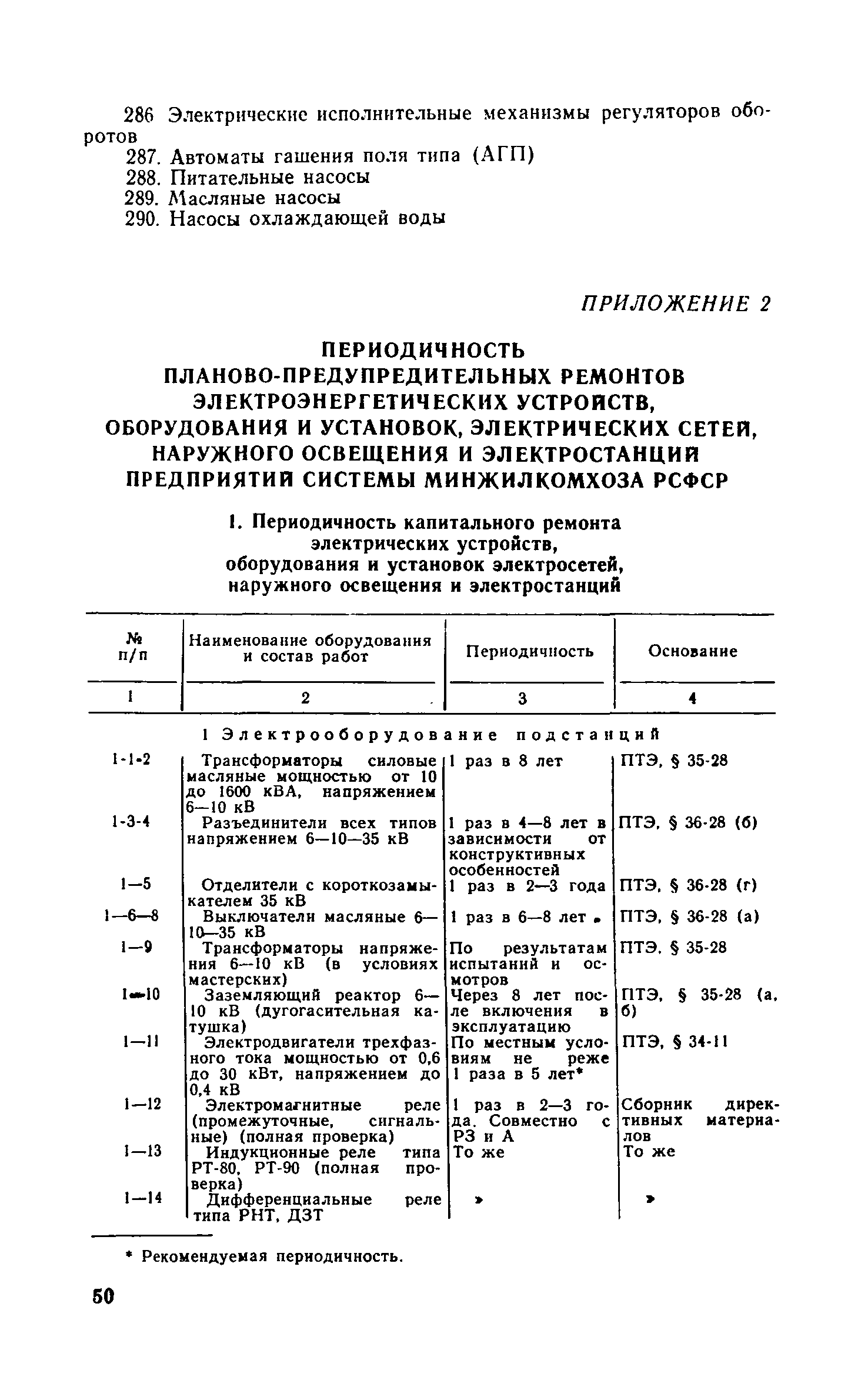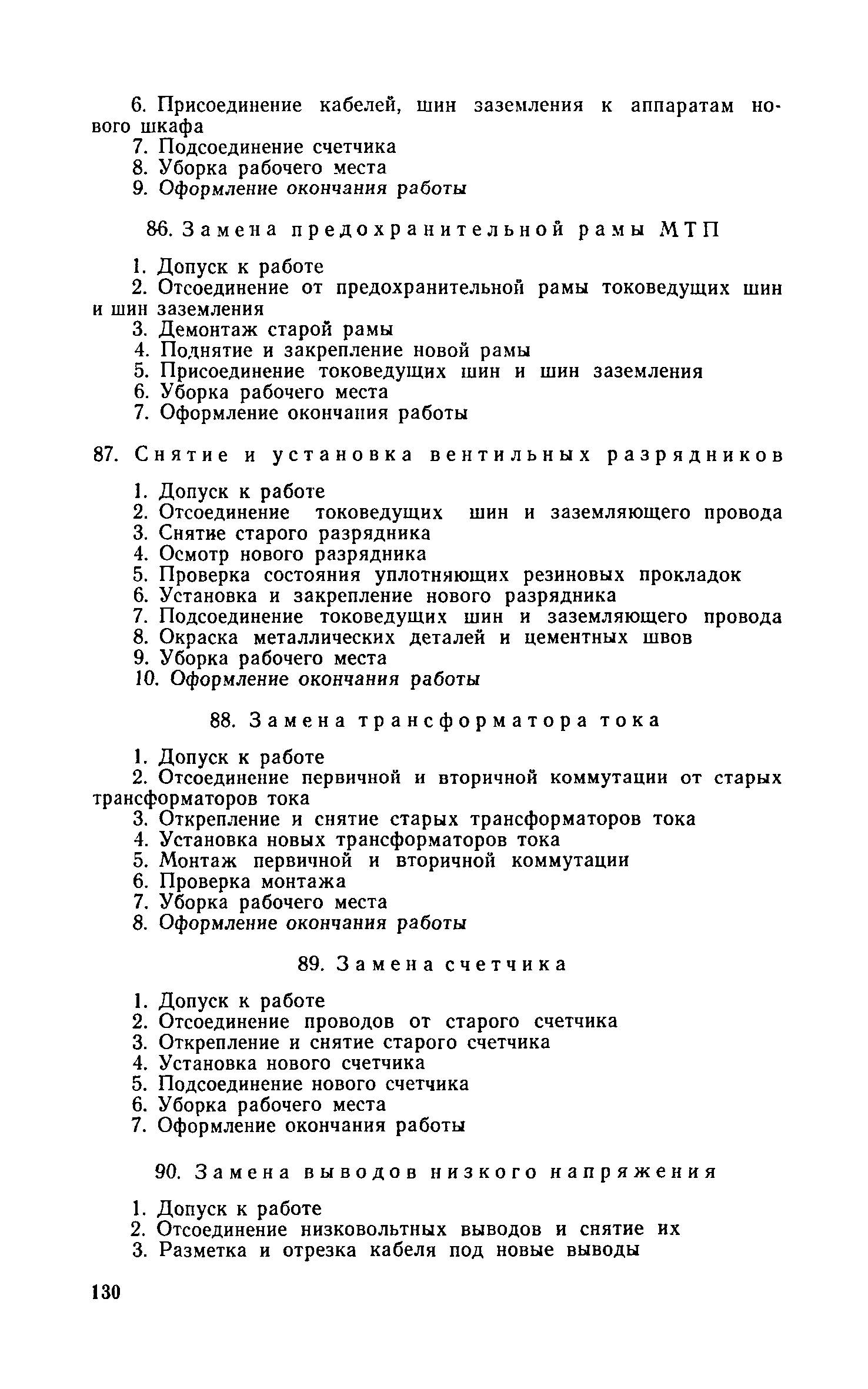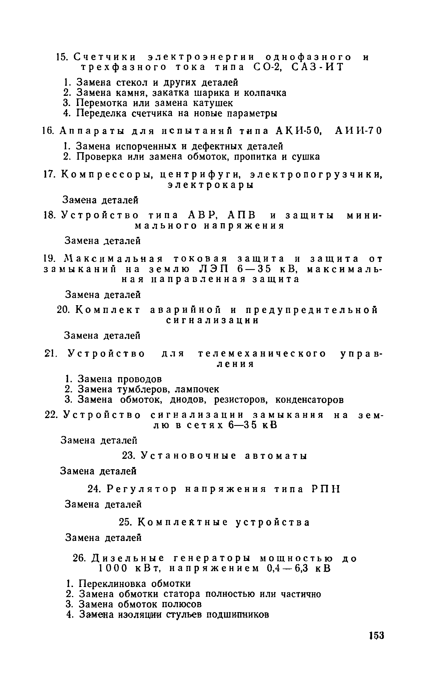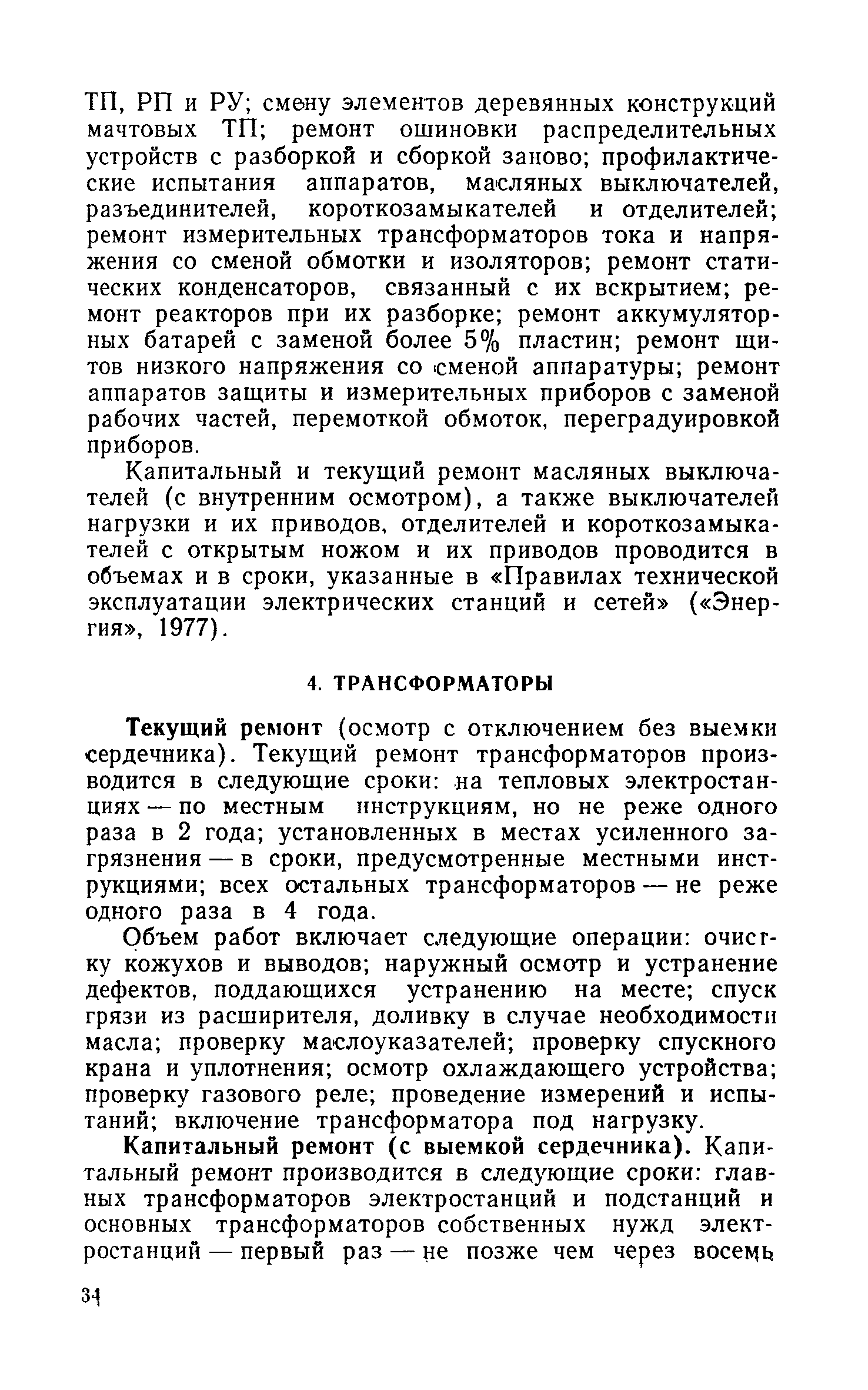 Временное положение о планово-предупредительном ремонте электроэнергетических устройств, оборудования и установок электрических сетей, наружного освещения и электрической части электростанций системы Минжилкомхоза РСФСР| Статус: | отменен в рф | | Название рус.: | Временное положение о планово-предупредительном ремонте электроэнергетических устройств, оборудования и установок электрических сетей, наружного освещения и электрической части электростанций системы Минжилкомхоза РСФСР | | Дата добавления в базу: | 01.10.2014 | | Дата актуализации: | 01.01.2021 | | Дата введения: | 01.01.1979 | | Дата окончания срока действия: | 25.06.2020 | | Область применения: | В документе рассматриваются планирование, организация и финансирование капитальных и текущих ремонтов электроэнергетического оборудования. Даны перечни наименований электроэнергетического оборудования, на которое распространяется Положение. Приведены нормы расхода материалов и запасных частей на ремонт, нормы времени на выполнение этих работ, а также формы документации оформления планово-предупредительных ремонтов. Временное положение предназначено для работников, занимающихся эксплуатацией электрооборудования предприятий системы Минжилкомхоза РСФСР. | | Оглавление: | Введение Глава I. Основные положения Глава II. Планирование и организация работ планово-предупредительных ремонтов Глава III. Финансирование капитальных и текущих ремонтов Глава IV. Подготовка и утверждение сметно-технической документации на проведение капитальных и текущих ремонтов Глава V. Капитальный и текущий ремонт основного оборудования электростанций, электросетей и установок наружного освещения Глава VI. Основные положения эксплуатации оборудования и ответственность за его сохранность Приложение 1. Перечень наименований электроэнергетических устройств, оборудования и установок Приложение 2. Периодичность планово-предупредительных ремонтов электроэнергетических устройств, оборудования и установок Приложение 3. Перечень работ, выполняемых при текущем ремонте электрических сетей, установок Приложение 4. Перечень типовых наборов работ по капитальному ремонту для основных видов оборудования и сооружений Приложение 5. Перечень нетиповых работ для основных видов оборудования и сооружений Приложение 6. Типовые нормы времени на капитальный ремонт электроэнергетических устройств, оборудования и установок Приложение 7. Нормы расхода материалов и запасных частей на капитальный ремонт электрических сетей, электроэнергетических устройств, оборудования и установок частей на капитальный ремонт электрических сетей, электроэнергетических устройств, оборудования и установок Приложение 8. Формы документации Приложение 9. Нормы амортизационных отчислений для устройств электропередачи, электродвигателей и силового оборудования Приложение 10. Типовые нормы времени на текущий ремонт электроэнергетических устройств, оборудования и установок Список литературы | | Разработан: | Оргкоммунэнерго