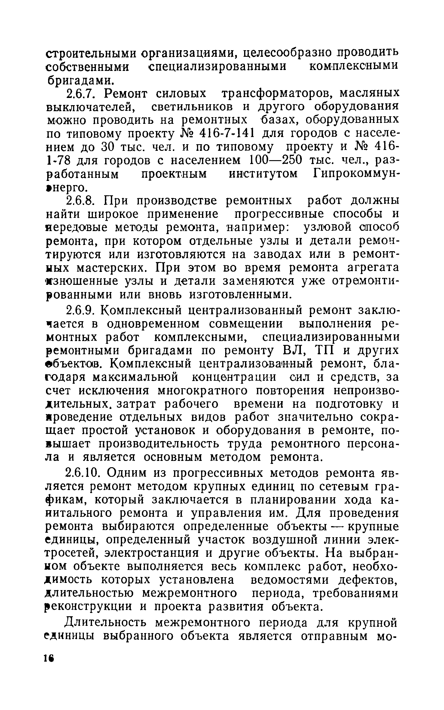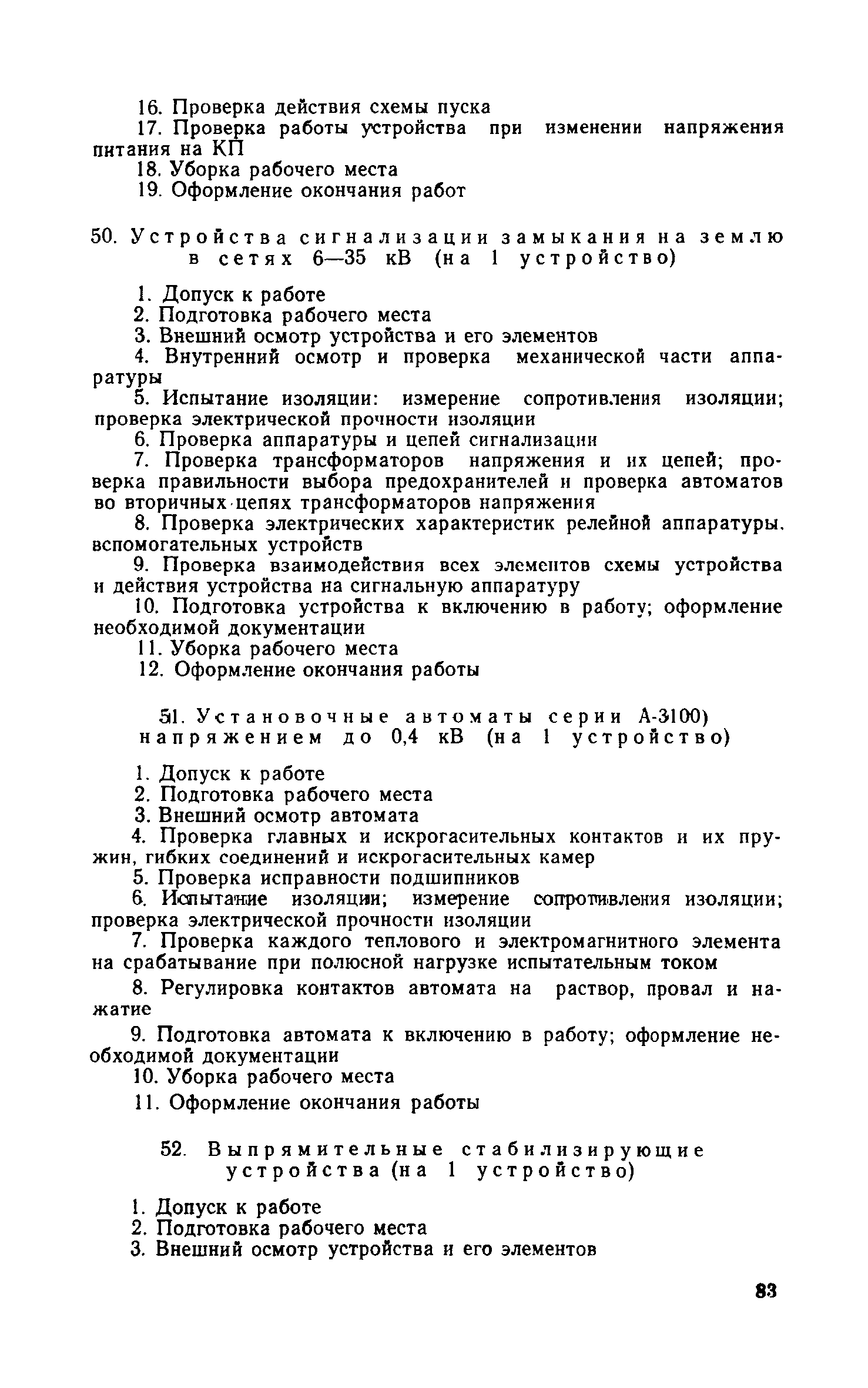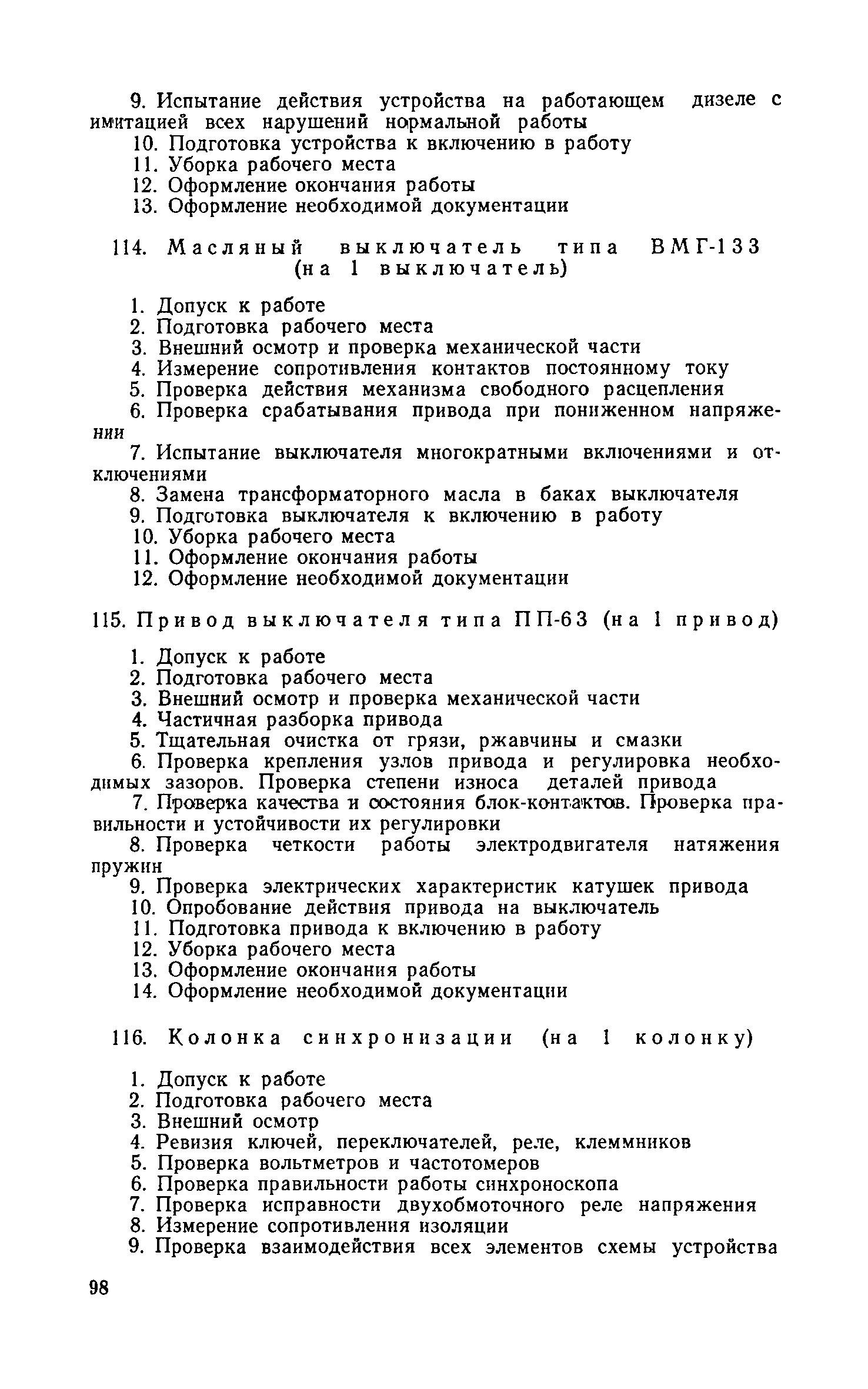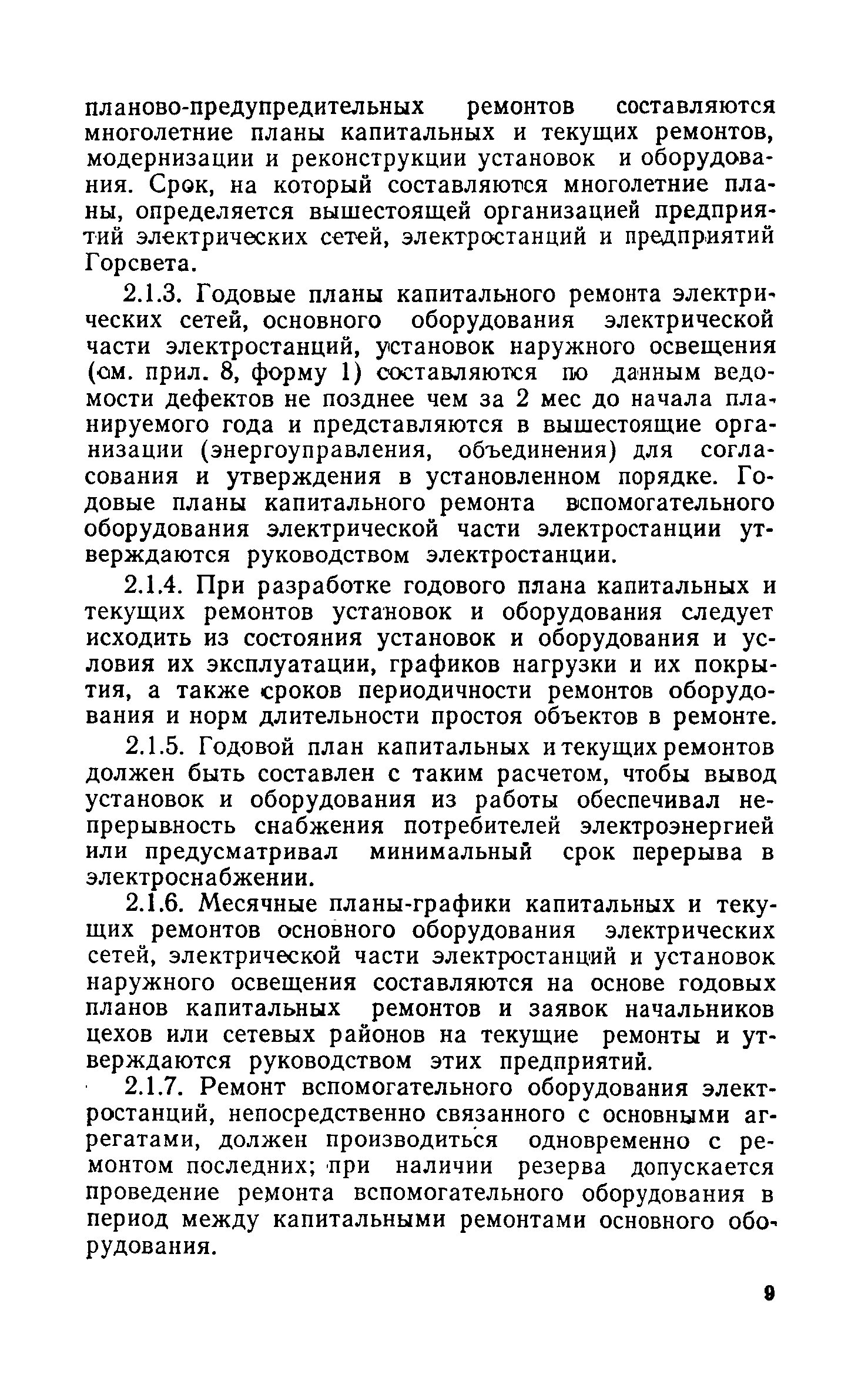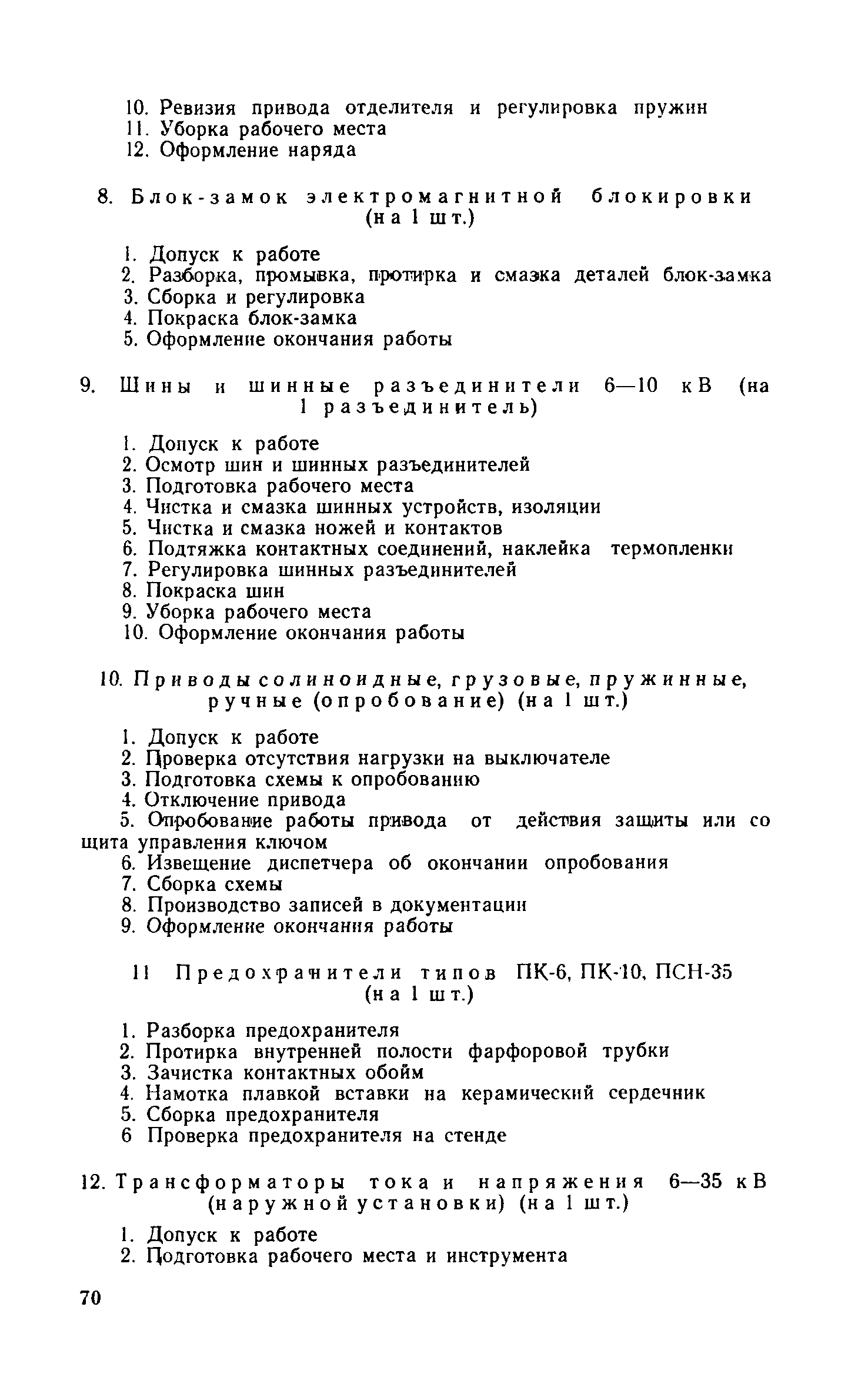 Временное положение о планово-предупредительном ремонте электроэнергетических устройств, оборудования и установок электрических сетей, наружного освещения и электрической части электростанций системы Минжилкомхоза РСФСР| Статус: | отменен в рф | | Название рус.: | Временное положение о планово-предупредительном ремонте электроэнергетических устройств, оборудования и установок электрических сетей, наружного освещения и электрической части электростанций системы Минжилкомхоза РСФСР | | Дата добавления в базу: | 01.10.2014 | | Дата актуализации: | 01.01.2021 | | Дата введения: | 01.01.1979 | | Дата окончания срока действия: | 25.06.2020 | | Область применения: | В документе рассматриваются планирование, организация и финансирование капитальных и текущих ремонтов электроэнергетического оборудования. Даны перечни наименований электроэнергетического оборудования, на которое распространяется Положение. Приведены нормы расхода материалов и запасных частей на ремонт, нормы времени на выполнение этих работ, а также формы документации оформления планово-предупредительных ремонтов. Временное положение предназначено для работников, занимающихся эксплуатацией электрооборудования предприятий системы Минжилкомхоза РСФСР. | | Оглавление: | Введение Глава I. Основные положения Глава II. Планирование и организация работ планово-предупредительных ремонтов Глава III. Финансирование капитальных и текущих ремонтов Глава IV. Подготовка и утверждение сметно-технической документации на проведение капитальных и текущих ремонтов Глава V. Капитальный и текущий ремонт основного оборудования электростанций, электросетей и установок наружного освещения Глава VI. Основные положения эксплуатации оборудования и ответственность за его сохранность Приложение 1. Перечень наименований электроэнергетических устройств, оборудования и установок Приложение 2. Периодичность планово-предупредительных ремонтов электроэнергетических устройств, оборудования и установок Приложение 3. Перечень работ, выполняемых при текущем ремонте электрических сетей, установок Приложение 4. Перечень типовых наборов работ по капитальному ремонту для основных видов оборудования и сооружений Приложение 5. Перечень нетиповых работ для основных видов оборудования и сооружений Приложение 6. Типовые нормы времени на капитальный ремонт электроэнергетических устройств, оборудования и установок Приложение 7. Нормы расхода материалов и запасных частей на капитальный ремонт электрических сетей, электроэнергетических устройств, оборудования и установок частей на капитальный ремонт электрических сетей, электроэнергетических устройств, оборудования и установок Приложение 8. Формы документации Приложение 9. Нормы амортизационных отчислений для устройств электропередачи, электродвигателей и силового оборудования Приложение 10. Типовые нормы времени на текущий ремонт электроэнергетических устройств, оборудования и установок Список литературы | | Разработан: | Оргкоммунэнерго