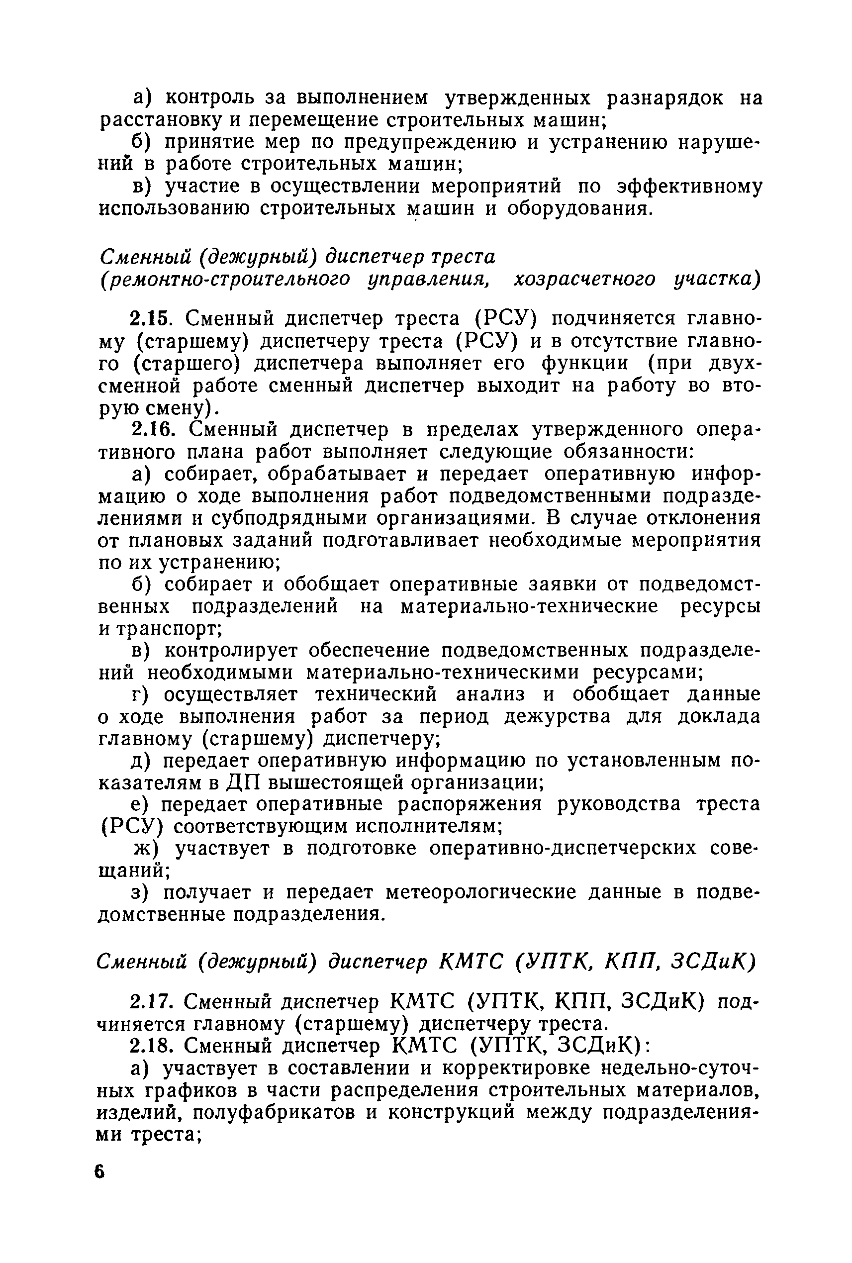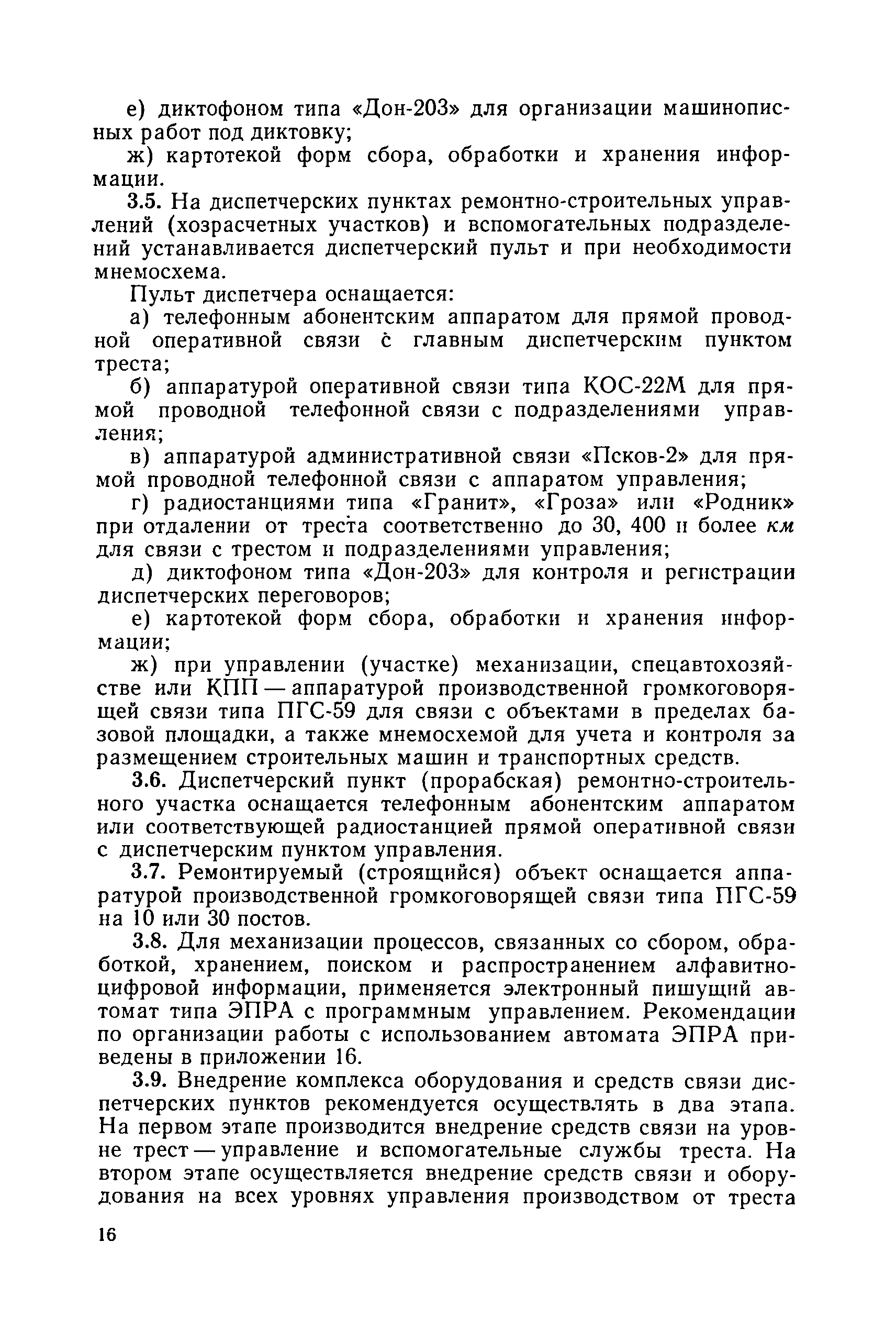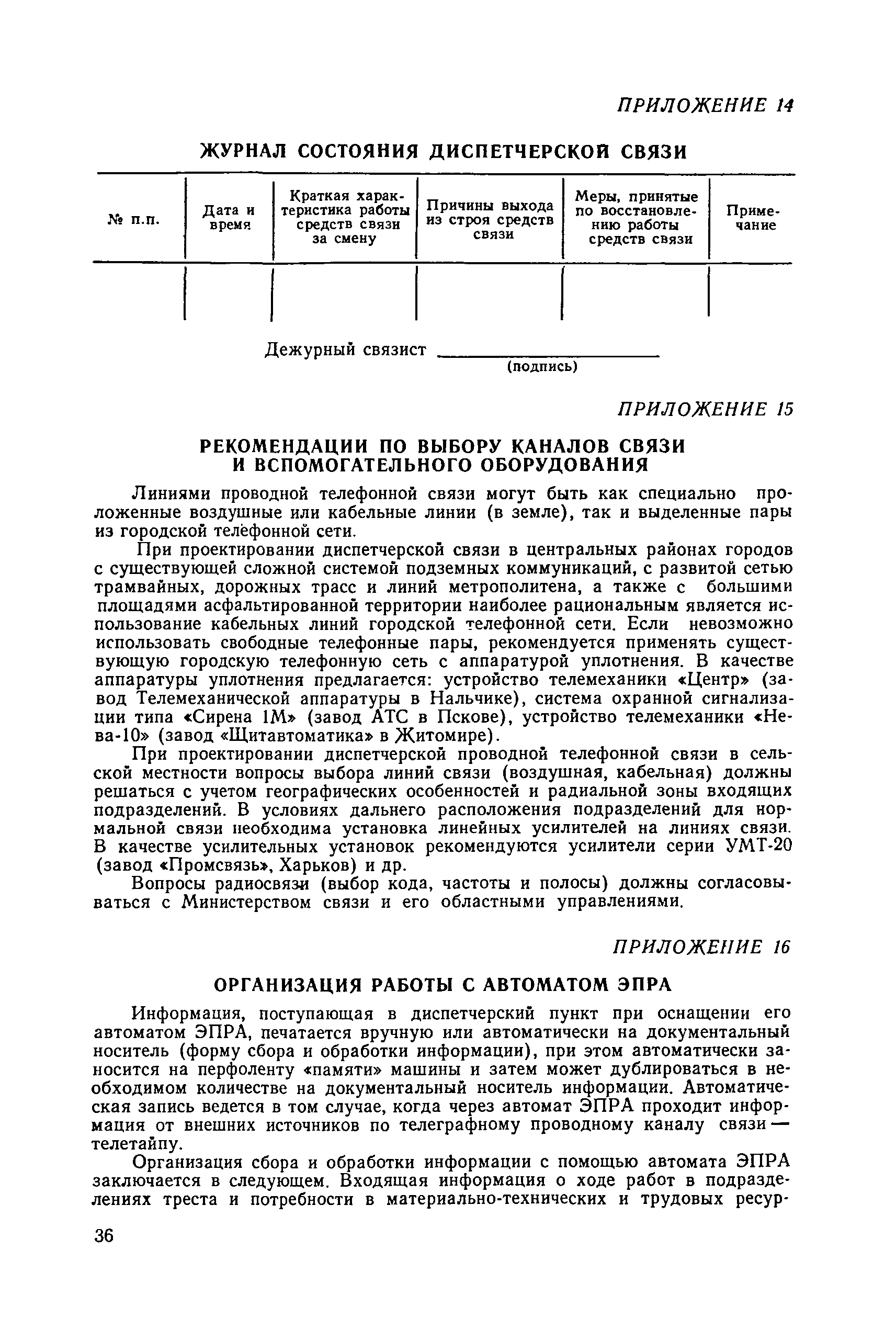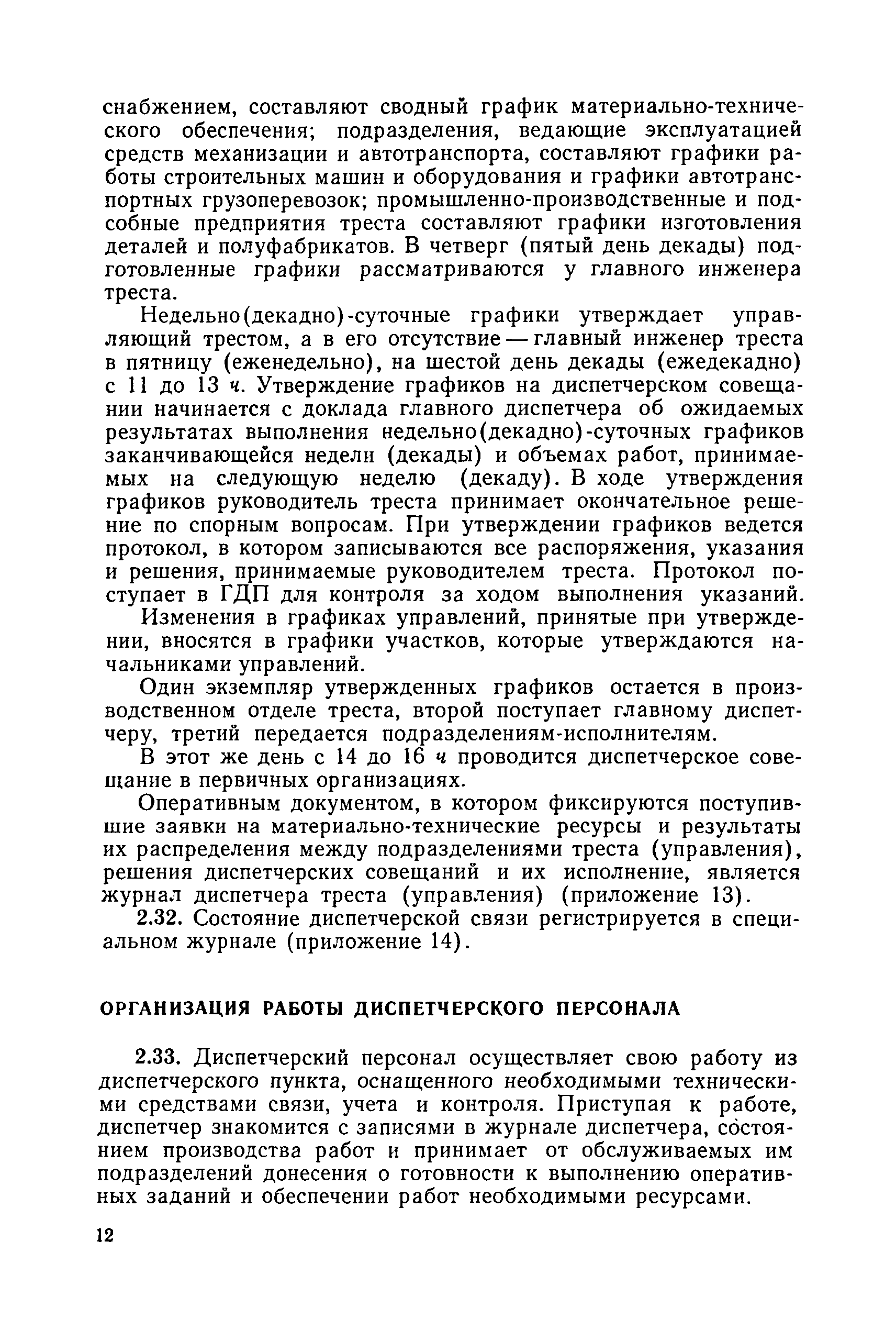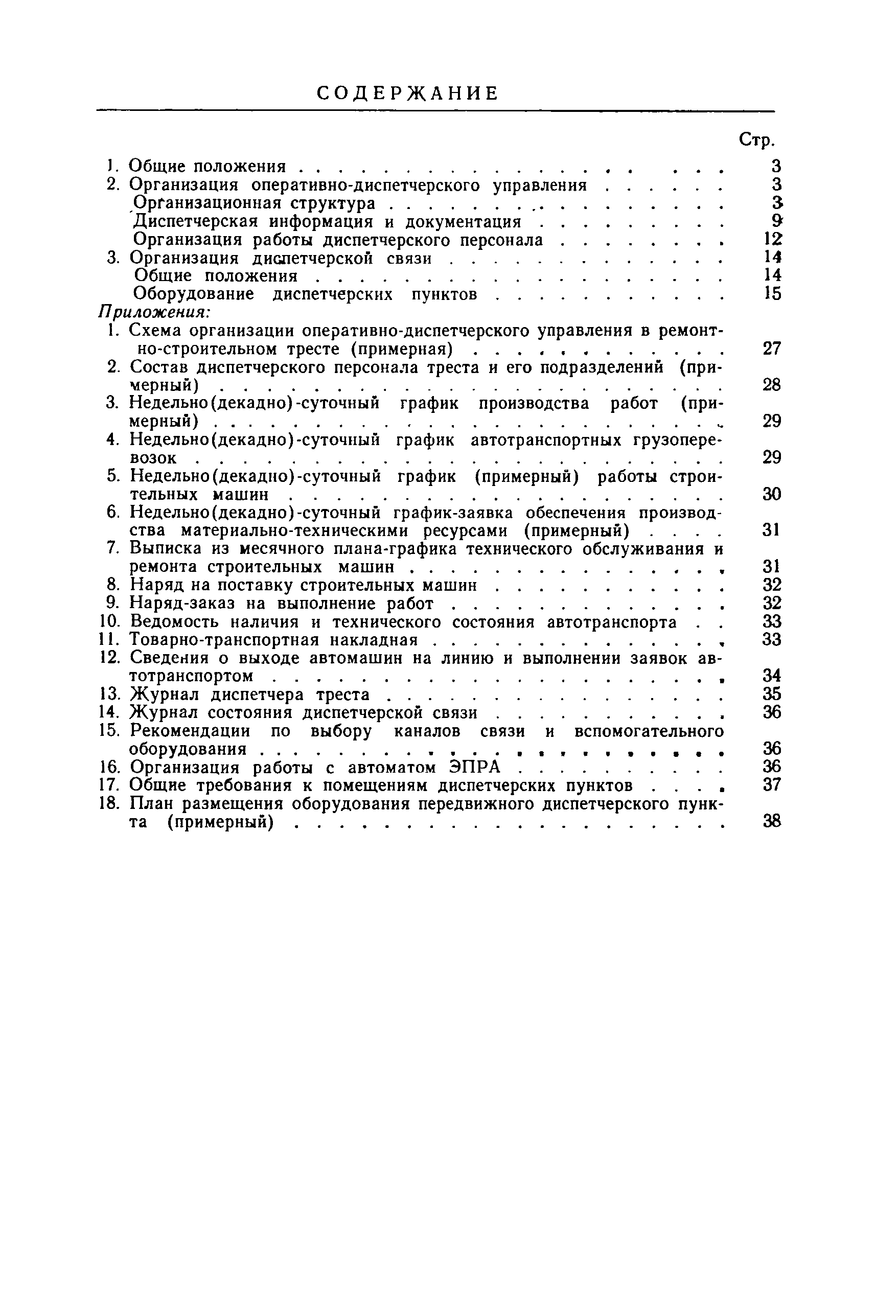 | Оглавление: | 1. Общие положения 2. Организация оперативно-диспетчерского управления Организационная структура Диспетчерская информация и документация Организация работы диспетчерского персонала 3. Организация диспетчерской связи Общие положения Оборудование диспетчерских пунктов Приложение 1. Схема организации оперативно-диспетчерского управления в ремонтно-строительном тресте (примерная) Приложение 2. Состав диспетчерского персонала треста и его подразделений (примерный) Приложение 3. Недельно (декадно) - суточный график производства работ (примерный) Приложение 4. Недельно (декадно) - суточный график автотранспортных грузоперевозок Приложение 5. Недельно (декадно) - суточный график (примерный) работы строительных машин Приложение 6. Недельно (декадно) - суточный график-заявка обеспечения производства материально-техническими ресурсами (примерный) Приложение 7. Выписка из месячного плана-графика технического обслуживания и ремонта строительных машин Приложение 8. Наряд на поставку строительных машин Приложение 9. Наряд-заказ на выполнение работ Приложение 10. Ведомость наличия и технического состояния автотранспорта Приложение 11. Товарно-транспортная накладная Приложение 12. Сведения о выходе автомашин на линию и выполнении заявок автотранспортом Приложение 13. Журнал диспетчера треста Приложение 14. Журнал состояния диспетчерской связи Приложение 15. Рекомендации по выбору каналов связи и вспомогательного оборудования Приложение 16. Организация работы с автоматом ЭПРА Приложение 17. Общие требования к помещениям диспетчерских пунктов Приложение 18. План размещения оборудования передвижного диспетчерского пункта (примерный) |