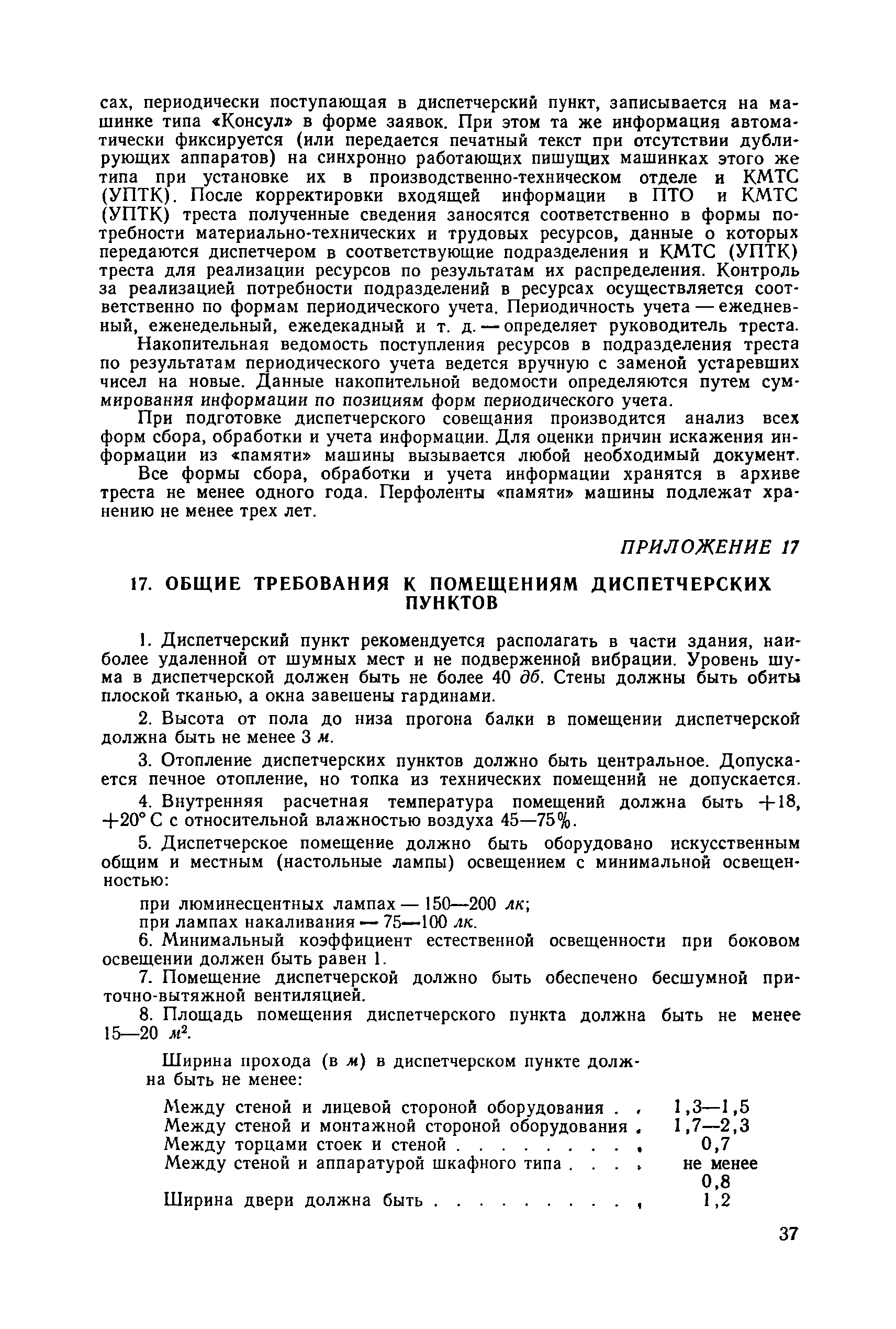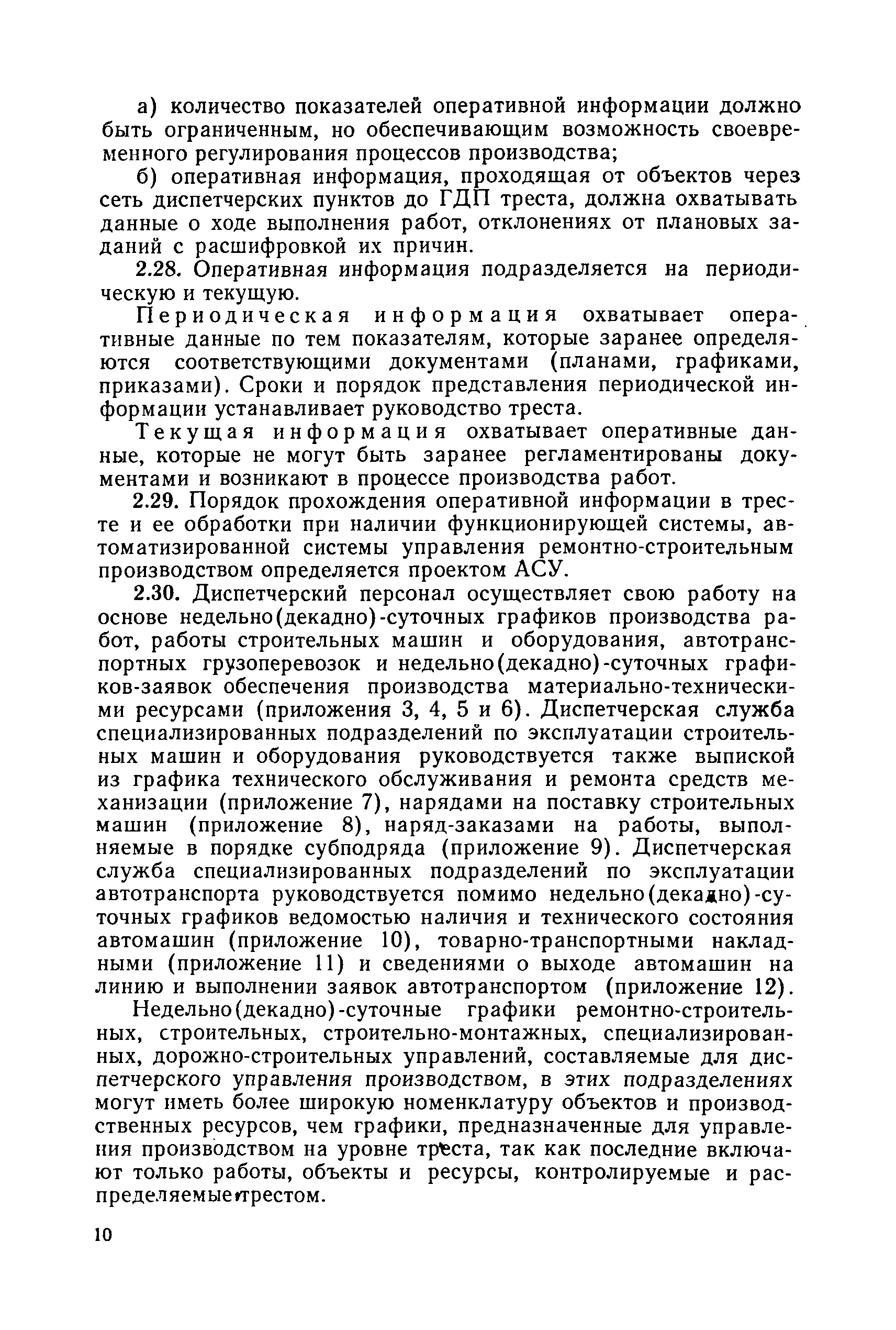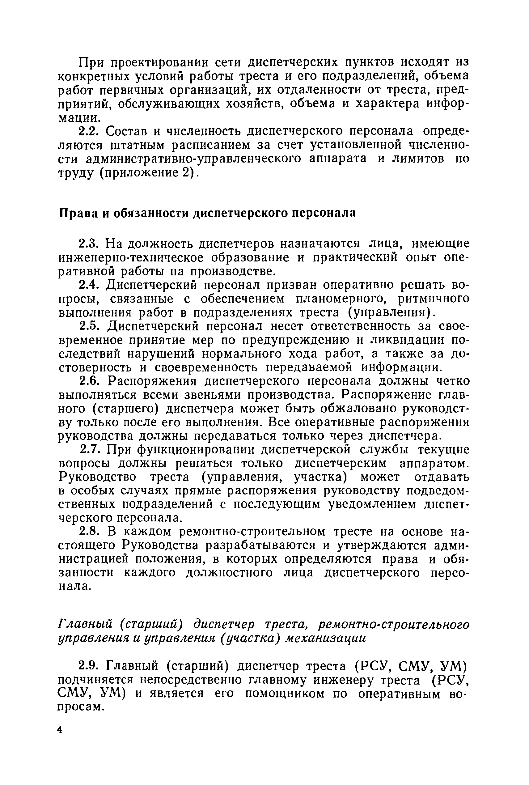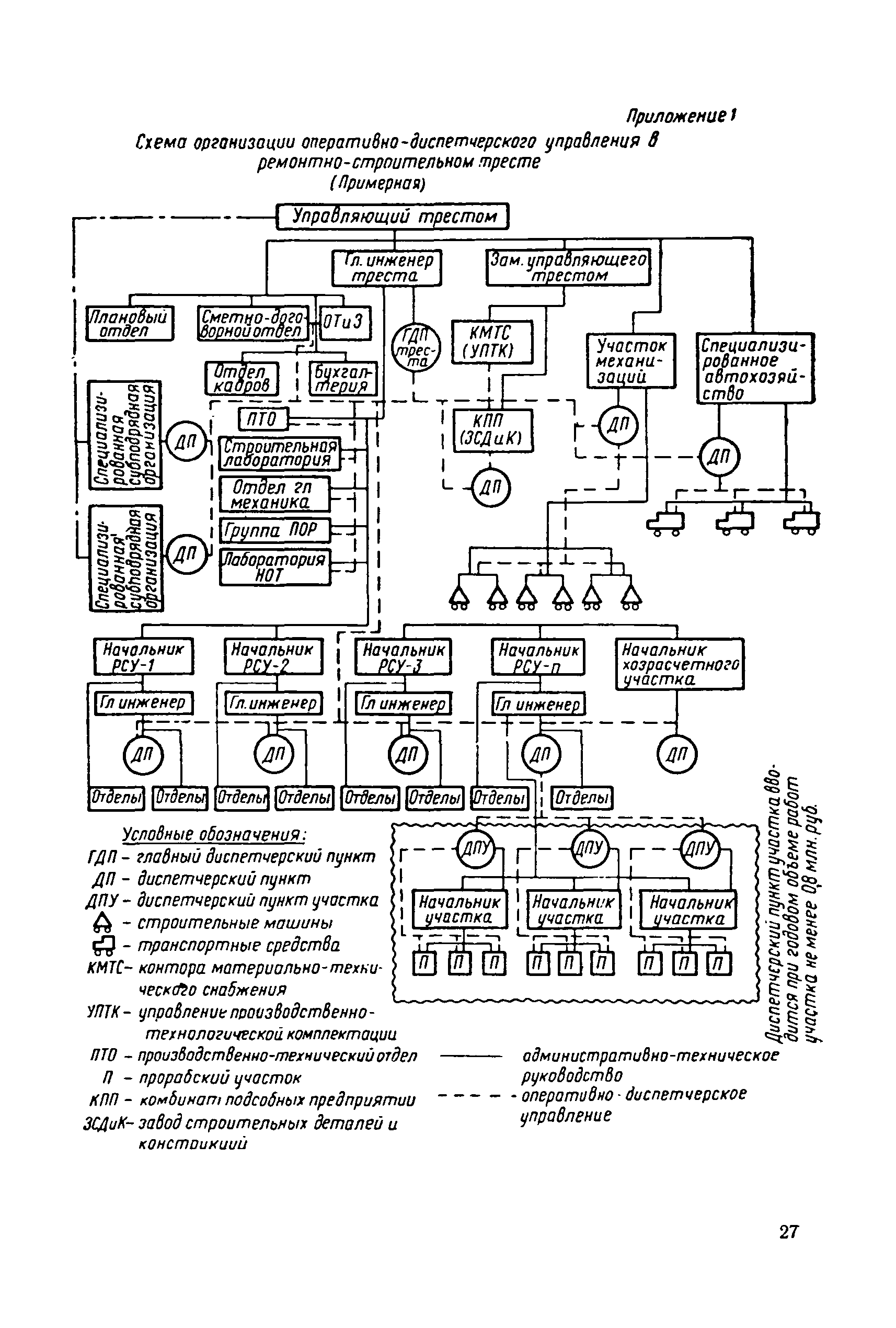 | Оглавление: | 1. Общие положения 2. Организация оперативно-диспетчерского управления Организационная структура Диспетчерская информация и документация Организация работы диспетчерского персонала 3. Организация диспетчерской связи Общие положения Оборудование диспетчерских пунктов Приложение 1. Схема организации оперативно-диспетчерского управления в ремонтно-строительном тресте (примерная) Приложение 2. Состав диспетчерского персонала треста и его подразделений (примерный) Приложение 3. Недельно (декадно) - суточный график производства работ (примерный) Приложение 4. Недельно (декадно) - суточный график автотранспортных грузоперевозок Приложение 5. Недельно (декадно) - суточный график (примерный) работы строительных машин Приложение 6. Недельно (декадно) - суточный график-заявка обеспечения производства материально-техническими ресурсами (примерный) Приложение 7. Выписка из месячного плана-графика технического обслуживания и ремонта строительных машин Приложение 8. Наряд на поставку строительных машин Приложение 9. Наряд-заказ на выполнение работ Приложение 10. Ведомость наличия и технического состояния автотранспорта Приложение 11. Товарно-транспортная накладная Приложение 12. Сведения о выходе автомашин на линию и выполнении заявок автотранспортом Приложение 13. Журнал диспетчера треста Приложение 14. Журнал состояния диспетчерской связи Приложение 15. Рекомендации по выбору каналов связи и вспомогательного оборудования Приложение 16. Организация работы с автоматом ЭПРА Приложение 17. Общие требования к помещениям диспетчерских пунктов Приложение 18. План размещения оборудования передвижного диспетчерского пункта (примерный) |