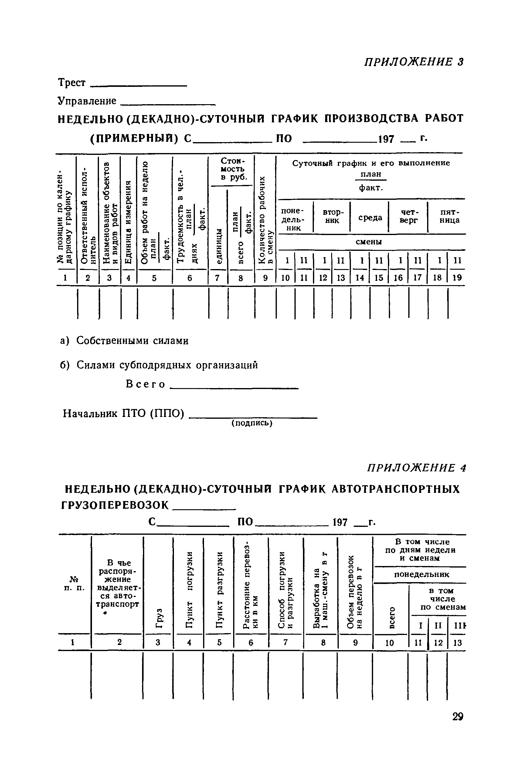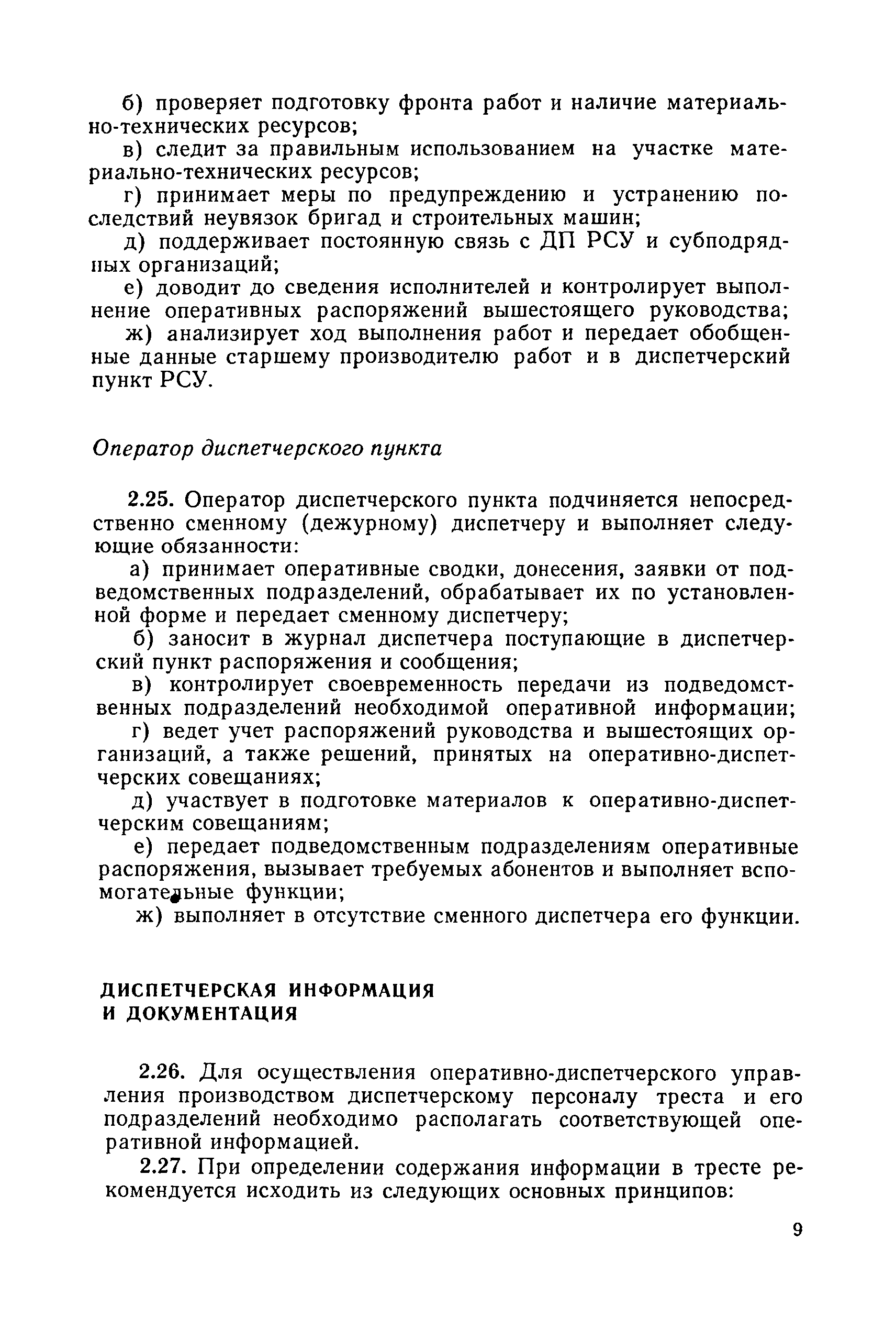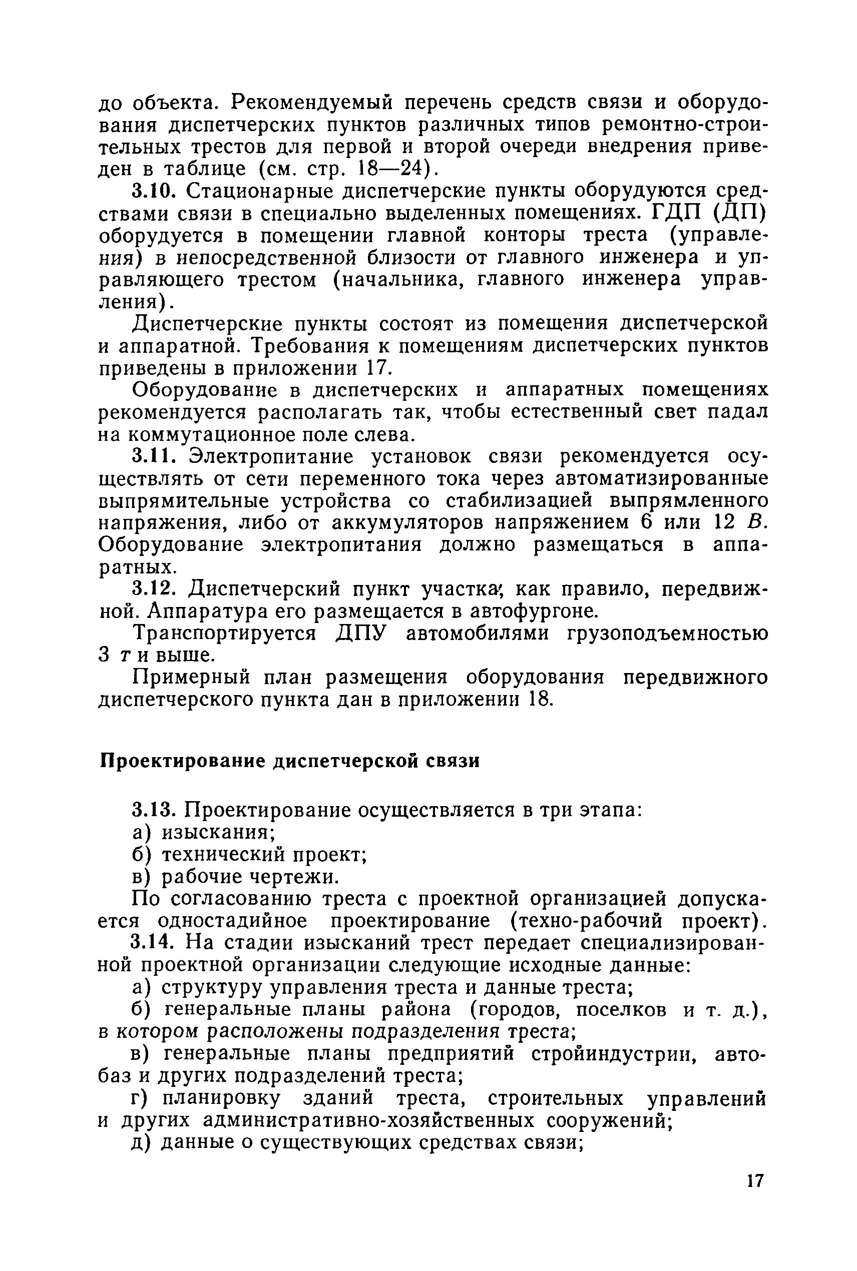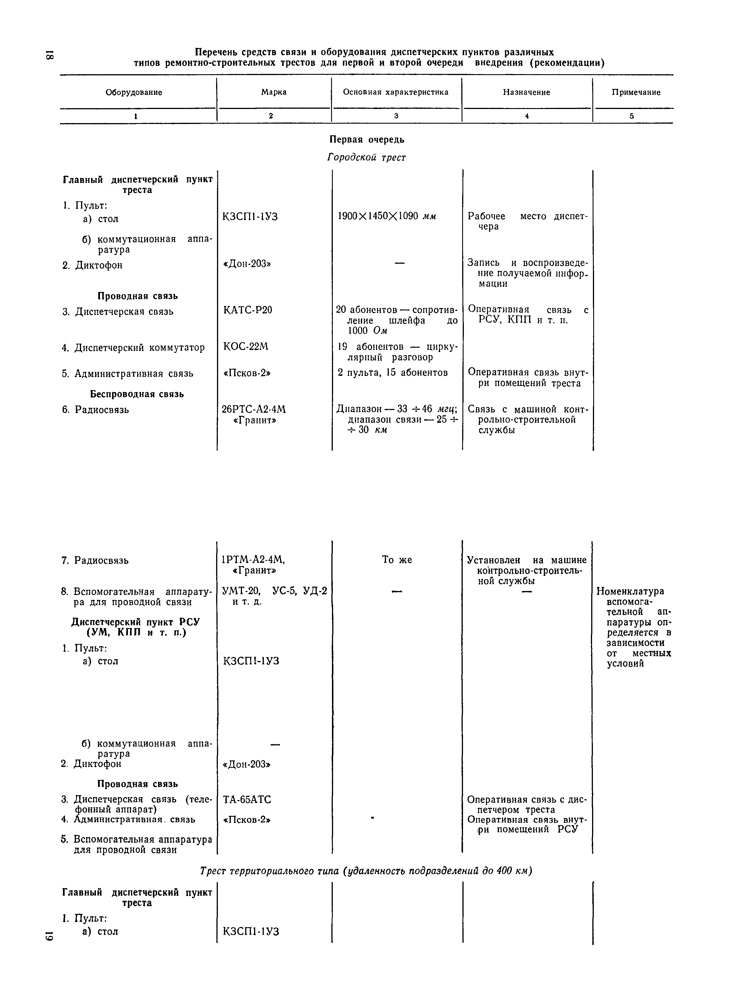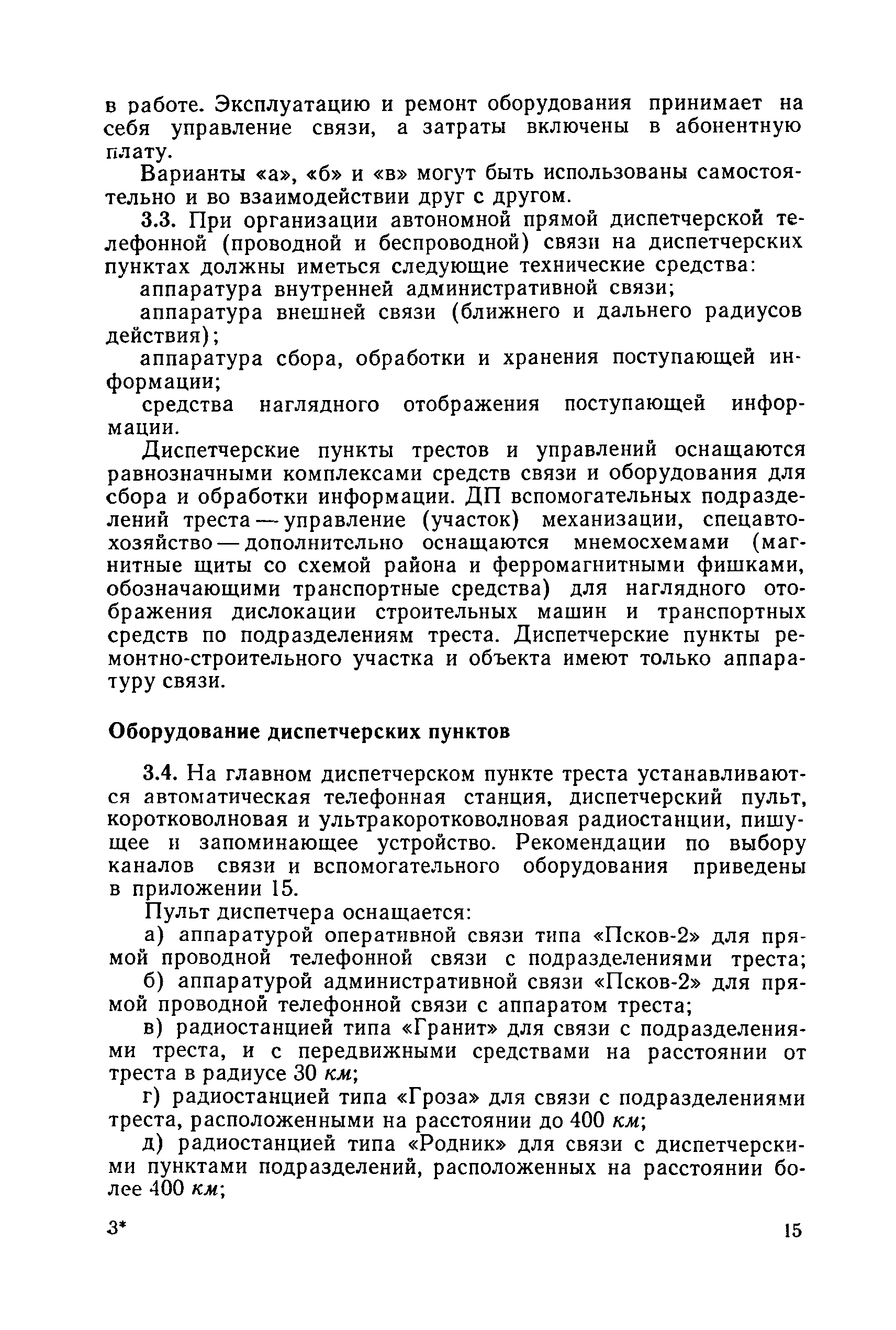 | Оглавление: | 1. Общие положения 2. Организация оперативно-диспетчерского управления Организационная структура Диспетчерская информация и документация Организация работы диспетчерского персонала 3. Организация диспетчерской связи Общие положения Оборудование диспетчерских пунктов Приложение 1. Схема организации оперативно-диспетчерского управления в ремонтно-строительном тресте (примерная) Приложение 2. Состав диспетчерского персонала треста и его подразделений (примерный) Приложение 3. Недельно (декадно) - суточный график производства работ (примерный) Приложение 4. Недельно (декадно) - суточный график автотранспортных грузоперевозок Приложение 5. Недельно (декадно) - суточный график (примерный) работы строительных машин Приложение 6. Недельно (декадно) - суточный график-заявка обеспечения производства материально-техническими ресурсами (примерный) Приложение 7. Выписка из месячного плана-графика технического обслуживания и ремонта строительных машин Приложение 8. Наряд на поставку строительных машин Приложение 9. Наряд-заказ на выполнение работ Приложение 10. Ведомость наличия и технического состояния автотранспорта Приложение 11. Товарно-транспортная накладная Приложение 12. Сведения о выходе автомашин на линию и выполнении заявок автотранспортом Приложение 13. Журнал диспетчера треста Приложение 14. Журнал состояния диспетчерской связи Приложение 15. Рекомендации по выбору каналов связи и вспомогательного оборудования Приложение 16. Организация работы с автоматом ЭПРА Приложение 17. Общие требования к помещениям диспетчерских пунктов Приложение 18. План размещения оборудования передвижного диспетчерского пункта (примерный) |